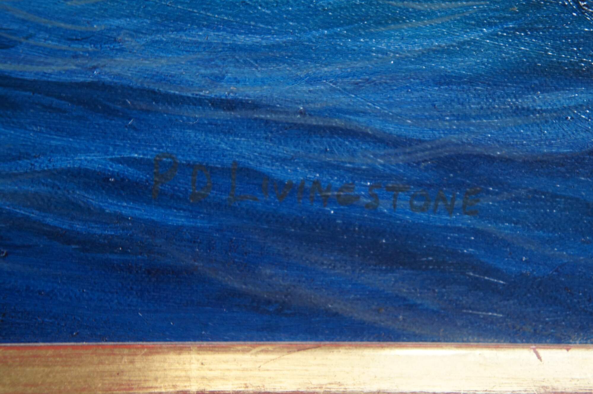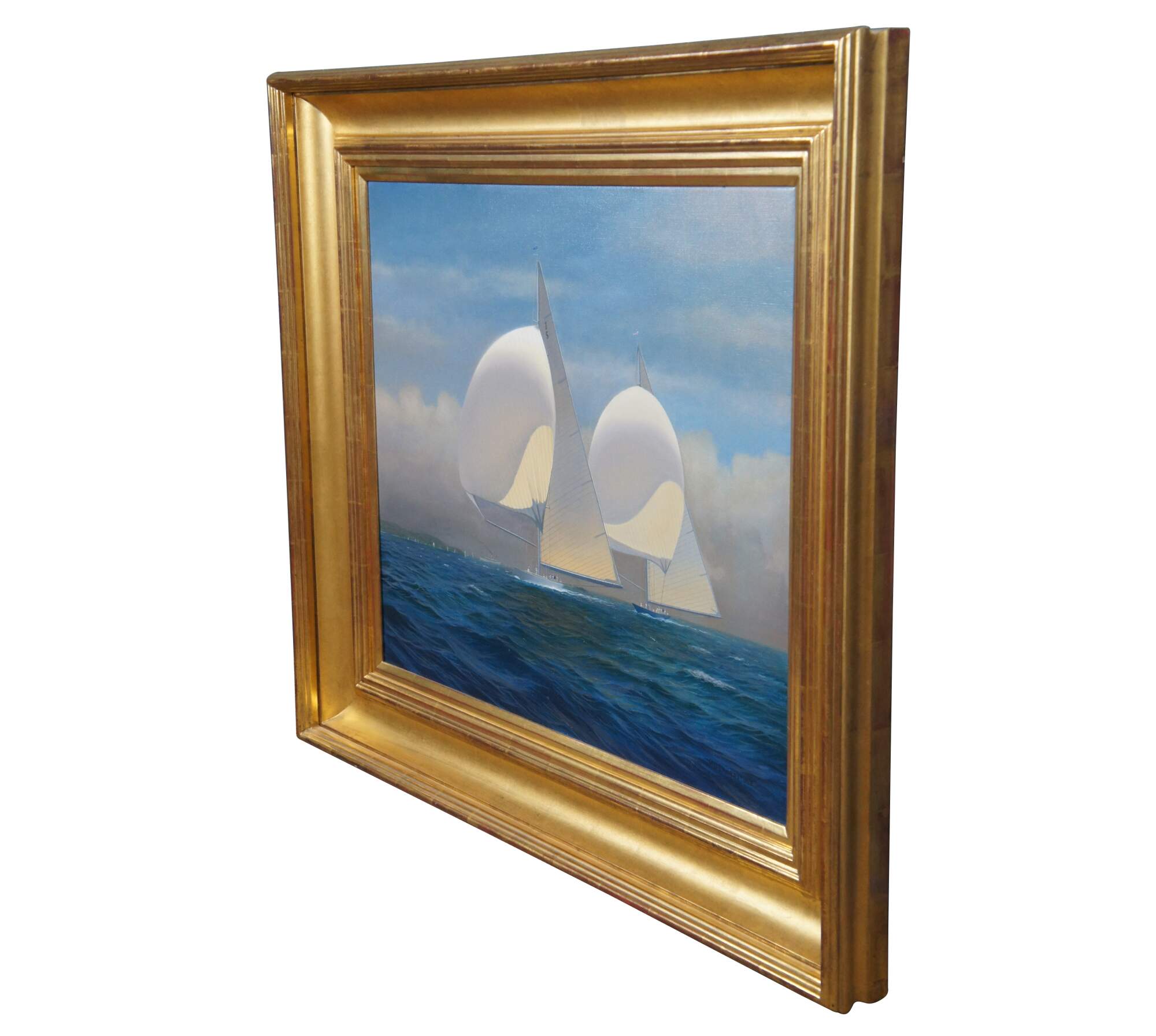 A profound oil painting by Patrick Livingstone. Features two yachts racing at sea. The color and detail of this work makes you feel as if you are in the moment. The canvas is signed lower right and framed in wood with a gold finish.