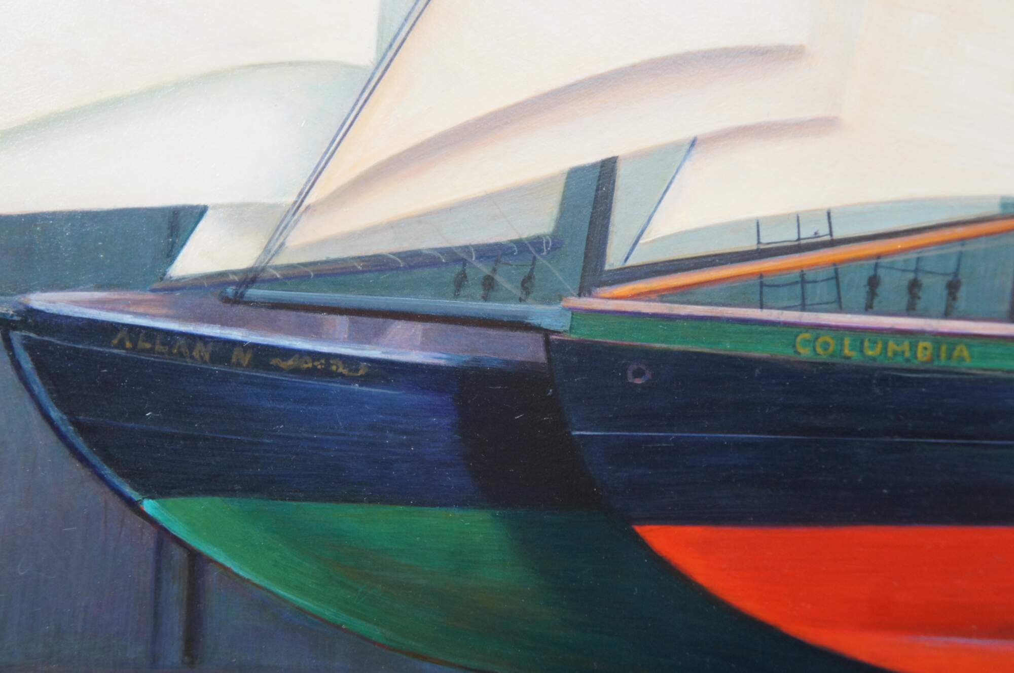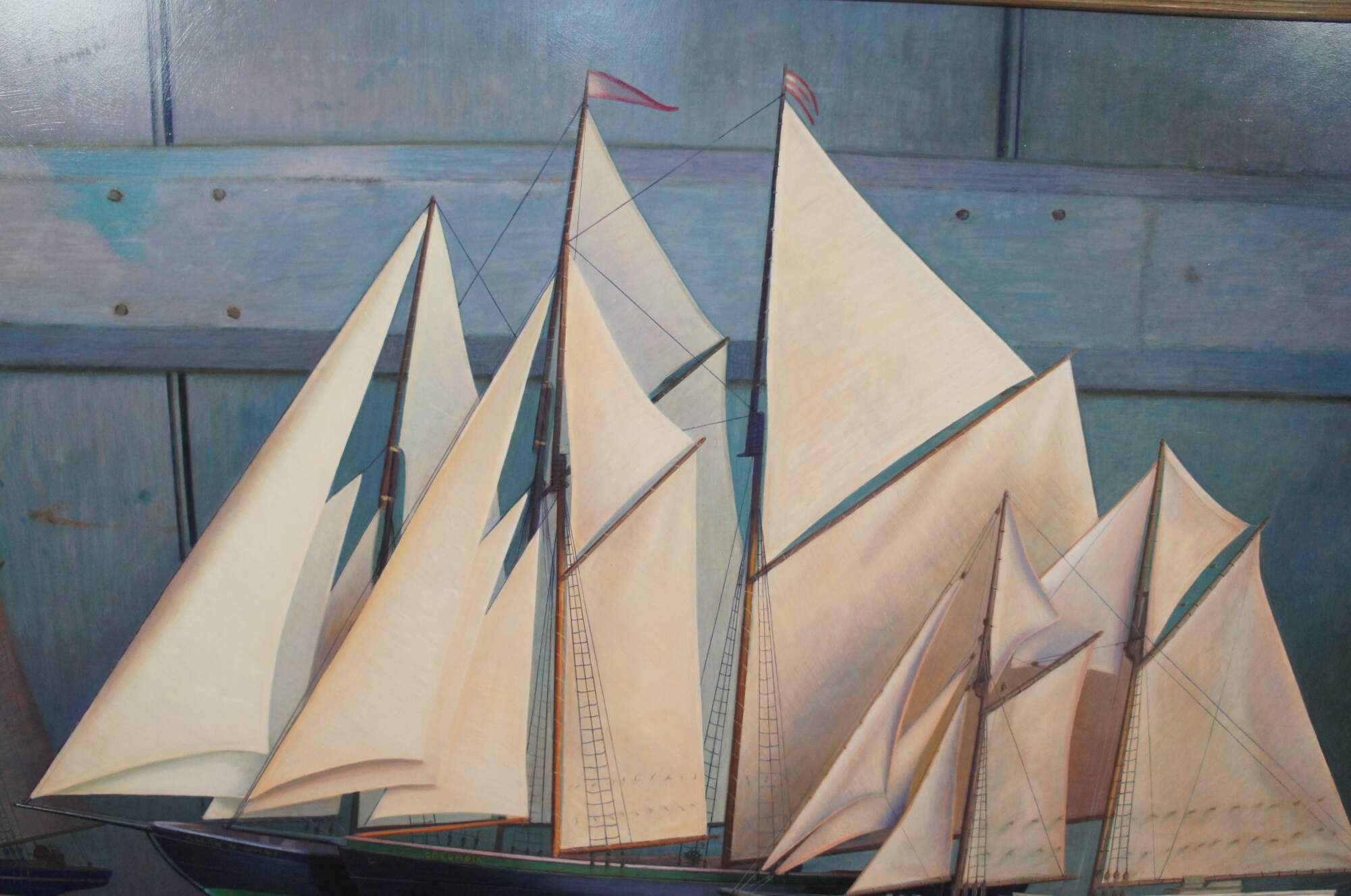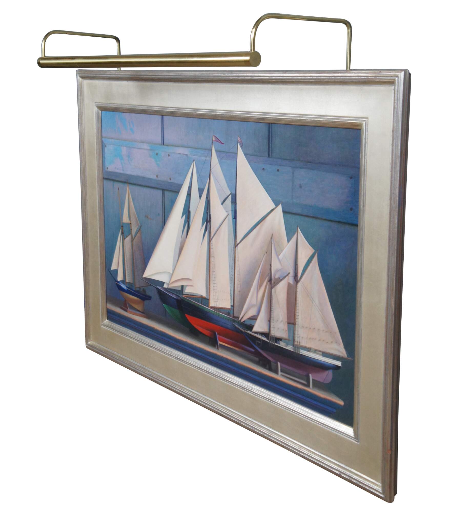 Vintage Sidney Willis (aka Sid, b.1930), still life oil painting featuring model sailboats against a plank background. Sid's life like detail is eye catching and quite charming. The painting is on board, signed upper left.