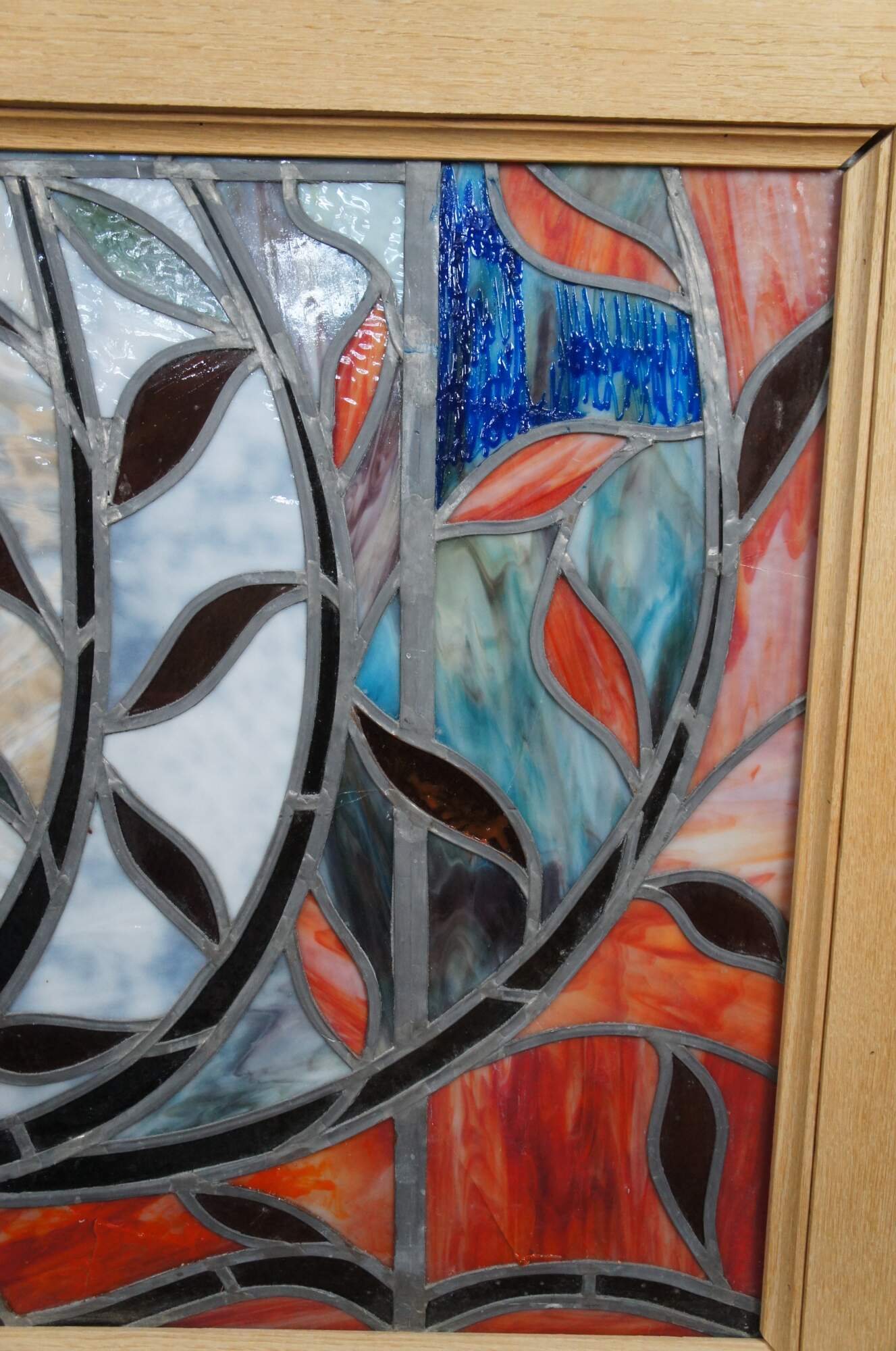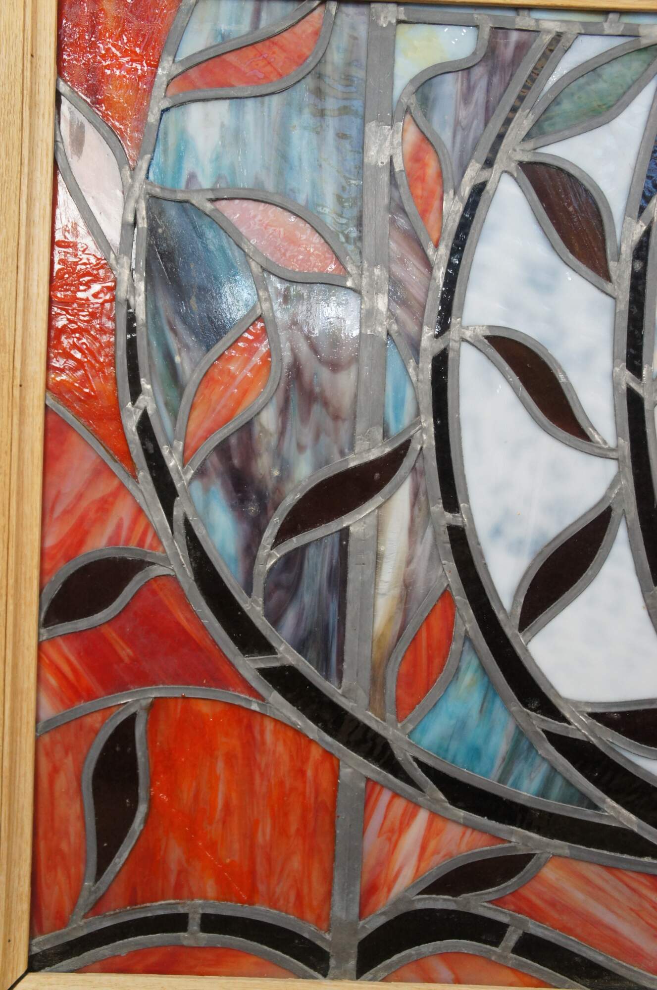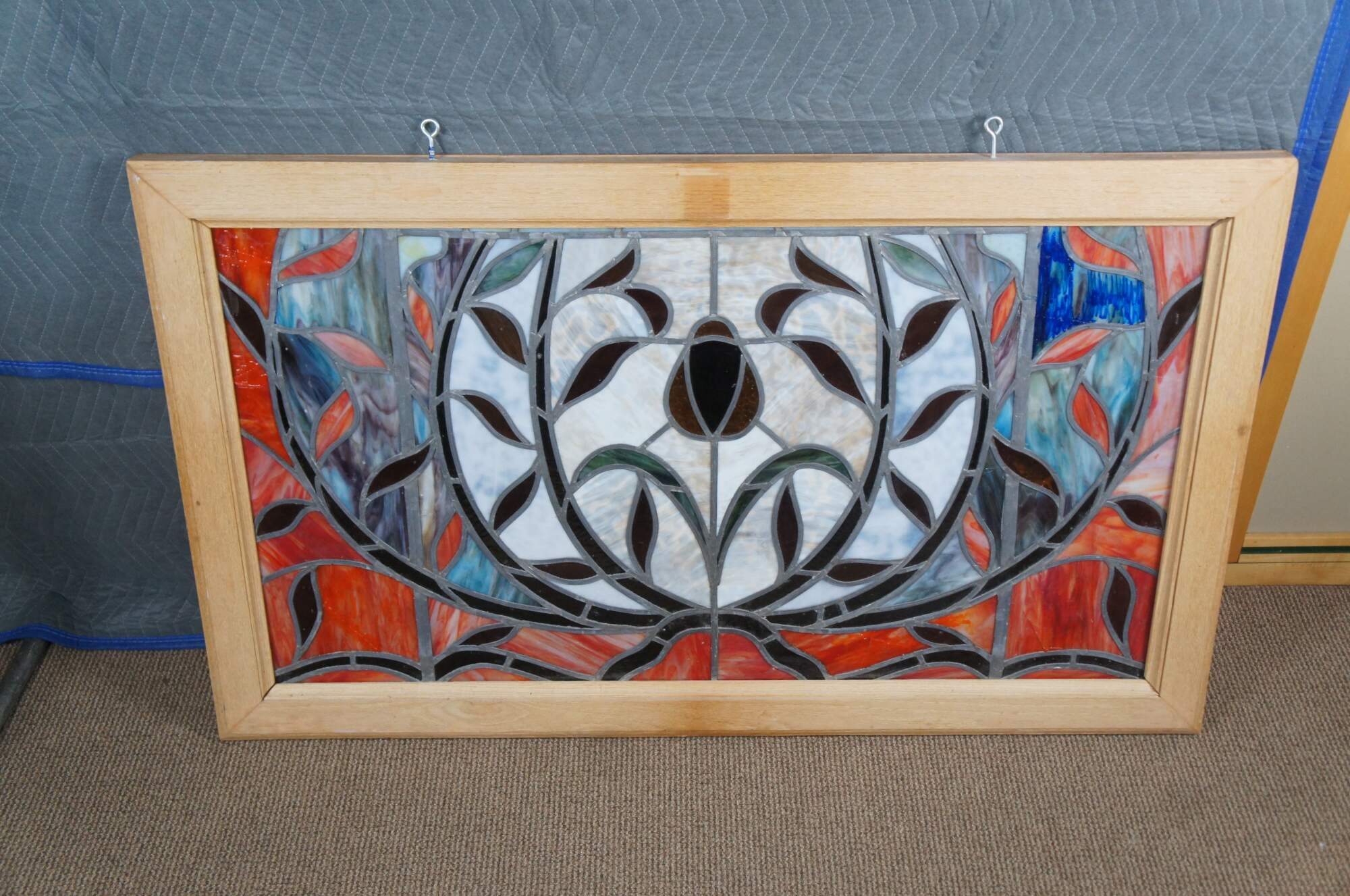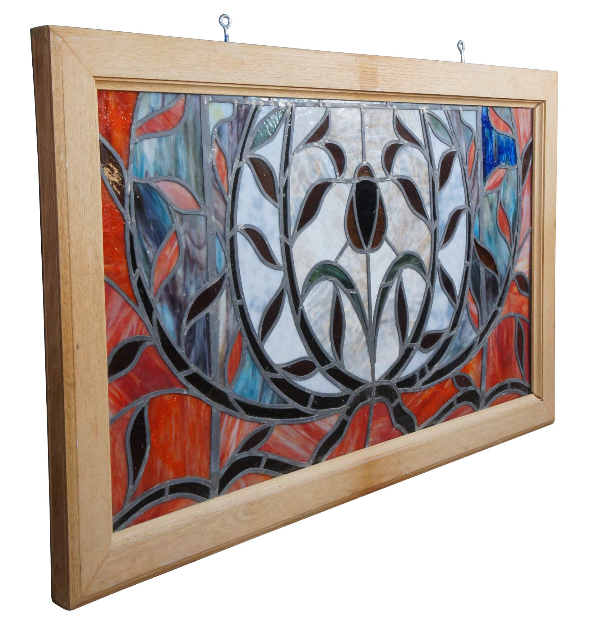 Late 20th century leaded stained glass window hanging panel. Features a field of red with accents of amber, blue and purple. At the center is a rose with foliate surrounds. Framed in a heavy oak with two eye hooks along the top for hanging