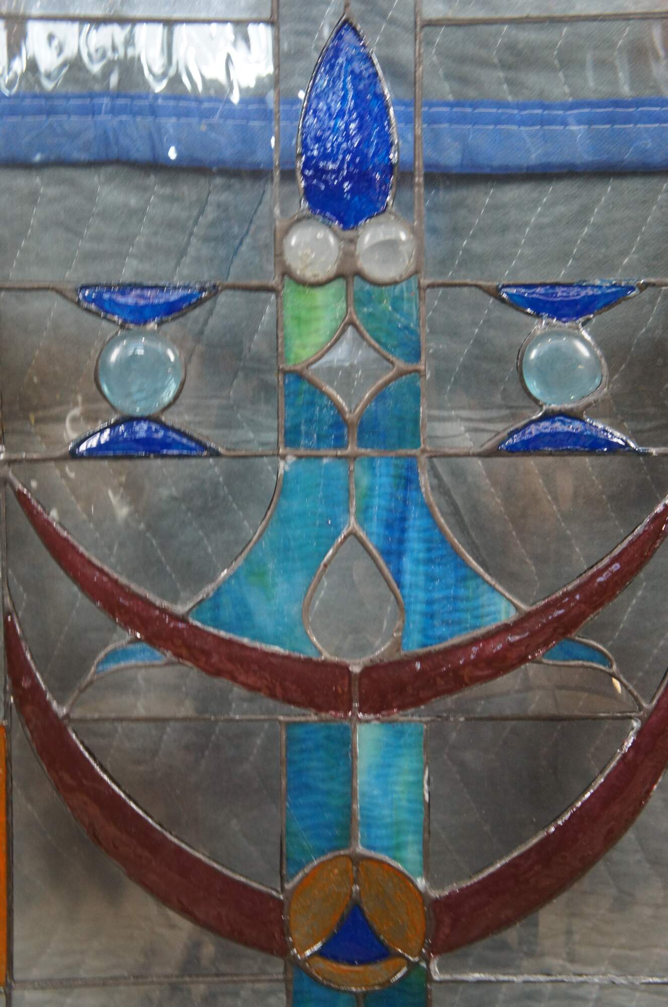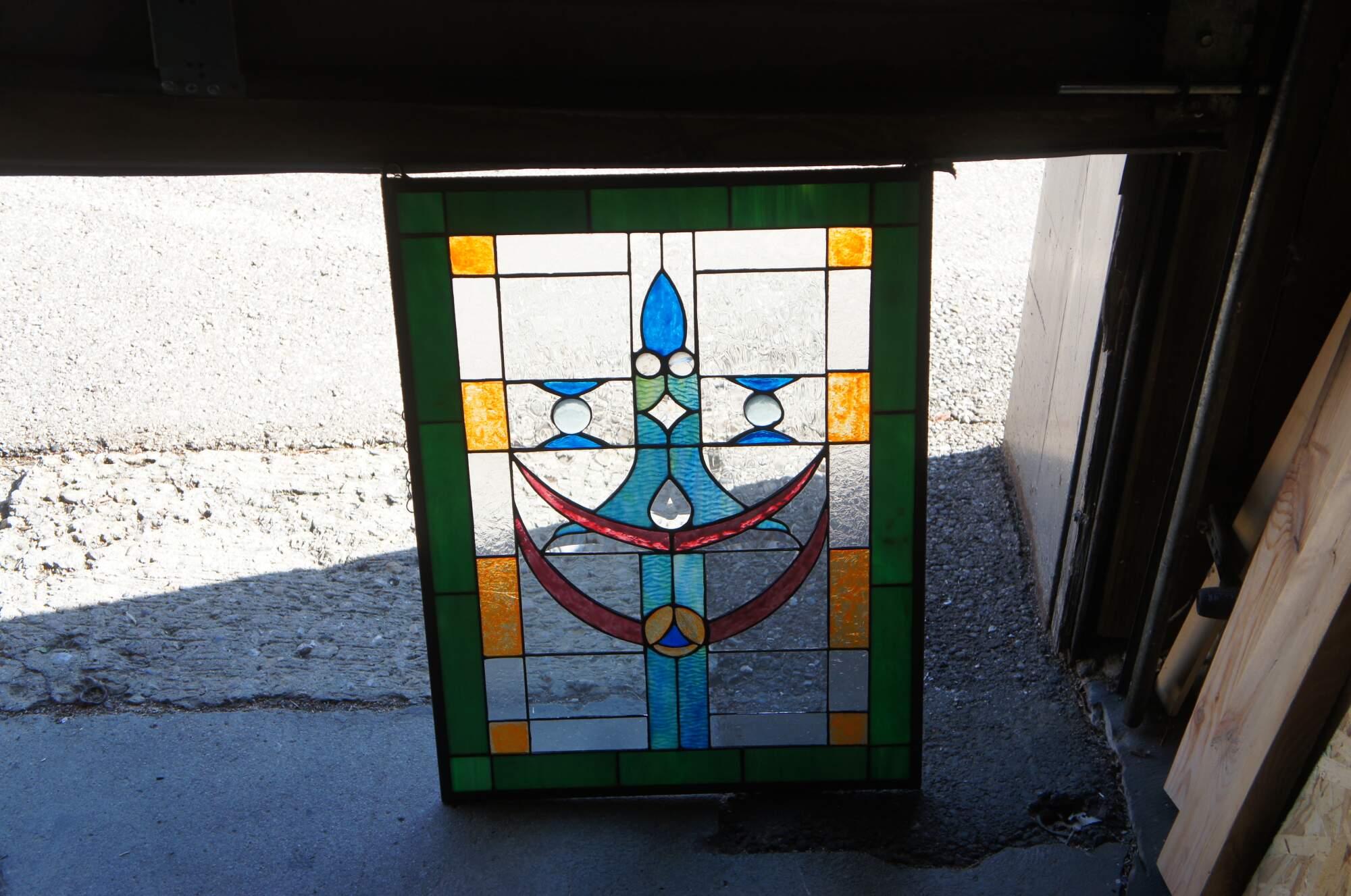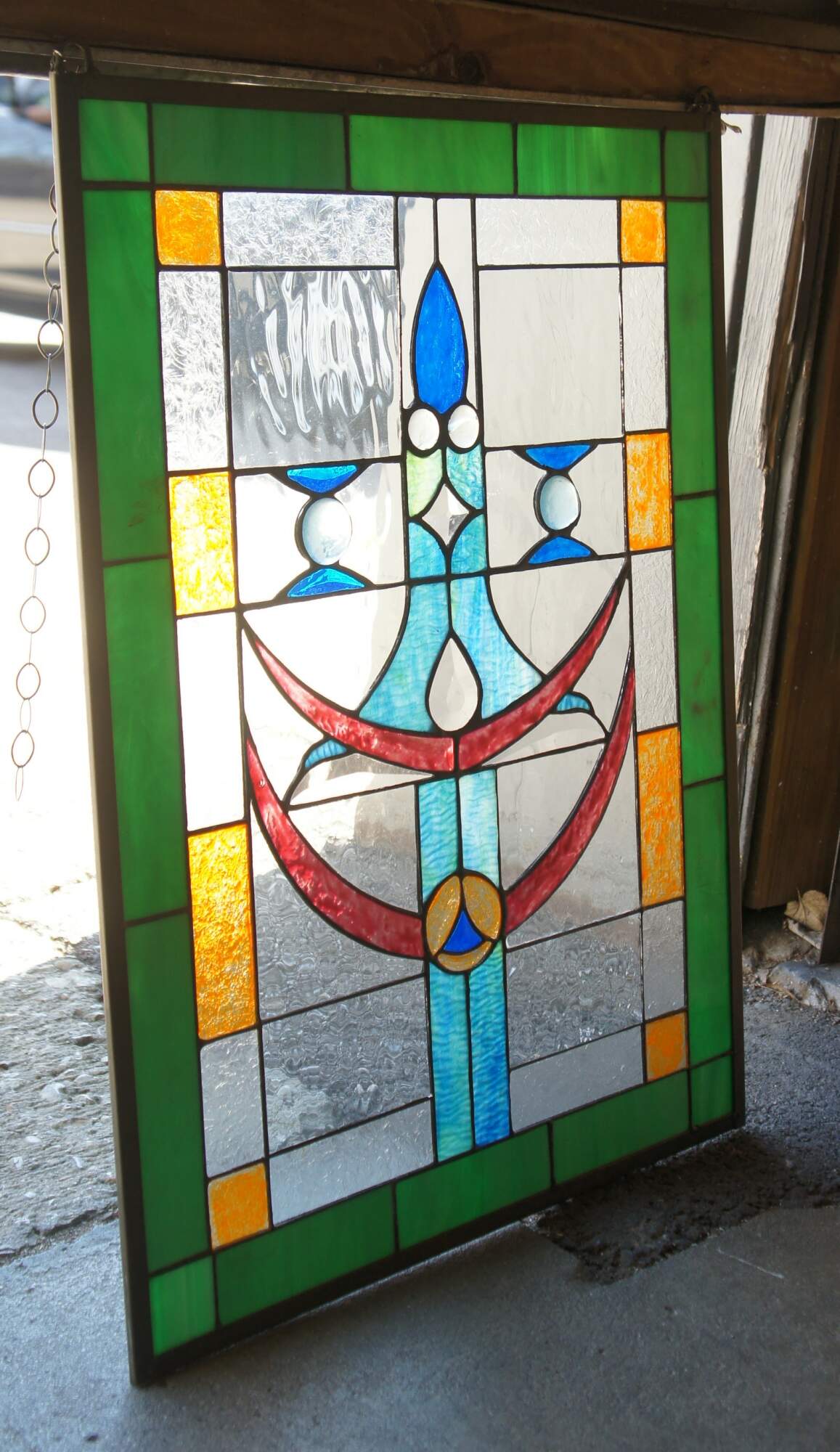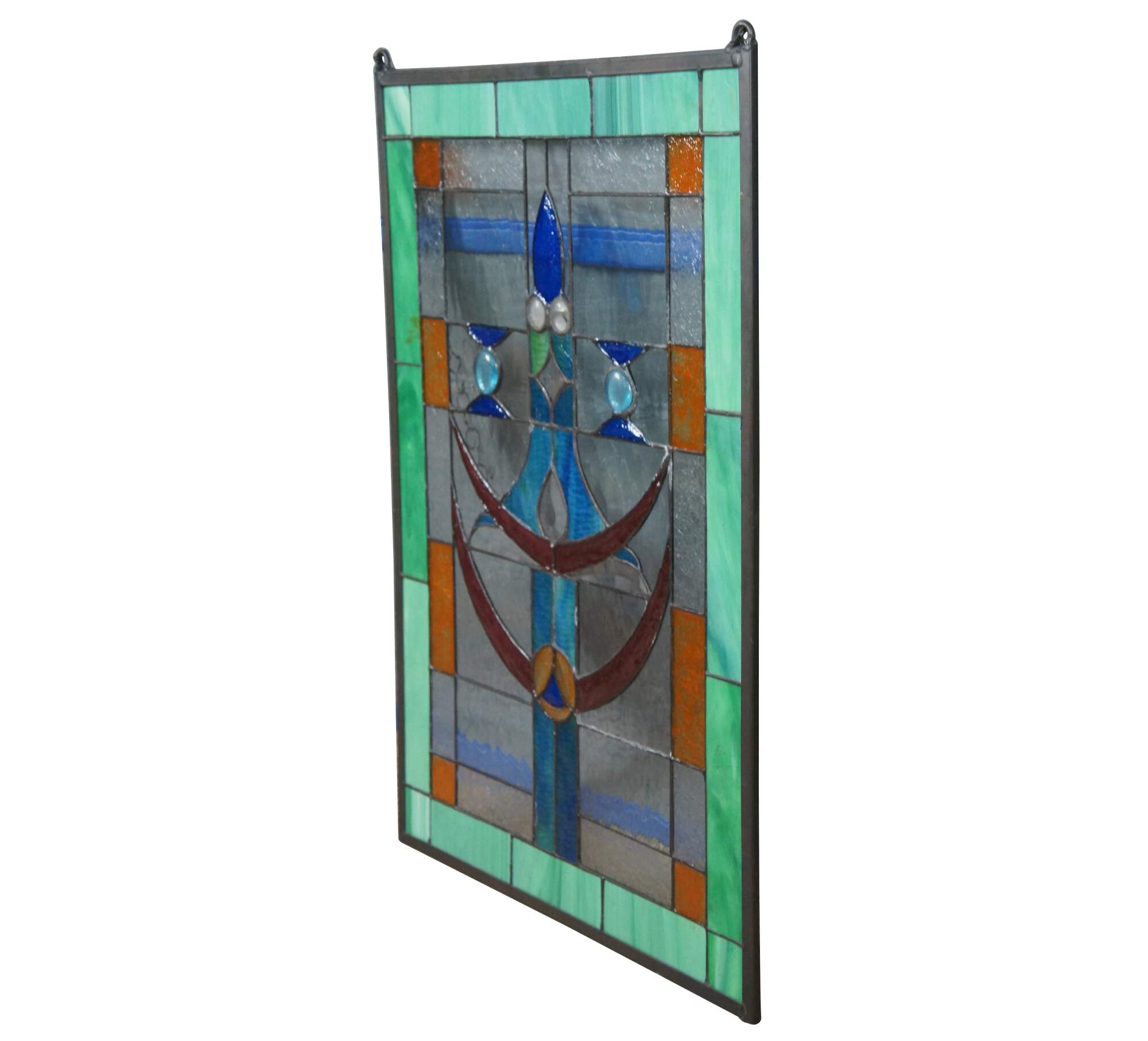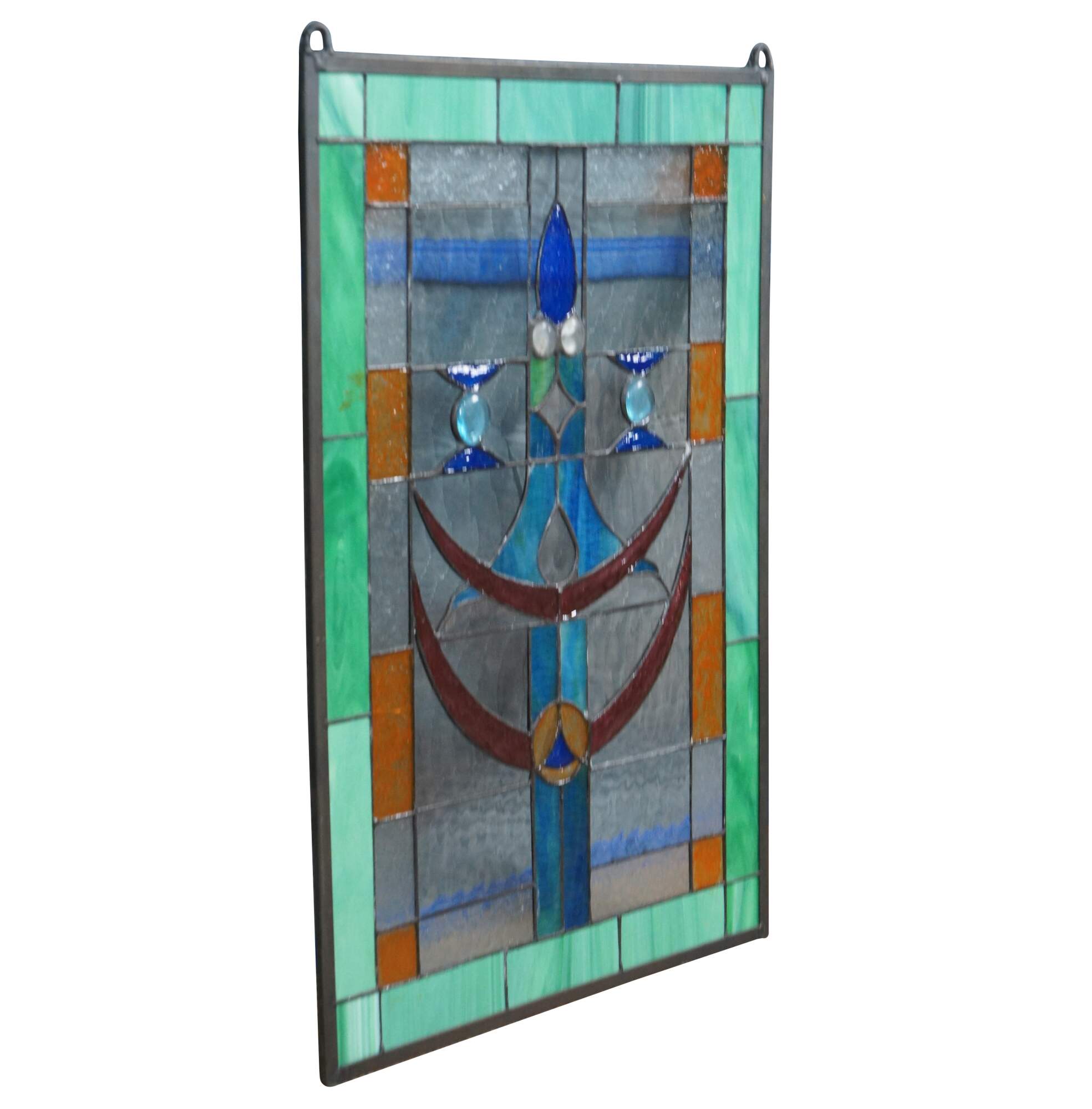 A beautiful leaded stained glass hanging panel. Features a Green border outside squares of amber, clear and a center of blues and ruby with beads. Elegant and clean lines will bring warmth to any room.