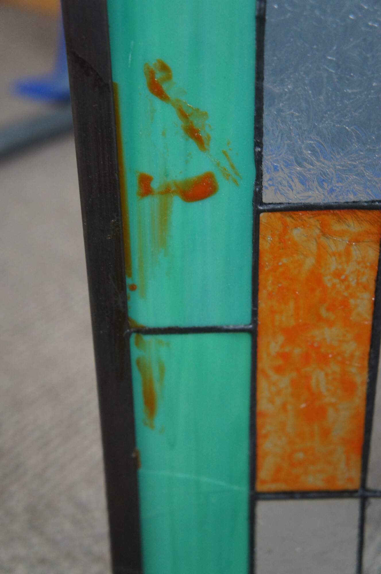 Good Vintage Condition; there is a split on an amber and green panel. The hanging chain needs to be reconnected or replaced. Residue along one of the green panels.