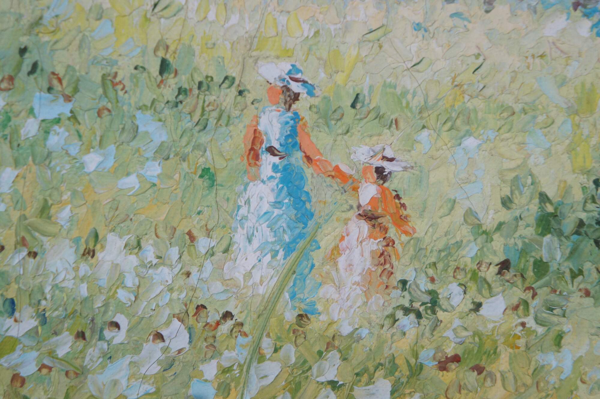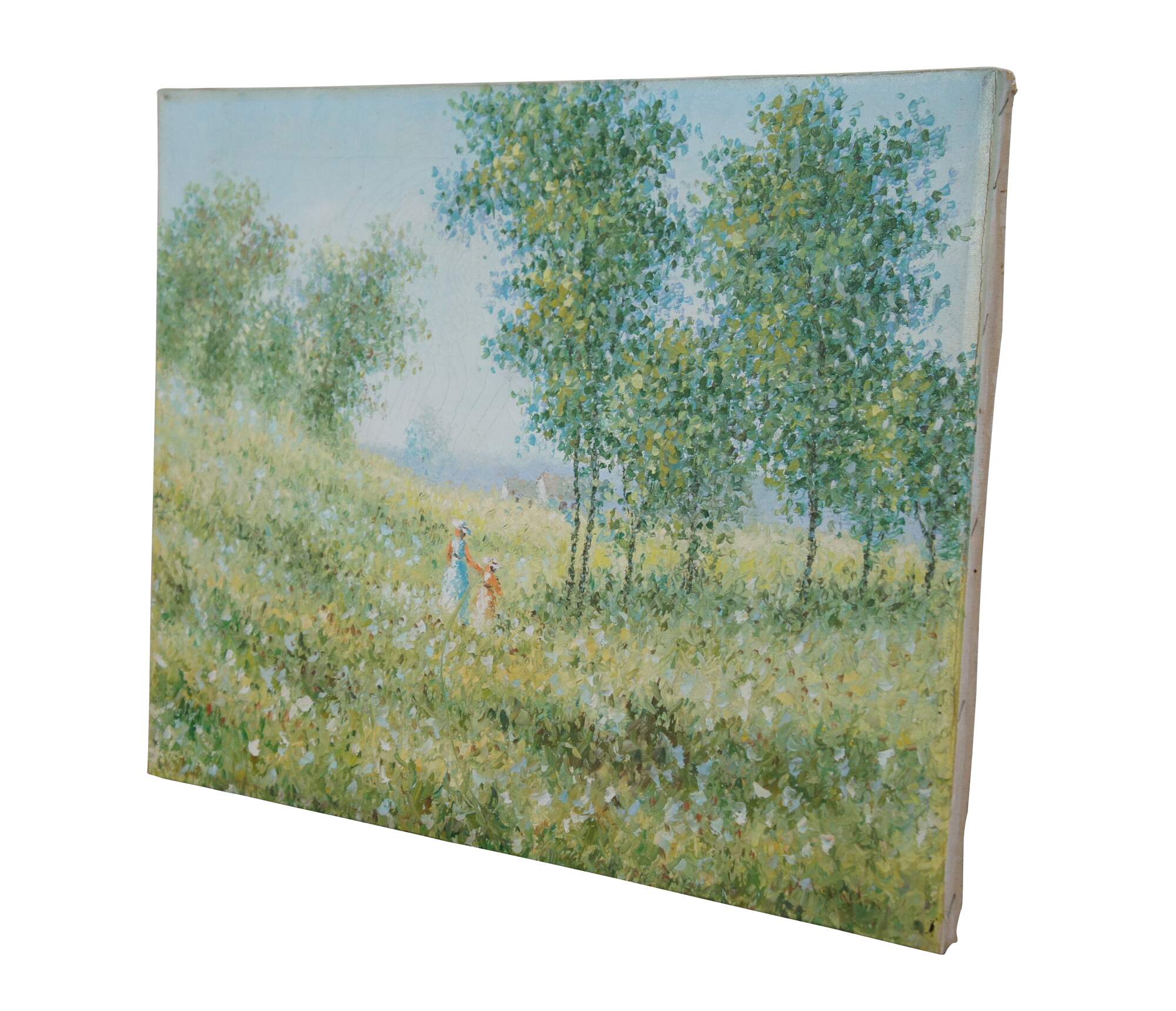 Vintage original Impressionist landscape oil painting on canvas showing a green field with trees and a pair of figures walking toward a cottage. Signed lower right, V. Noorole (Nookole / Noopole?).