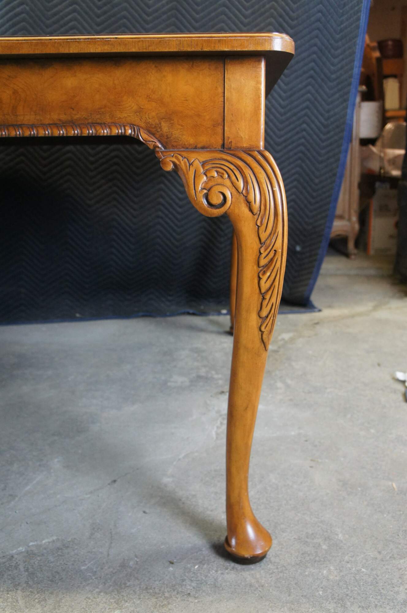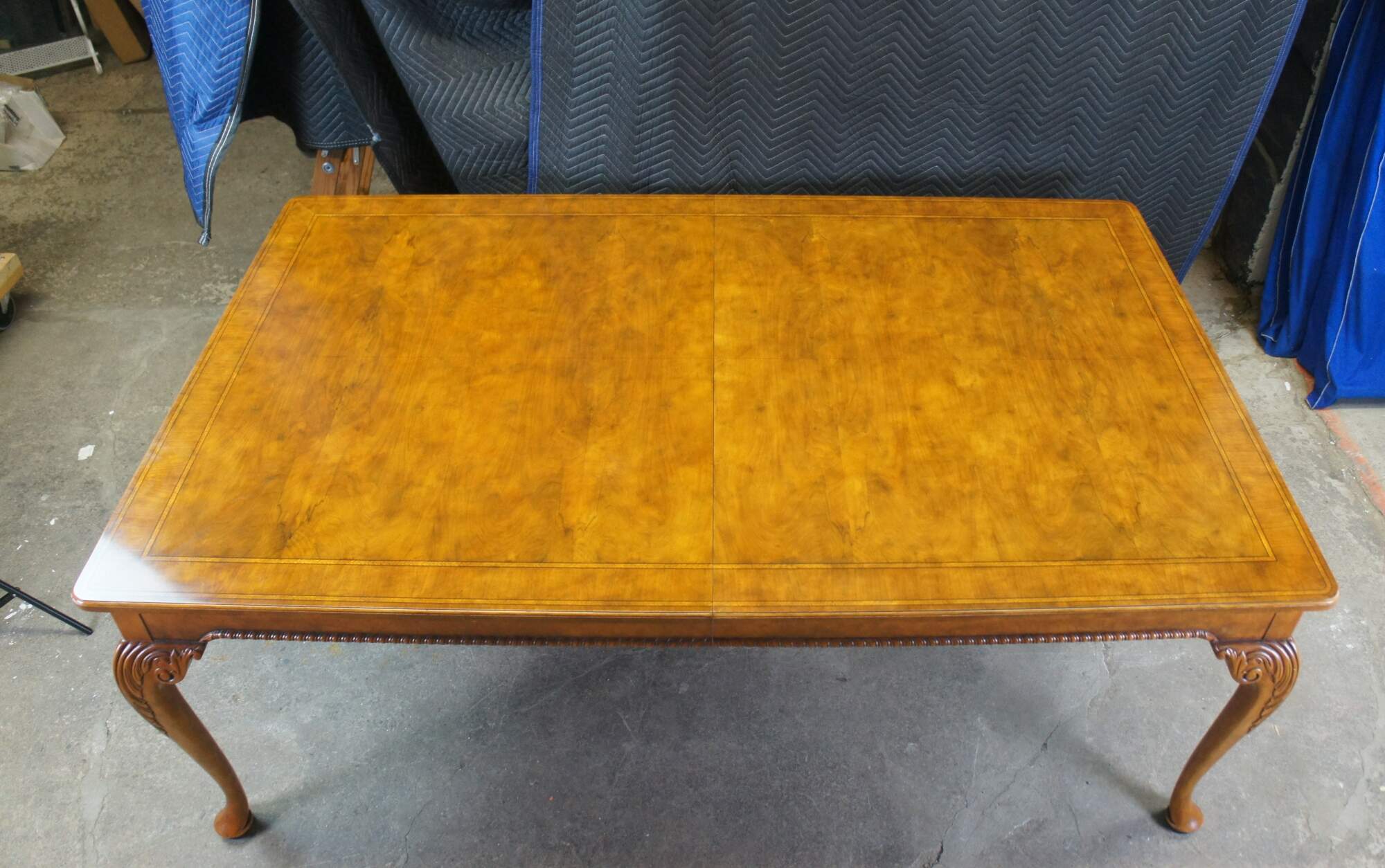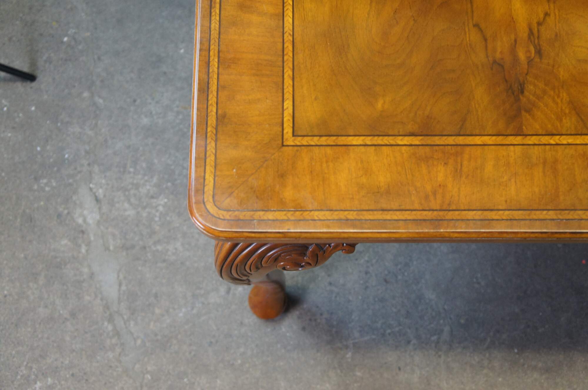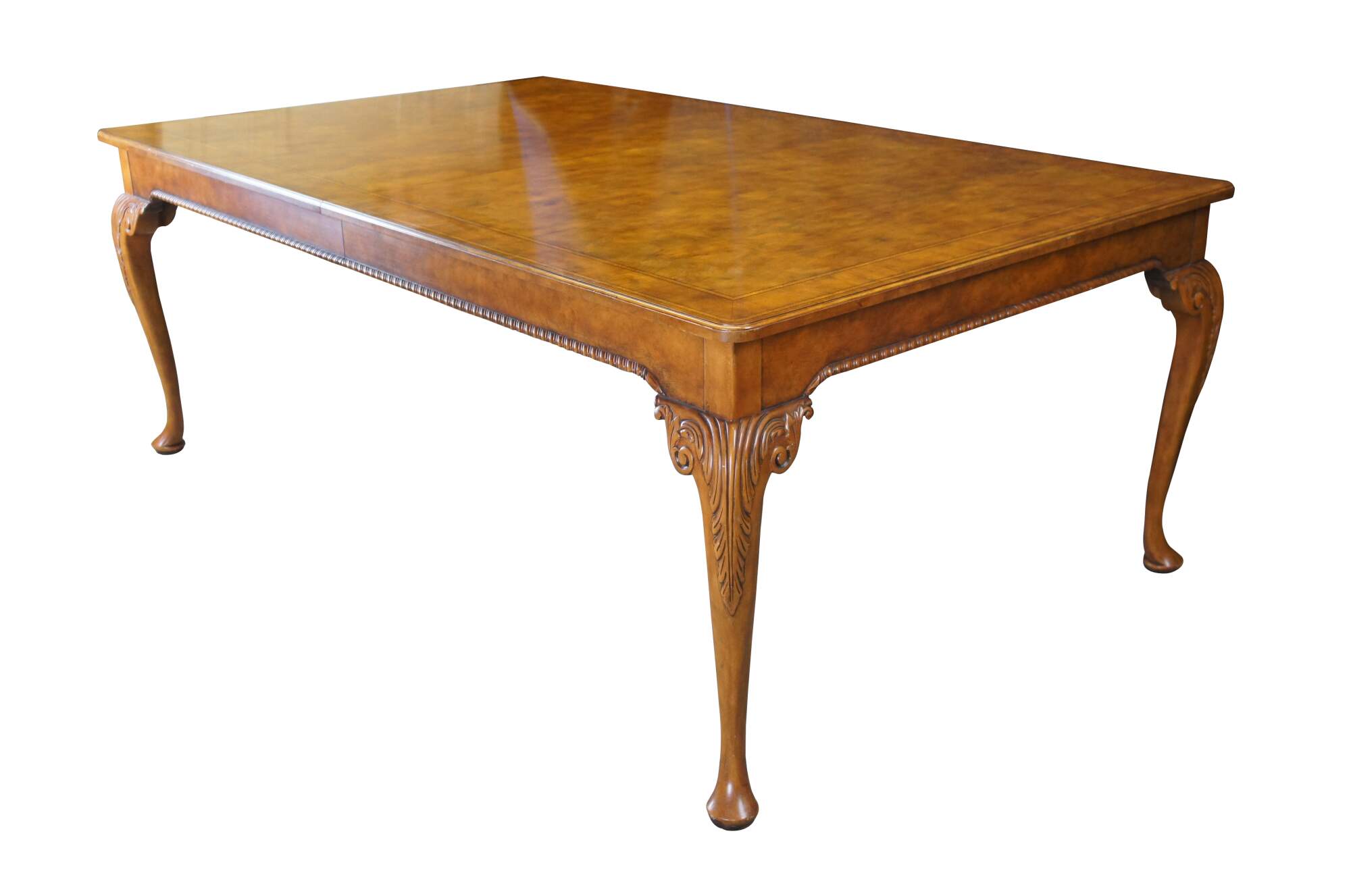 The table features stunning book-matched walnut and walnut burl with inlaid herringbone satinwood and ebonized borders and a rounded rectangular top. The shaped frieze has a carved gadrooned trim and rests on cabriole legs with carved acanthus scrolled knees. The long legs terminate into large pad feet. Includes 3 leafs for extension.