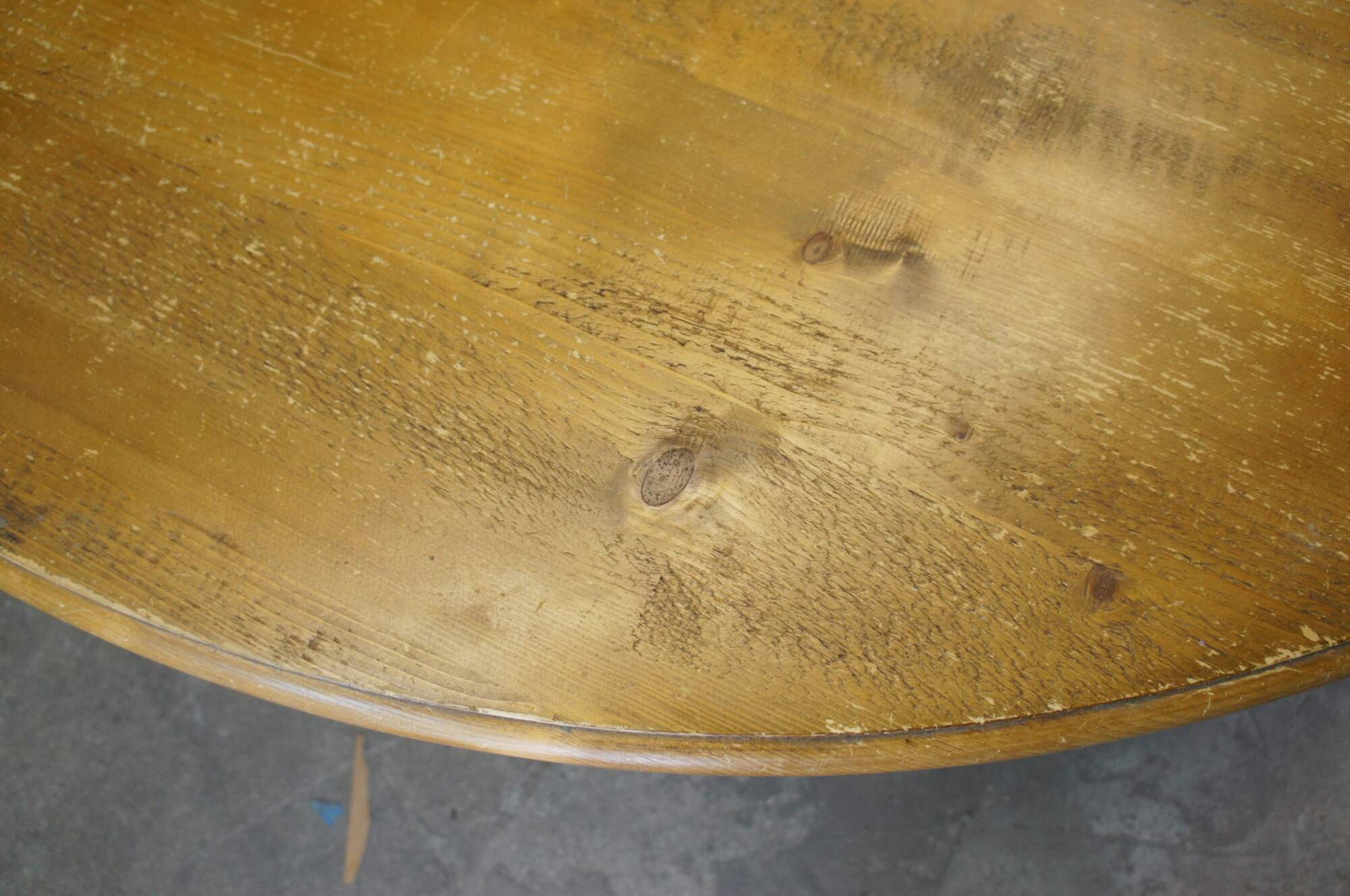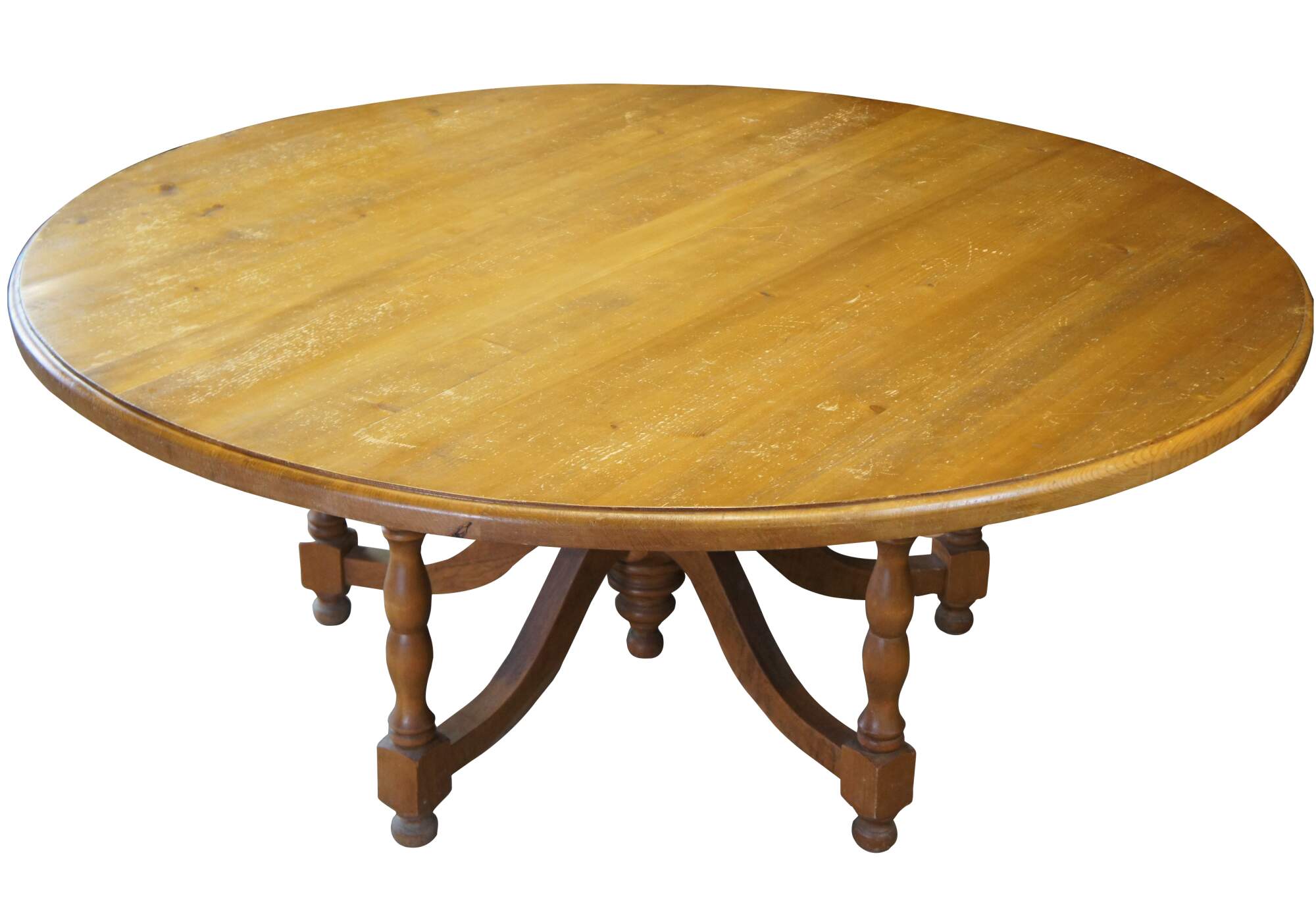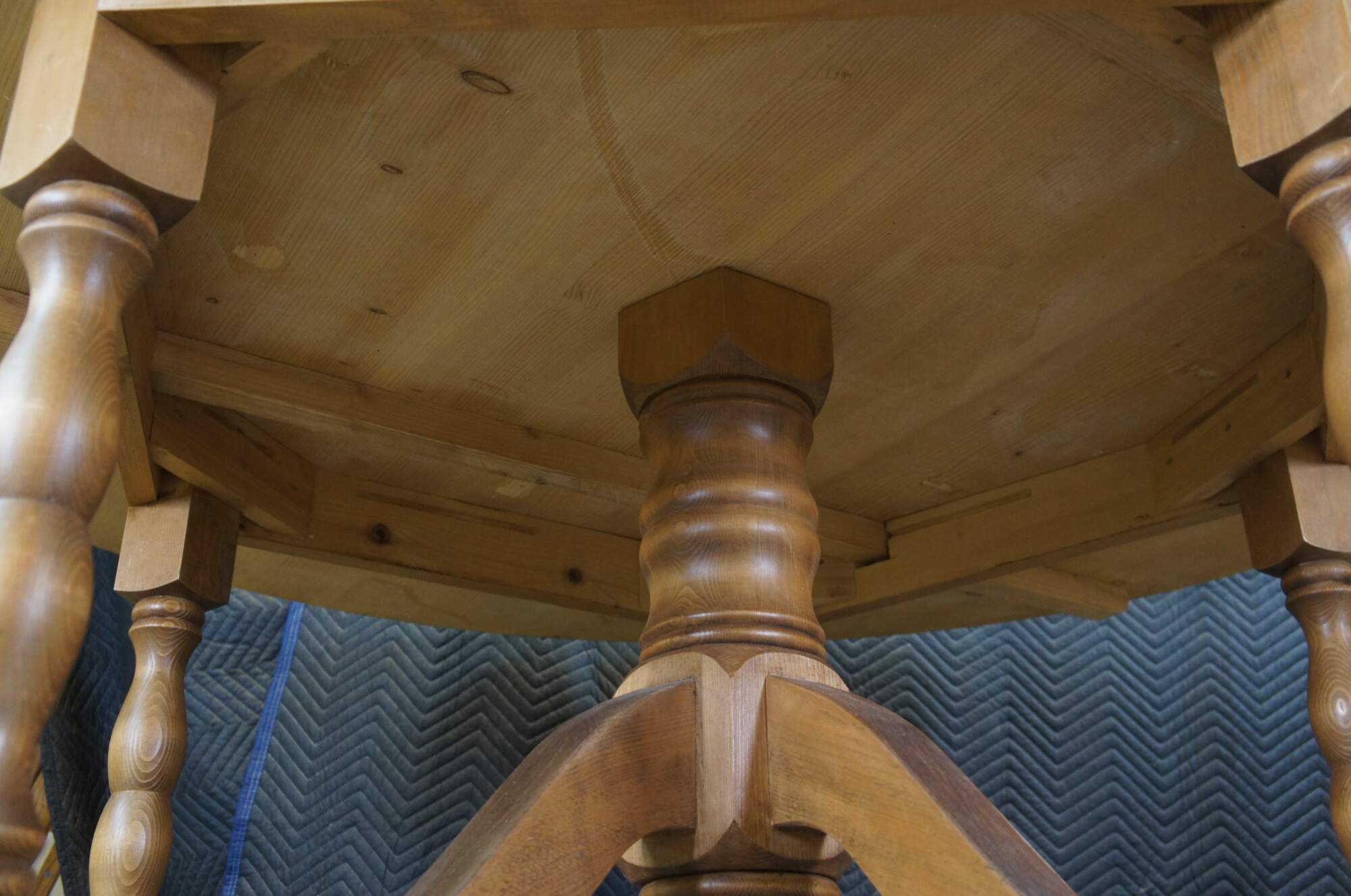 A large impressive European dining, breakfast or center table. Made from distressed pine in the Czech Republic, circa 1980s. Features a large round top over a five leg baluster turned base with bun feet. Each leg is connected to the robust center post by a downswept stretcher. Marked along the top of the base.