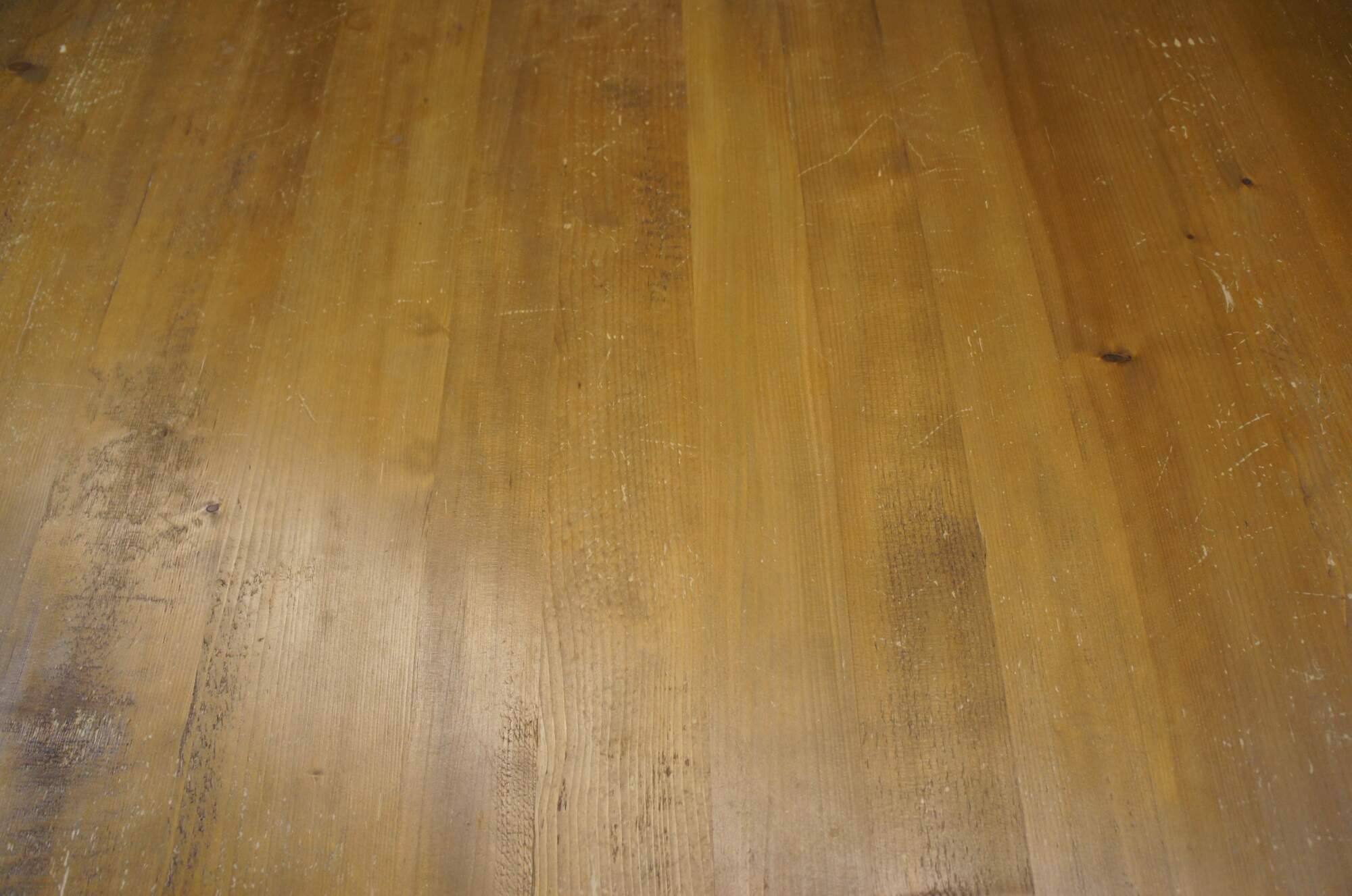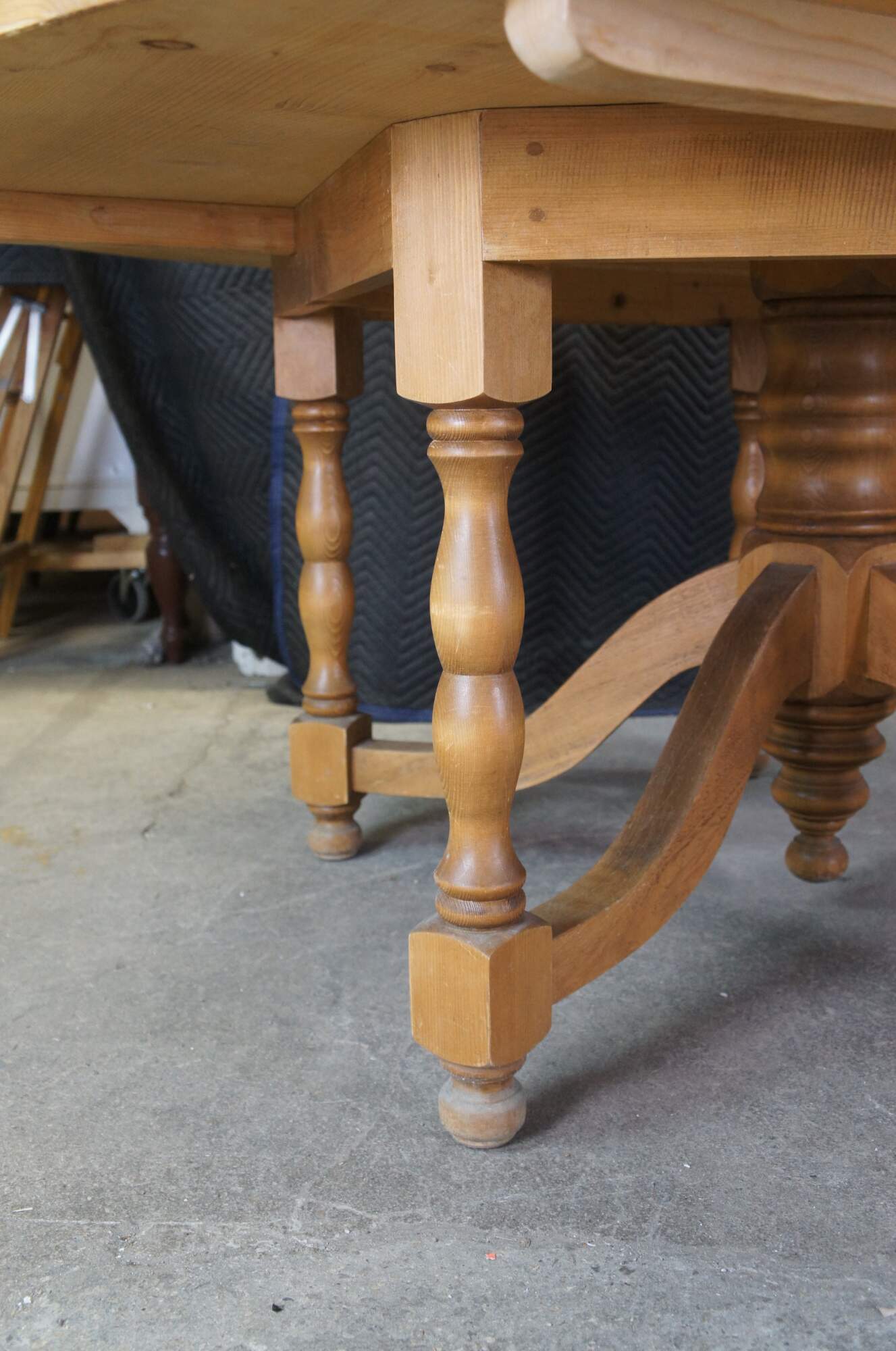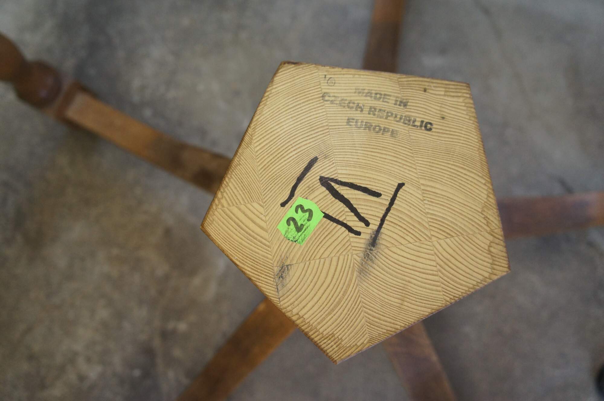 A large impressive European dining, breakfast or center table. Made from distressed pine in the Czech Republic, circa 1980s. Features a large round top over a five leg baluster turned base with bun feet. Each leg is connected to the robust center post by a downswept stretcher. Marked along the top of the base.