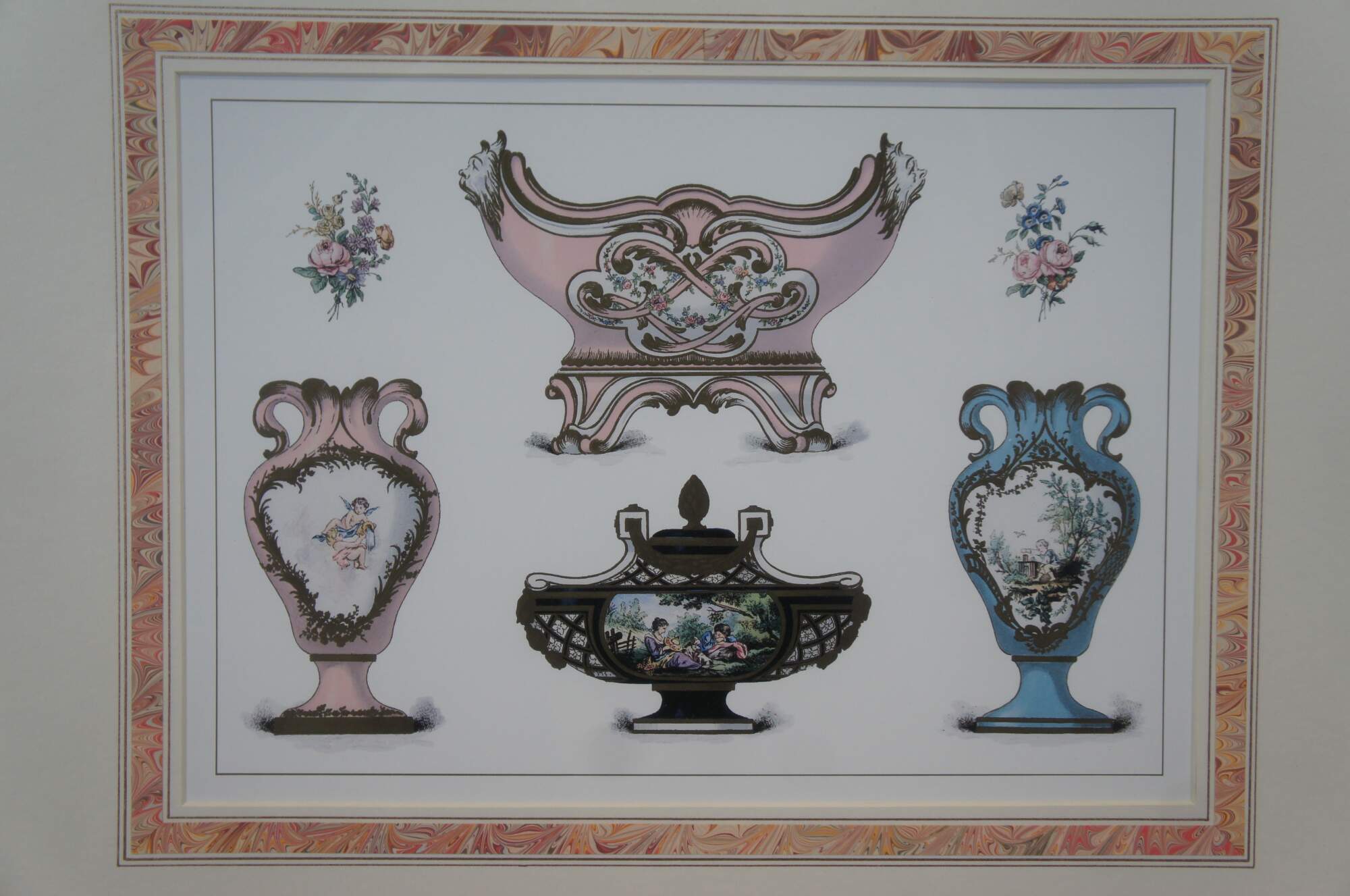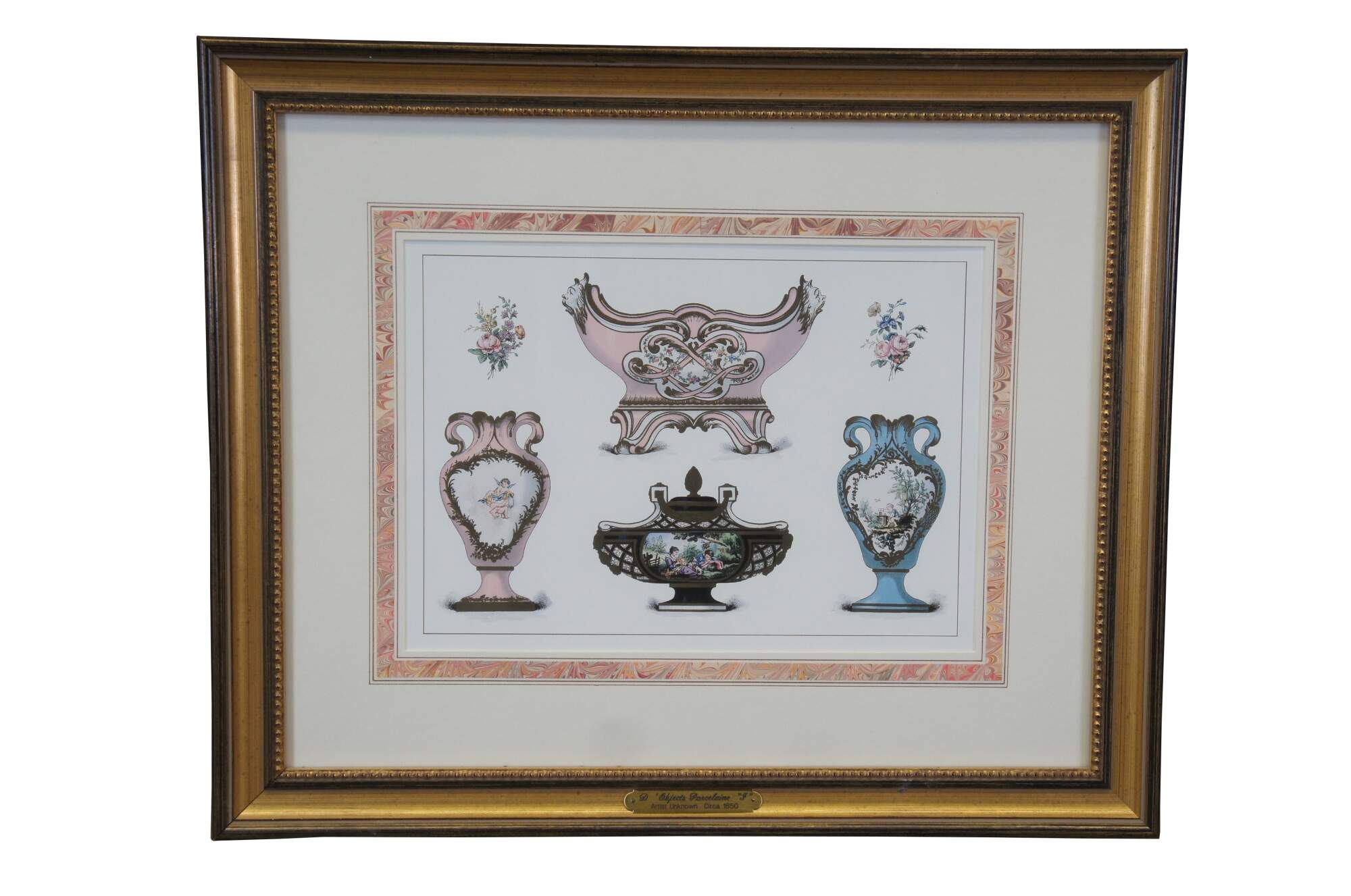 A beautiful pair of prints Titled "The Porcelain of Sevres" after Edouard Garnier. Reproduced by Denunzio in last quarter of the 20th century. Neatly framed in gold with plaque.