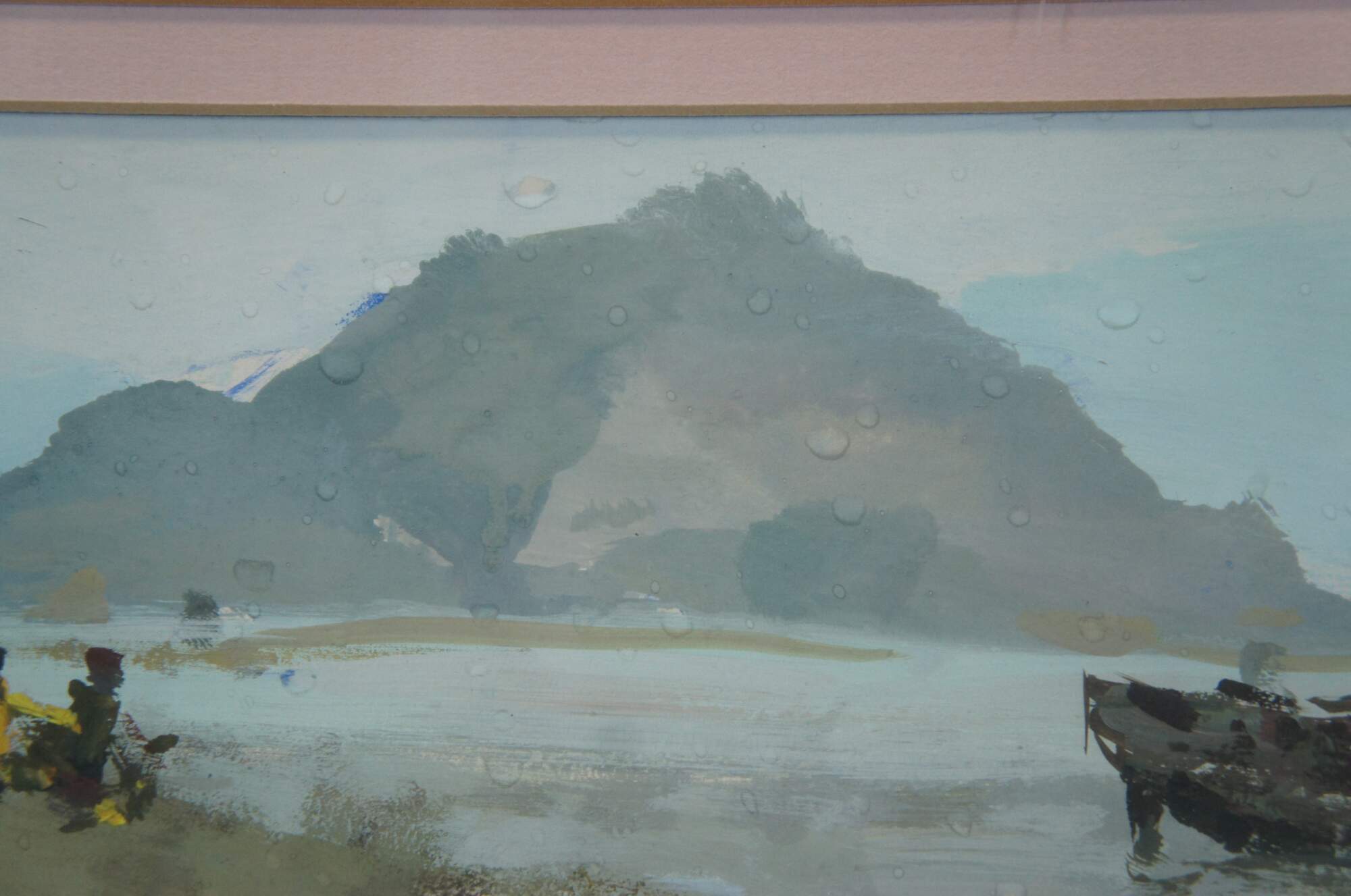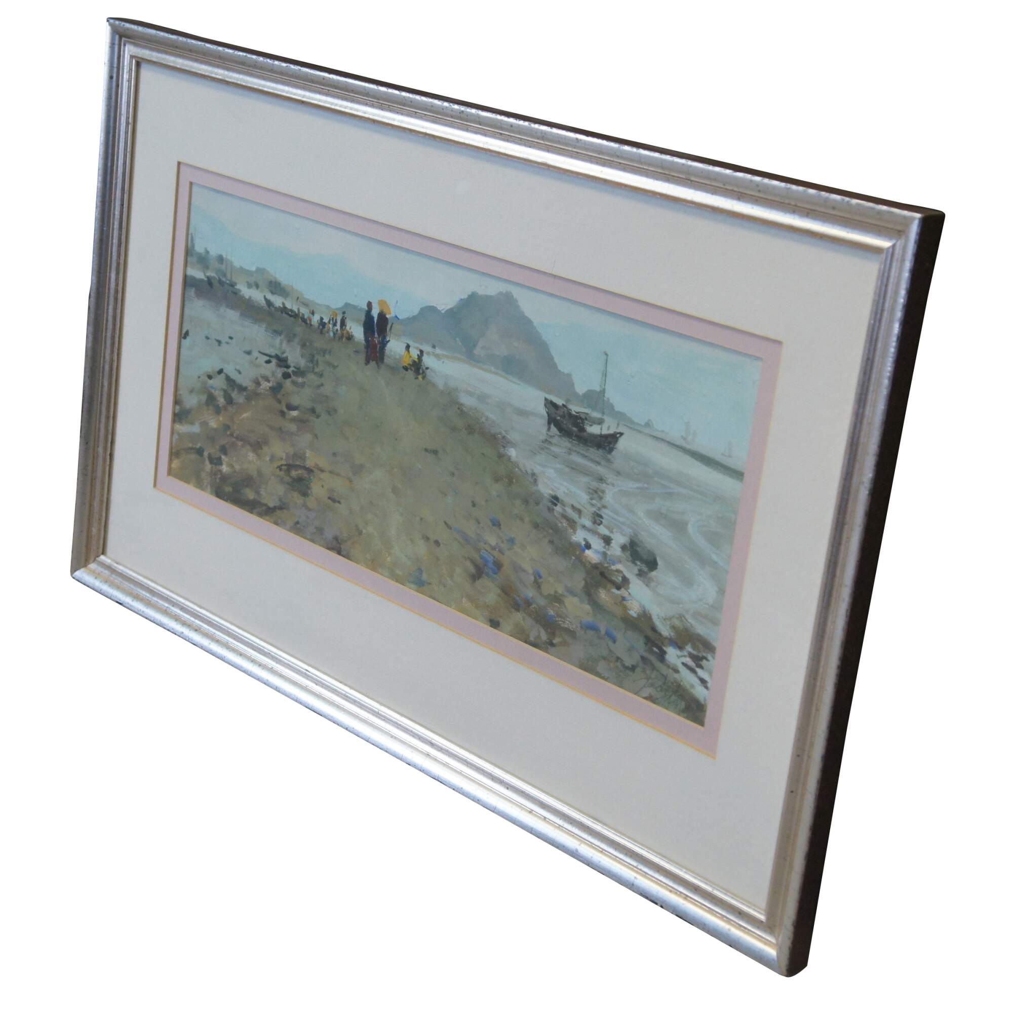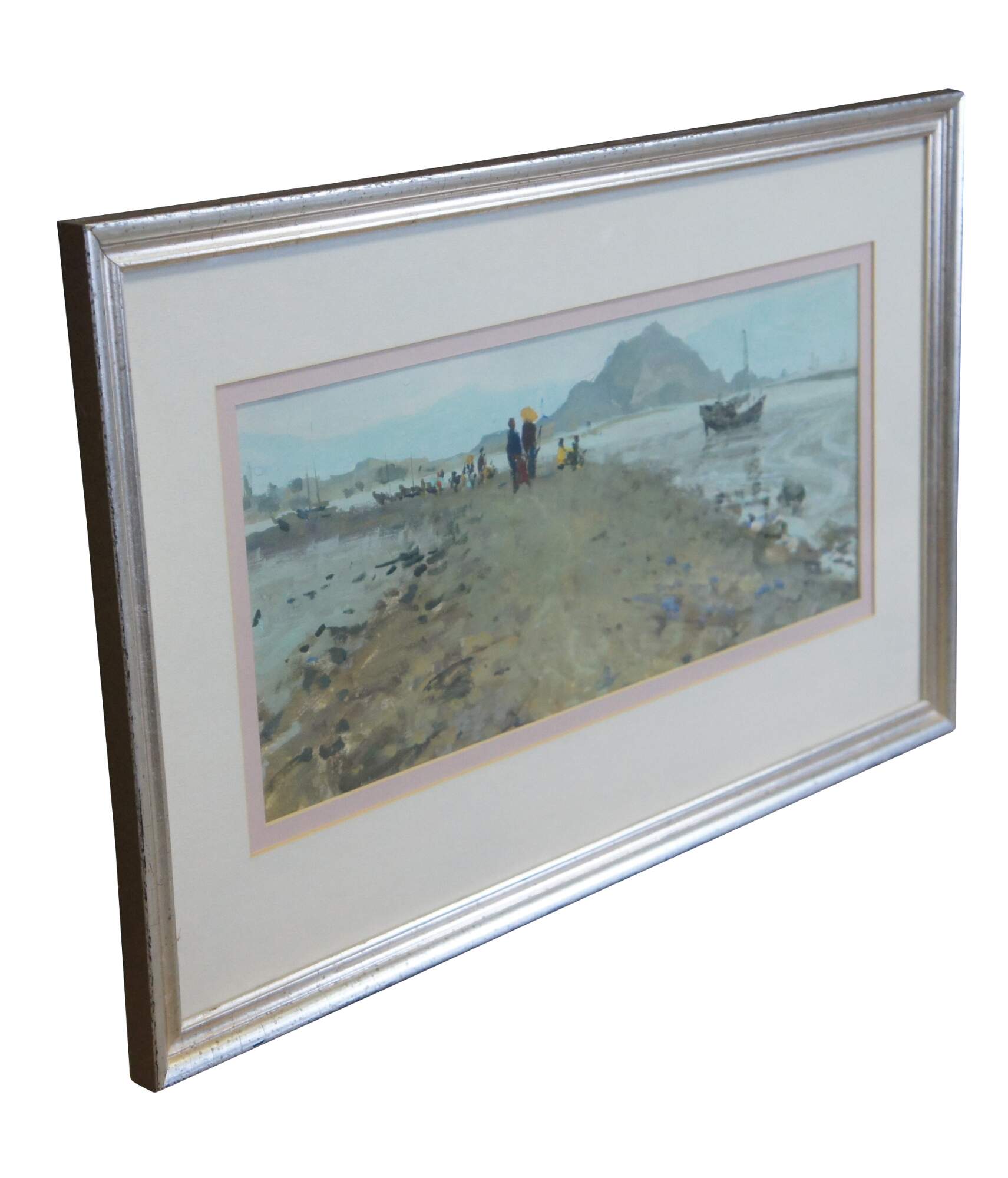 Vintage Asian Impressionist watercolor seascape painting. Features figures along a peninsula with sailboats. The painting is signed lower right in pencil by Sue. The rest of the signature cannot be made out