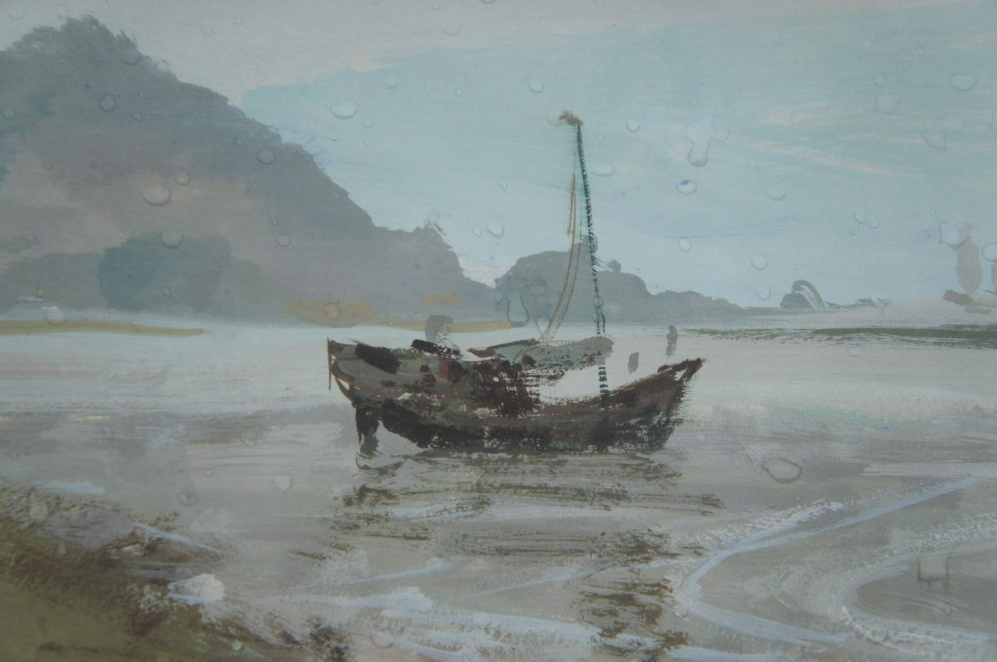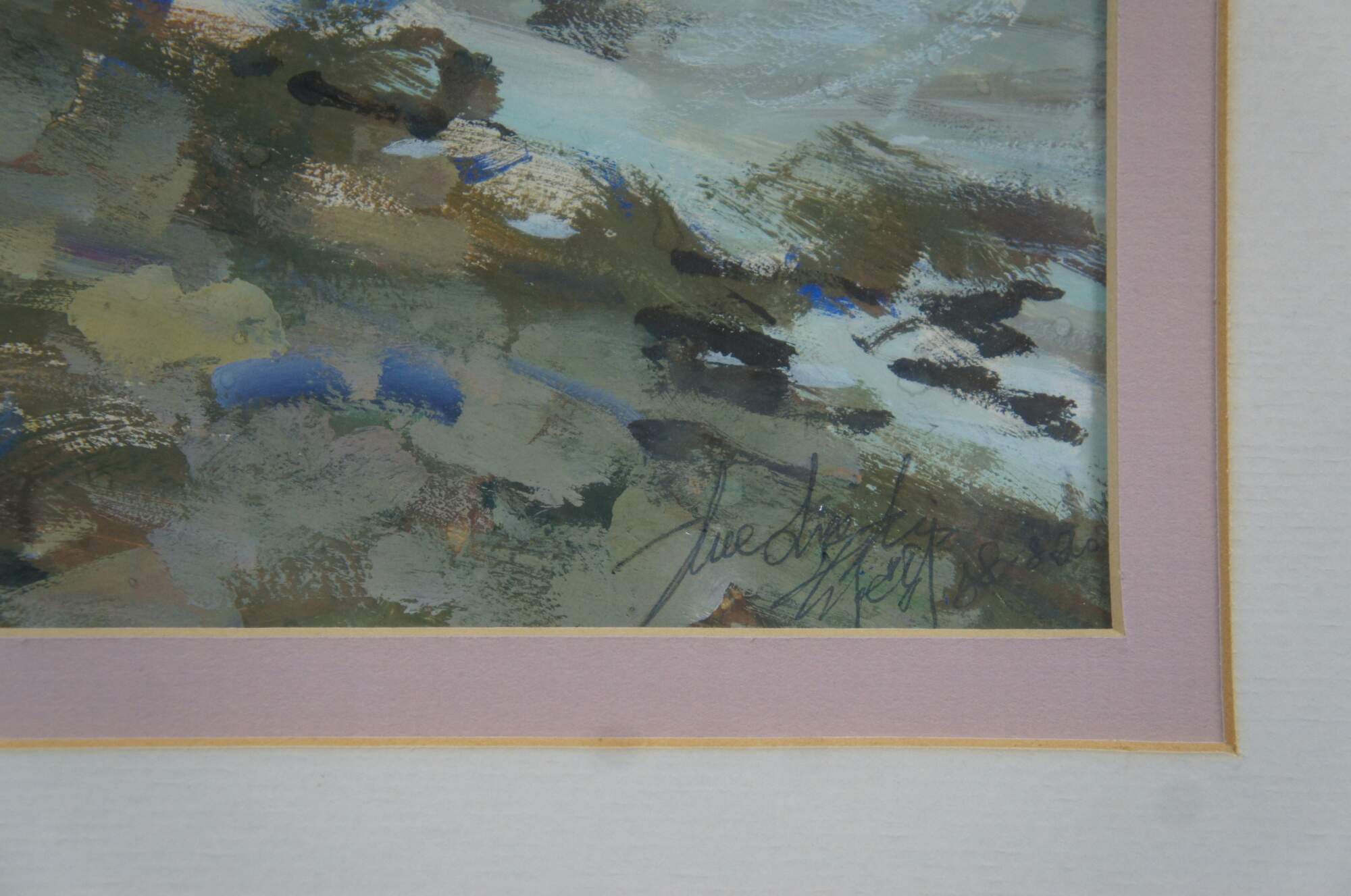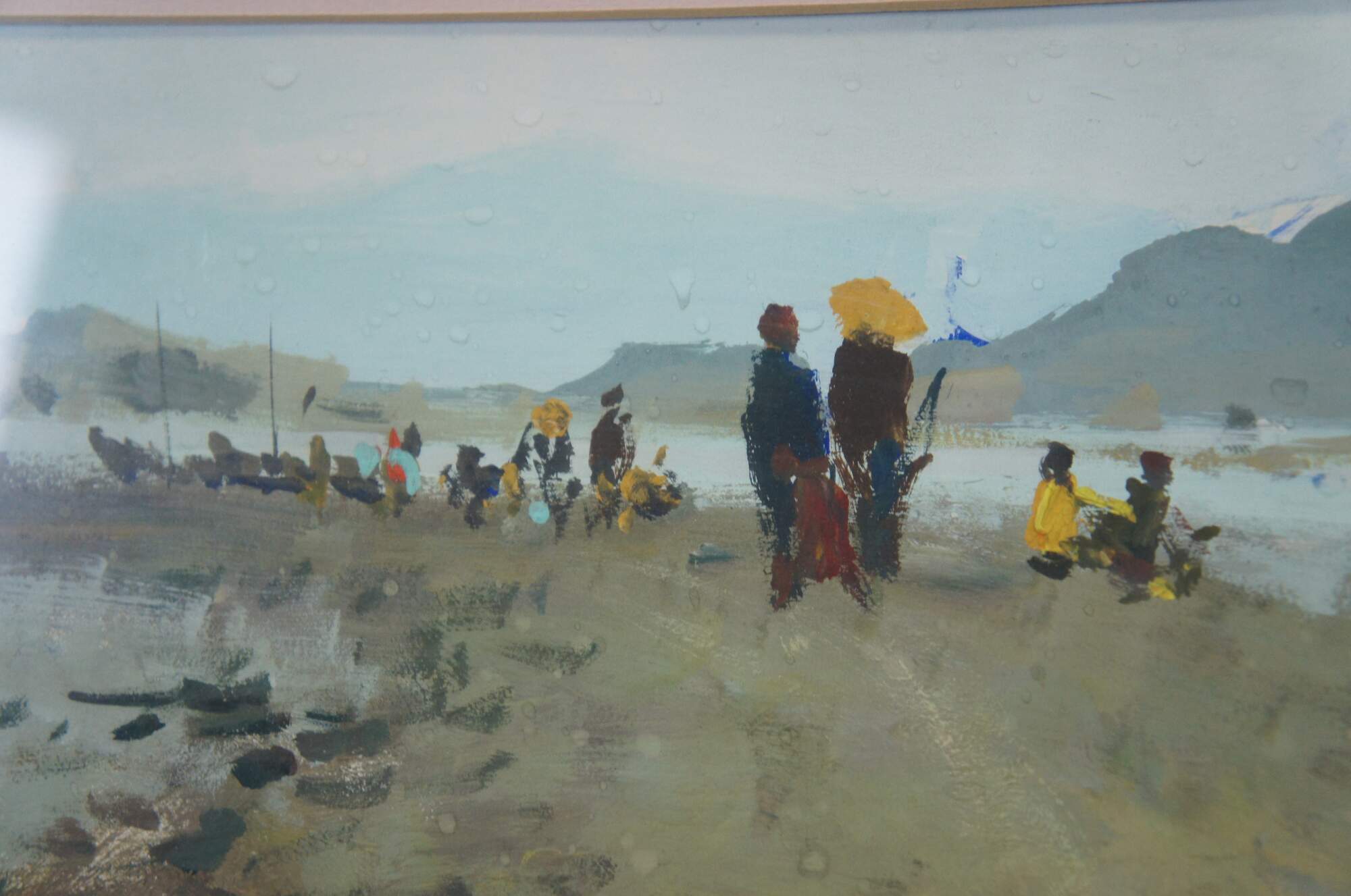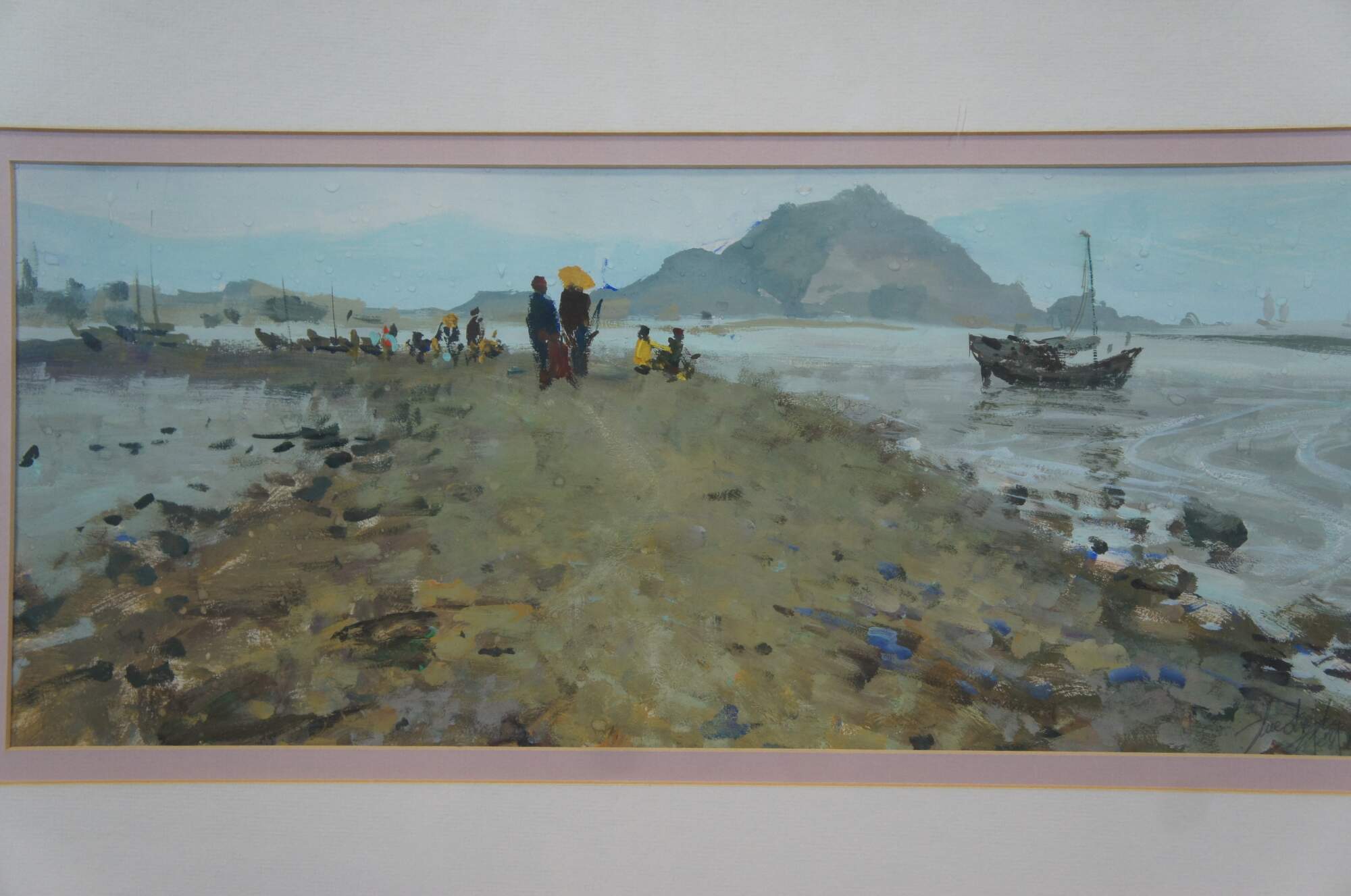 Vintage Asian Impressionist watercolor seascape painting. Features figures along a peninsula with sailboats. The painting is signed lower right in pencil by Sue. The rest of the signature cannot be made out