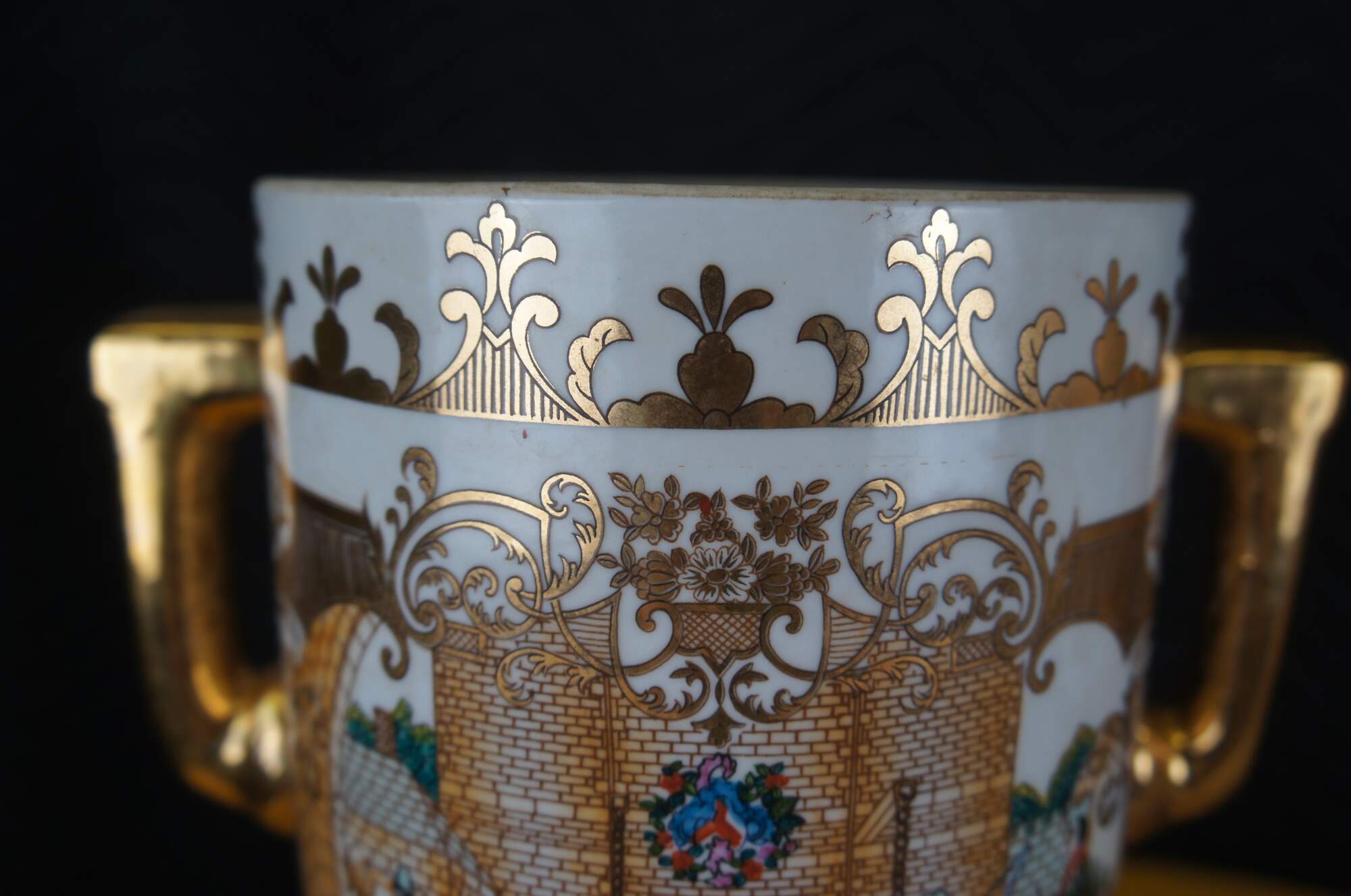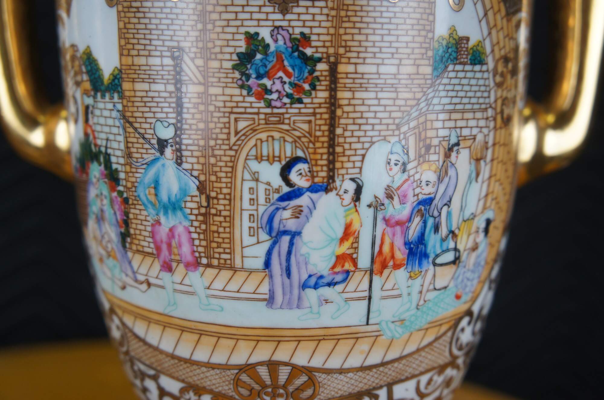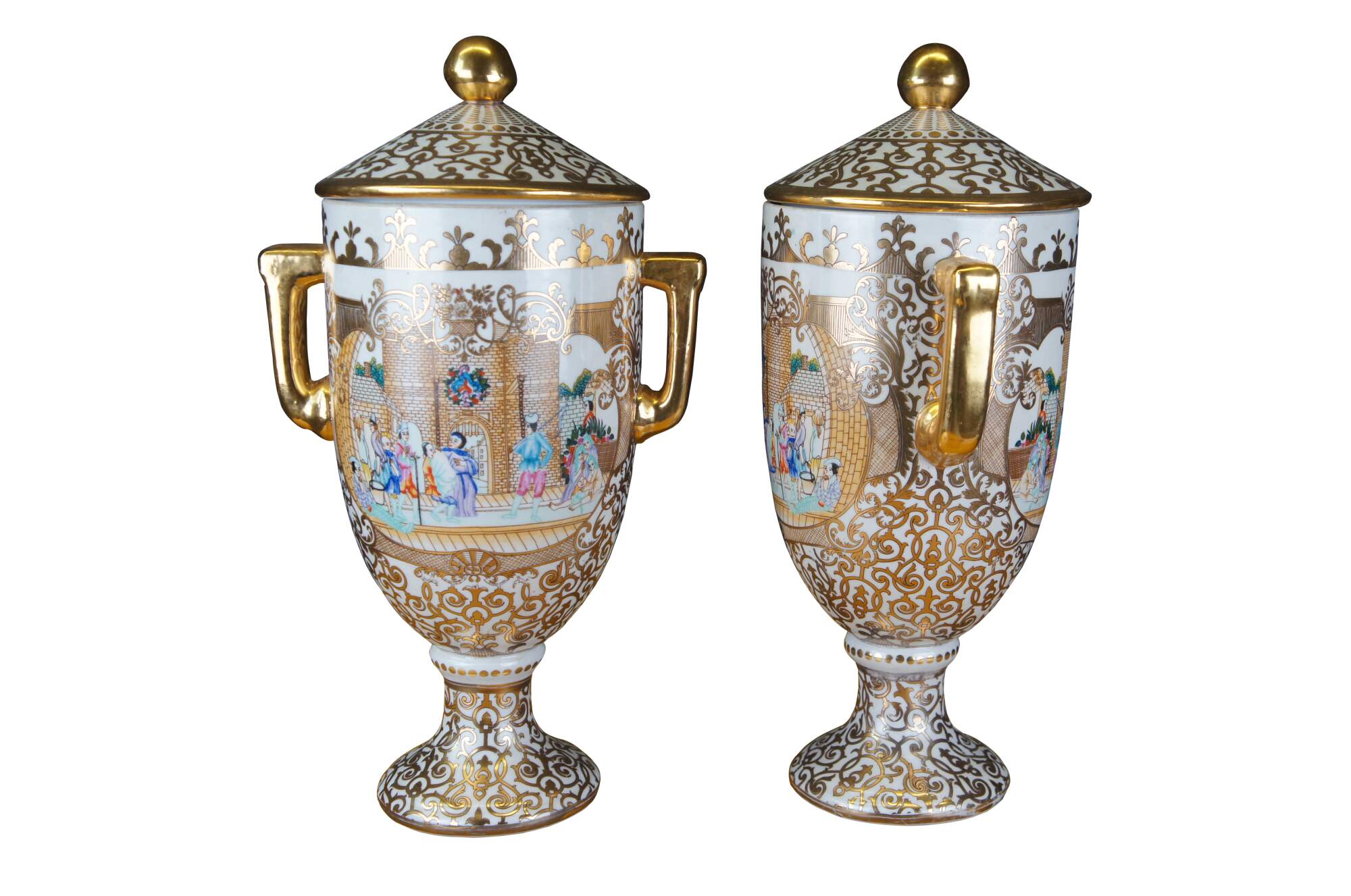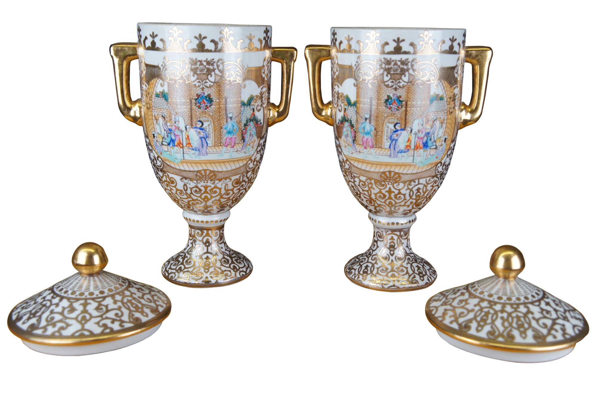 Beautiful pair of late 20th century Chinese porcelain buffet urns. Each features a white base with gold trim and central medieval castle landscape scene. Shaped in classical trophy urn form with handles and lid. Marked along underside.