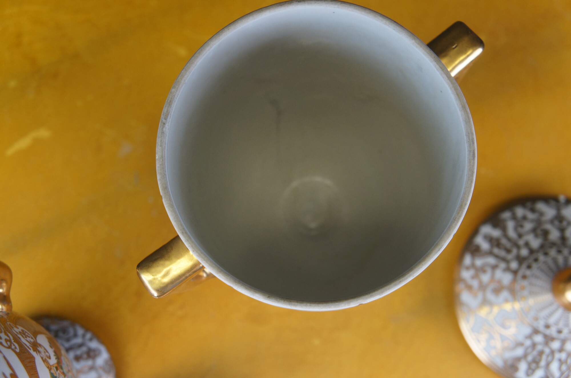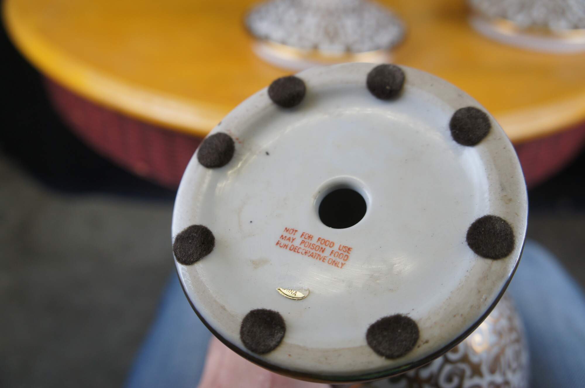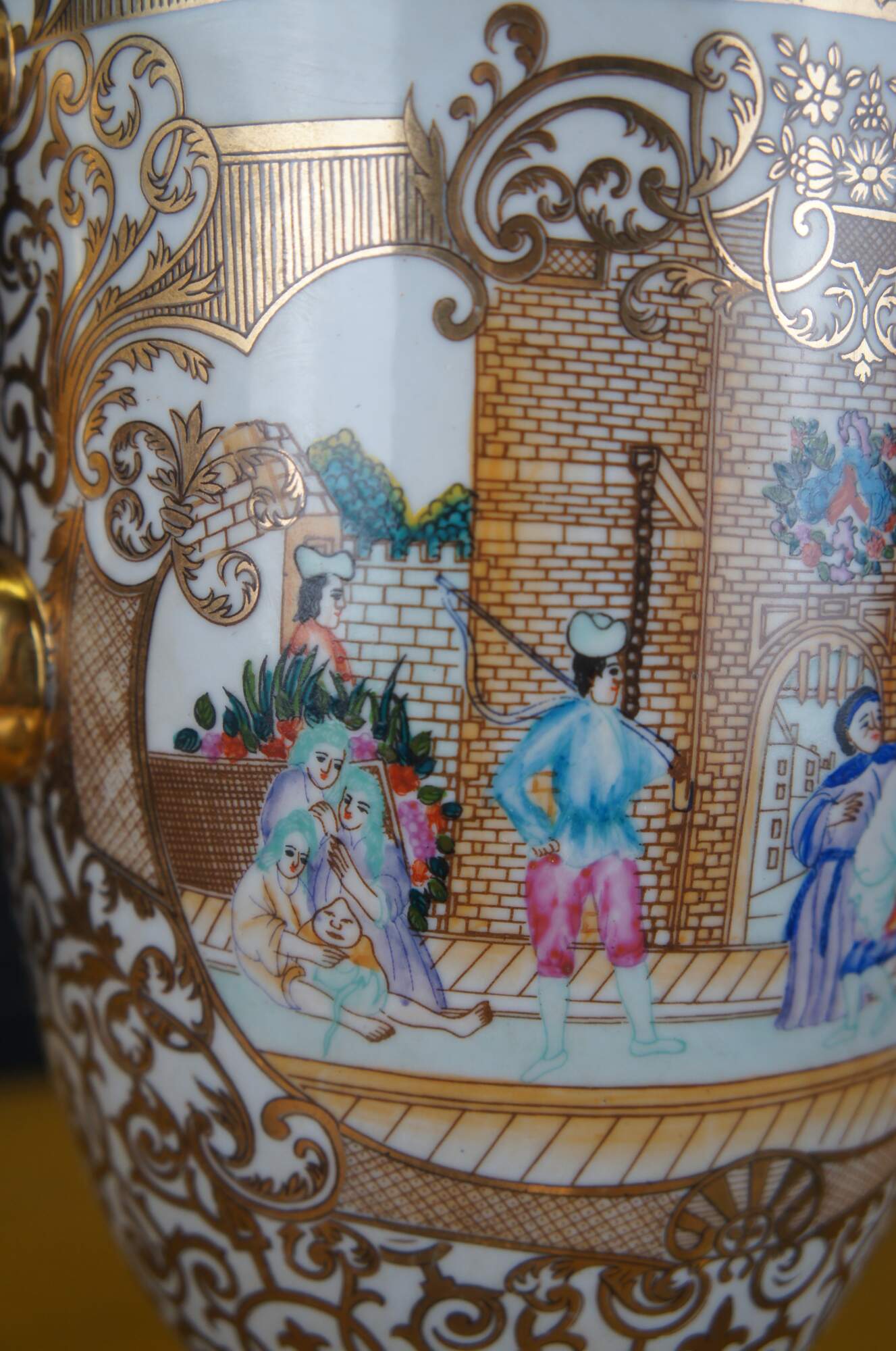 Beautiful pair of late 20th century Chinese porcelain buffet urns. Each features a white base with gold trim and central medieval castle landscape scene. Shaped in classical trophy urn form with handles and lid. Marked along underside.