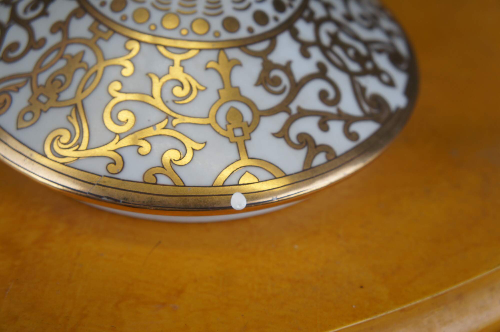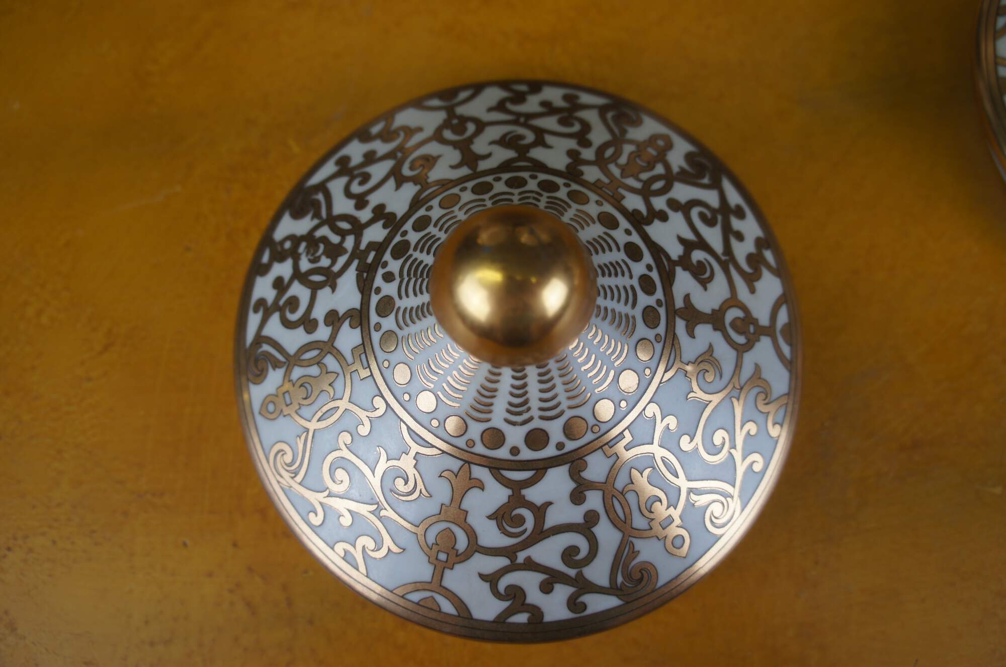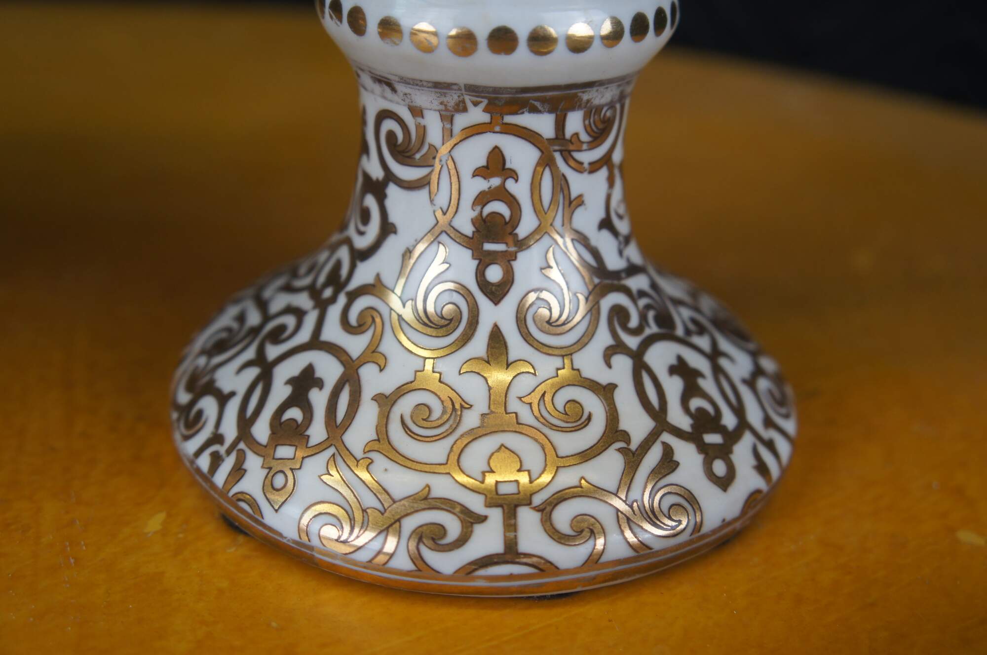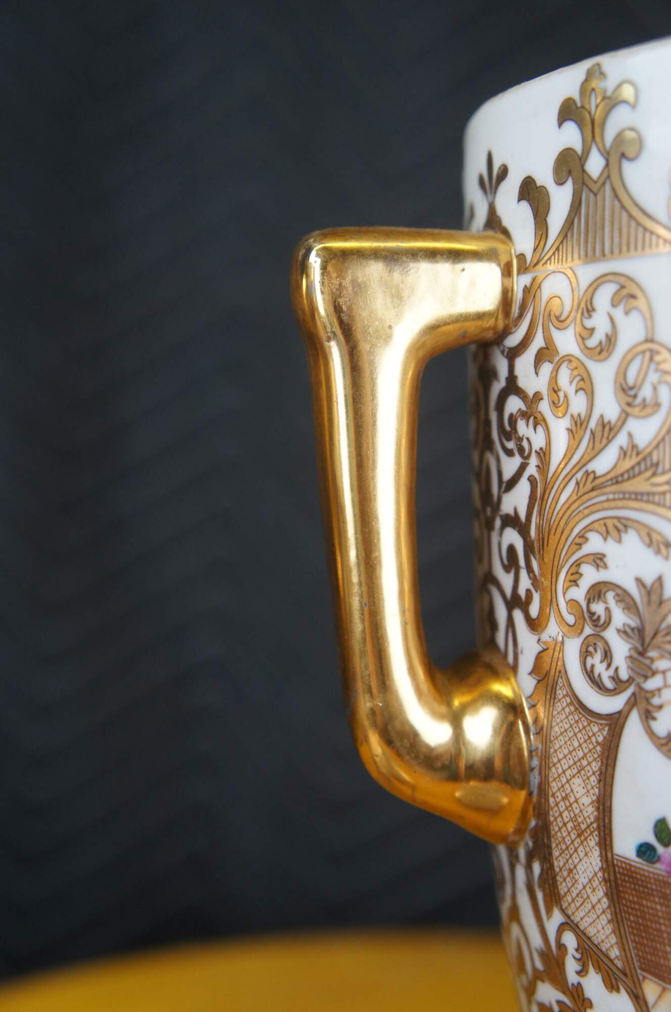 Beautiful pair of late 20th century Chinese porcelain buffet urns. Each features a white base with gold trim and central medieval castle landscape scene. Shaped in classical trophy urn form with handles and lid. Marked along underside.
