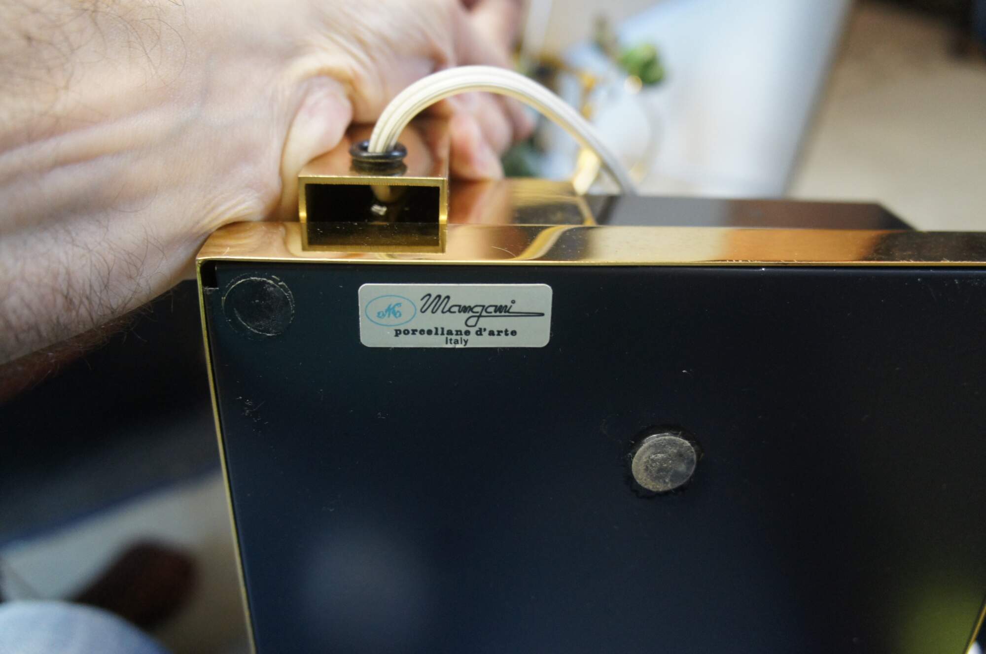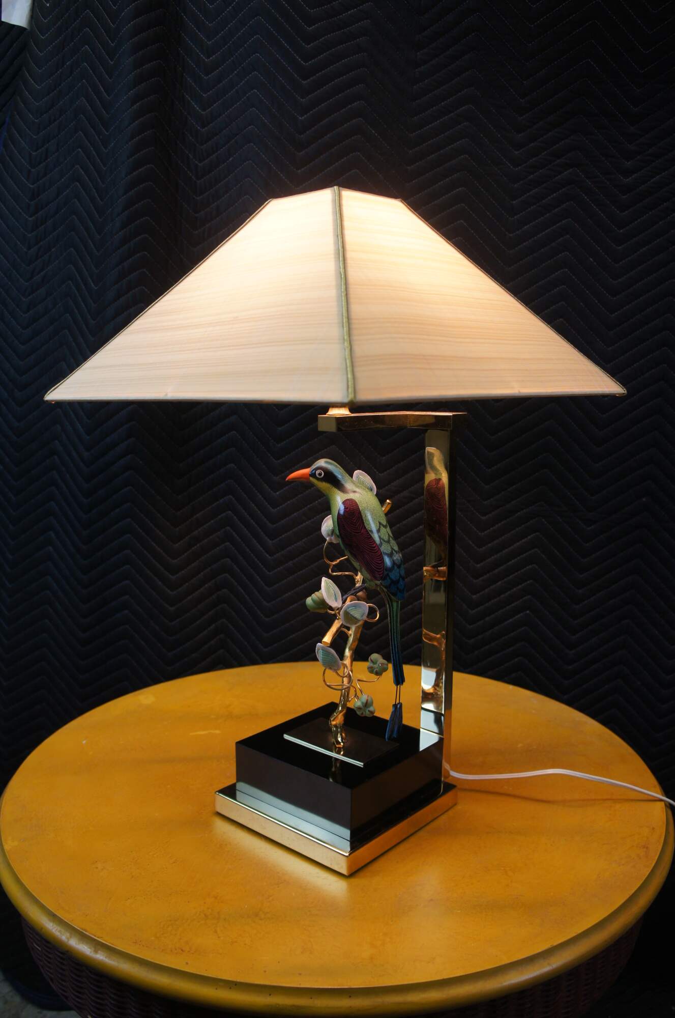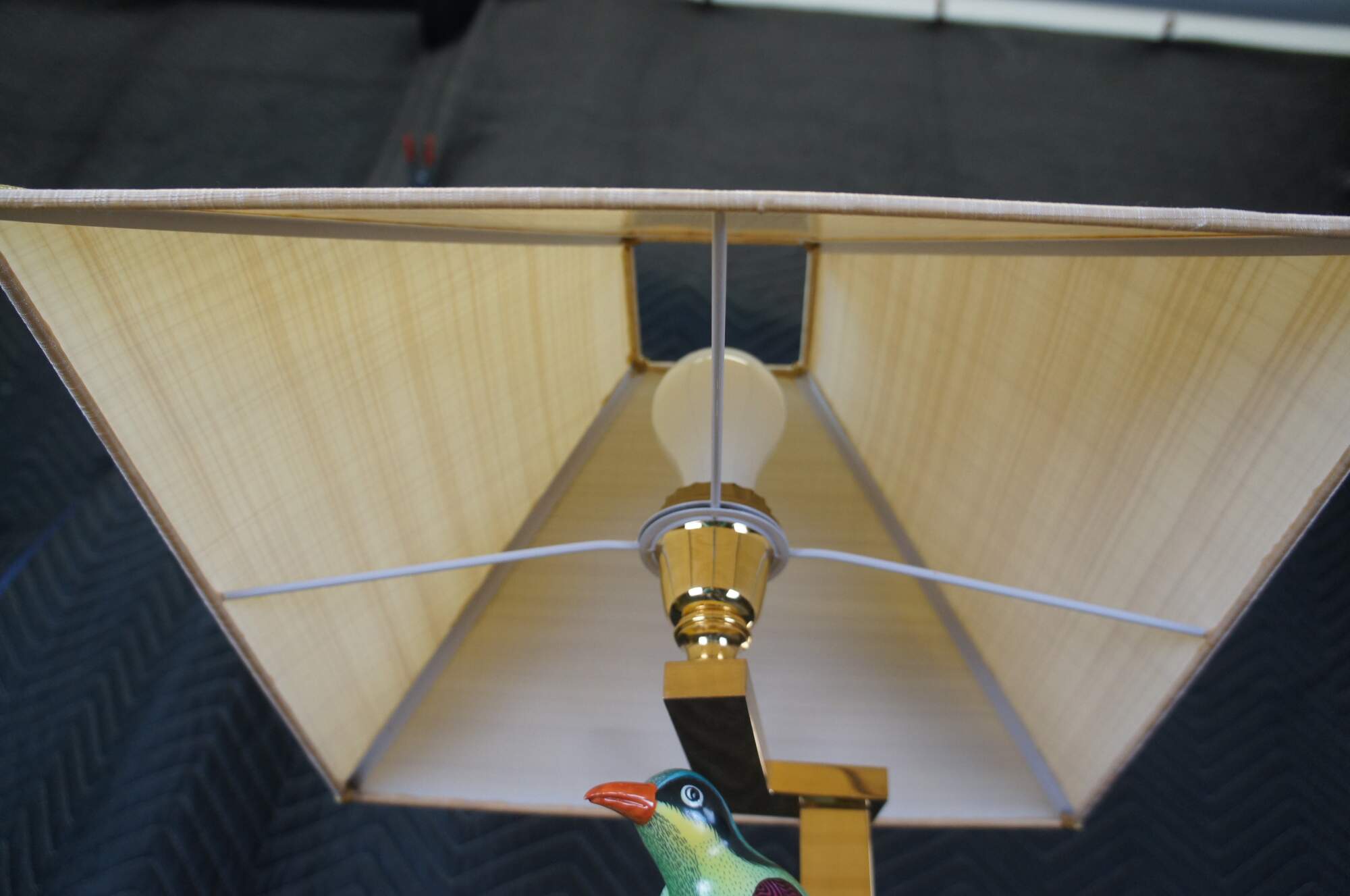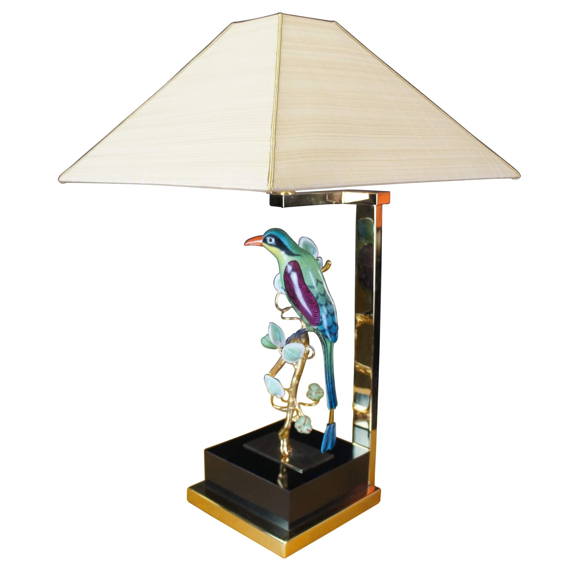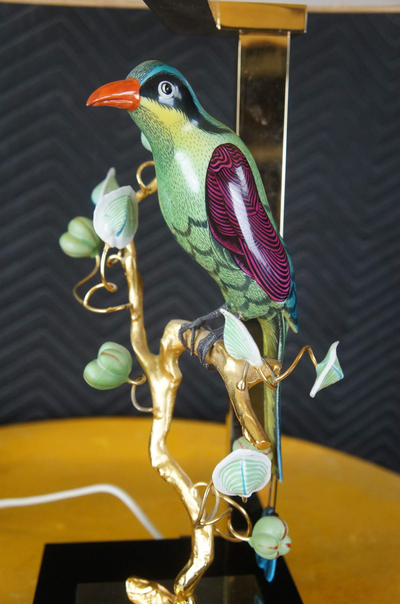 Vintage Mangani for Oggetti Italian porcelain and brass table lamp sculpture. Circa mid 1970s. Beautifully detailed with vibrant colors. The Parrot is perched on a gold plated branch over a black plinth and brass base. A porcelain “objet d’art” carrying the imprimatur “Mangani” comes with a dedication to excellence. The Mangani family oversees every facet of each porcelain object, from the initial plan of the design to the final decoration. The family involvement with porcelain began in the 1930s. Sr. Mangani worked for one of Florence’s oldest ceramic works during the 1930s. He conceived many porcelain sculptures for the wealthy English and Americans who lived in the sumptuous villas of Florence and its province of Tuscany. After World War II Mangani opened a small workshop for the restoration of marble, ceramic and porcelain. There his young sons Ivan and Lando were exposed to their father’s special skills, watching and working under his supervision. After many years of studying the fine art of porcelain, they took from their father both a knowledge of the technical aspects of the clay and an appreciation for the aesthetic of the material. The Mangani brothers brought this burgeoning expertise to their first small atelier in Florence, which they opened in the early 1960s. With the application of modern techniques, they slowly developed and grew to become one of Florence’s foremost producers of fine porcelains. Ivan passed away in 2002 but left a great legacy to his children who are active participants with their cousins in the Mangani of today. Their production is quite diverse, ranging from reproductions of Baroque period pieces to the highly stylized fish and birds with which their name is synonymous.
