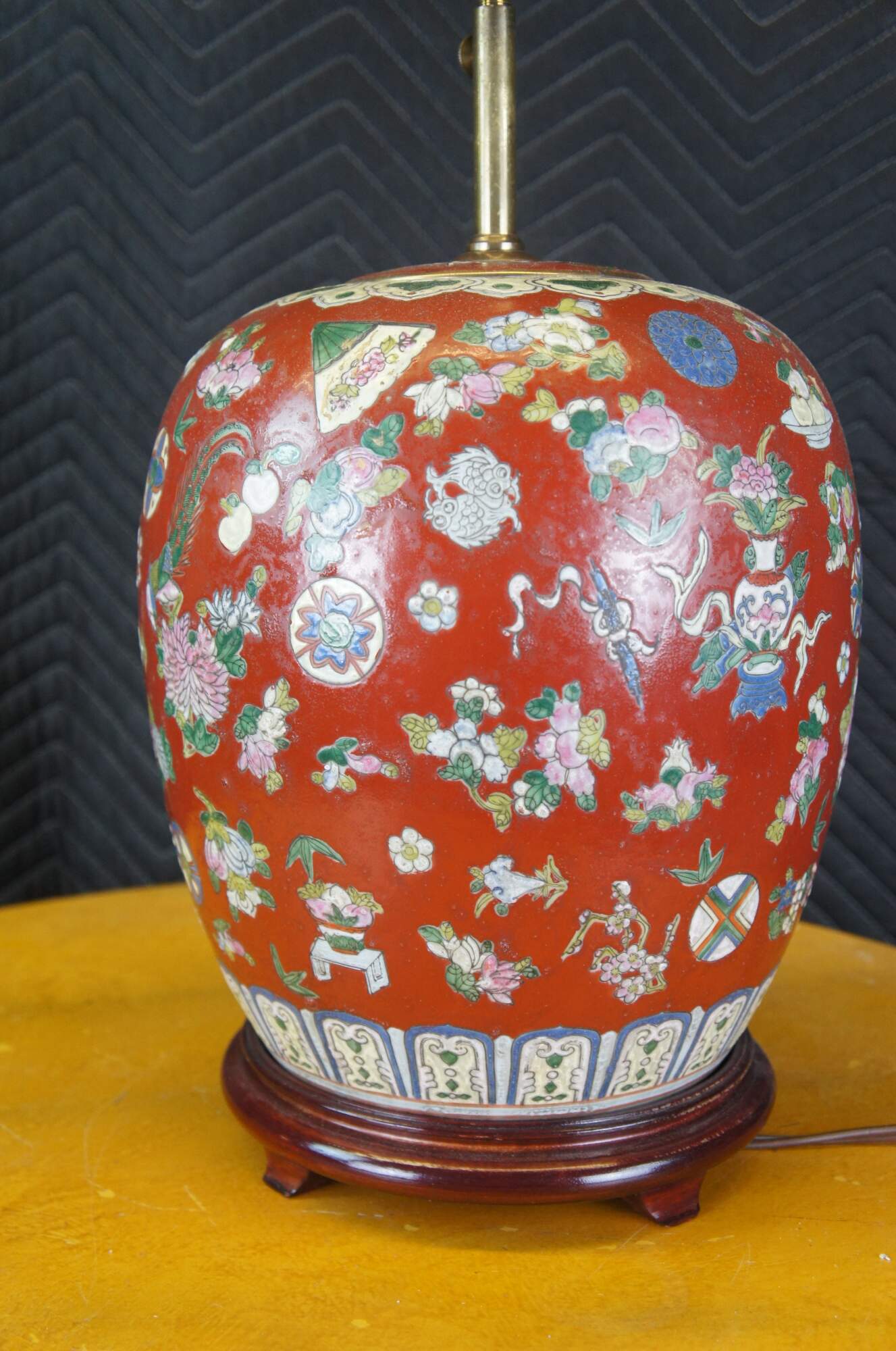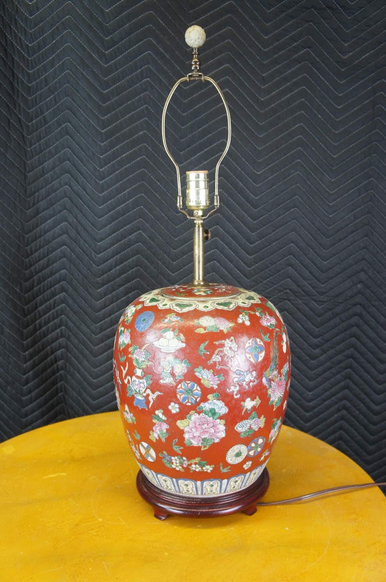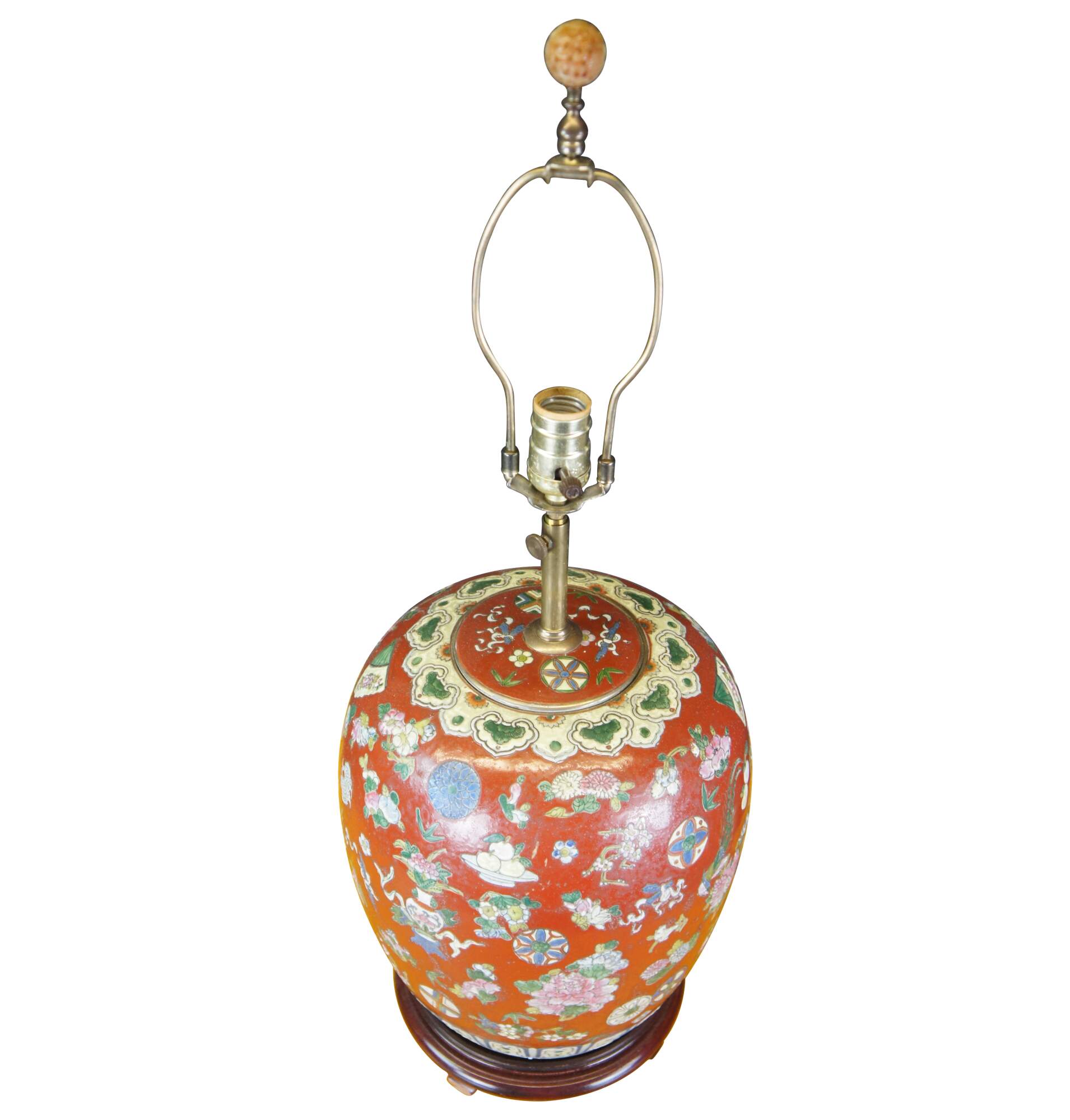 Vintage Chinese famille rose melon vase / ginger jar table lamp. A red field with floral designs over wooden base with unique finial. circa 1970s
