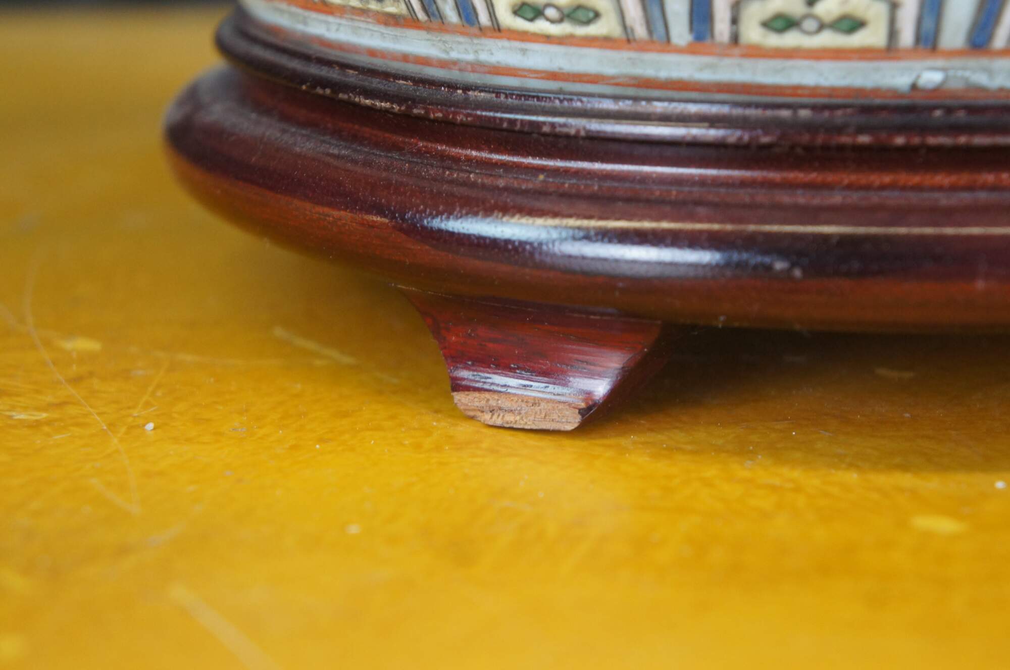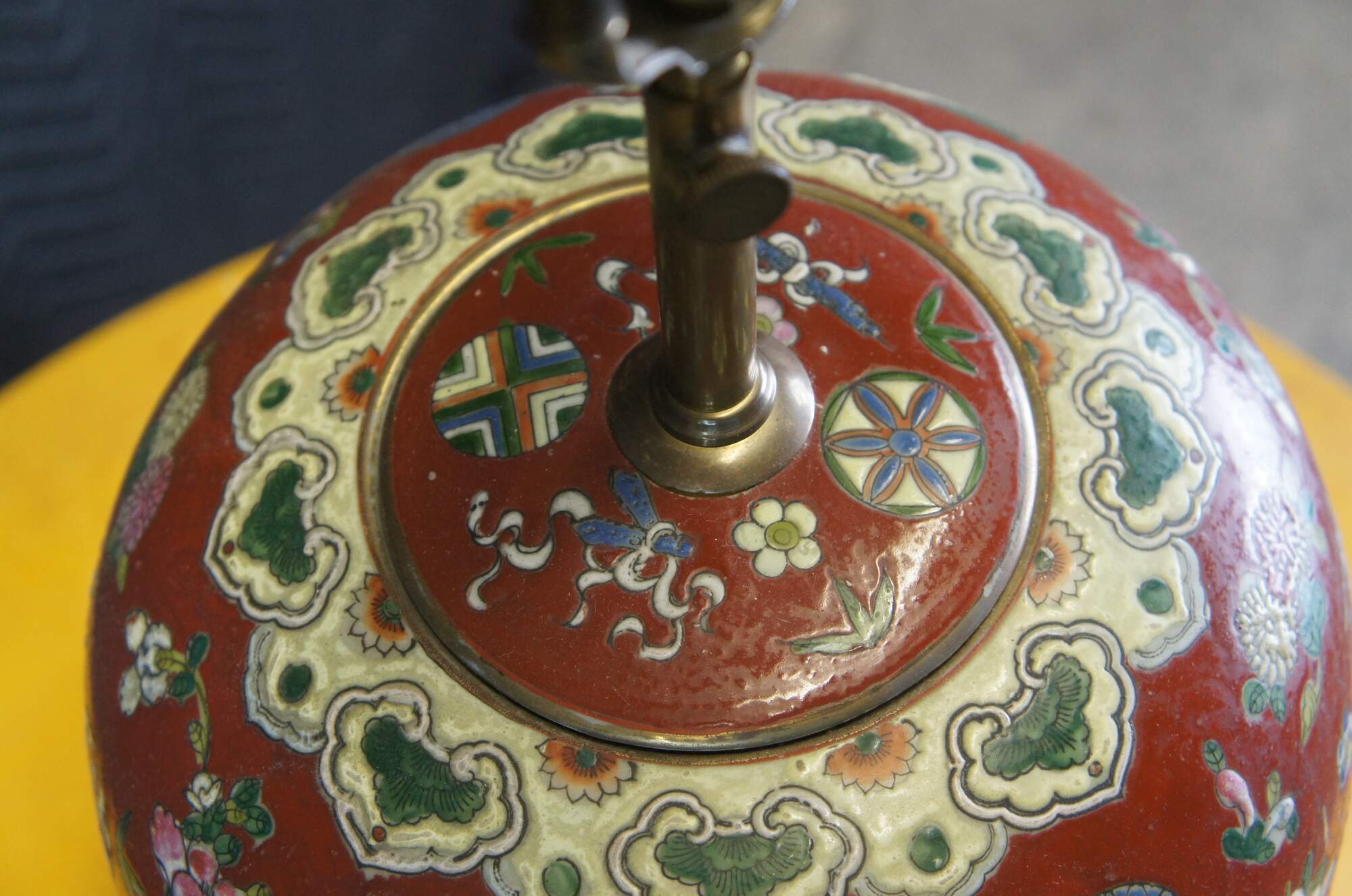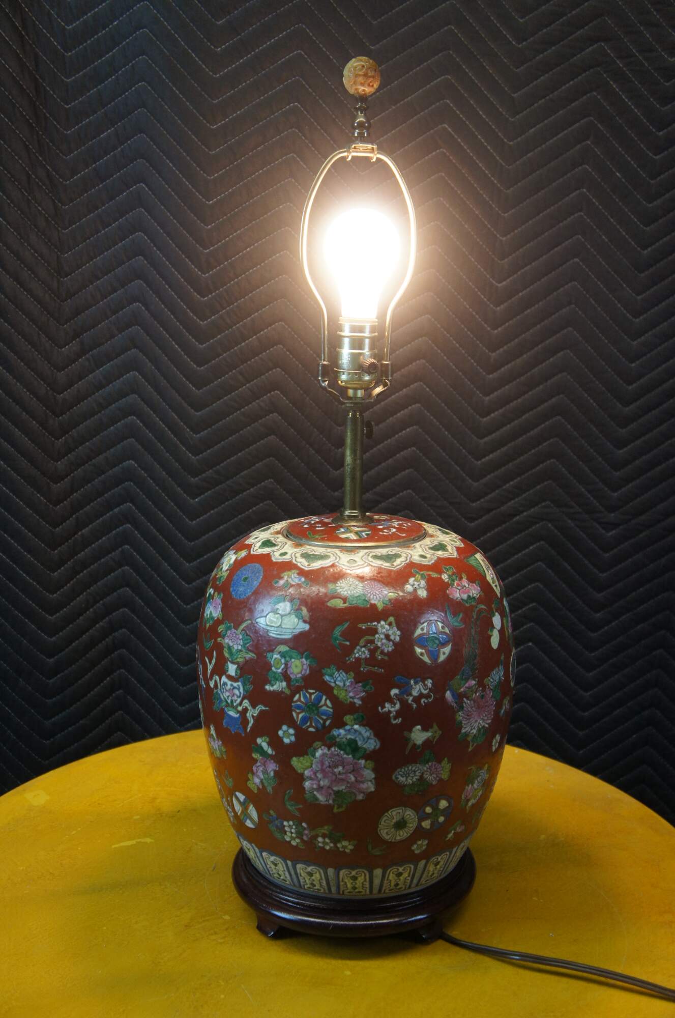 Vintage Chinese famille rose melon vase / ginger jar table lamp. A red field with floral designs over wooden base with unique finial. circa 1970s
