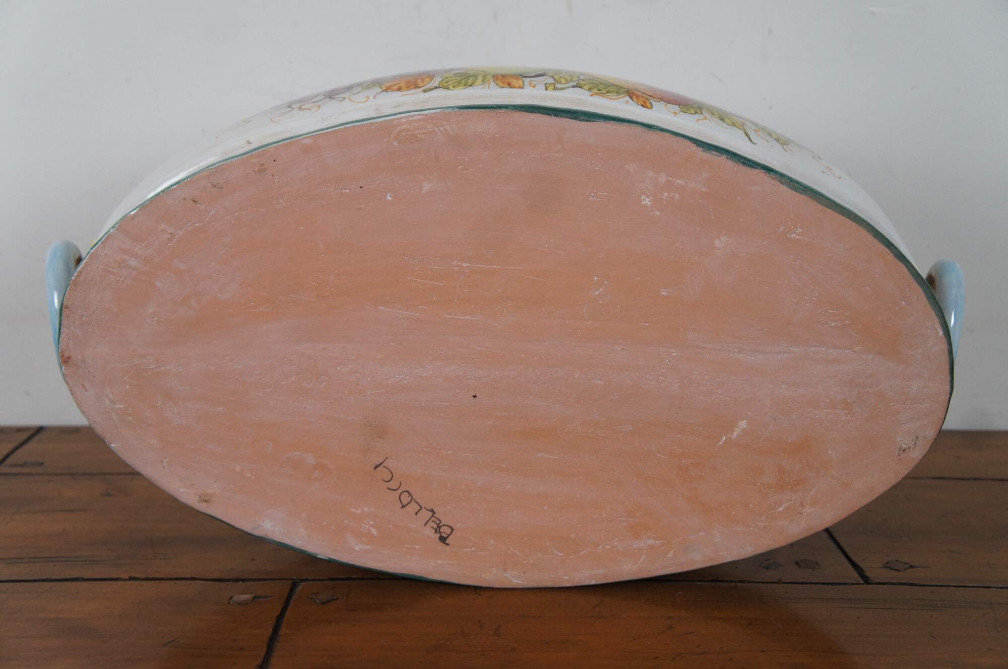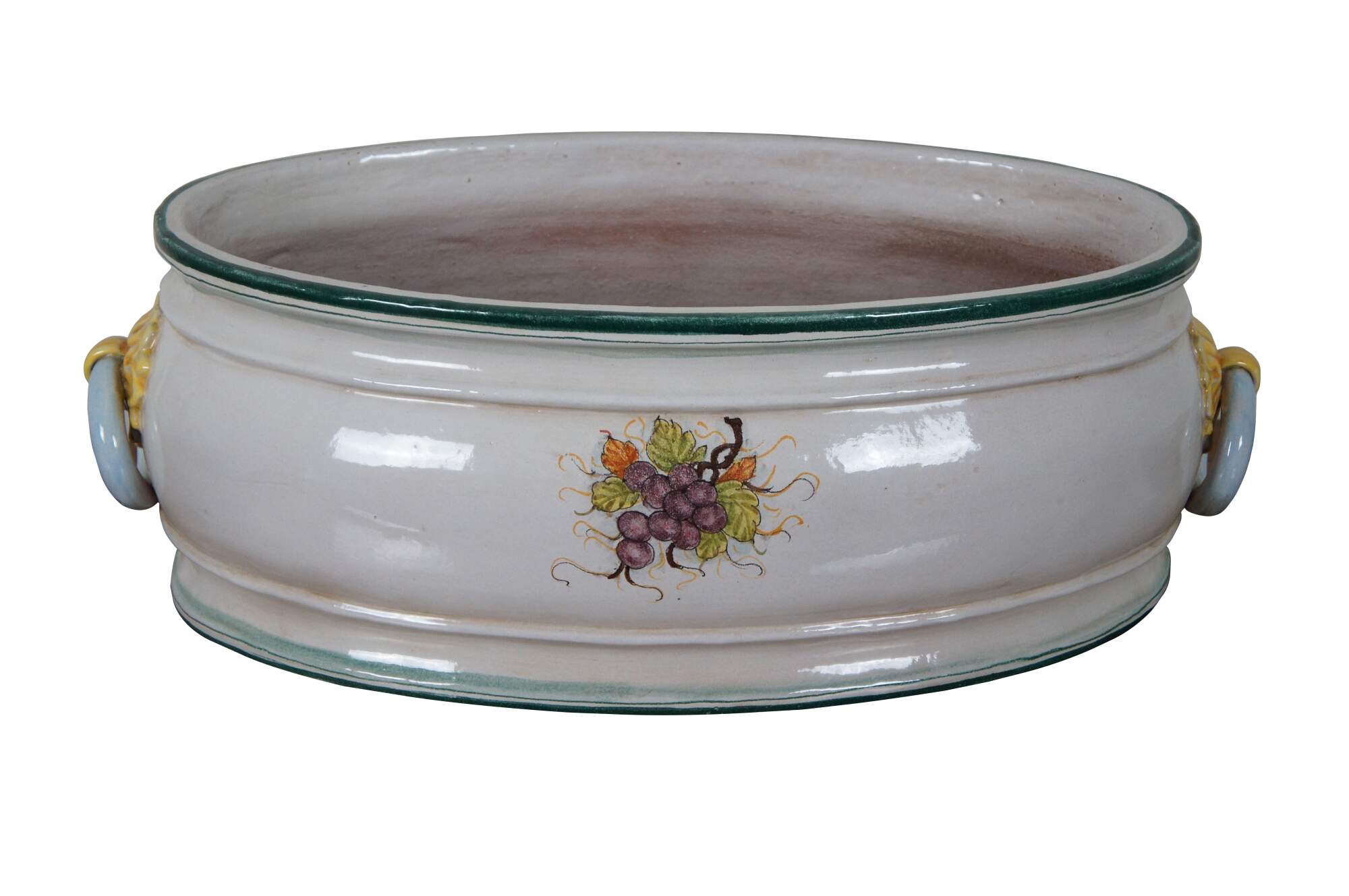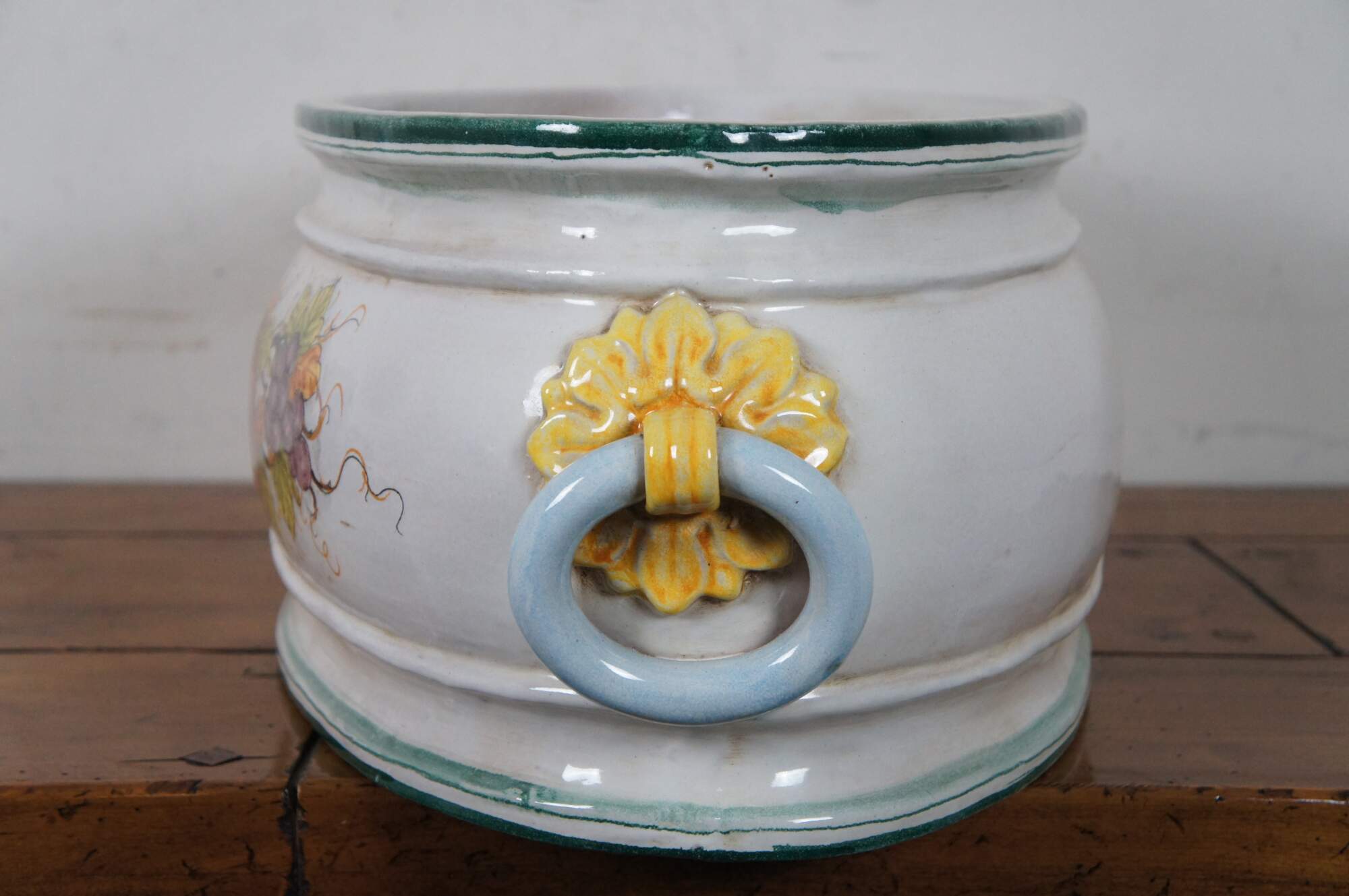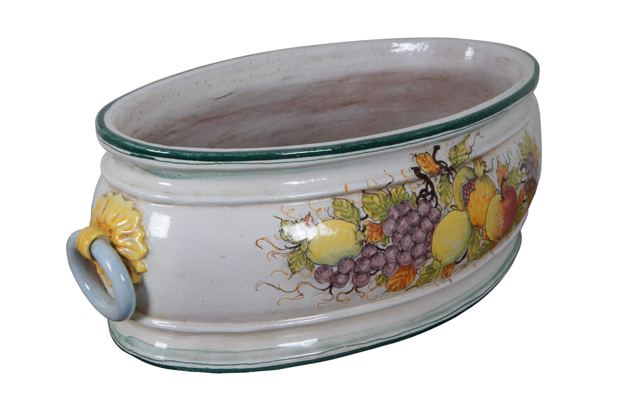 A very large and impressive Tuscan planter by Bellocci Ceramics of Orvieto, Italy, featuring green trim, blue and yellow fixed handles and an array of painted fruit.