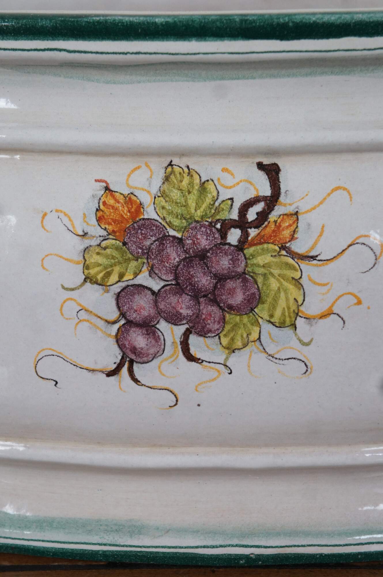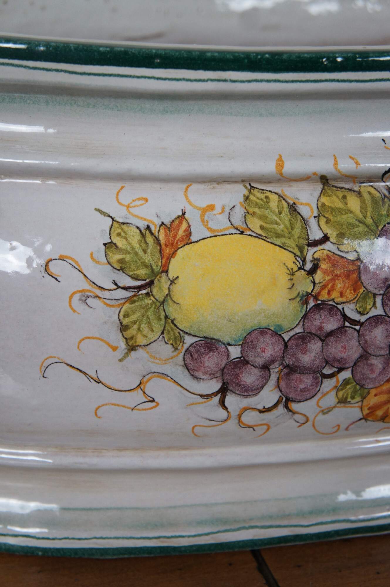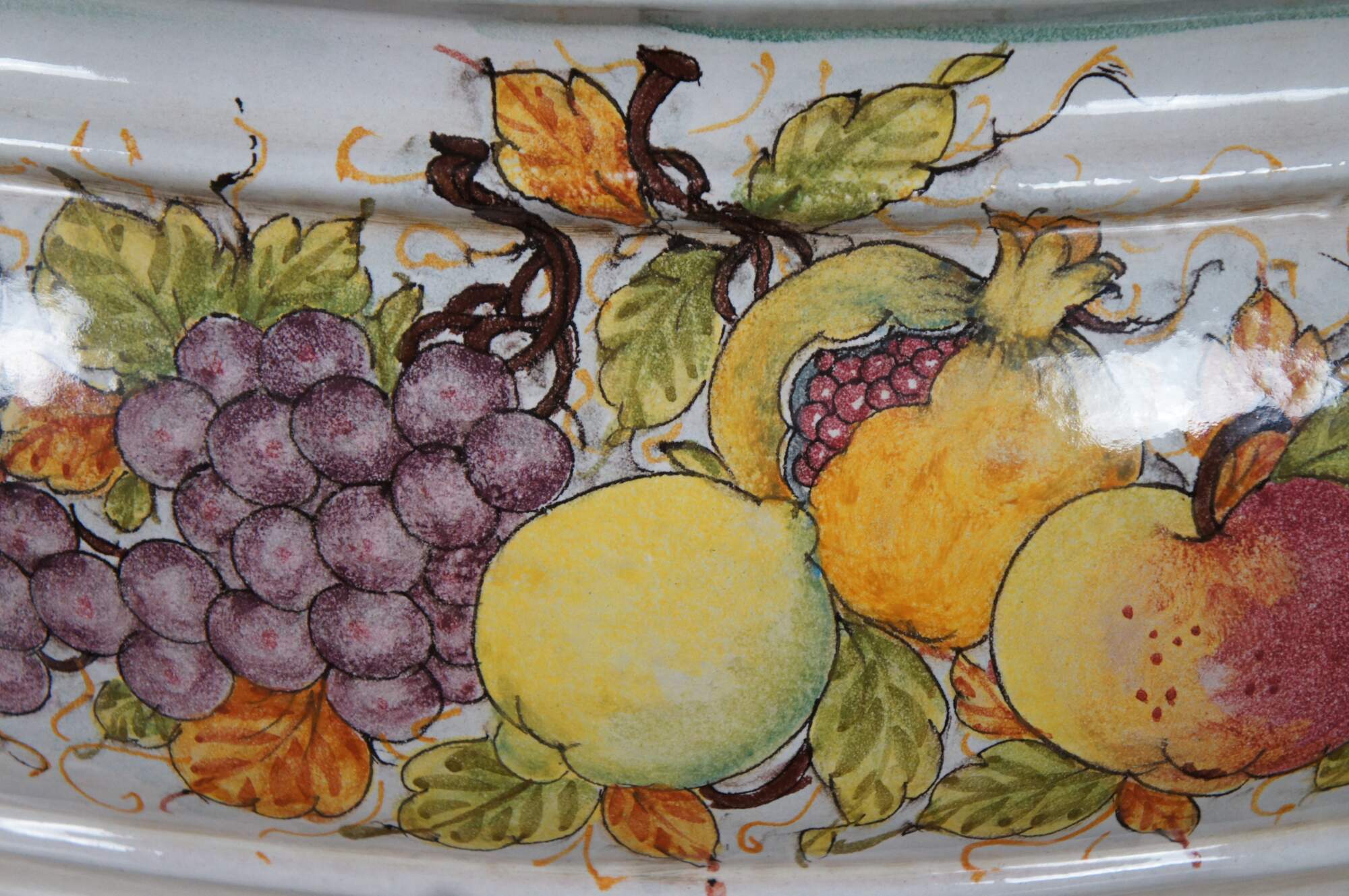 A very large and impressive Tuscan planter by Bellocci Ceramics of Orvieto, Italy, featuring green trim, blue and yellow fixed handles and an array of painted fruit.