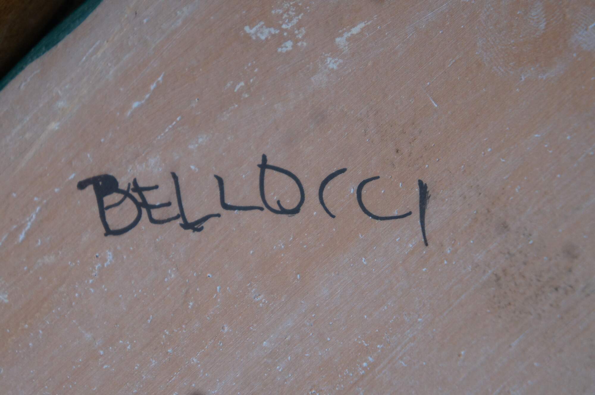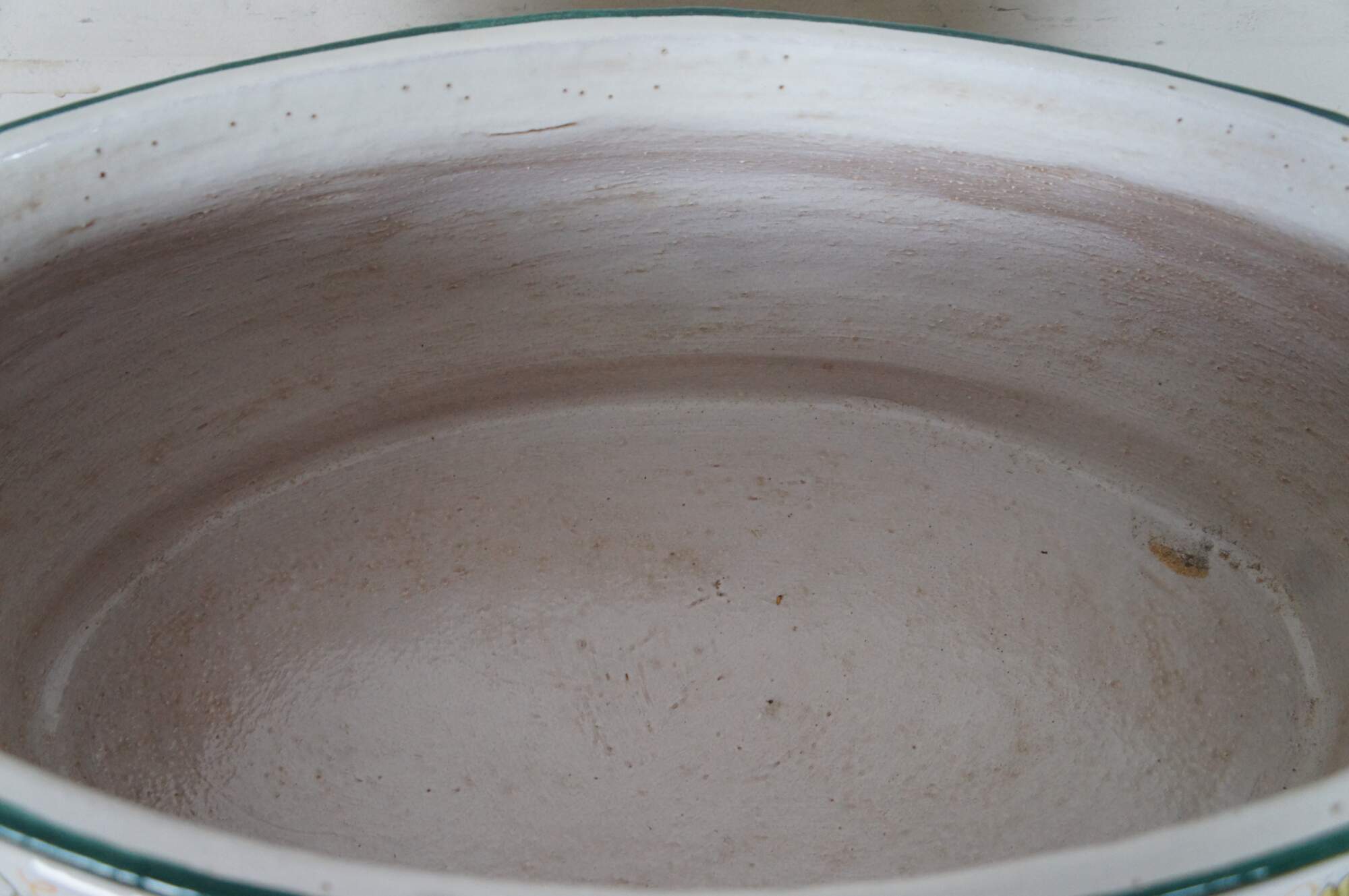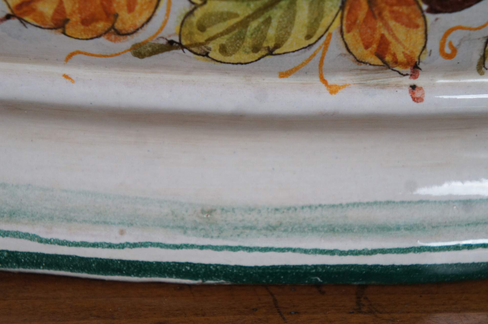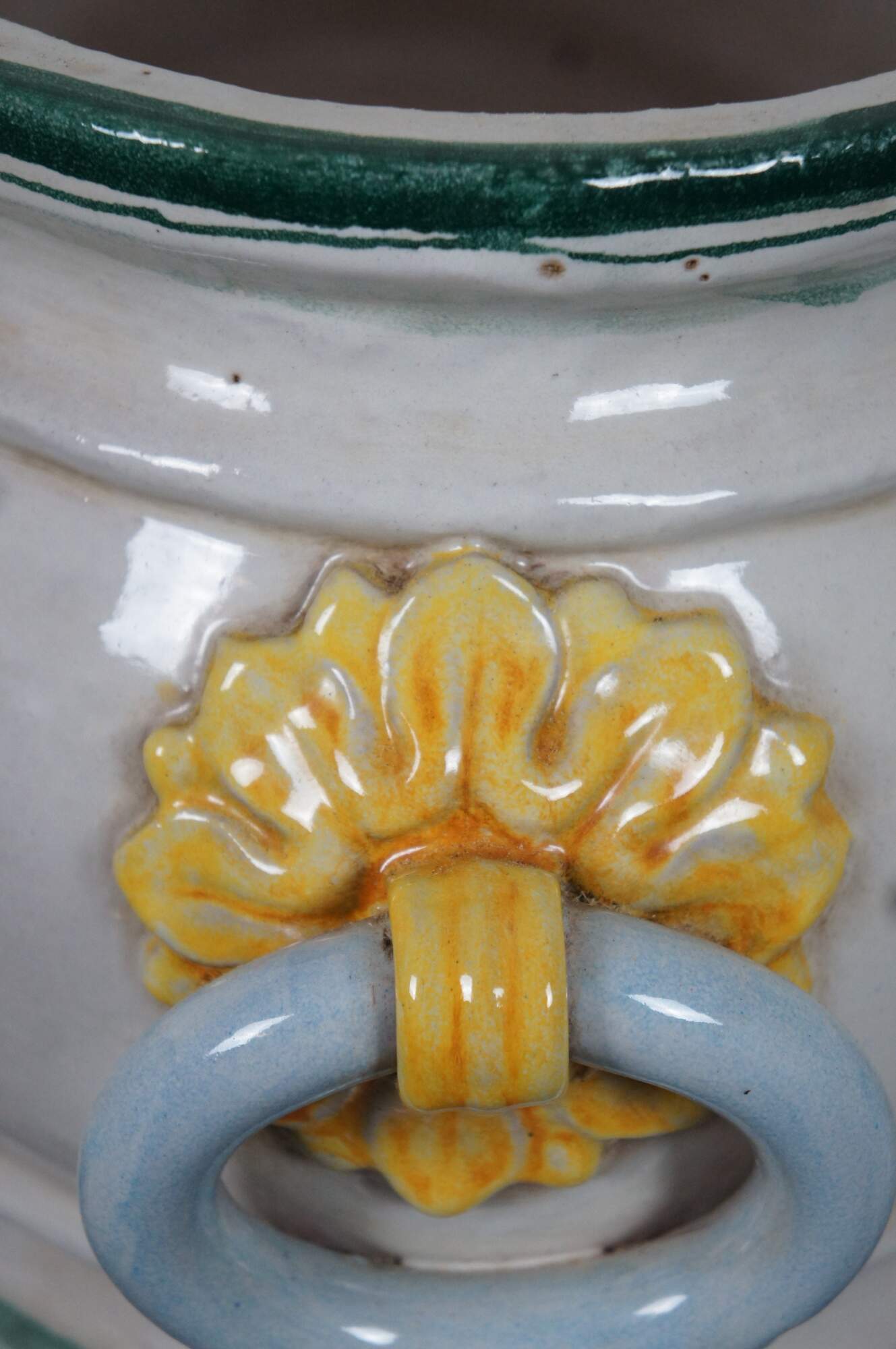 A very large and impressive Tuscan planter by Bellocci Ceramics of Orvieto, Italy, featuring green trim, blue and yellow fixed handles and an array of painted fruit.