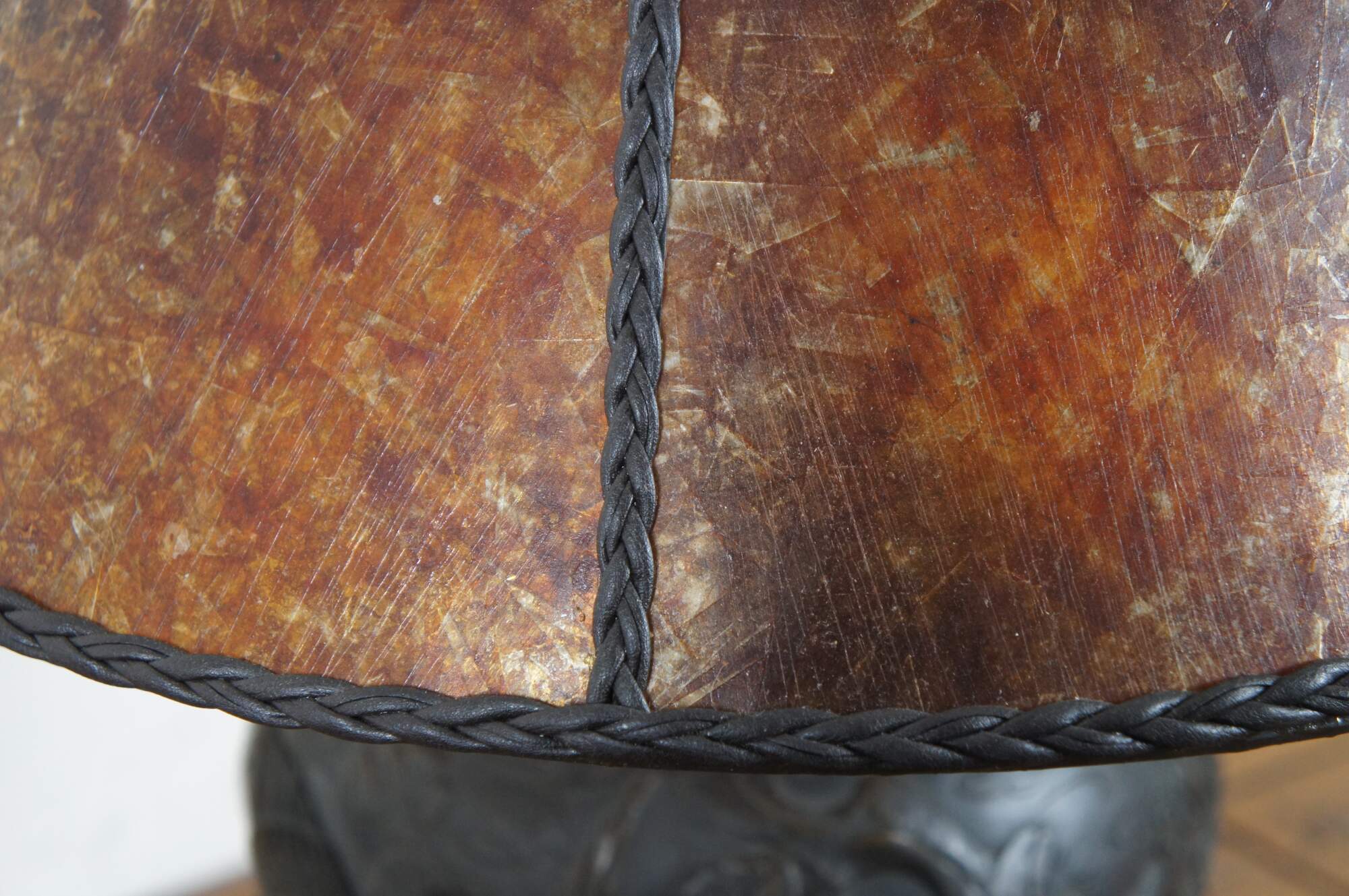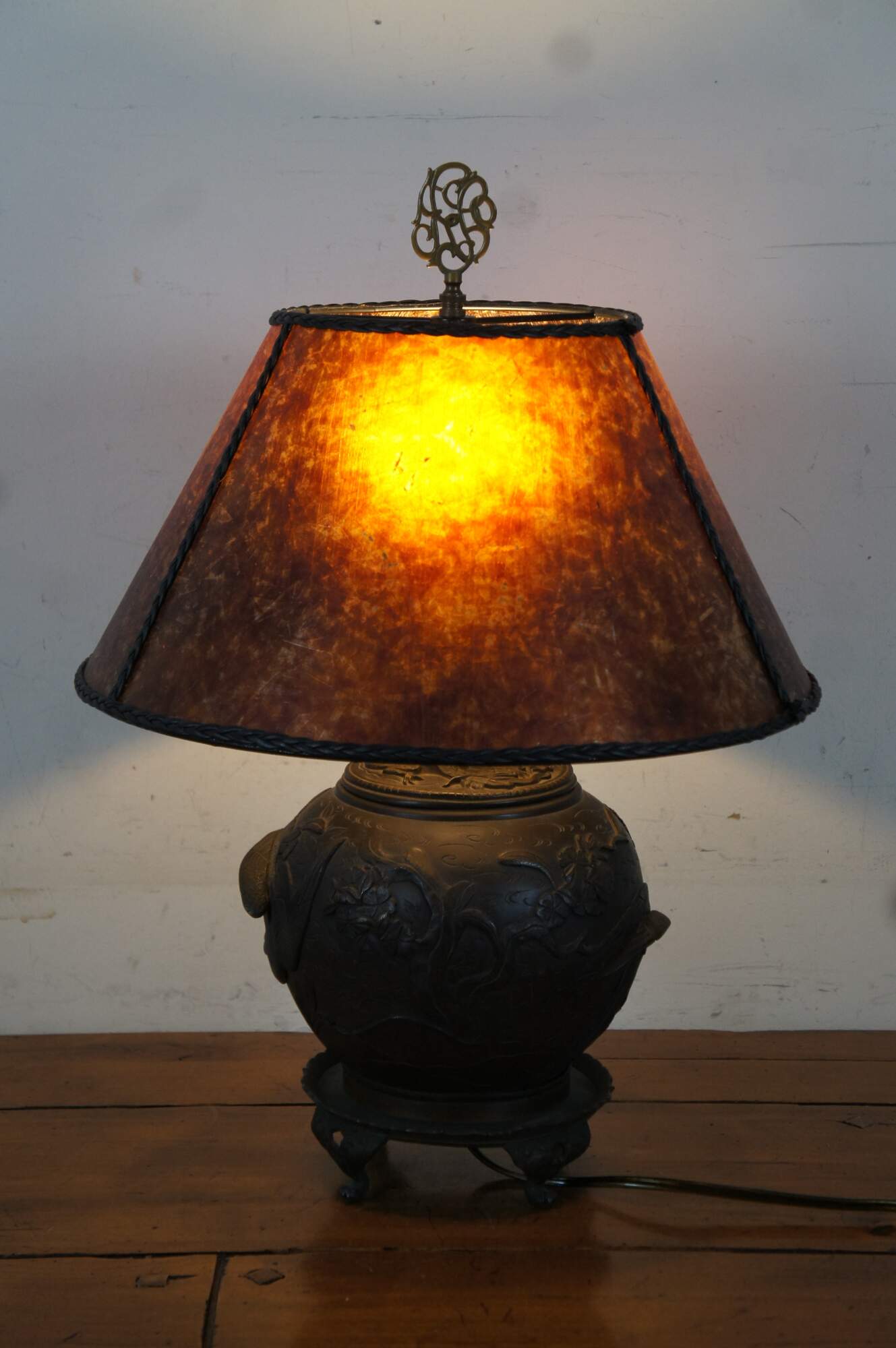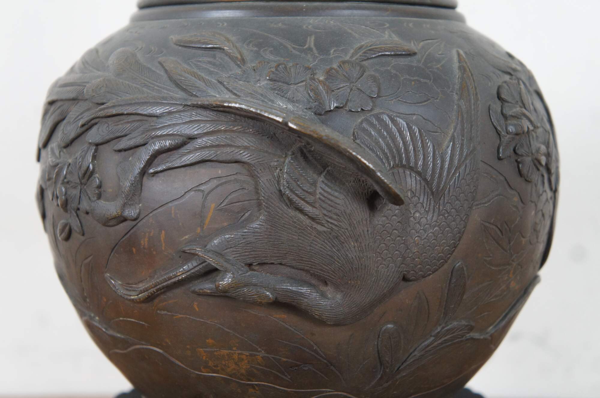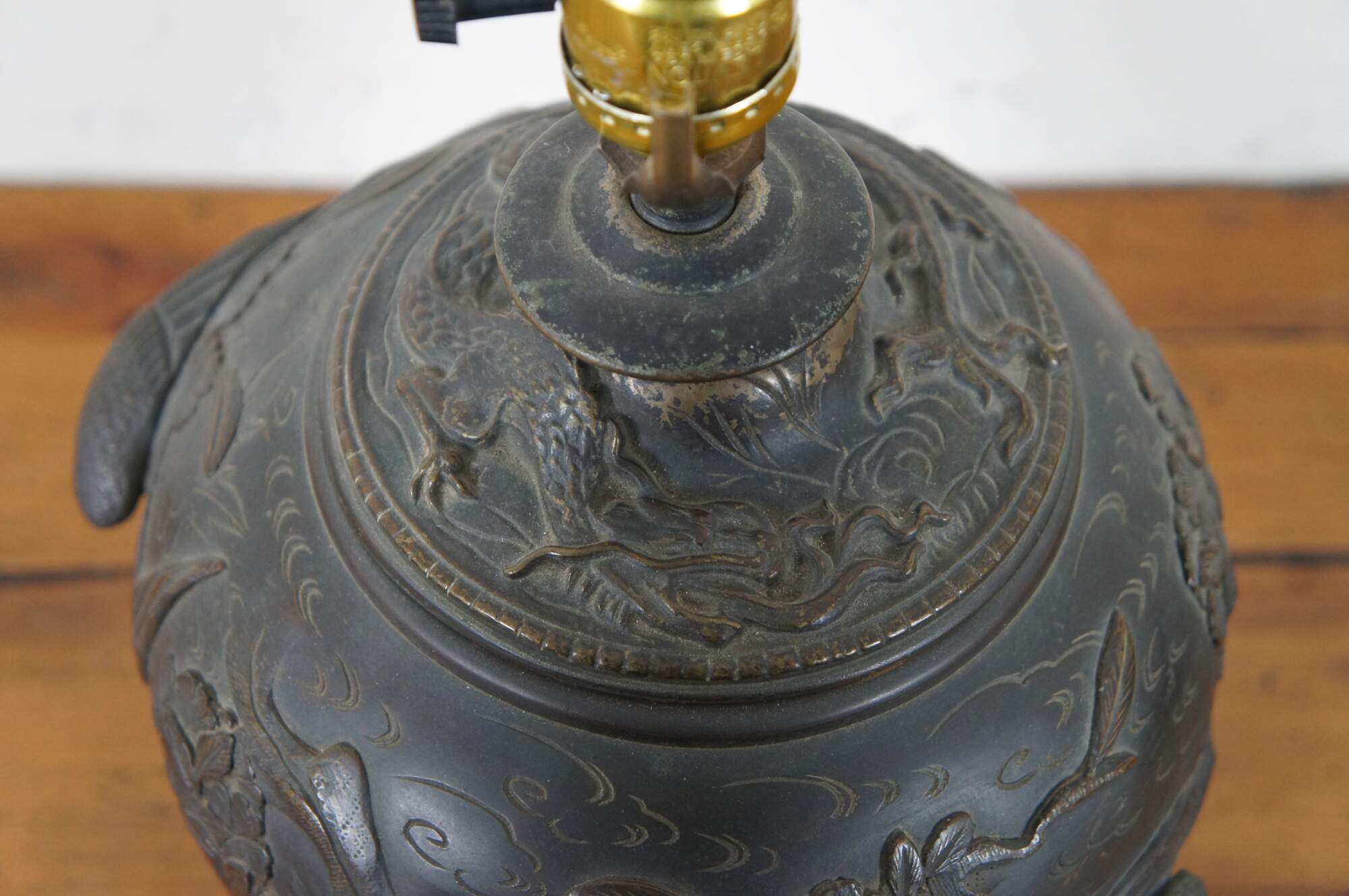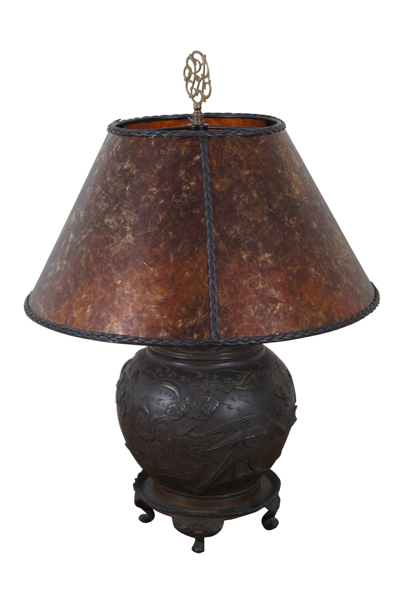 20th Century Japanese cast bronze table lamp in the shape of a ginger jar / urn sitting on a footed pedestal, cast with a relief of blossoming cherry trees and cranes. Paired with a translucent multi-toned amber shade trimmed in black braid.