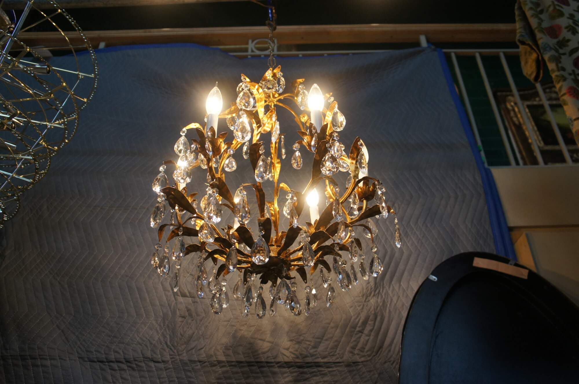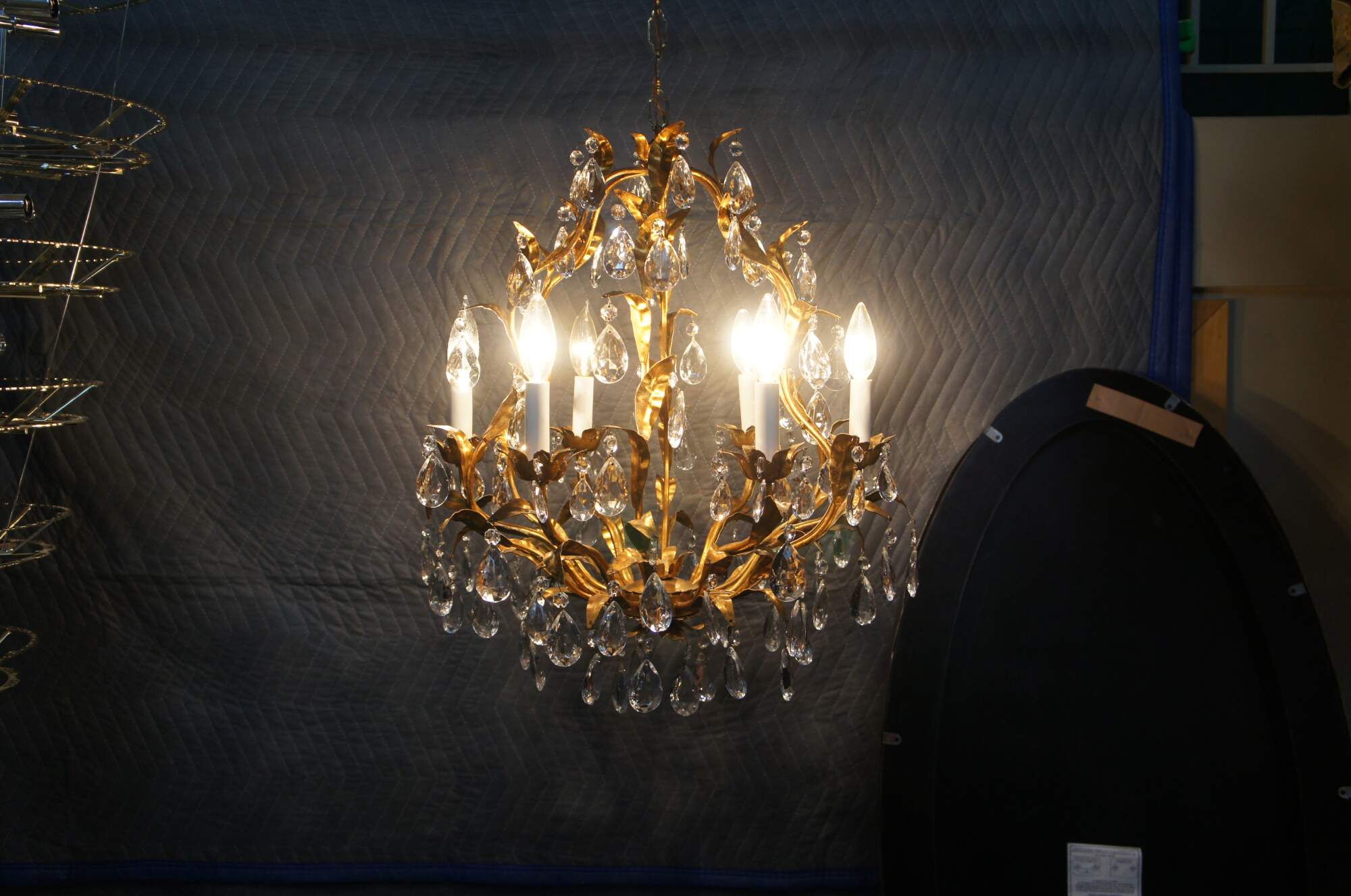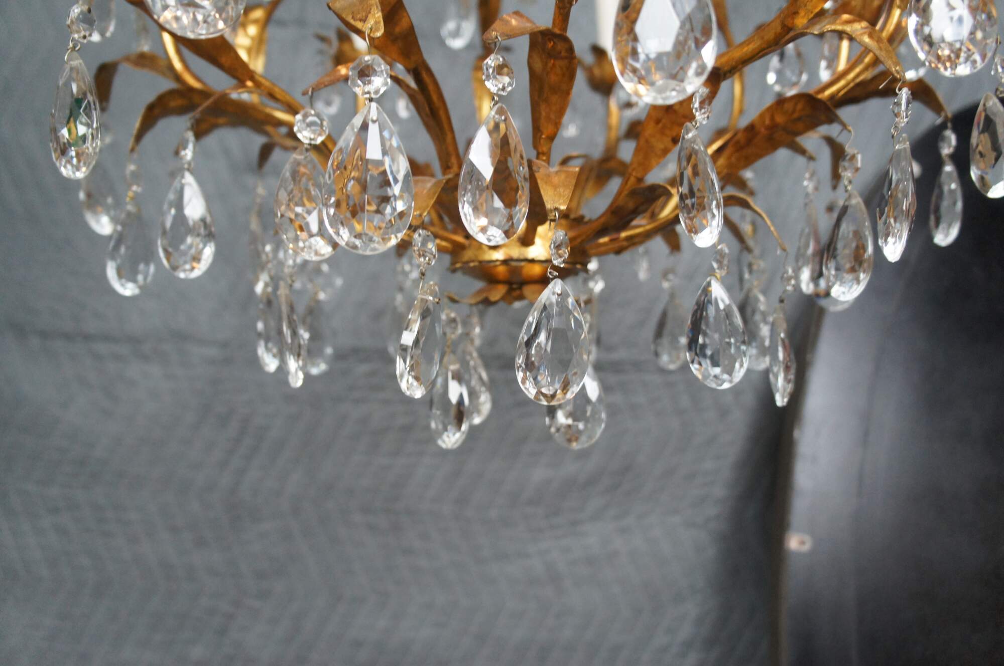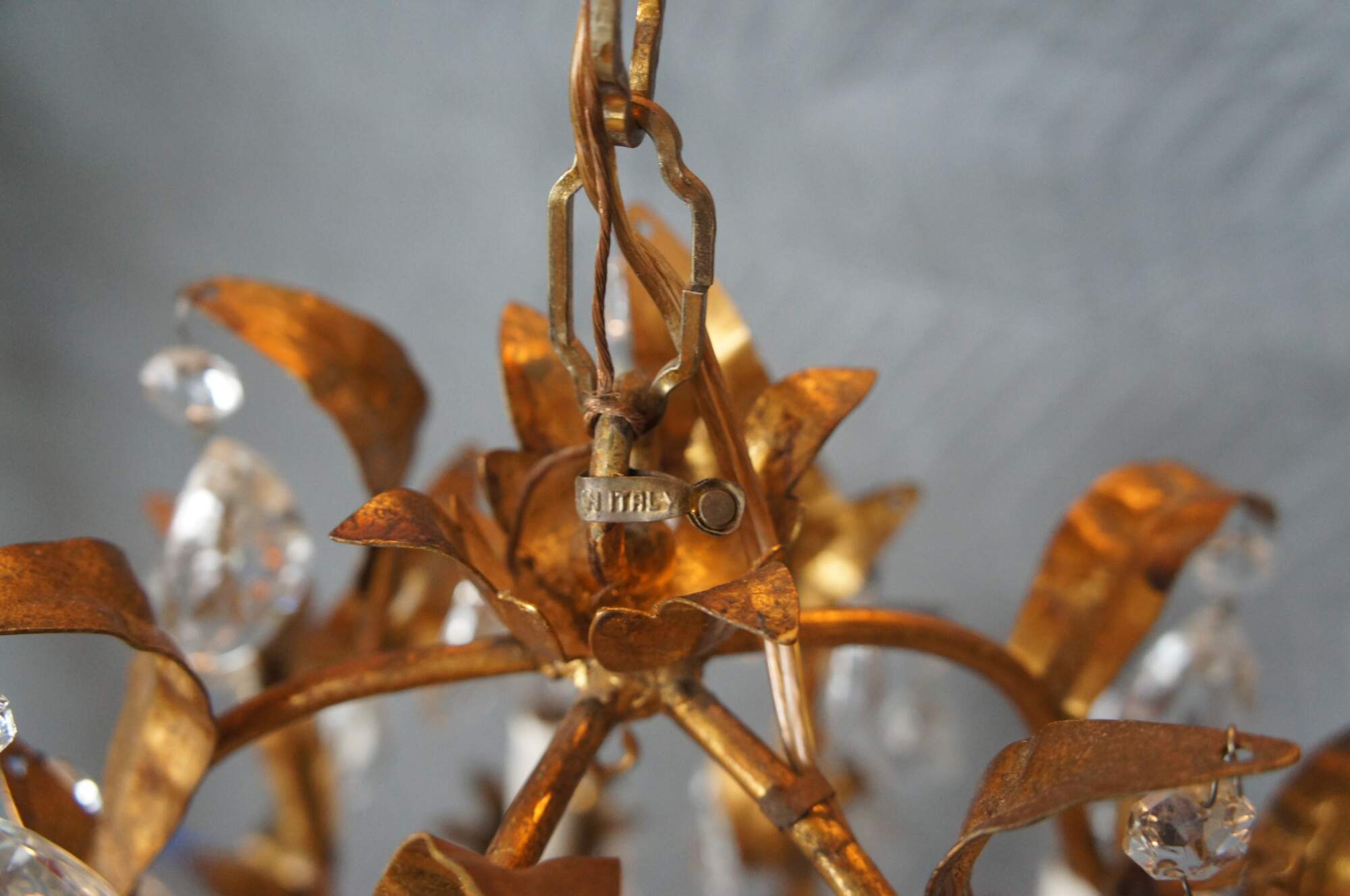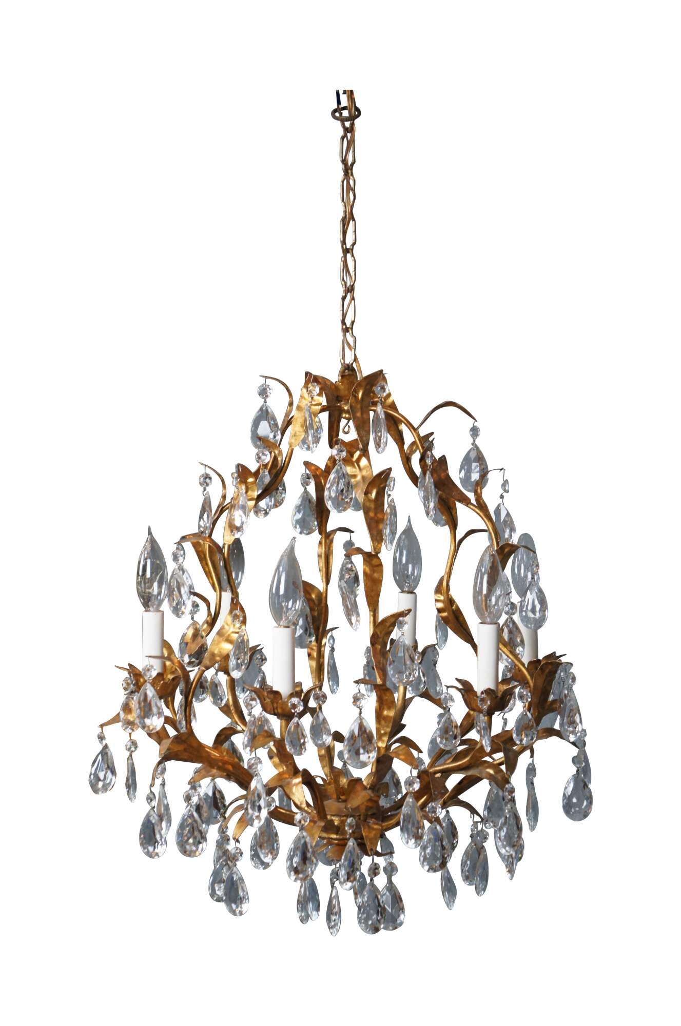 An impressive Italian gilt metal Florentine chandelier by Hans Kögl, circa 1970s. Features a branched leafy design with six candlesticks amongst an array of elegant octagonal and Swedish drop crystals. Hangs via an ornate brass chain with a scalloped cap. Marked italy towards the top via gold tag.