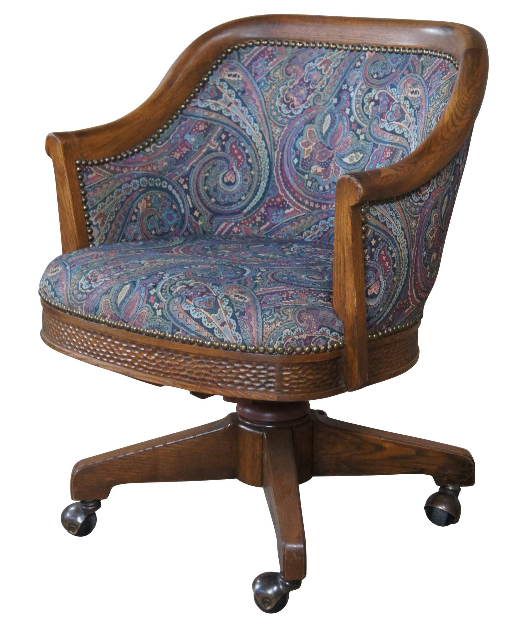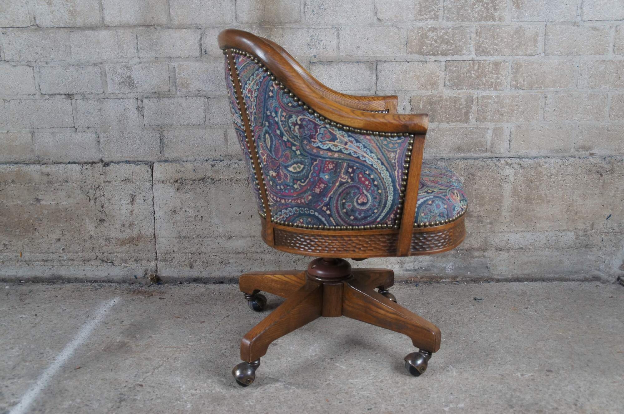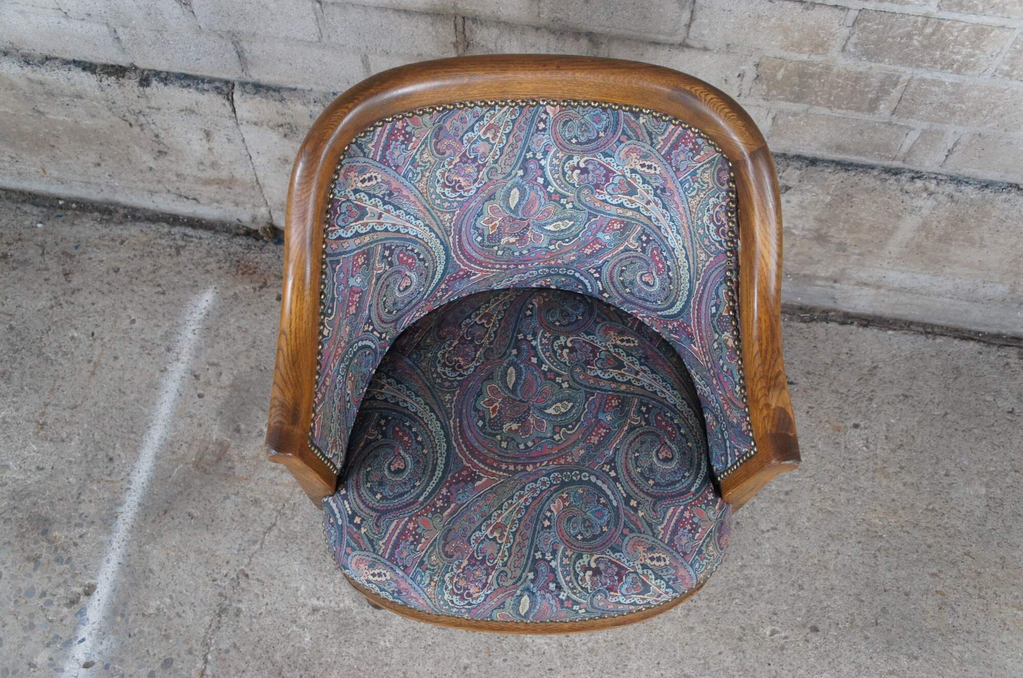 Romweber (R-18290) Viking Oak Swivel Desk Chair, circa 1980s. Features a barrel back design with flared arms, pasiley upholstery, brass nailhead trim, and a swivel base. The lower apron is neatly carved in a Nordic manner. An iconic piece from the mid century era that is great for office, home or library use.