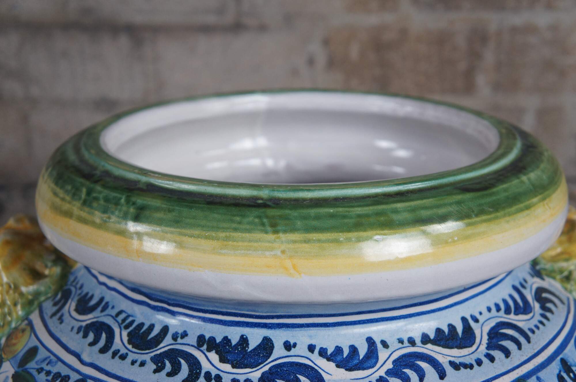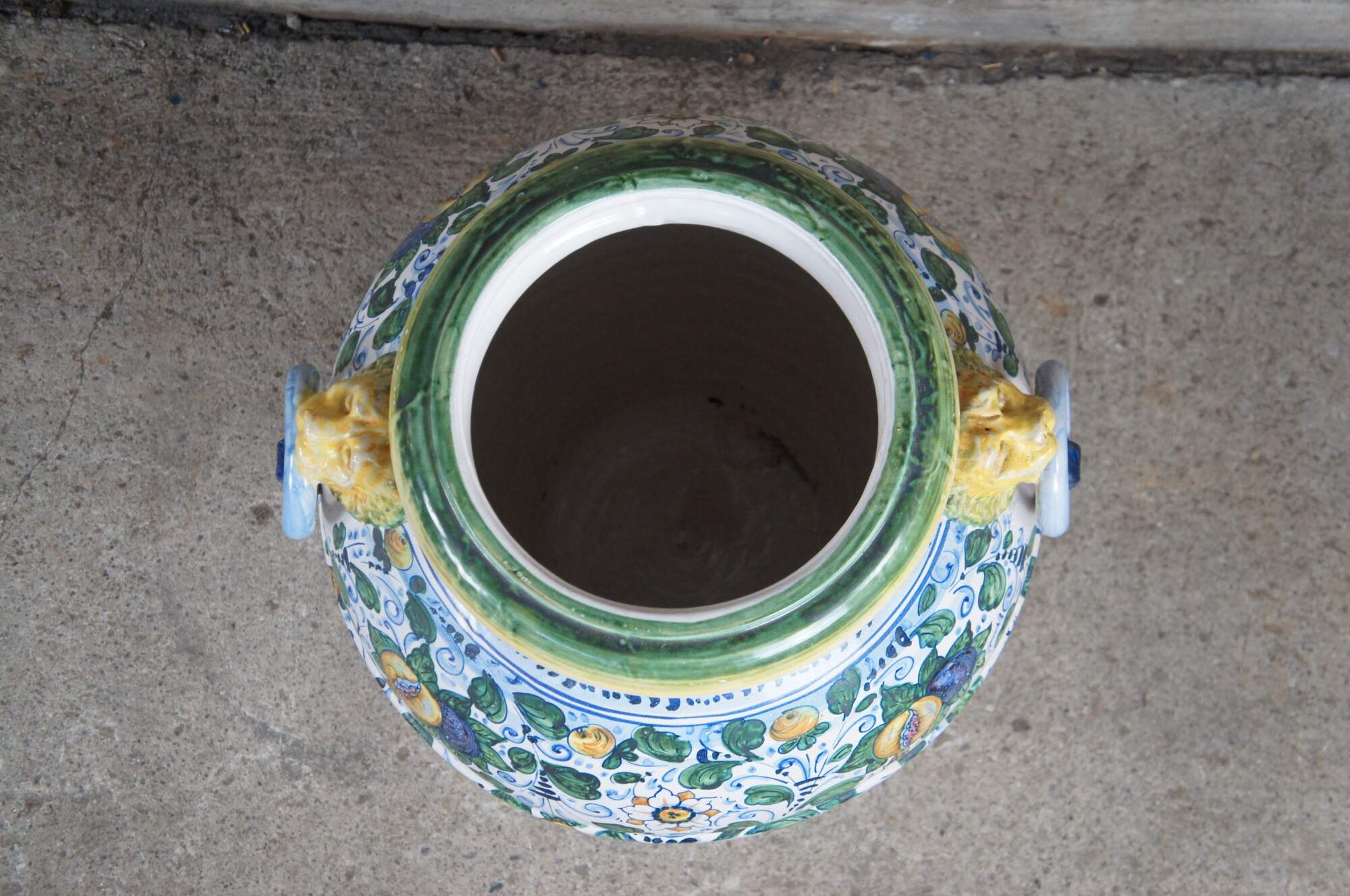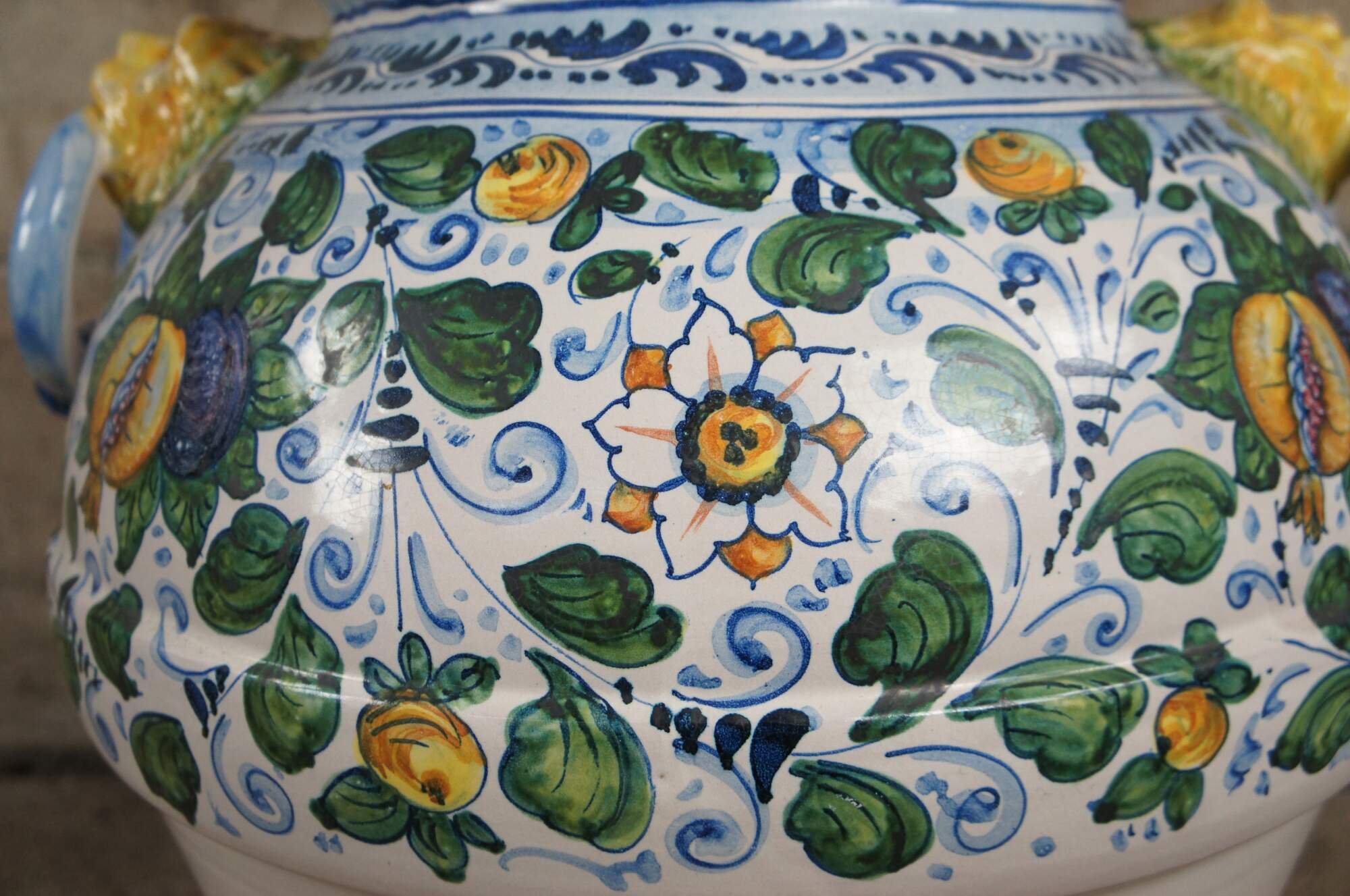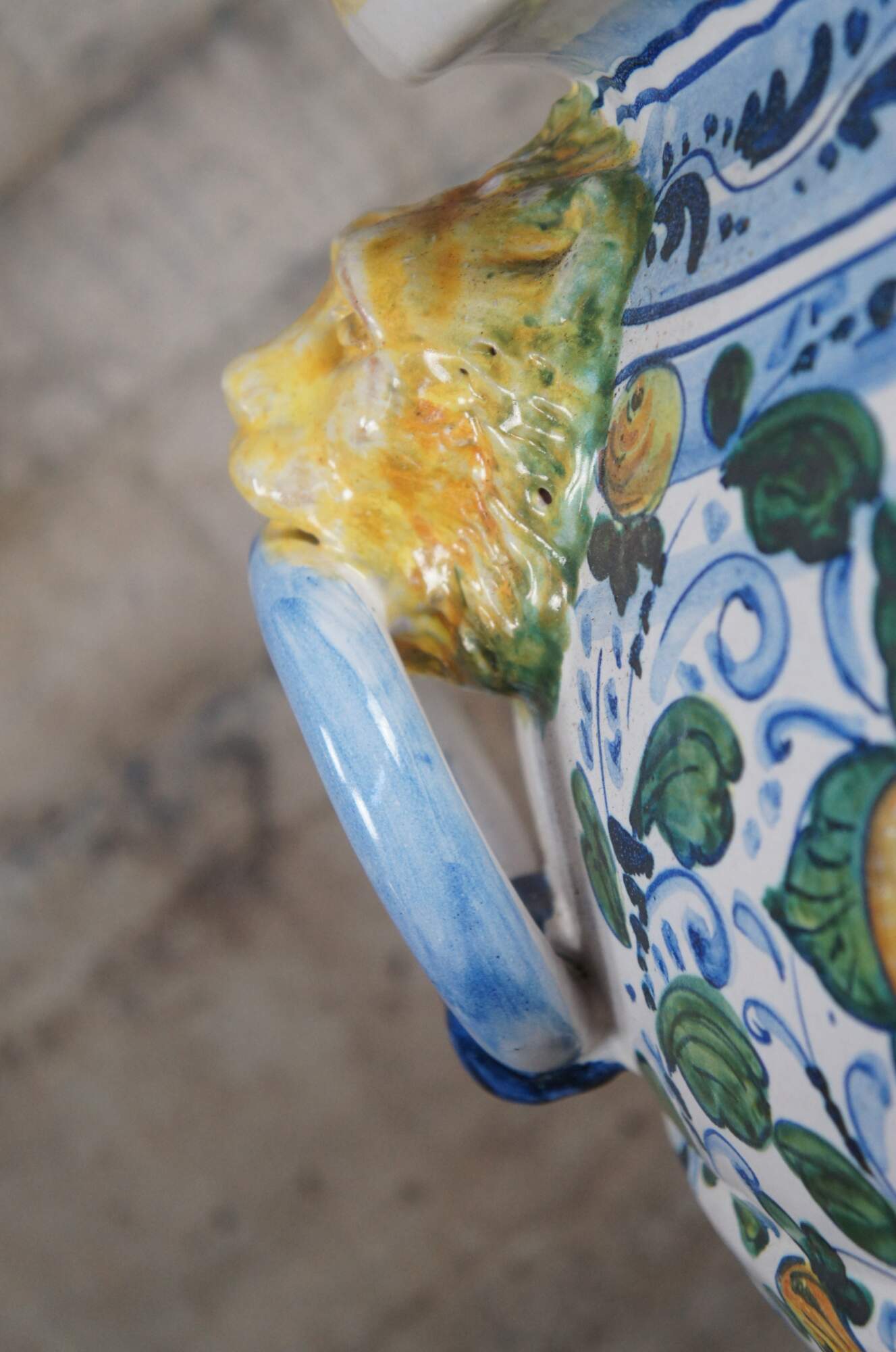 Monumental pair of Medterranean polychrome Deruta cachepot planters, circa 1970s. Handmade one of a kind painted Italian pottery. Features a bulbous amphora form flanked by lion heads with ringed handles. The top is designed in a leafy green and blue with flowers and fruit. The mouth of each vase is green and yellow. Base has a ring of blue in a wave like leaf pattern. Yellow and green pronounced botton near the bottom edge, reminiscent of a spigot.