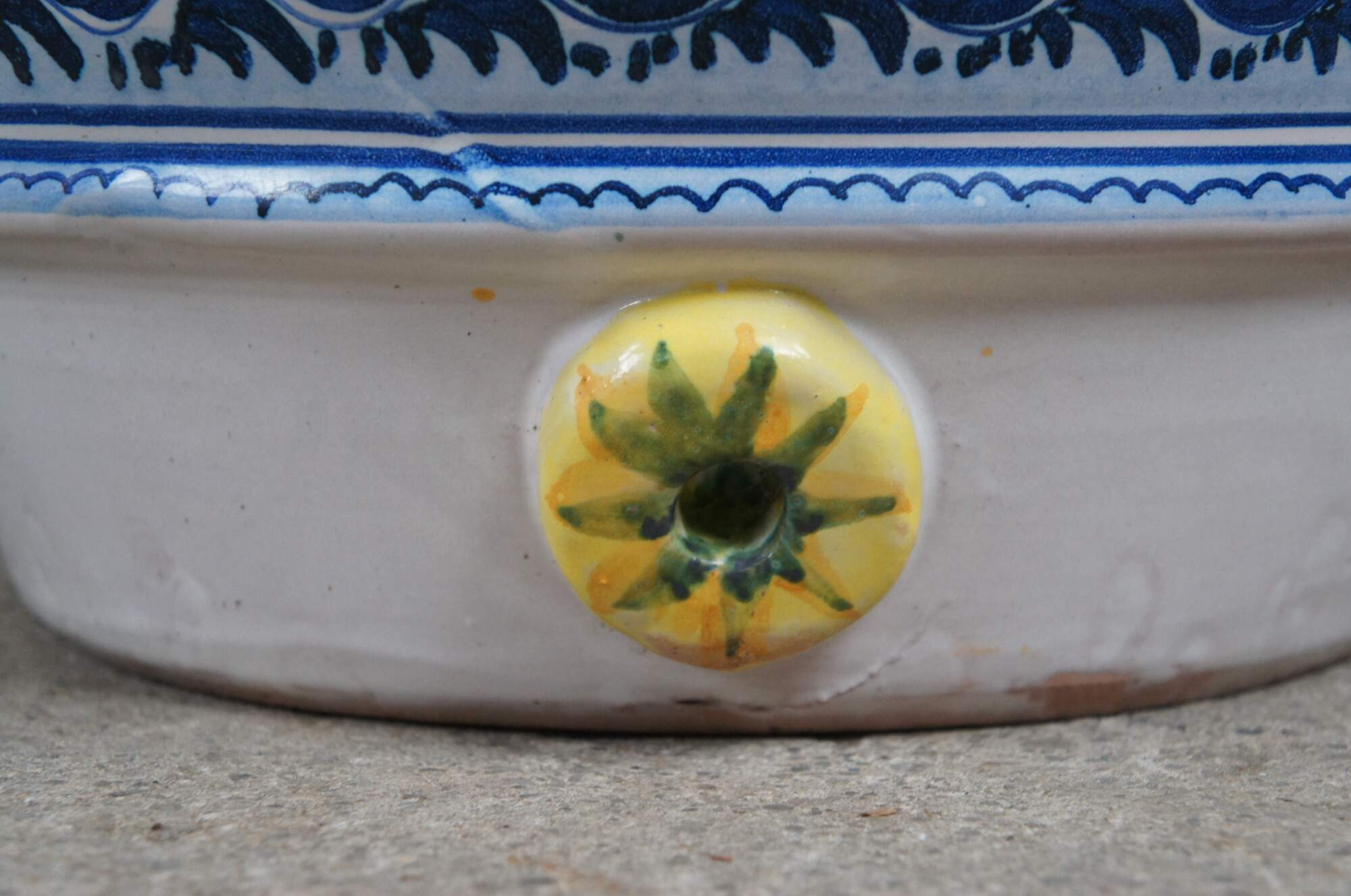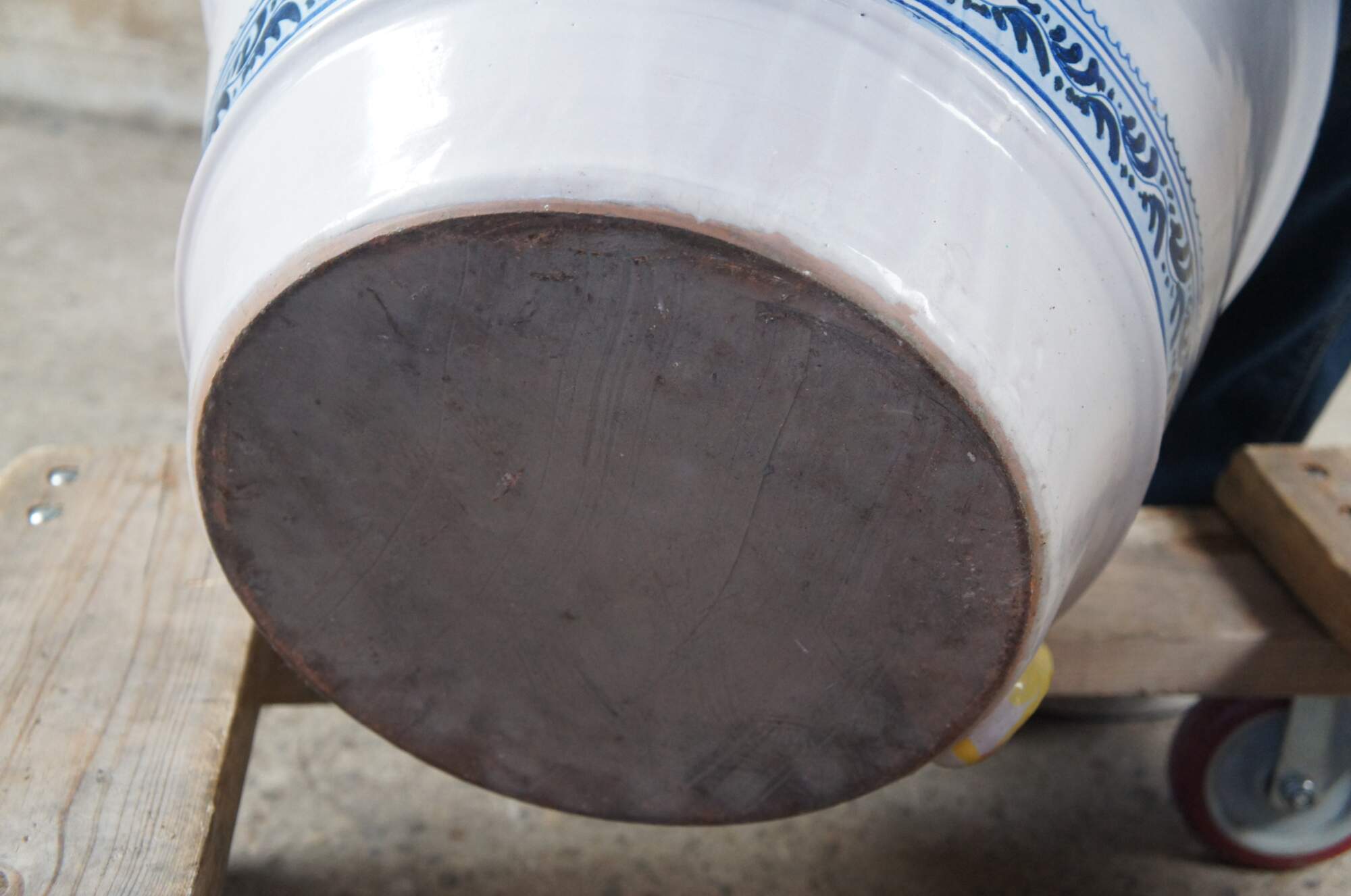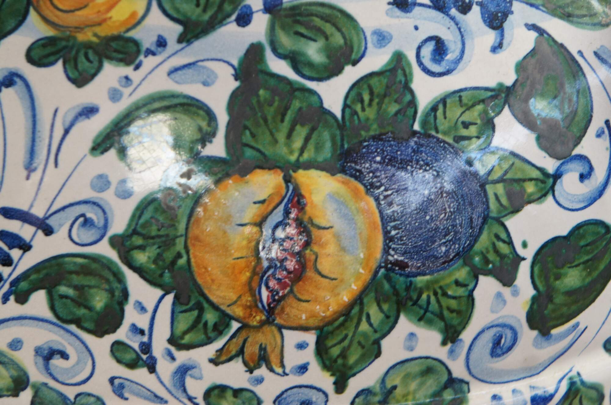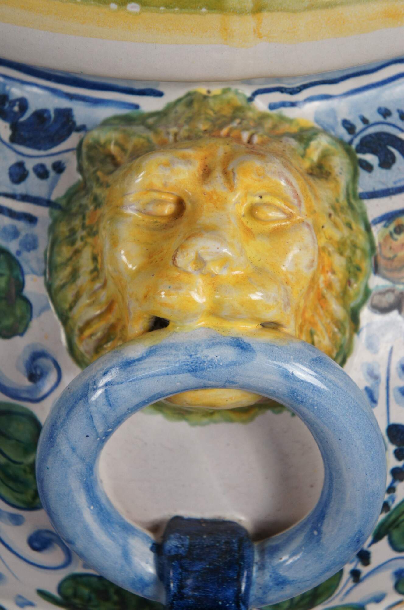 Monumental pair of Medterranean polychrome Deruta cachepot planters, circa 1970s. Handmade one of a kind painted Italian pottery. Features a bulbous amphora form flanked by lion heads with ringed handles. The top is designed in a leafy green and blue with flowers and fruit. The mouth of each vase is green and yellow. Base has a ring of blue in a wave like leaf pattern. Yellow and green pronounced botton near the bottom edge, reminiscent of a spigot.