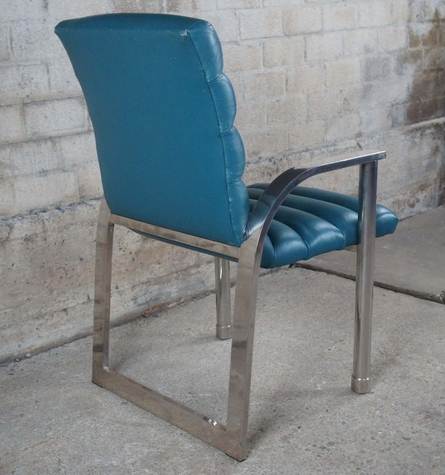 A beautiful set "Eclipse" dining chairs by Jay Spectre for Century Chair Comapny of North Carolina, circa 1980s. Each chair is crafted from stainless steel in a sculptural form with channeled leather seats. Fabric is a teal/ turquoise color. Includes 2 arms and 2 side chairs.