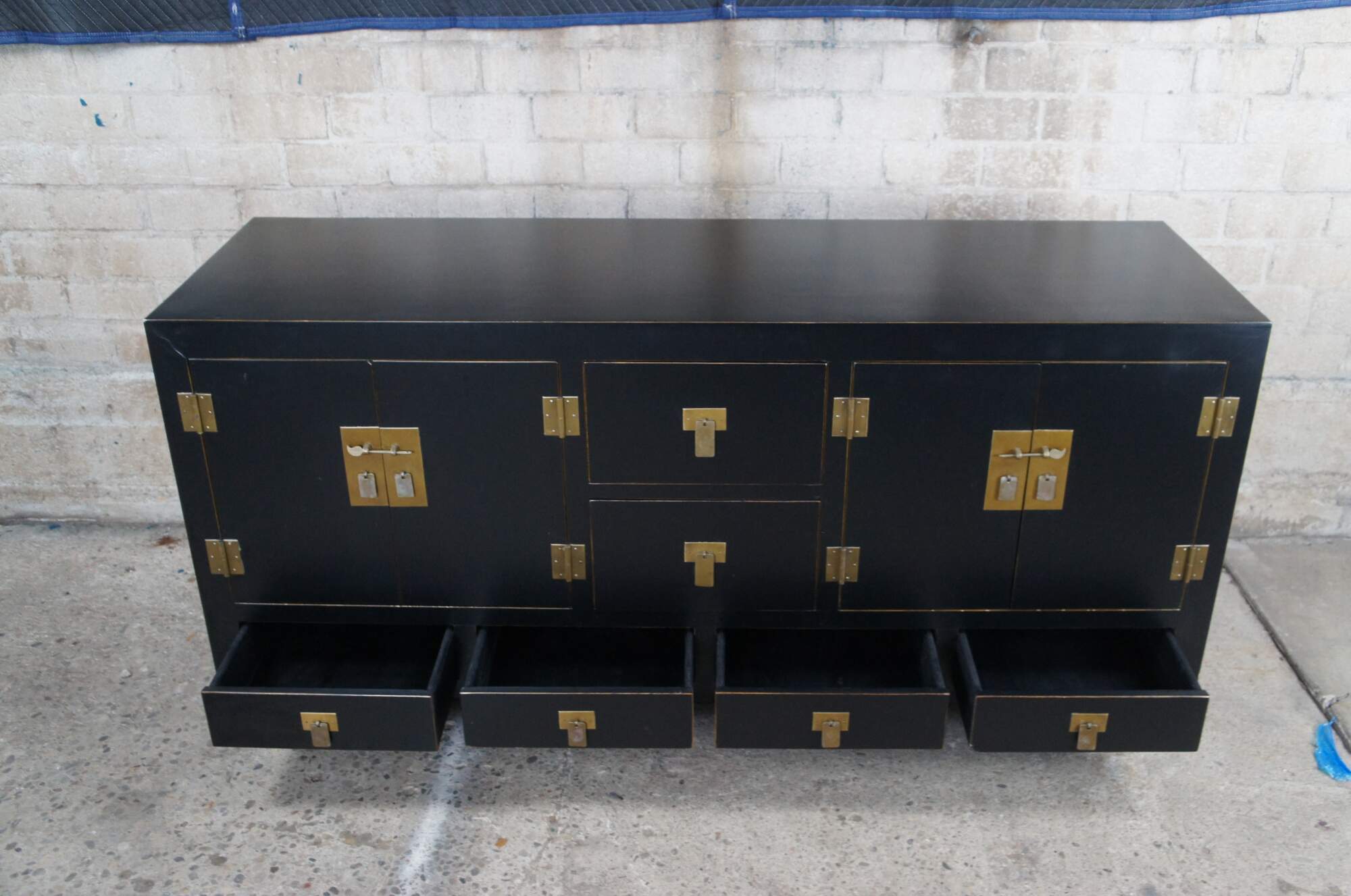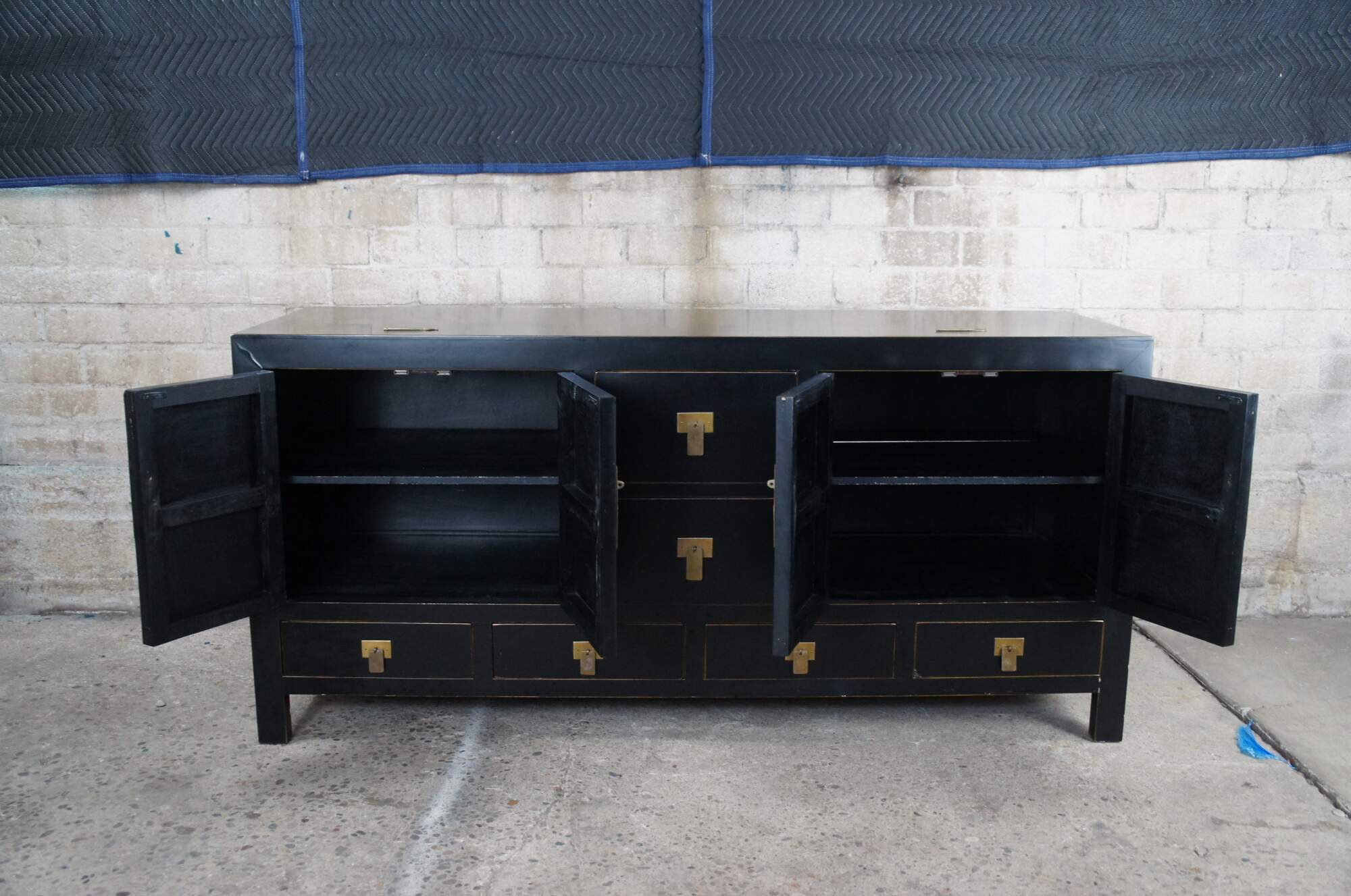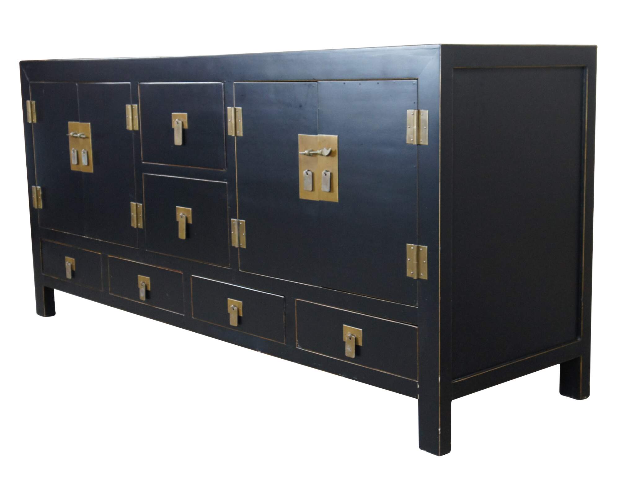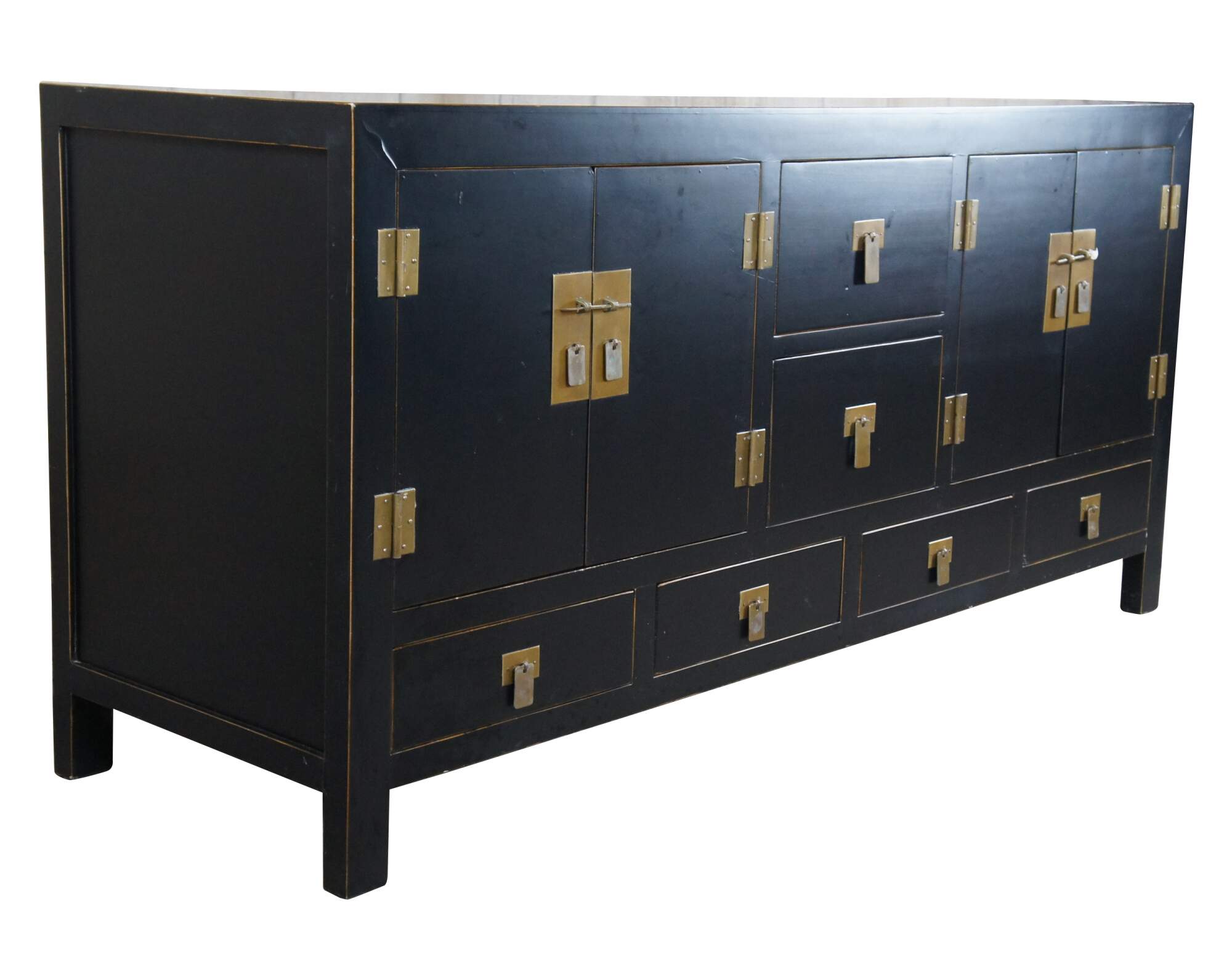 Late 20th century Chinoiserie elm sideboard. Features a rectangular form finished in black with brass hardware. Includes two central drawers flanked by outer cabinets with interior shelves and four accessory drawers below. A versatile piece that blends well in the dining room or living room.