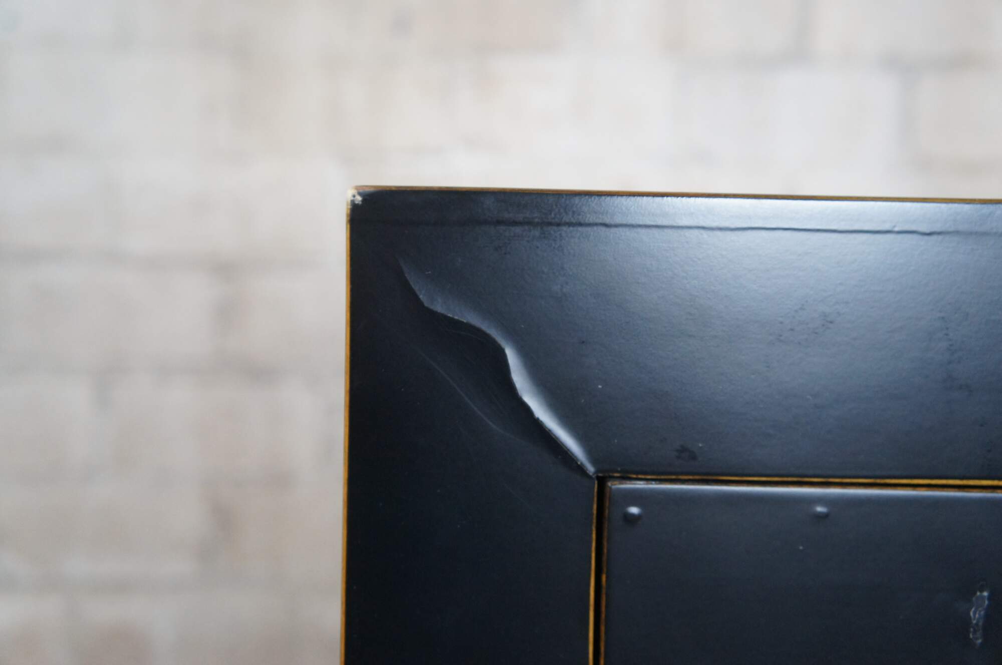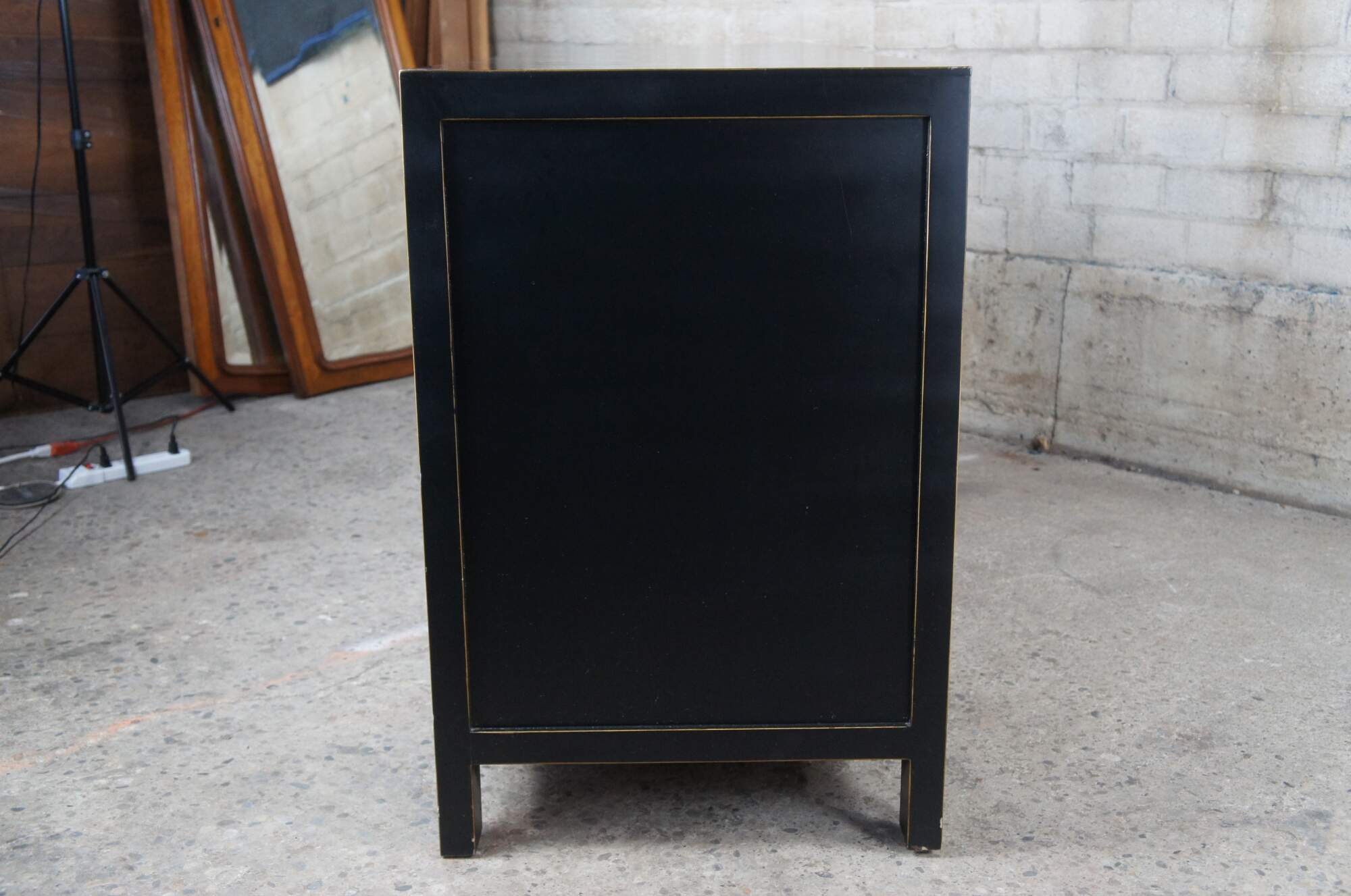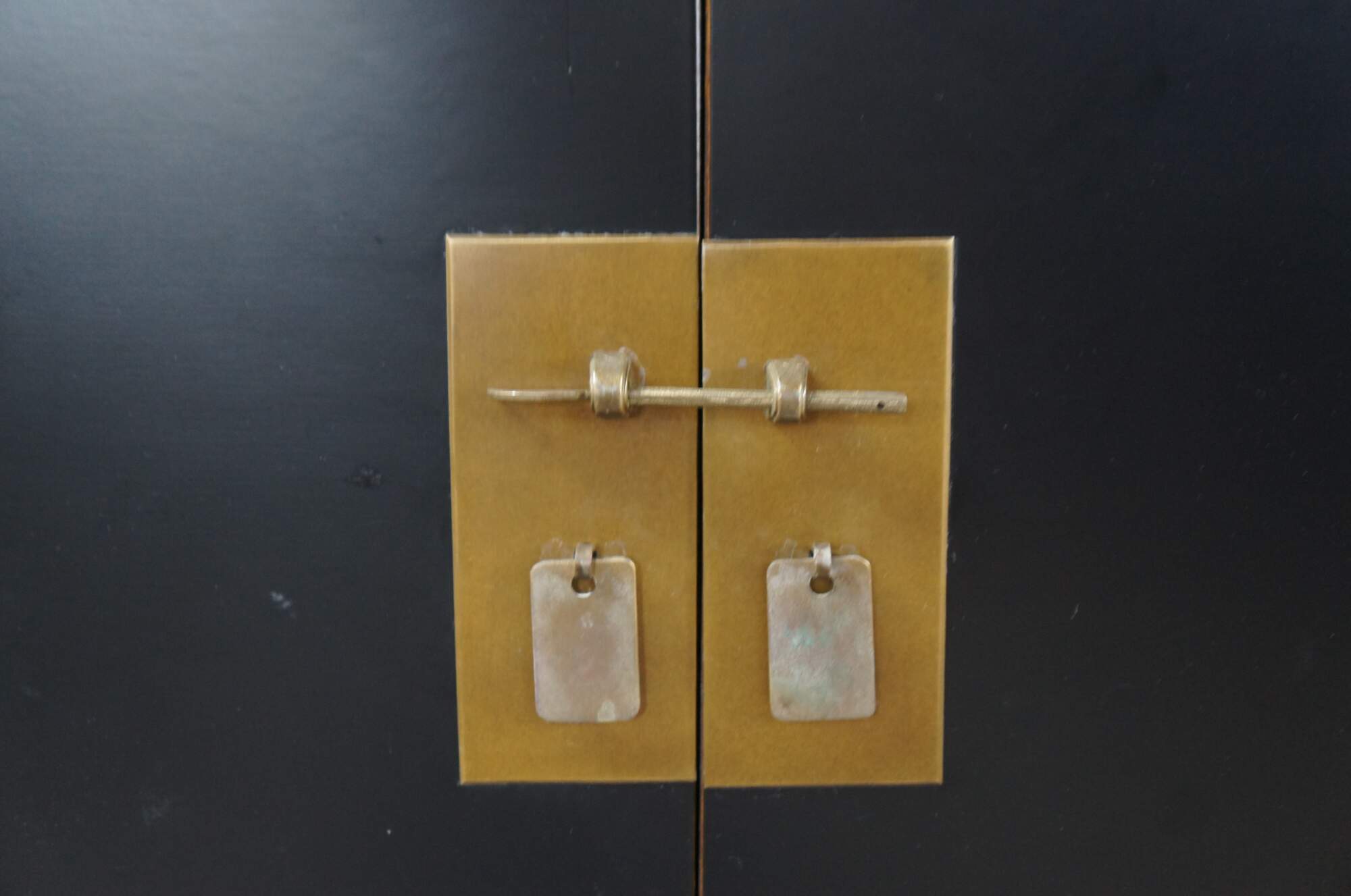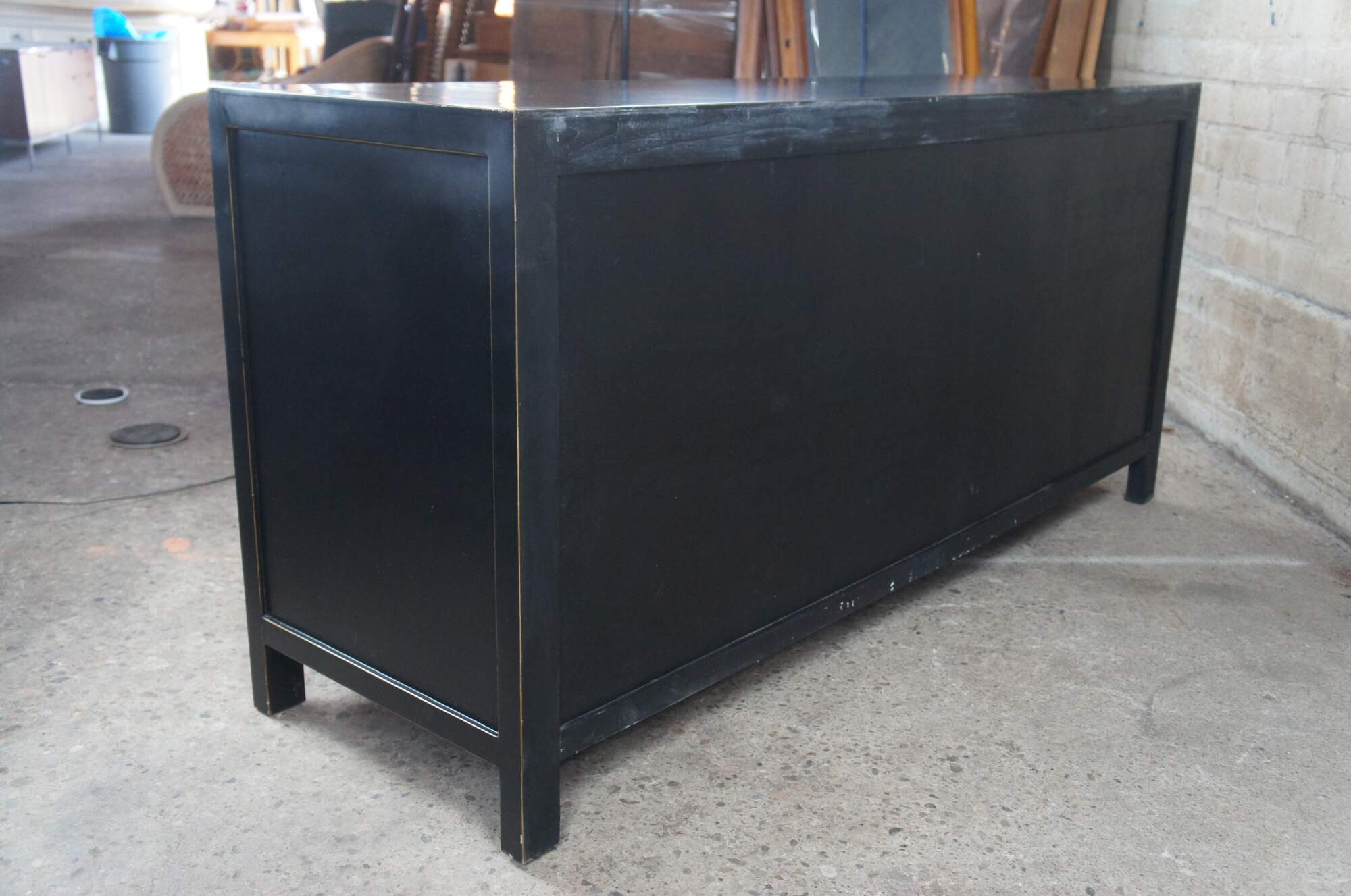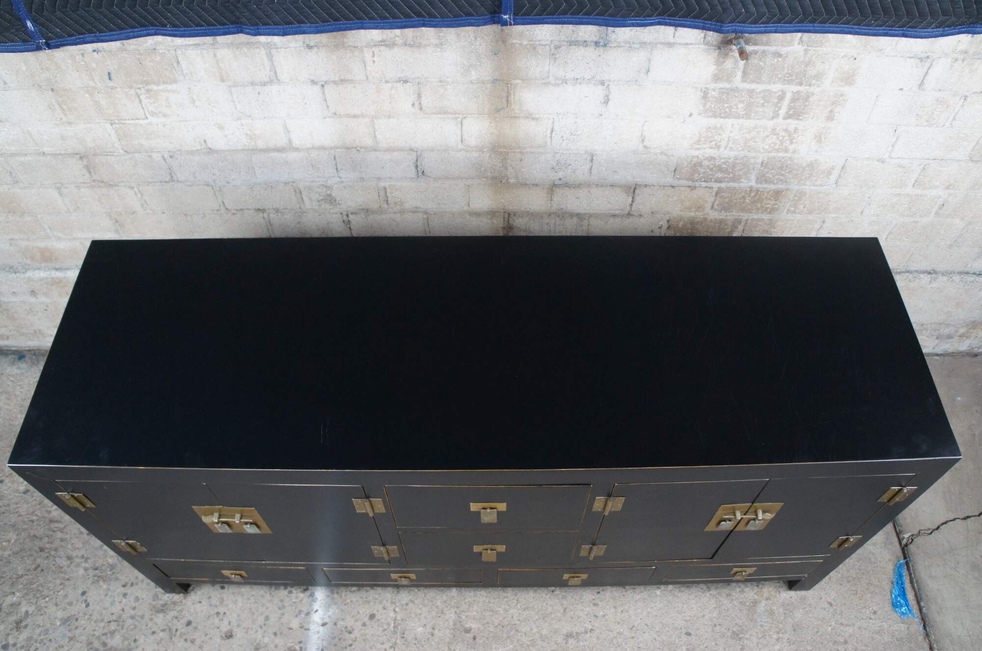 Late 20th century Chinoiserie elm sideboard. Features a rectangular form finished in black with brass hardware. Includes two central drawers flanked by outer cabinets with interior shelves and four accessory drawers below. A versatile piece that blends well in the dining room or living room.