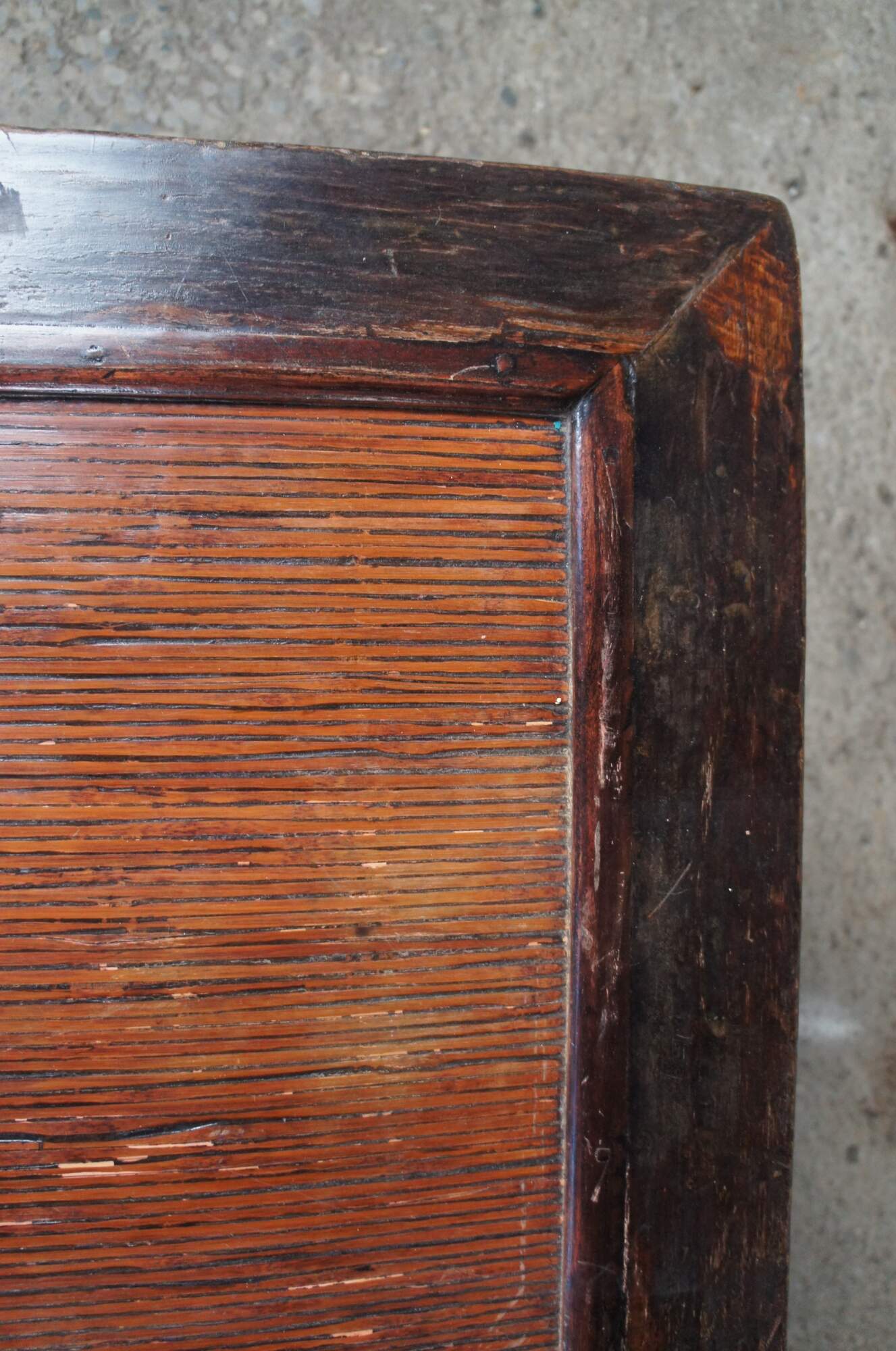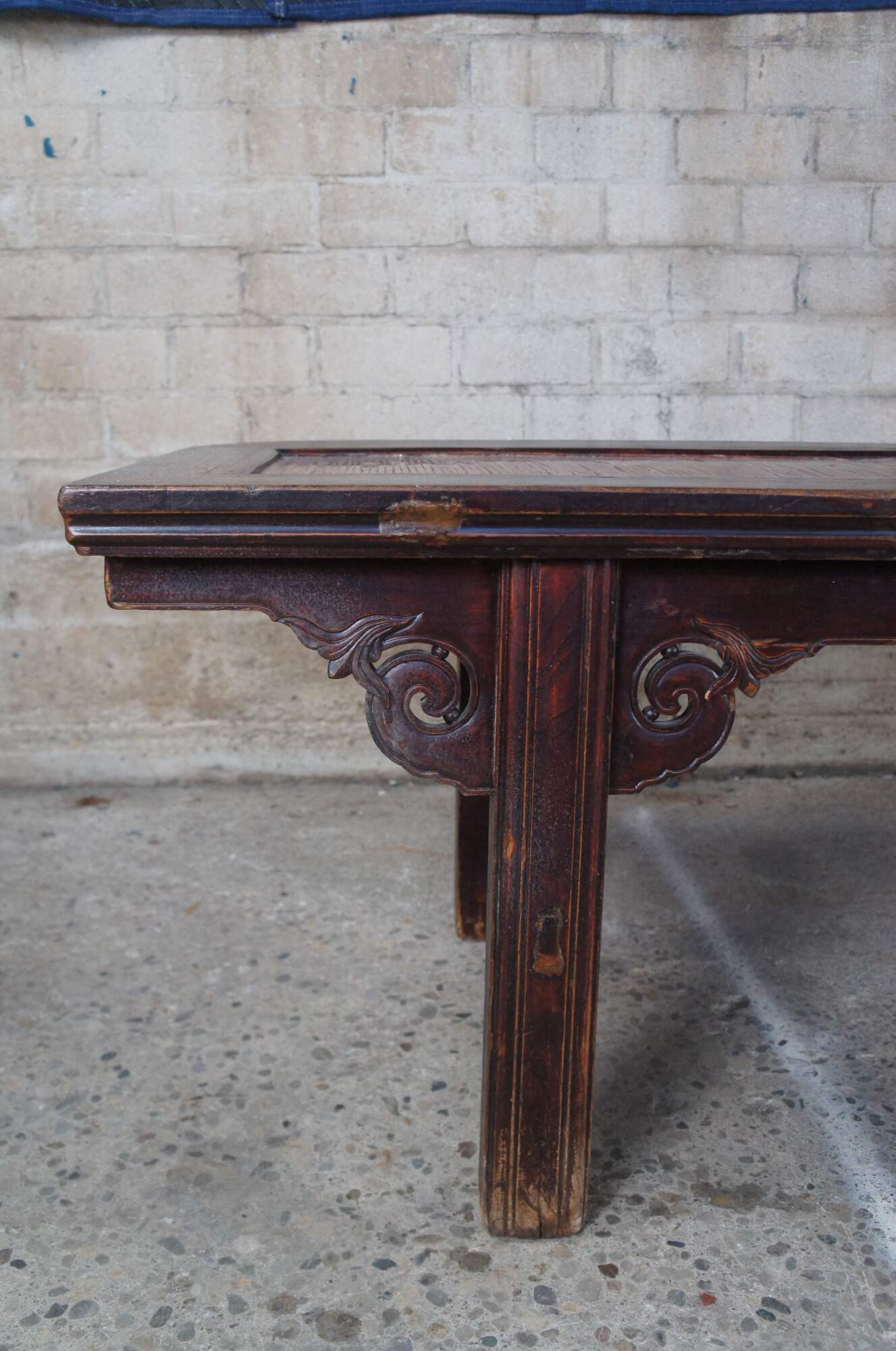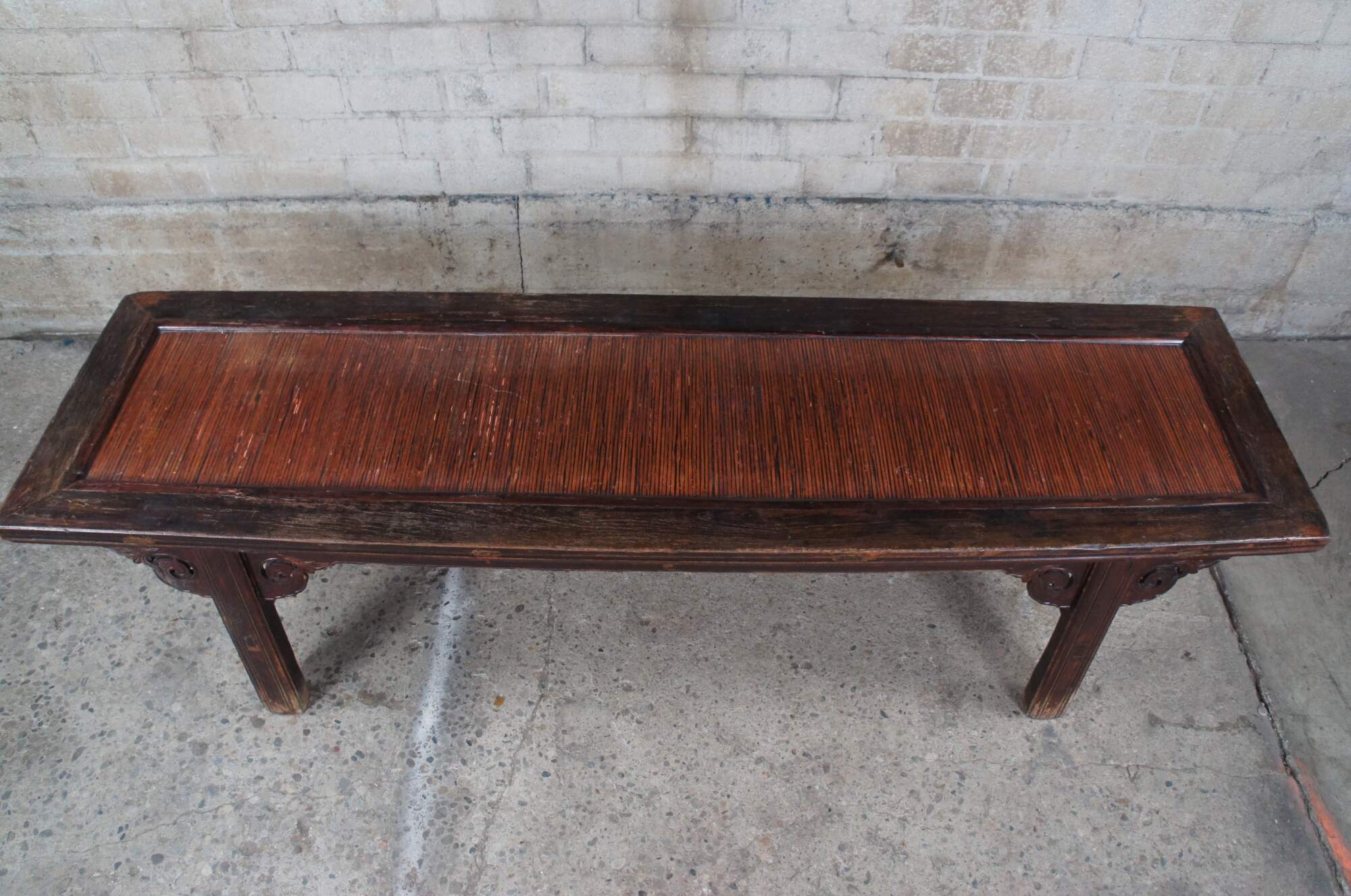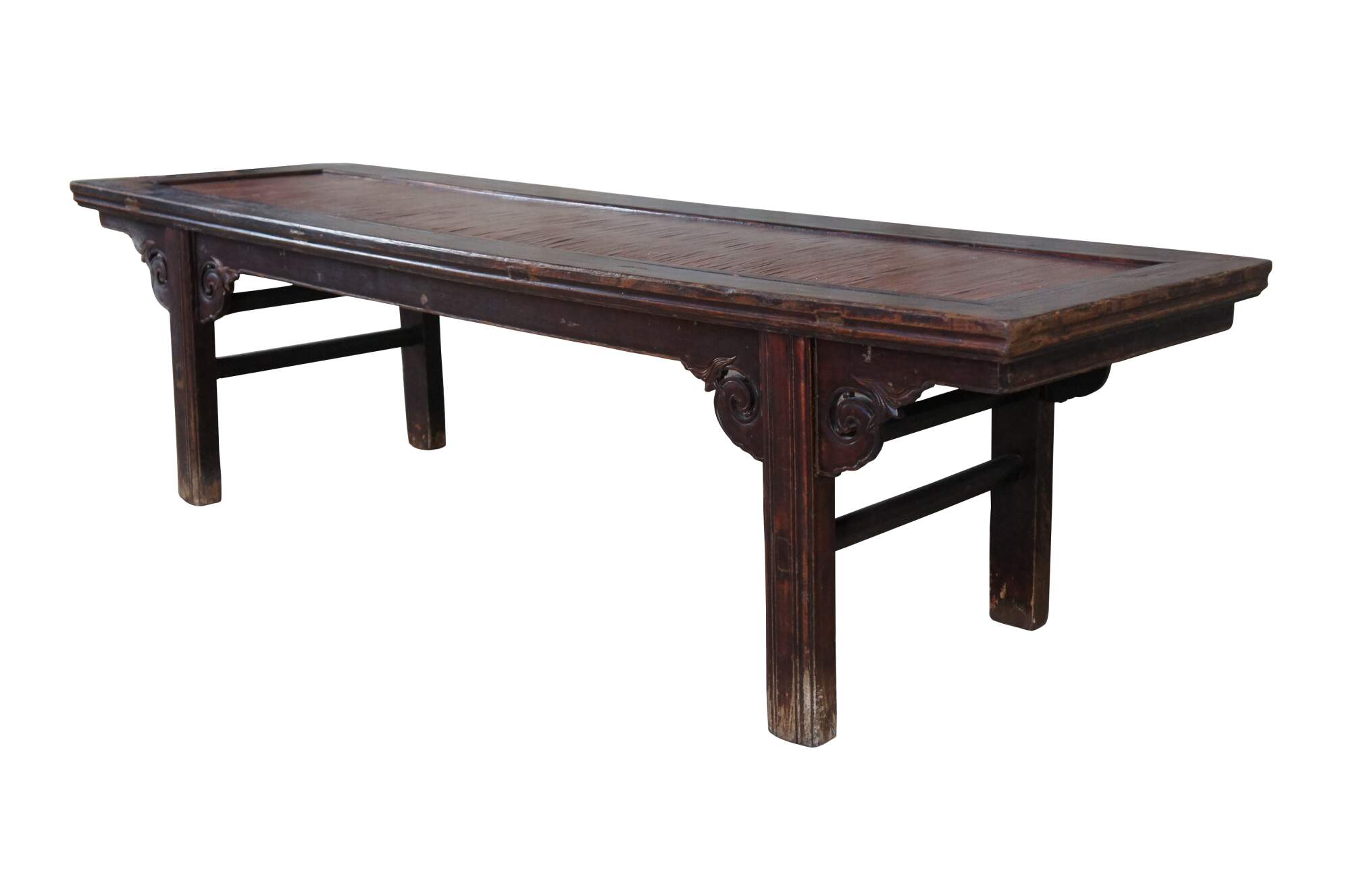 Charming late 19th Century Chinese Qing Dynasty bench. Made from solid elm wood in mortise and tenon construction with an inset split reed top. Features cared and scrolled spandrels with foliate detail. Supported by straight legs connected by double stretchers. An eclectic piece that works well as a bench, coffee table or accent piece. The aged distressing lends perfectly to its rustic appeal.