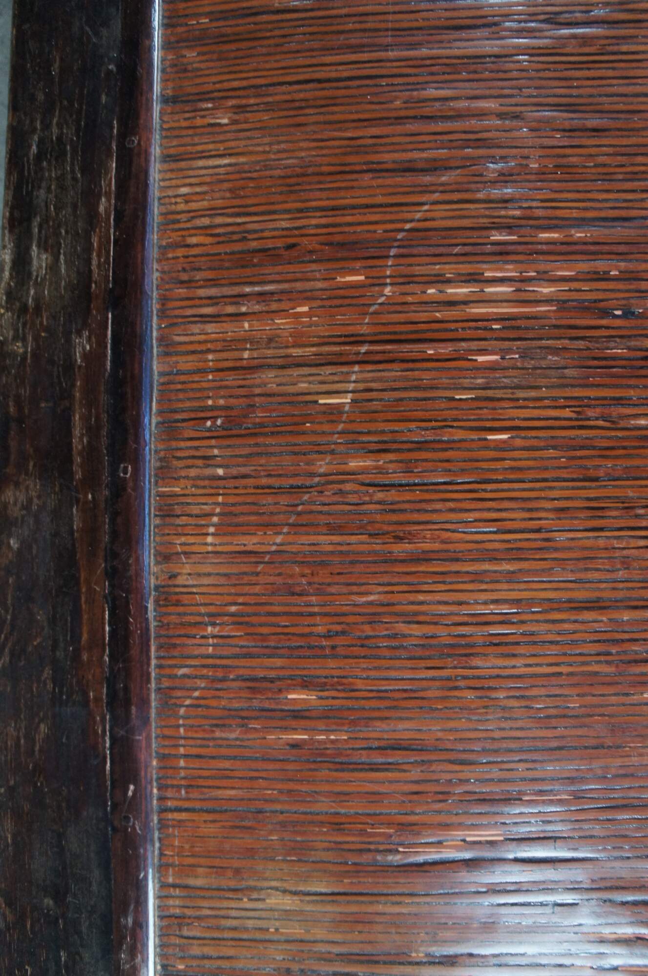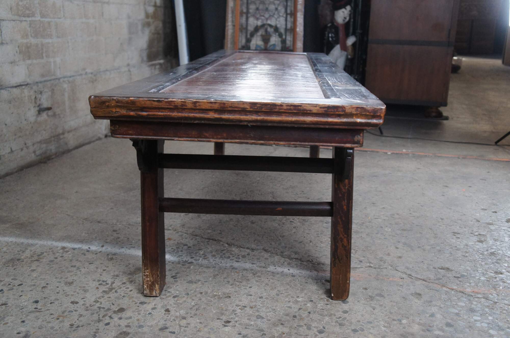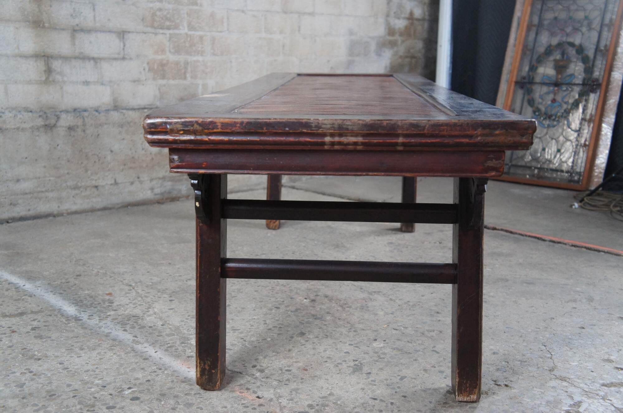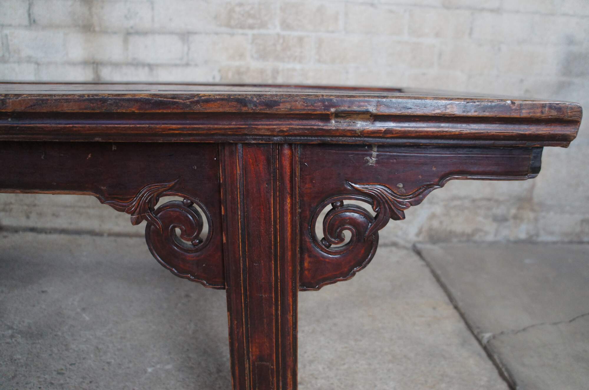 Charming late 19th Century Chinese Qing Dynasty bench. Made from solid elm wood in mortise and tenon construction with an inset split reed top. Features cared and scrolled spandrels with foliate detail. Supported by straight legs connected by double stretchers. An eclectic piece that works well as a bench, coffee table or accent piece. The aged distressing lends perfectly to its rustic appeal.