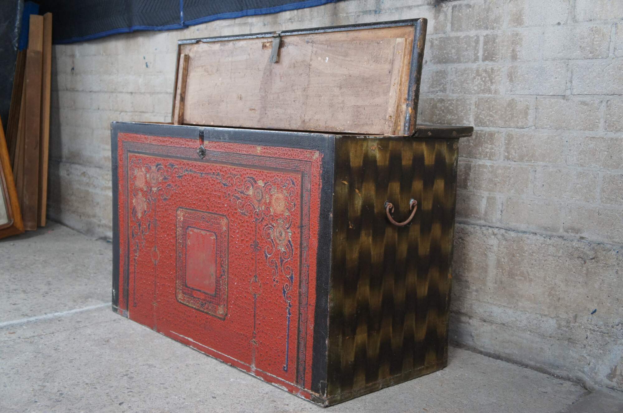 Monumental 19th century Tibetan blanket or storage chest. Rectangular in form with a hand painted red and black textured front with flowers, scrolls and Chinese Greek key design. Features a split top with removable lid, a black and gold zig zag design along the top and sides and iron handles. Constructed using hand cut nails. A great statement piece for any home. Perfect for use as an entertainment or media console.