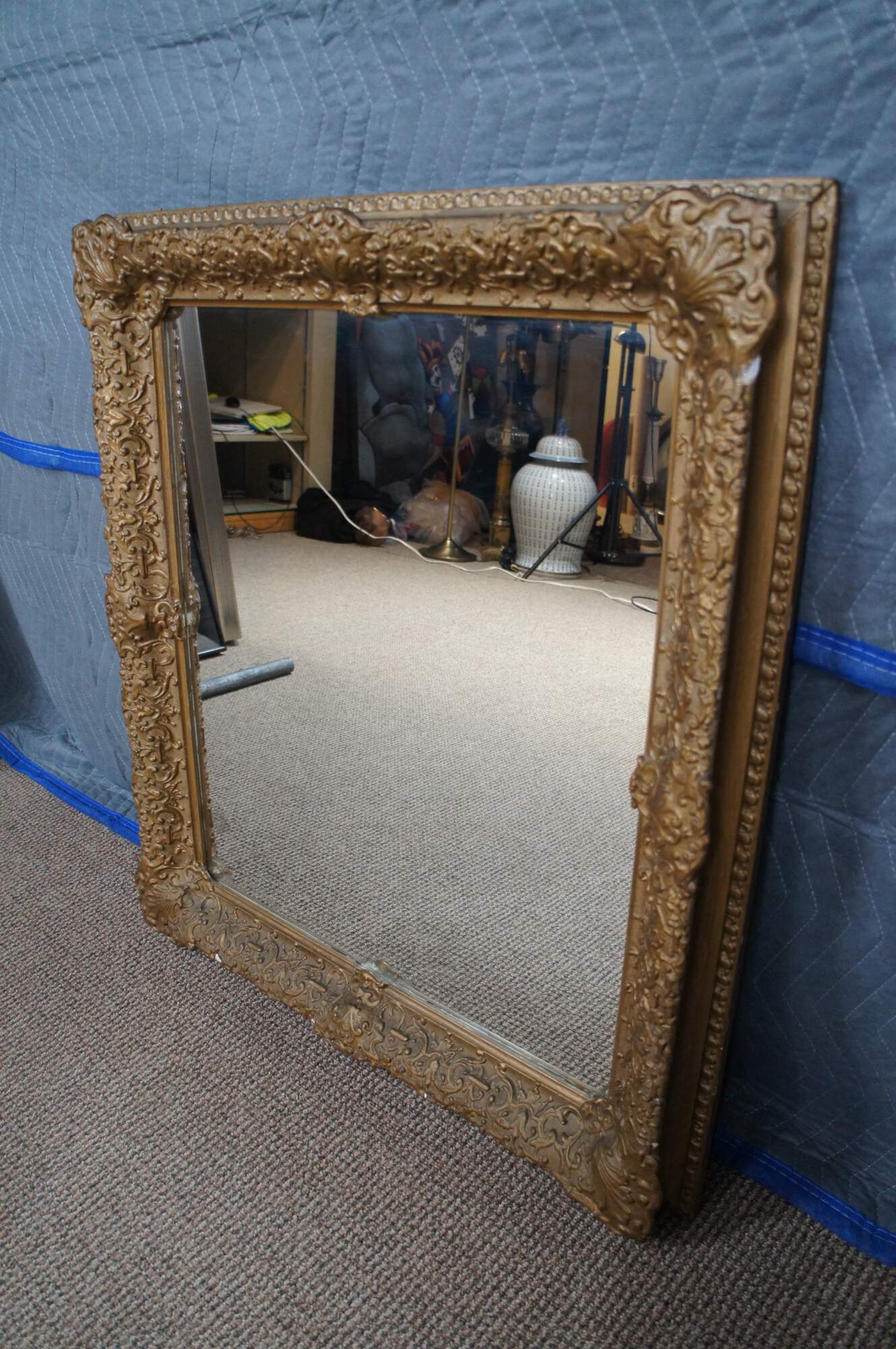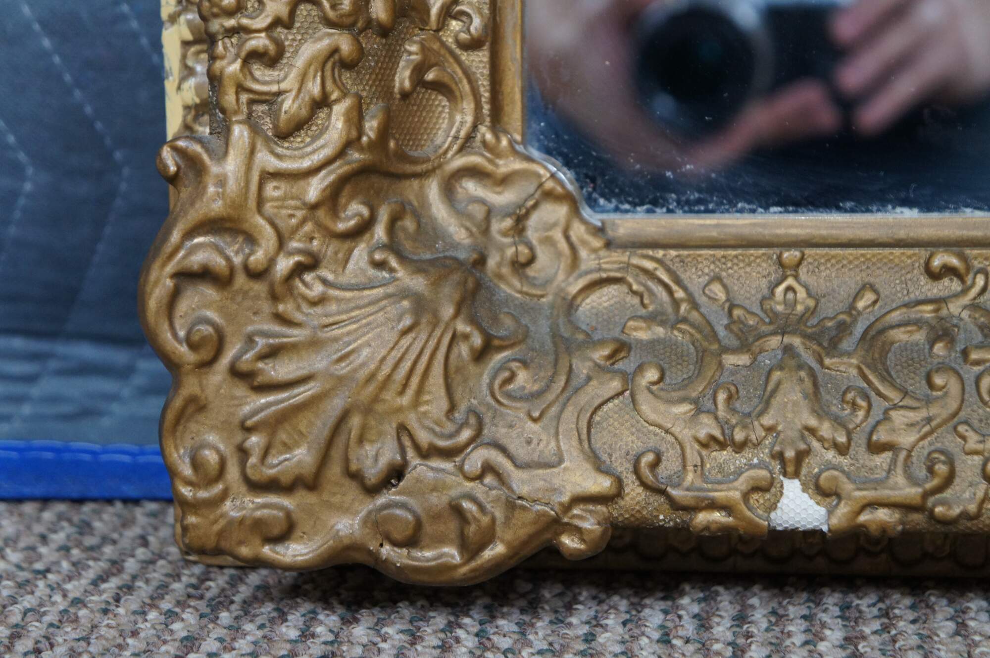 Antique rectangular wall mirror featuring gilded plaster / gesso over wood frame, molded with swirling foliate and scallop motifs.