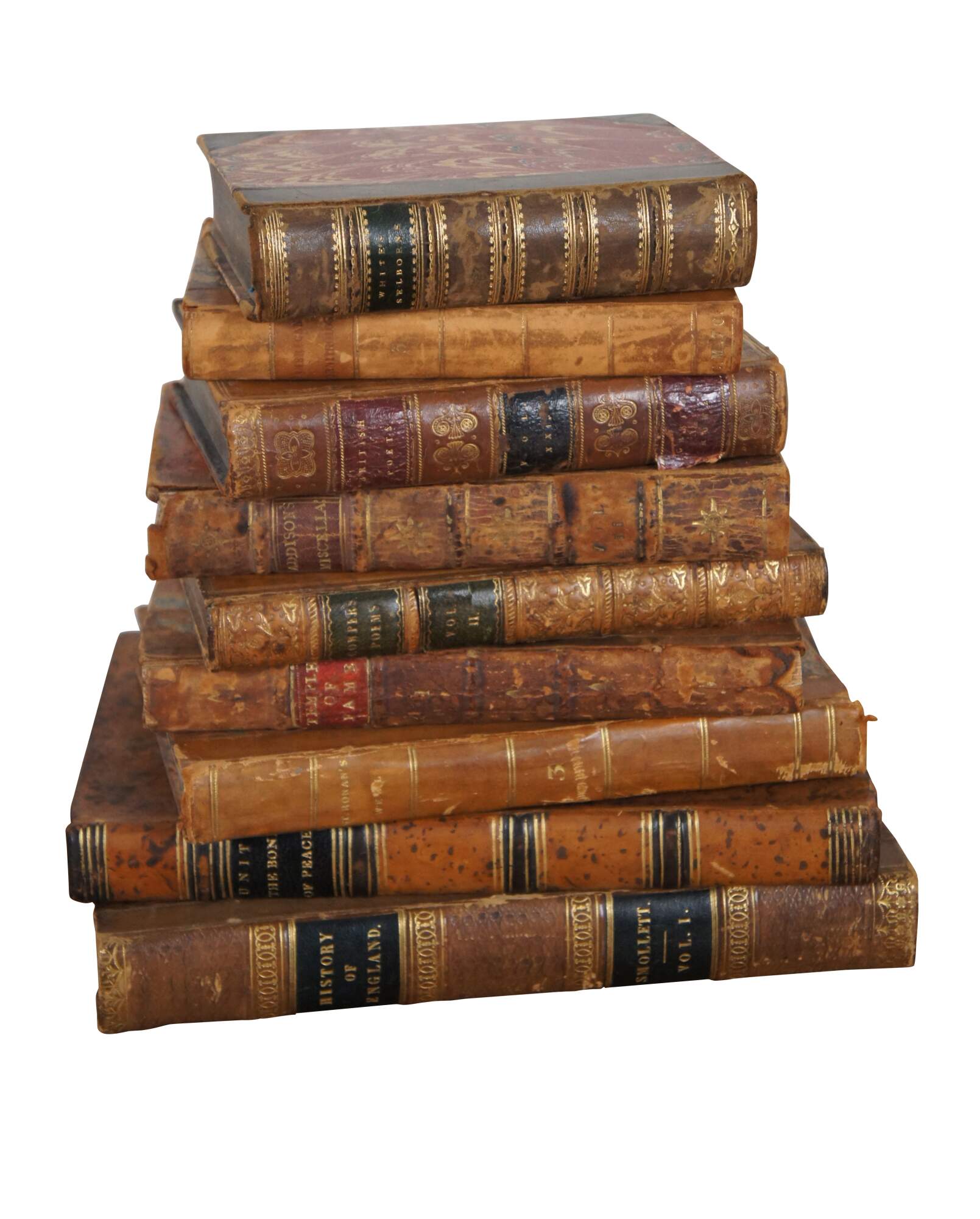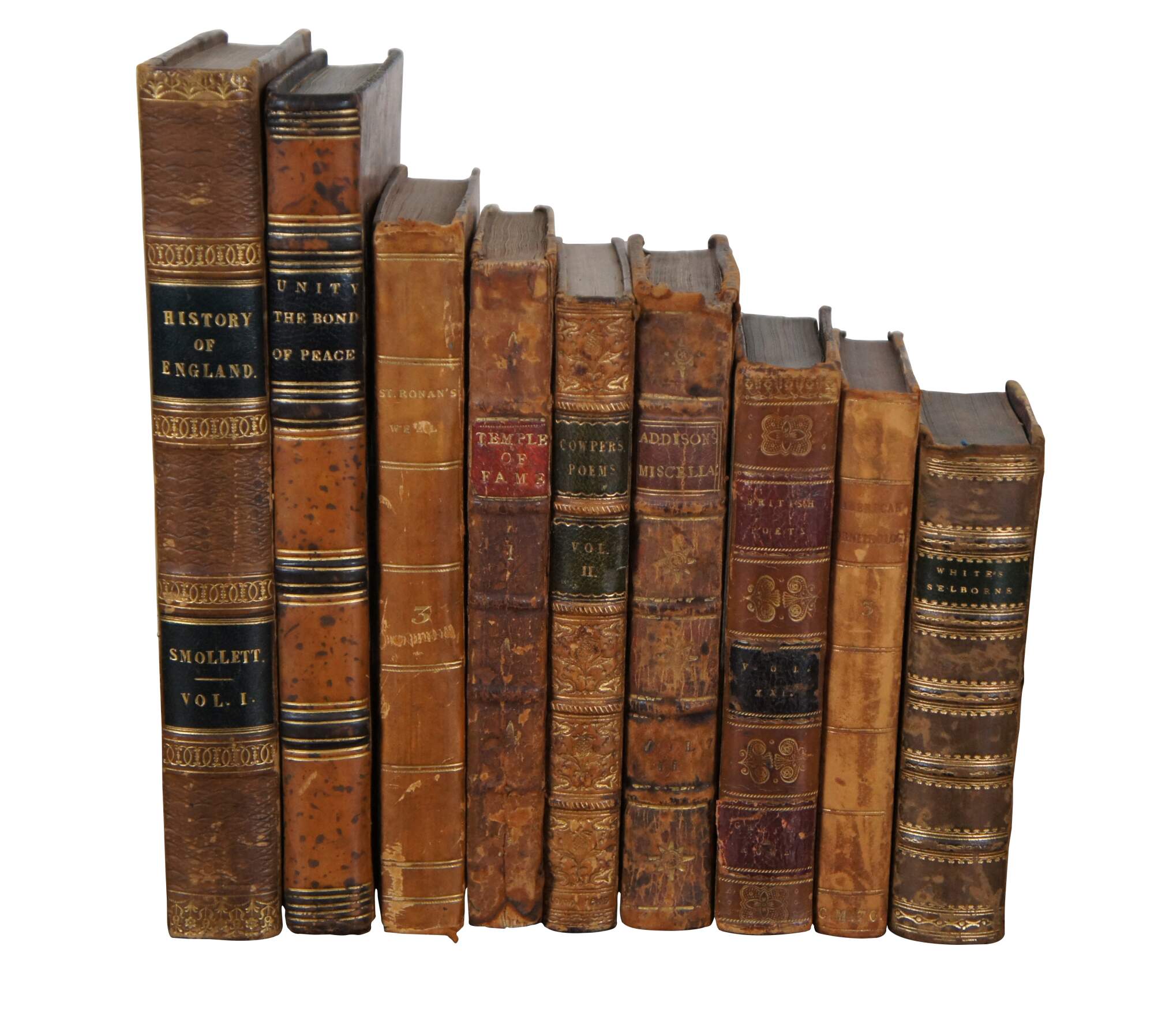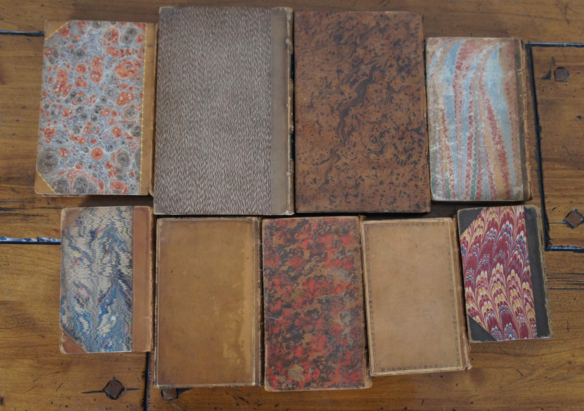 Lot of nine English language hard cover leather bound books on a variety of topics, dating from 1736 to 1843.