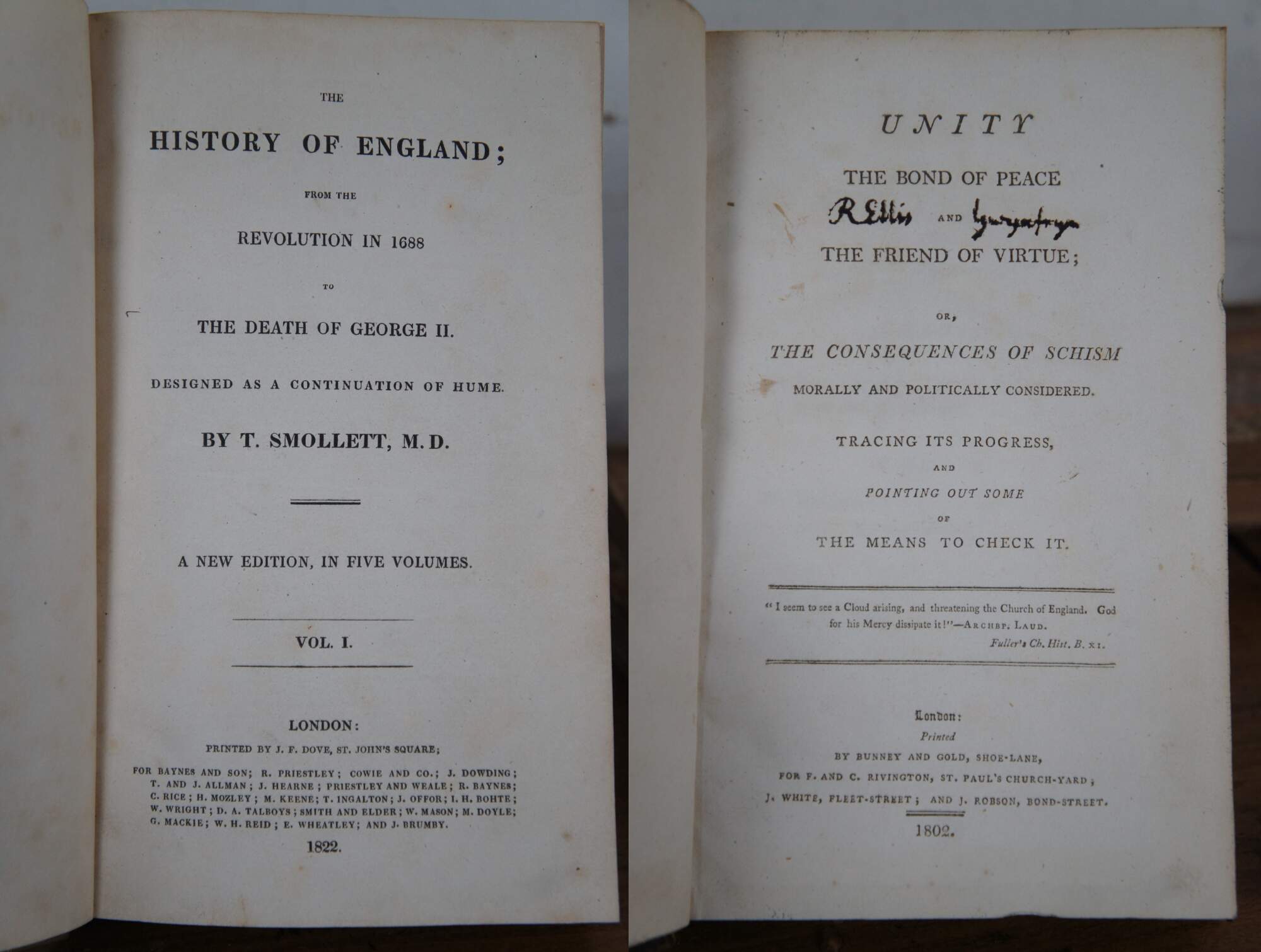 - 1822 - The History of England; From the Revolution in 1688 to the Death of George II. Designed as a Continuation of Hume. - By T. Smollett, M.D. - A New Edition, in Five Volumes. - Volume I – Printed by J.F. Dove, London, etc.