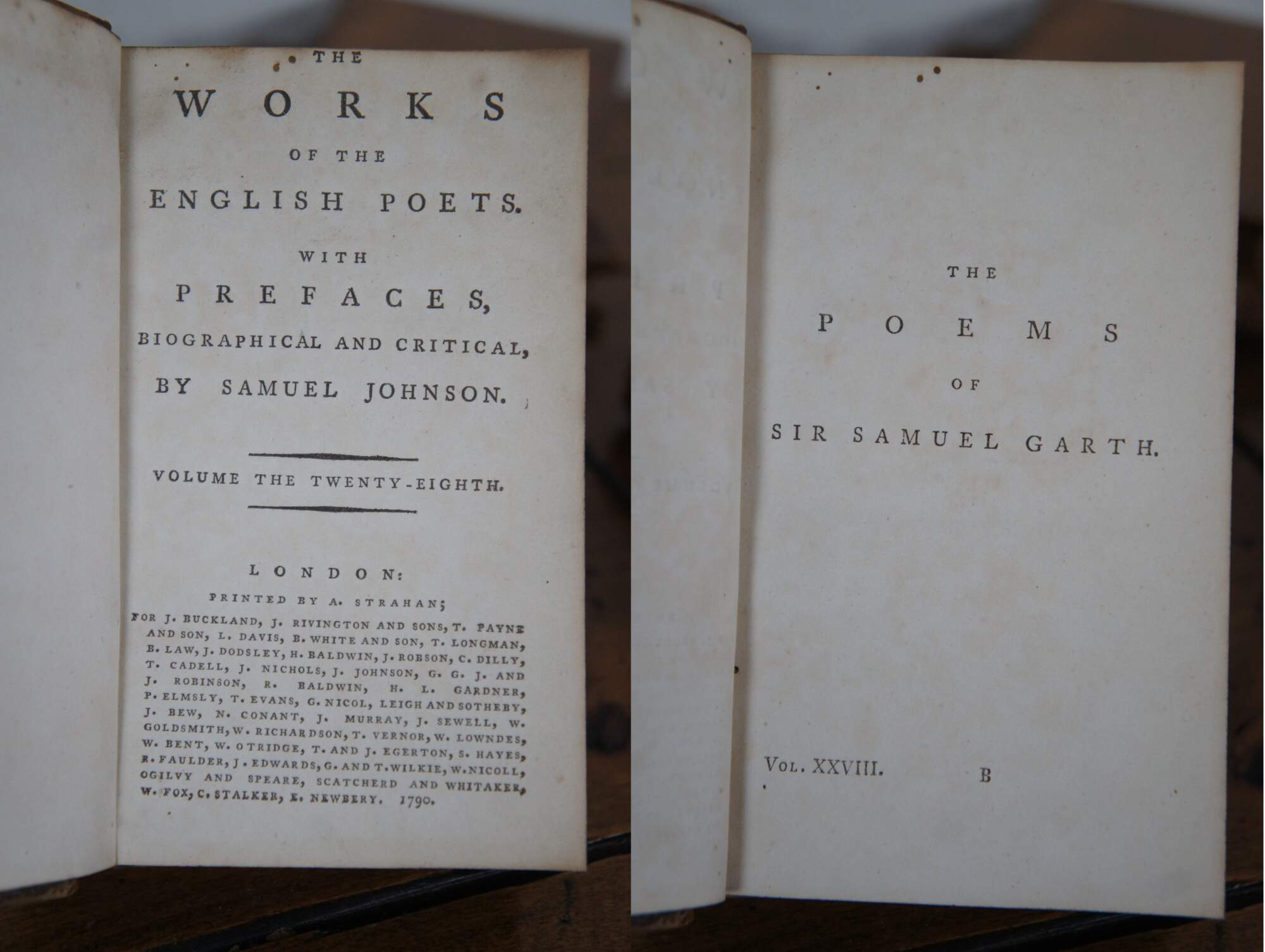 - 1790 - The Works of the English Poets. With Prefaces, Biological and Critical – by Samuel Johnson – Volume the Twenty-Eighth – The Poems of Sir Samuel Garth – Printed by A. Strahan, London, etc.