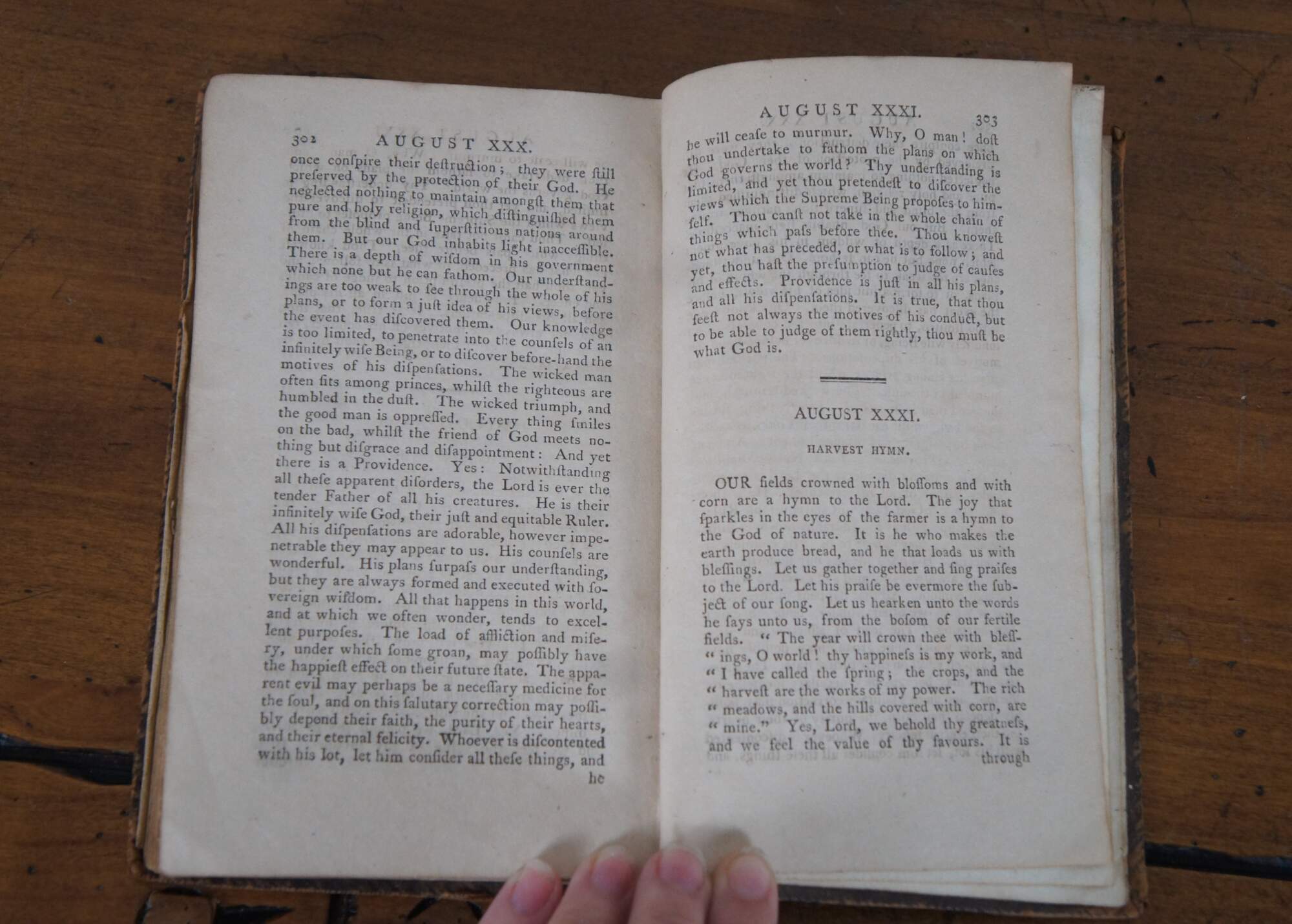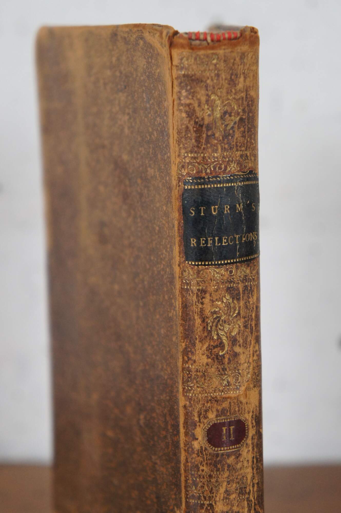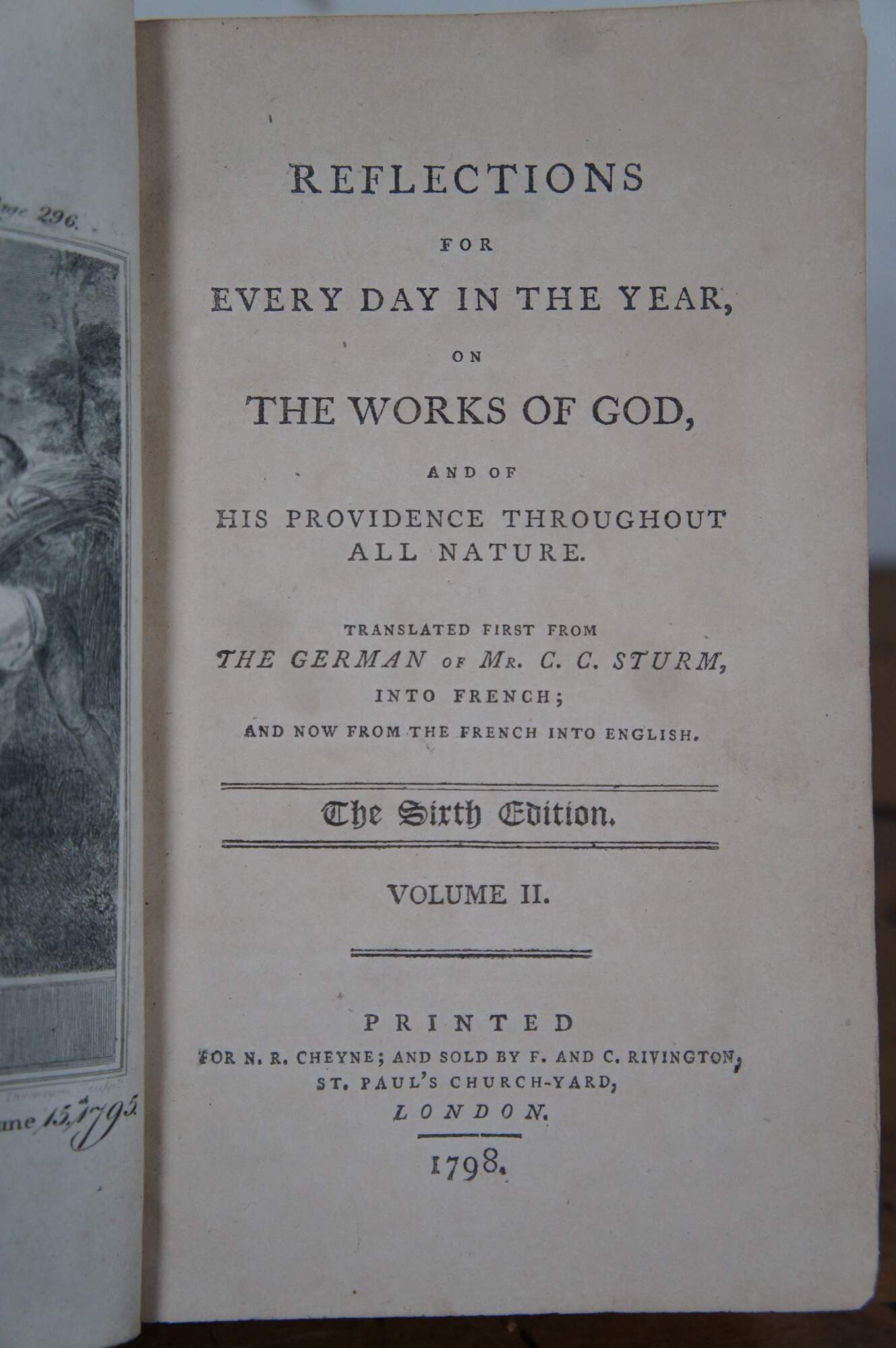 Antique Federal era brown leather hard cover book titled “Reflections for Every Day in the Year, on the Works of God, and of His Providence Throughout All Nature” translated first from the German of Mr. C.C. Sturm, into french, and now from the French into English – The Sixth Edition – Volume II – printed for N.R. Cheyne and sold by F. And C. Rivington, London – 1798. Contains reflections for May through August. Name of original owner written on back flyleaf.
