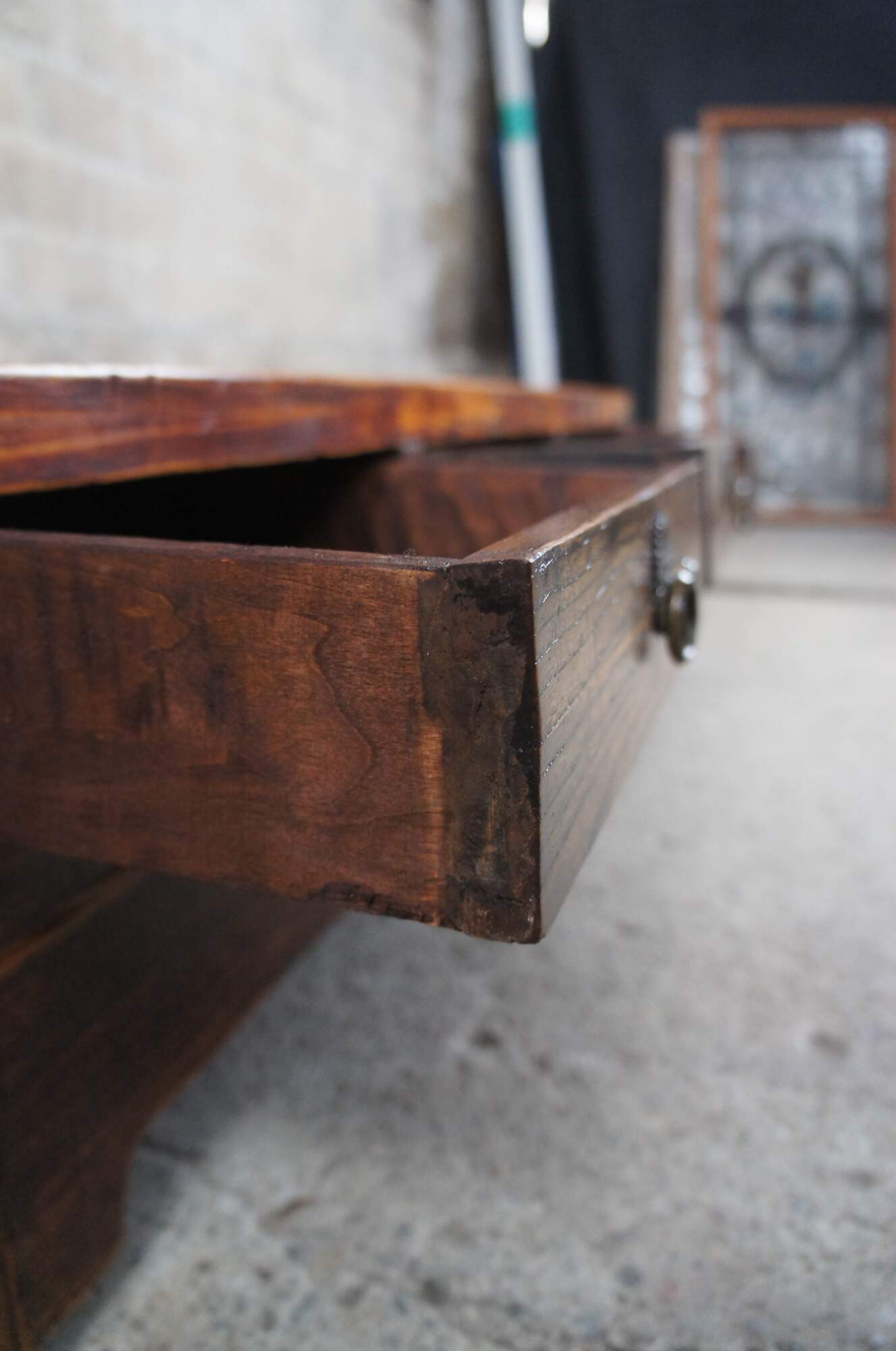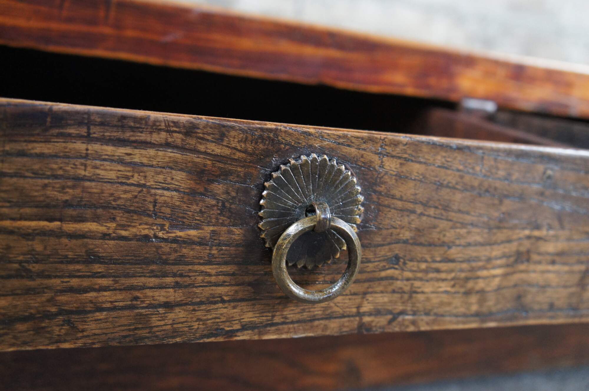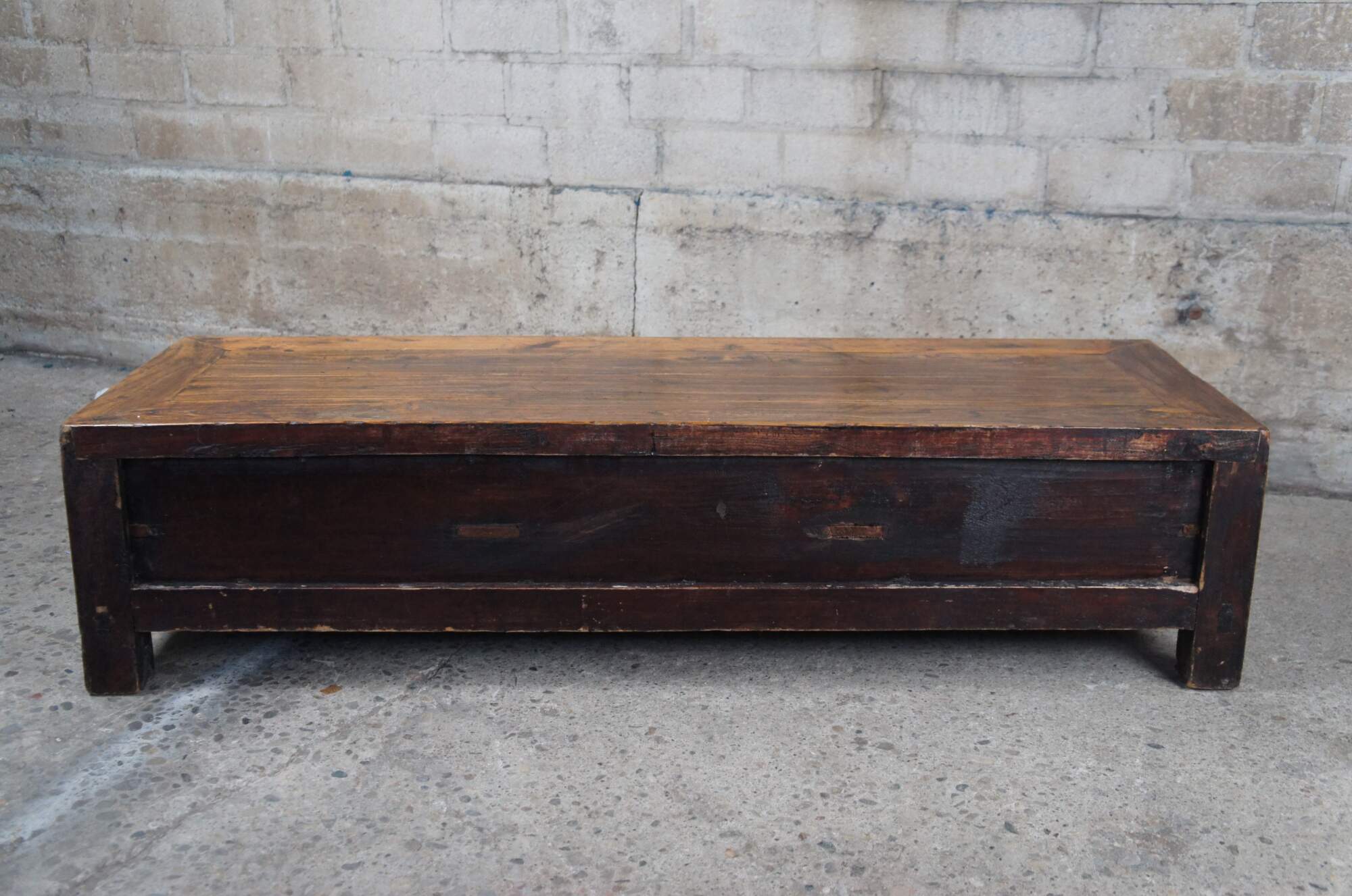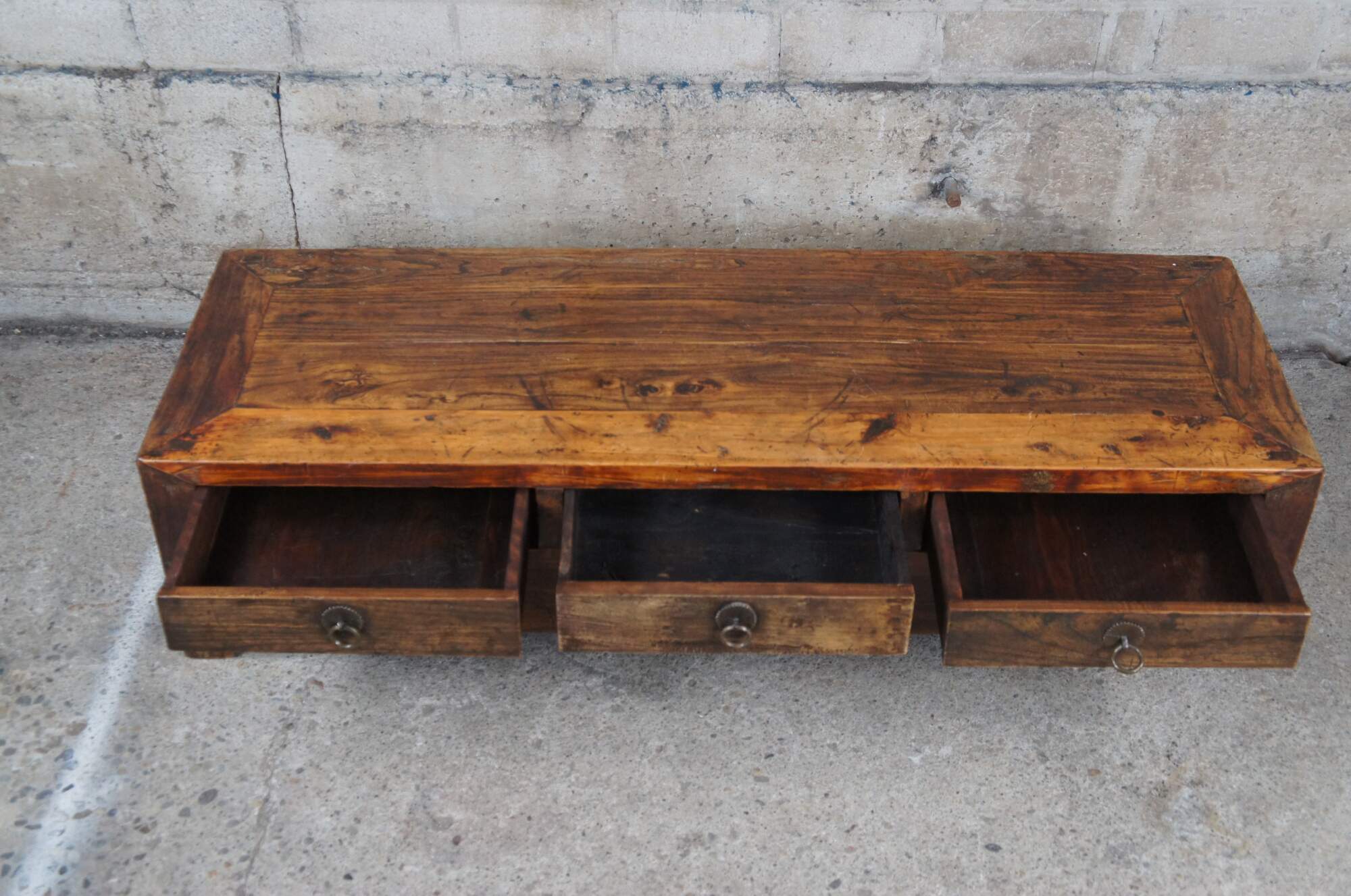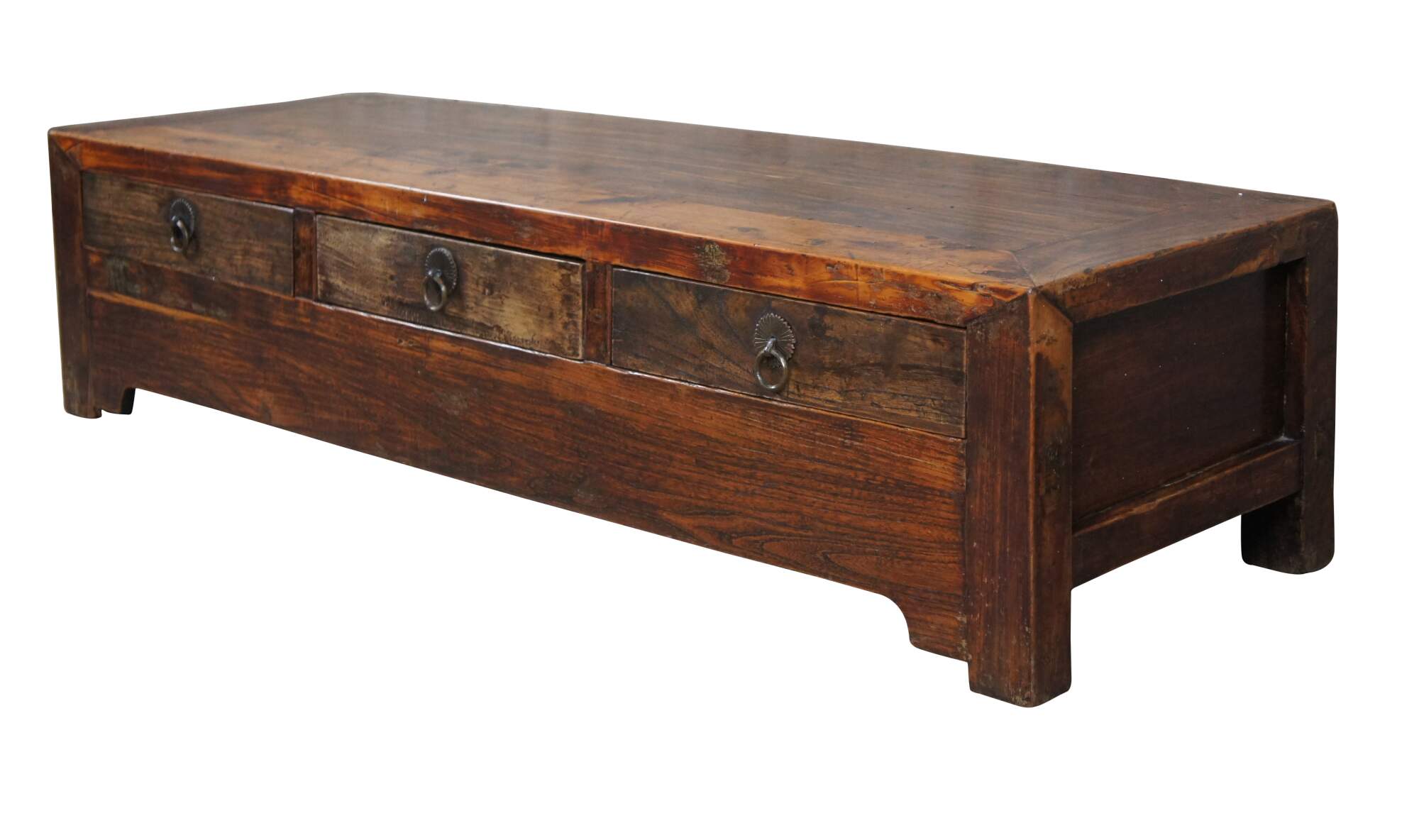 Antique Chinese Qing Dynasty Ming inspired console or coffee table, circa 1870s. A rectangular form made from Elm in mortise and tenon construction with inset panels. Includes three hand dovetailed drawers with brass hardware. A versatile piece that works well as a coffee / cocktail table, altar console or TV/ Media Stand.