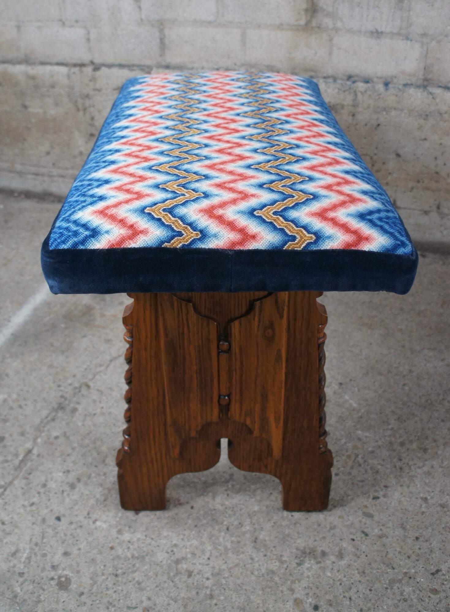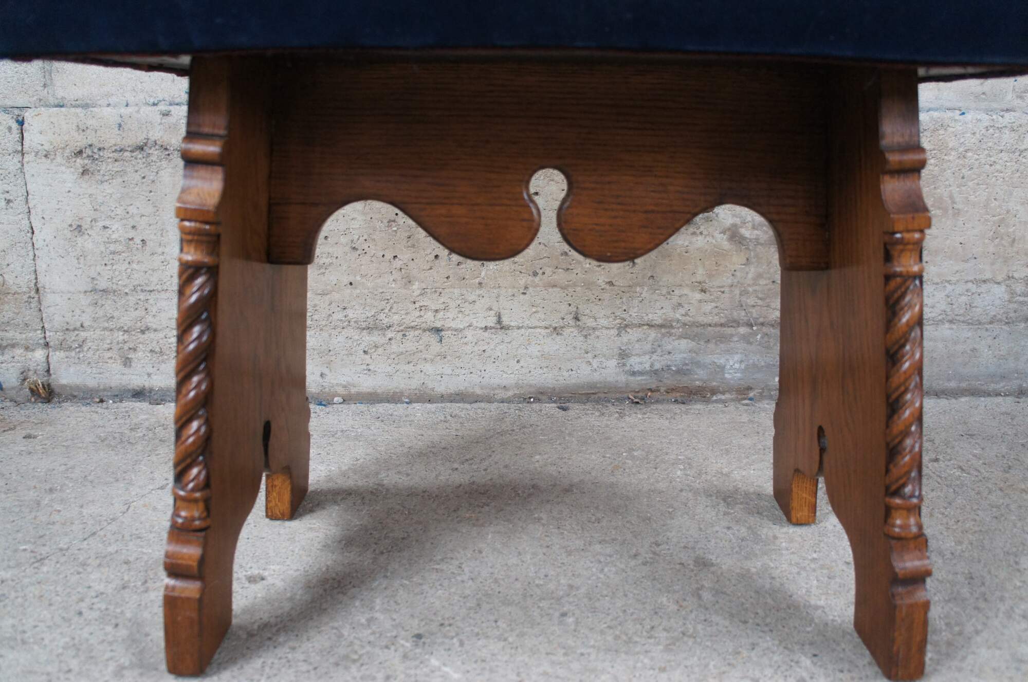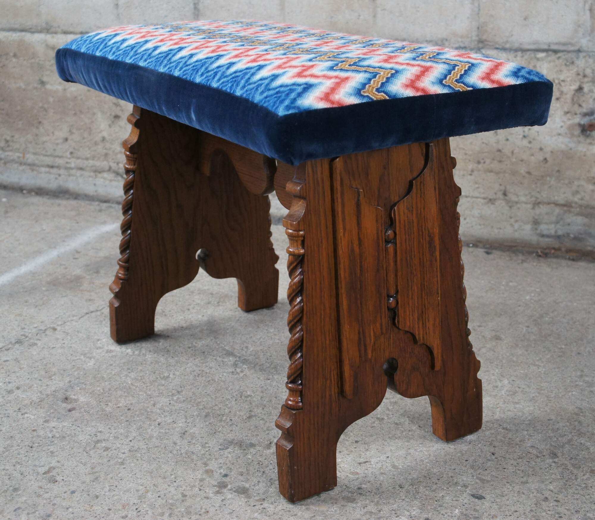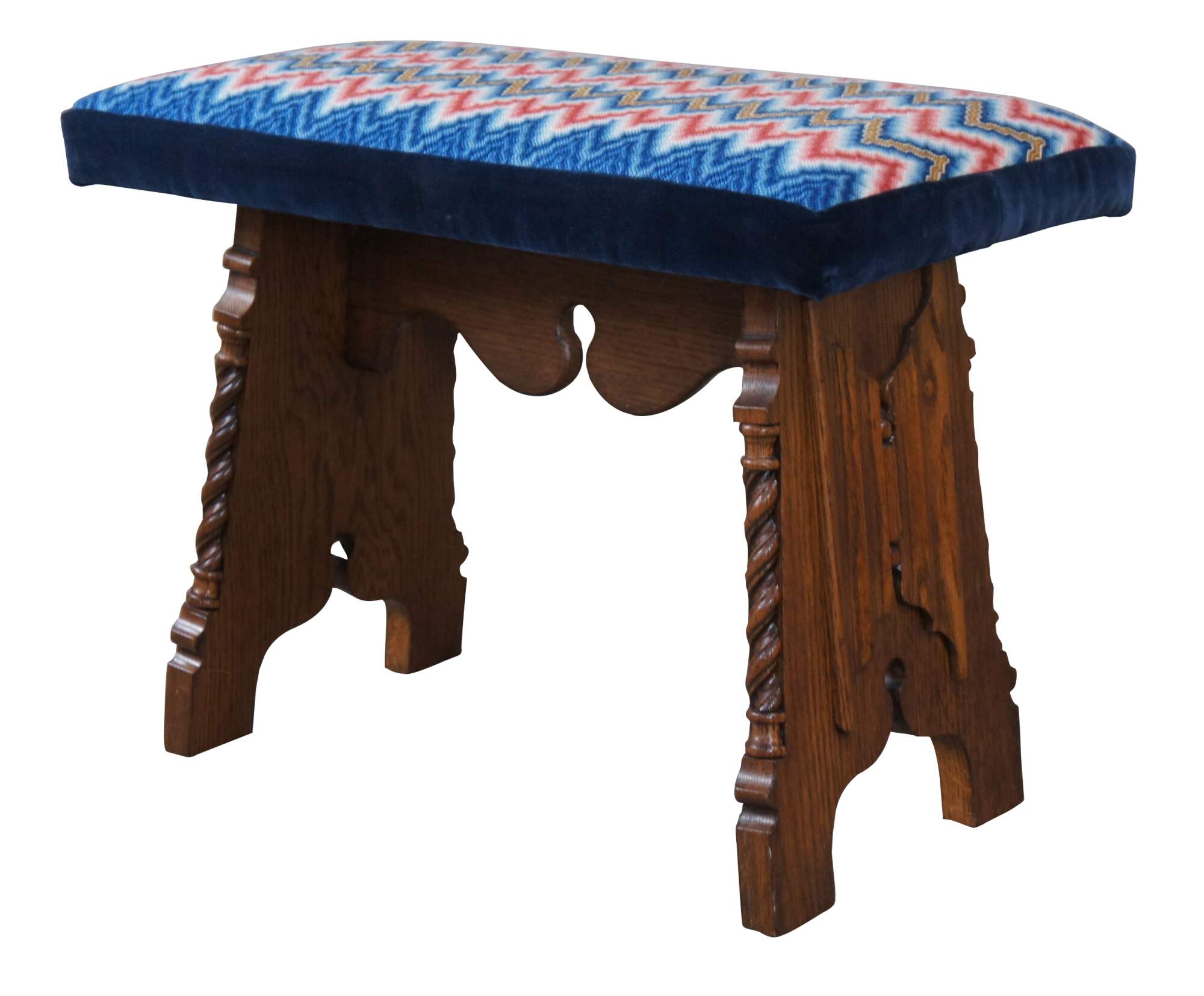 Antique American Furniture Company Gothic Revival vanity stool or piano bench. Made of oak featuring a rectangular zigzag upholstered seat over linen fold carved base with barley twisted accents.