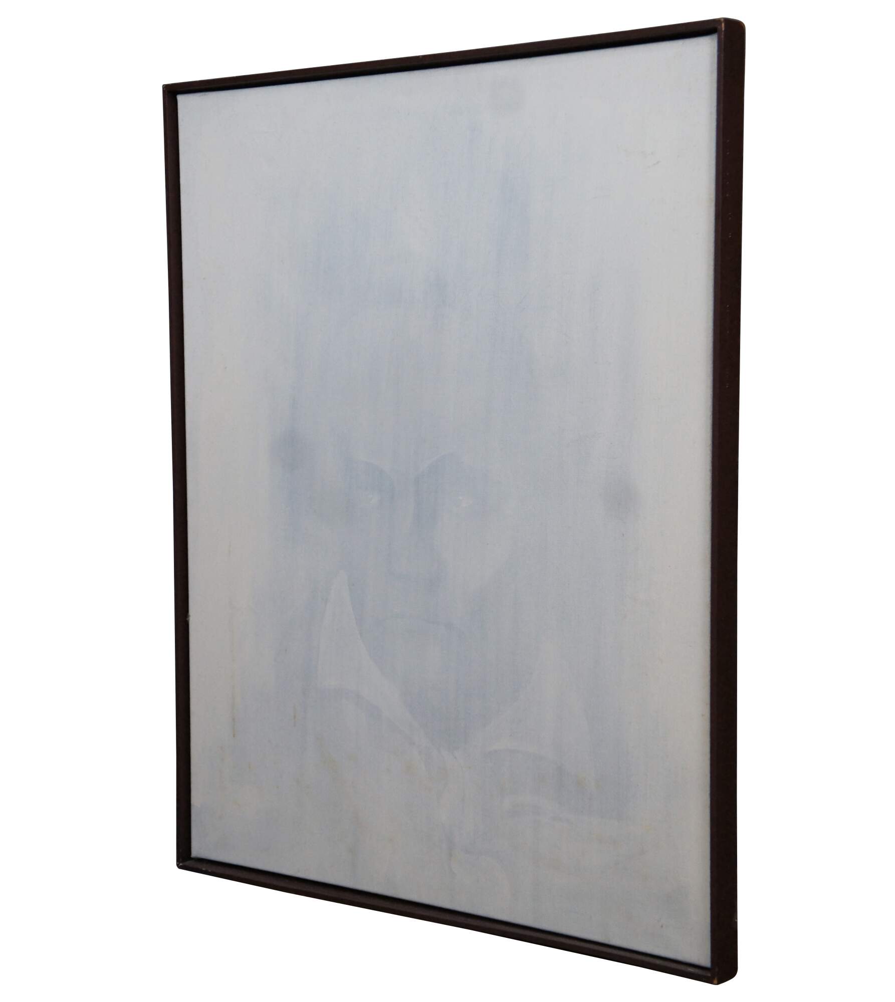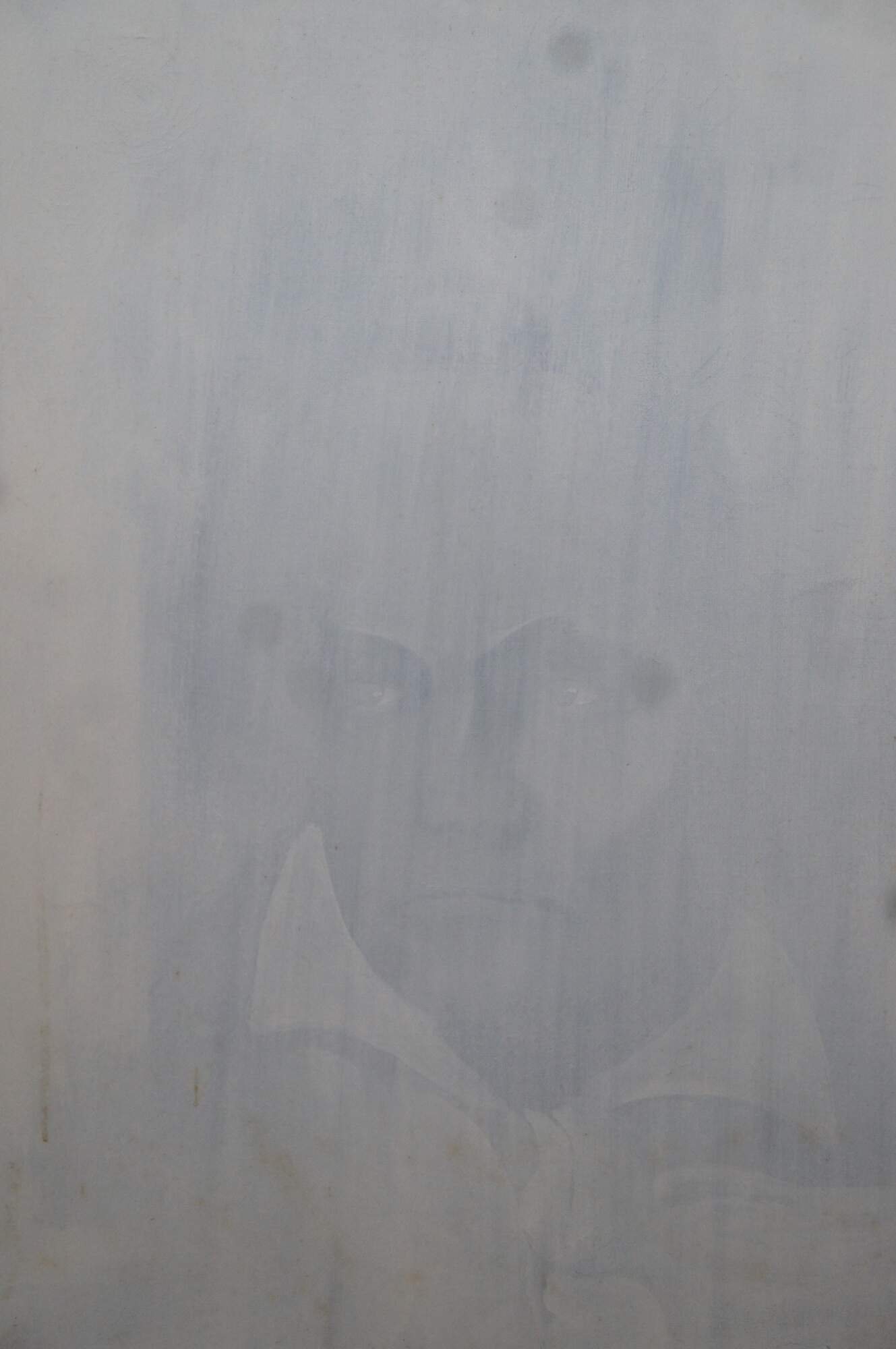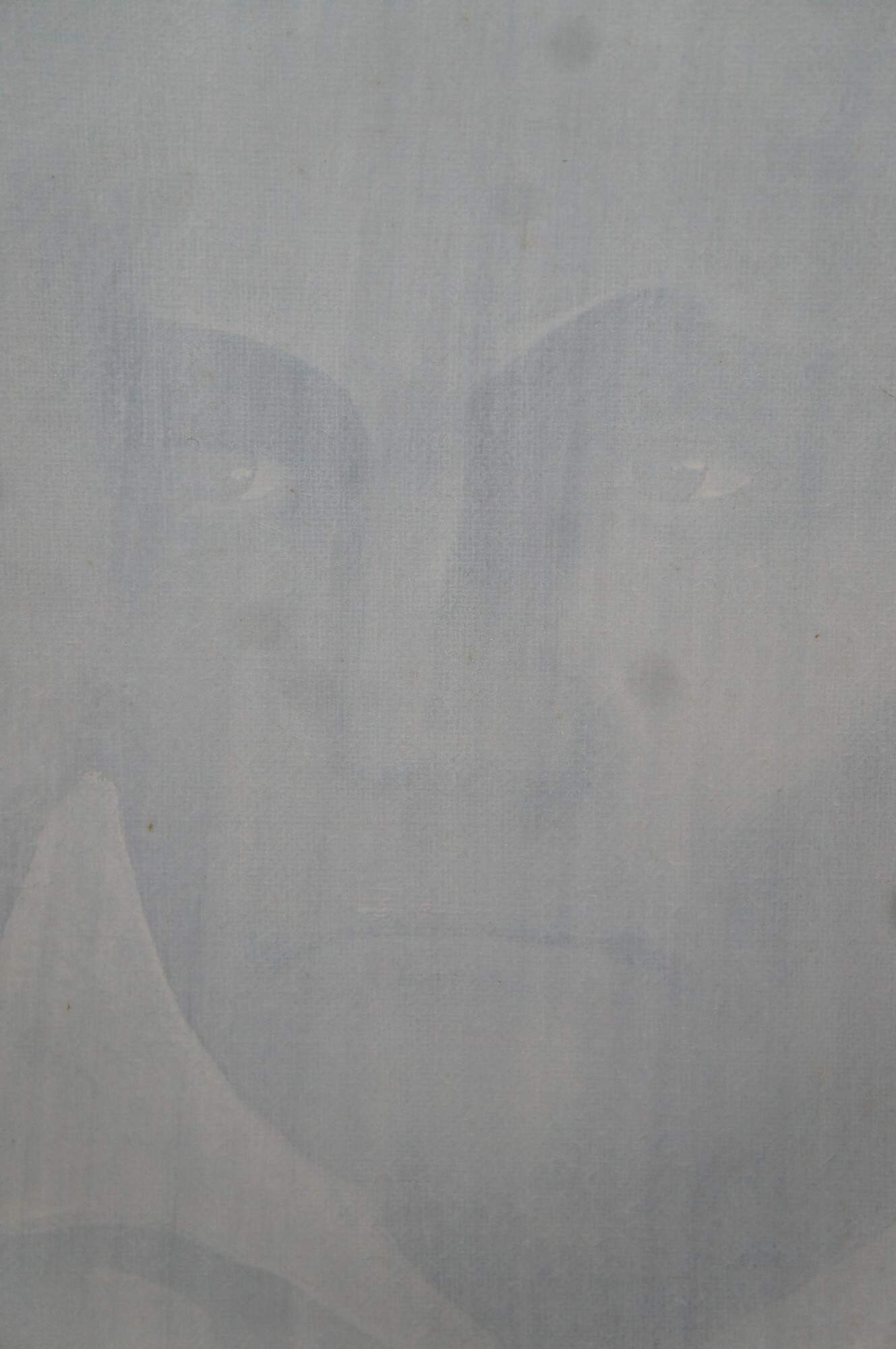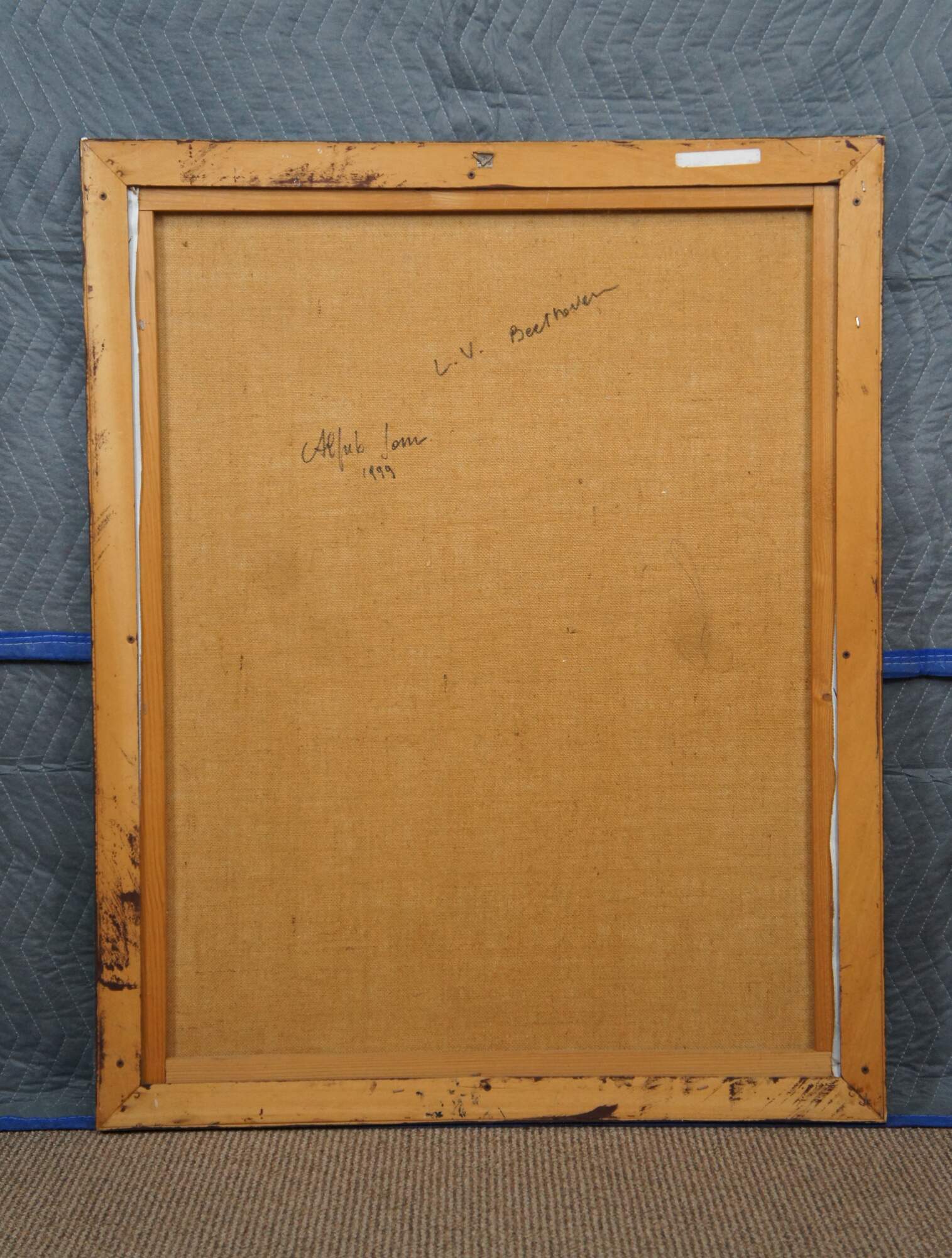 A unique modern portrait painting on burlap of Ludwig von Beethoven, with a white wash finish / overlay. Signed and dated by artist on verso.