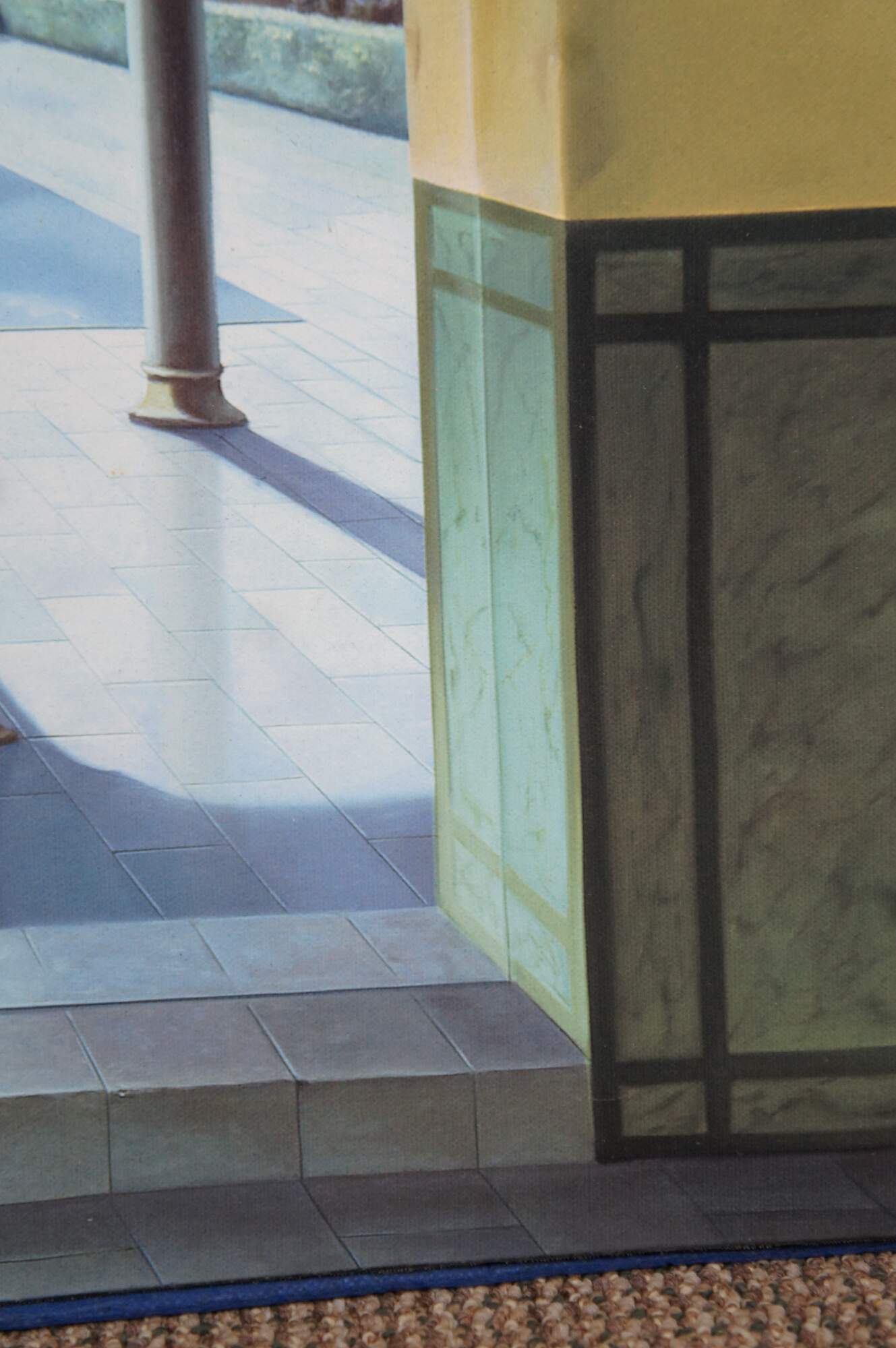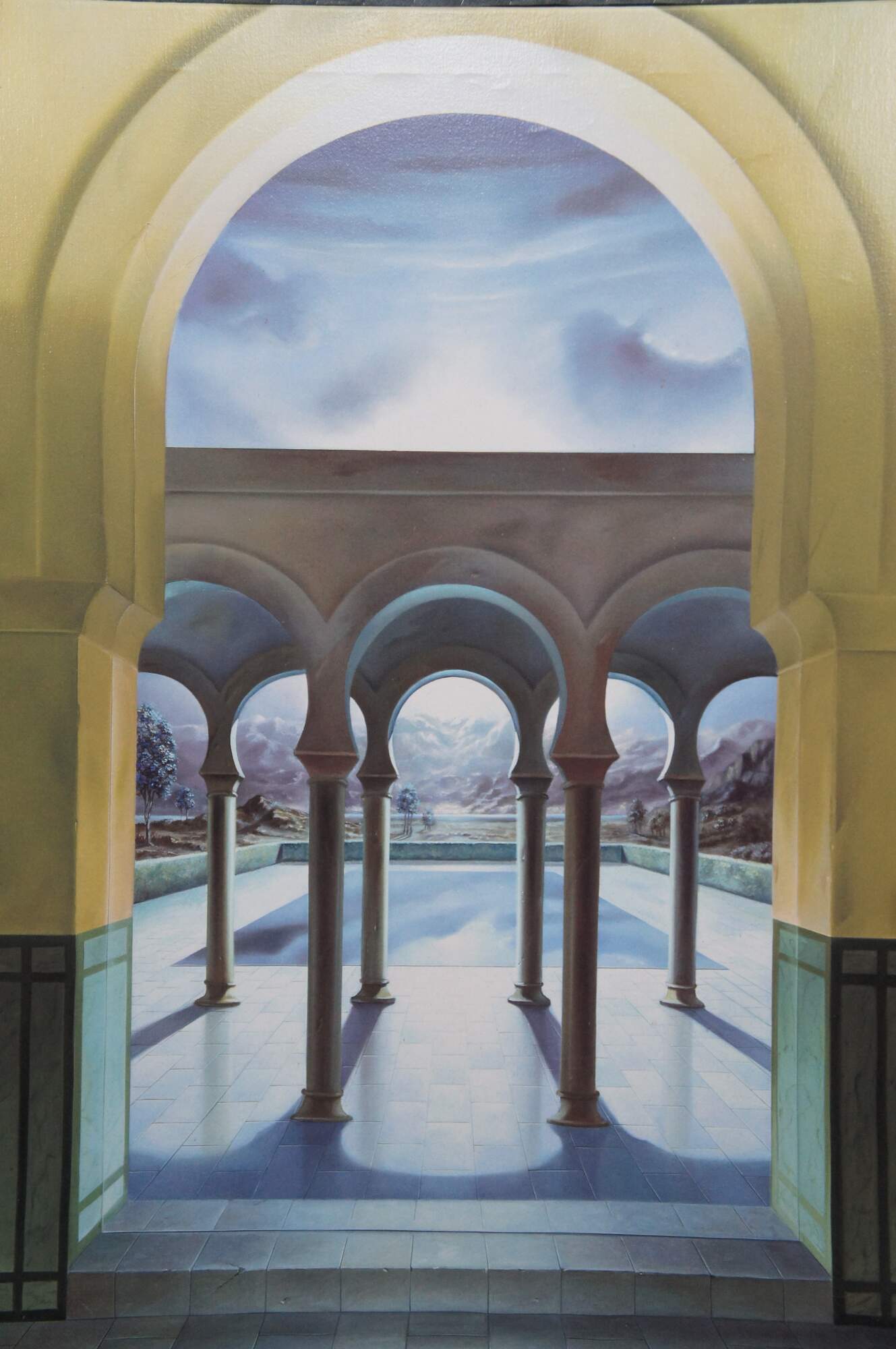 In the beginning of Aguilar's art, there were """"paintings within paintings"""" with references to classical masters. Images of works by daVinci, Titian and Manet appeared in Aguilar's series of imaginary museum-apartments with their alluring emptiness. Soon mirrored reflections began to emerge. Like Van Eyck in """"The Couple Arnolfini"""" and Velasquez in """"Las Meninas,"""" Aguilar began creating magically-complex compositions. However, Aguilar uses no props or live models in his paintings. He waits for an inspiration, a vision to appear, and then he proceeds to paint until it is complete.”""