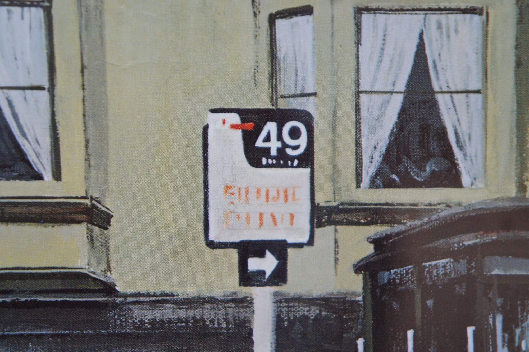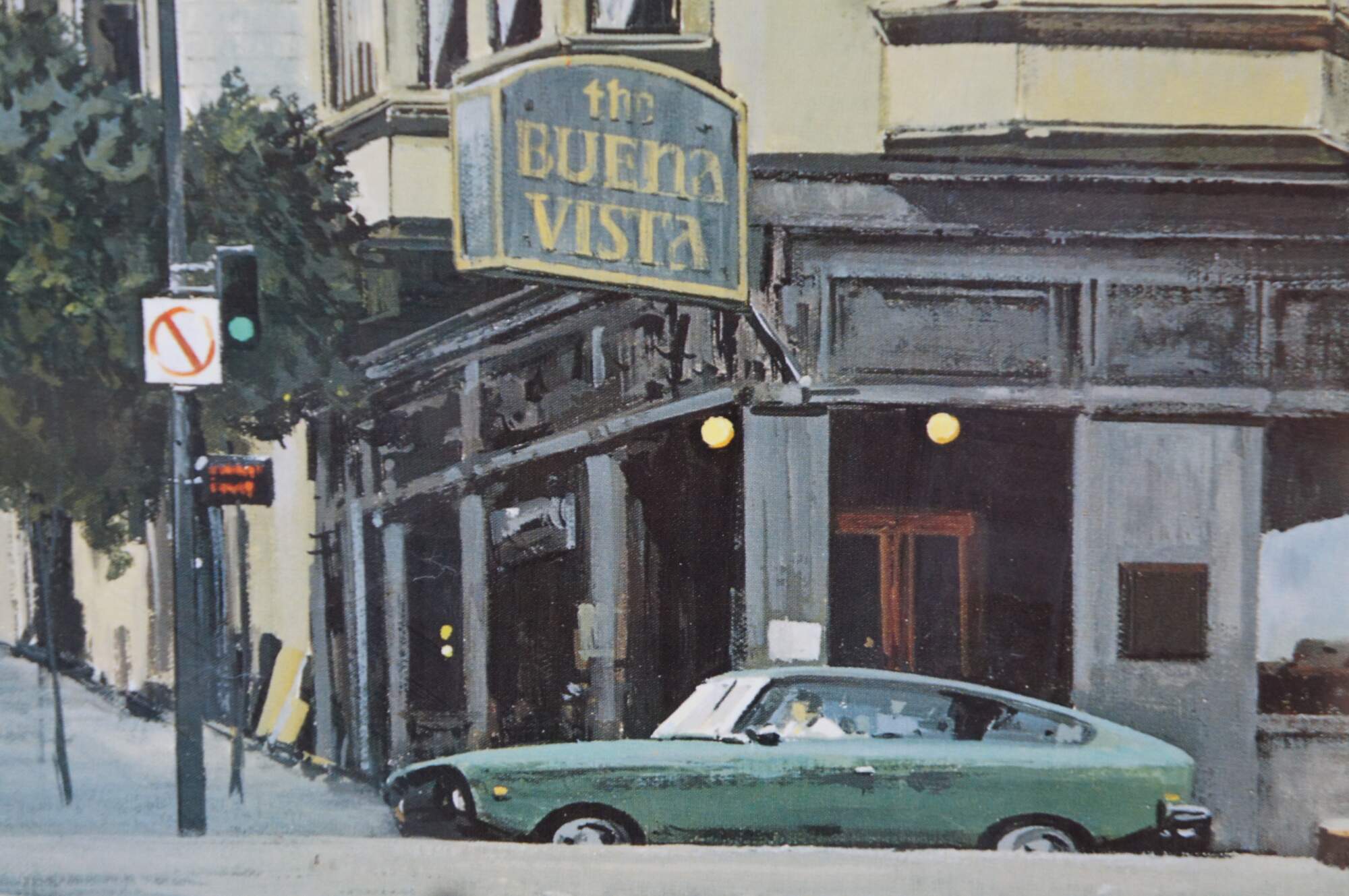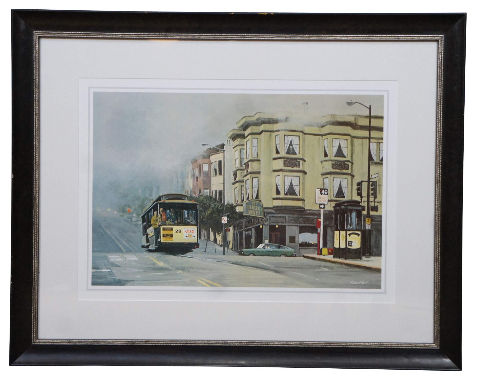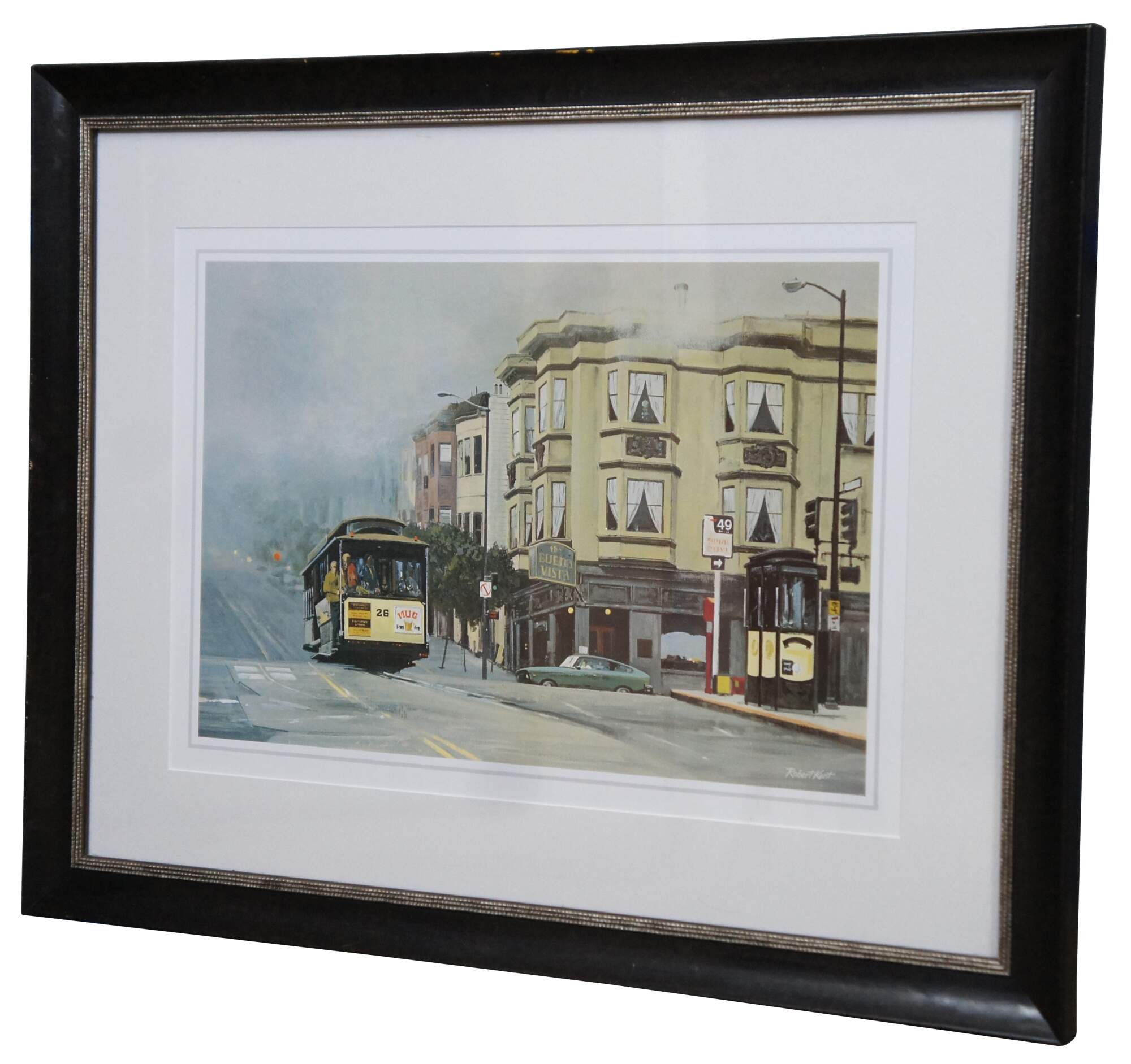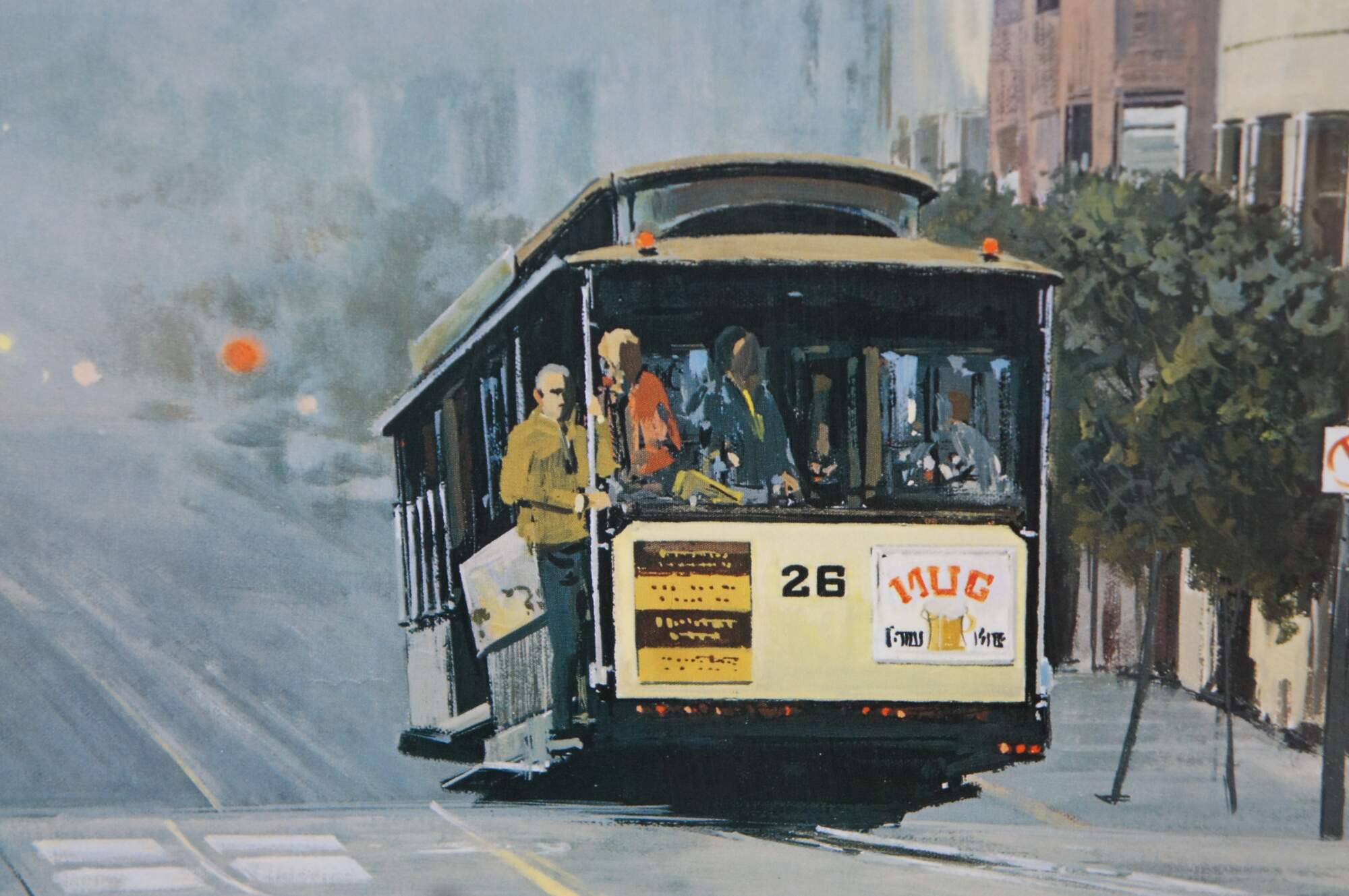 Vintage print of a work by robert Kent titled “San Francisco Cable Car in Fog” featuring the iconic Buena Vista restaurant.