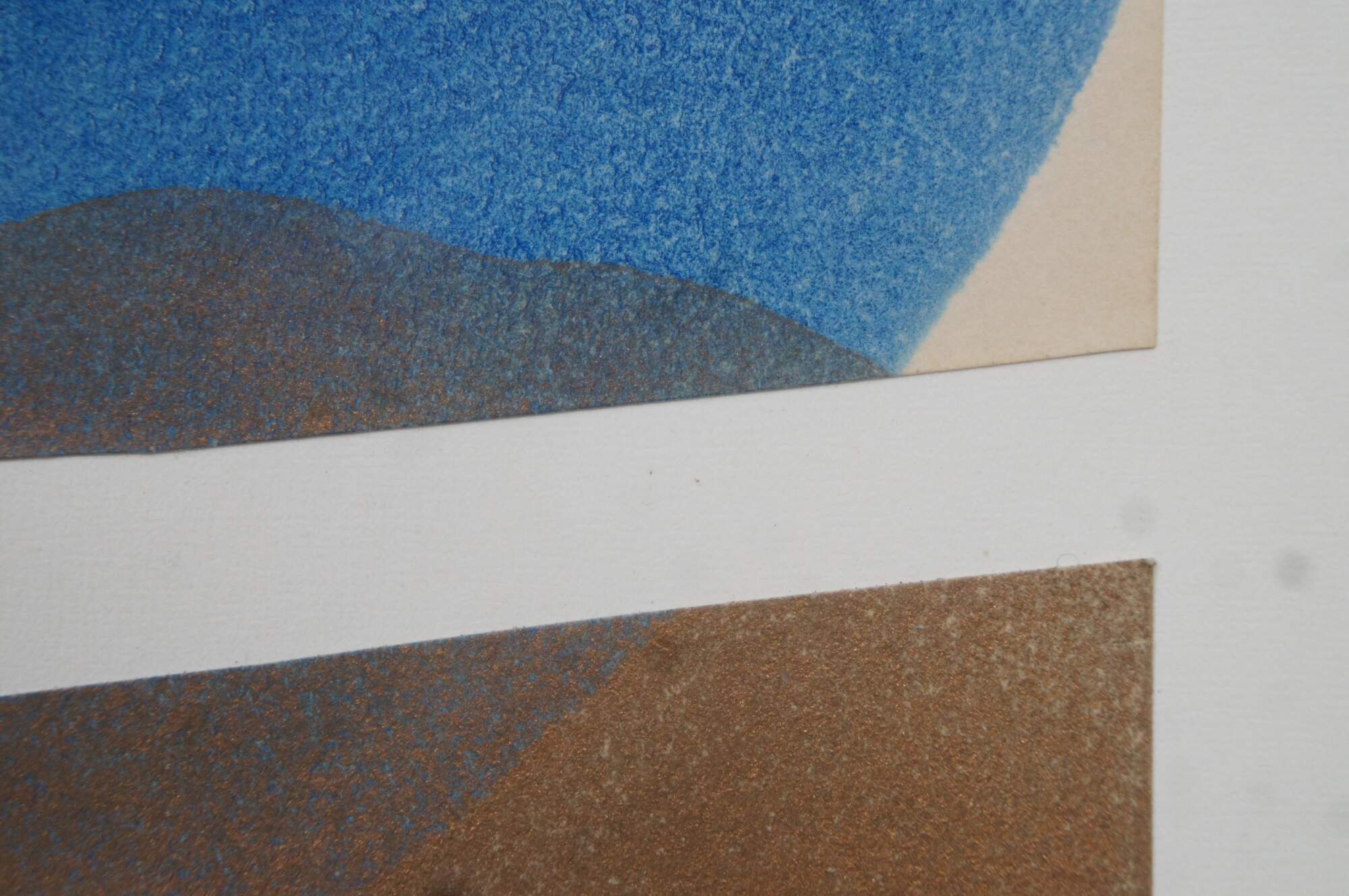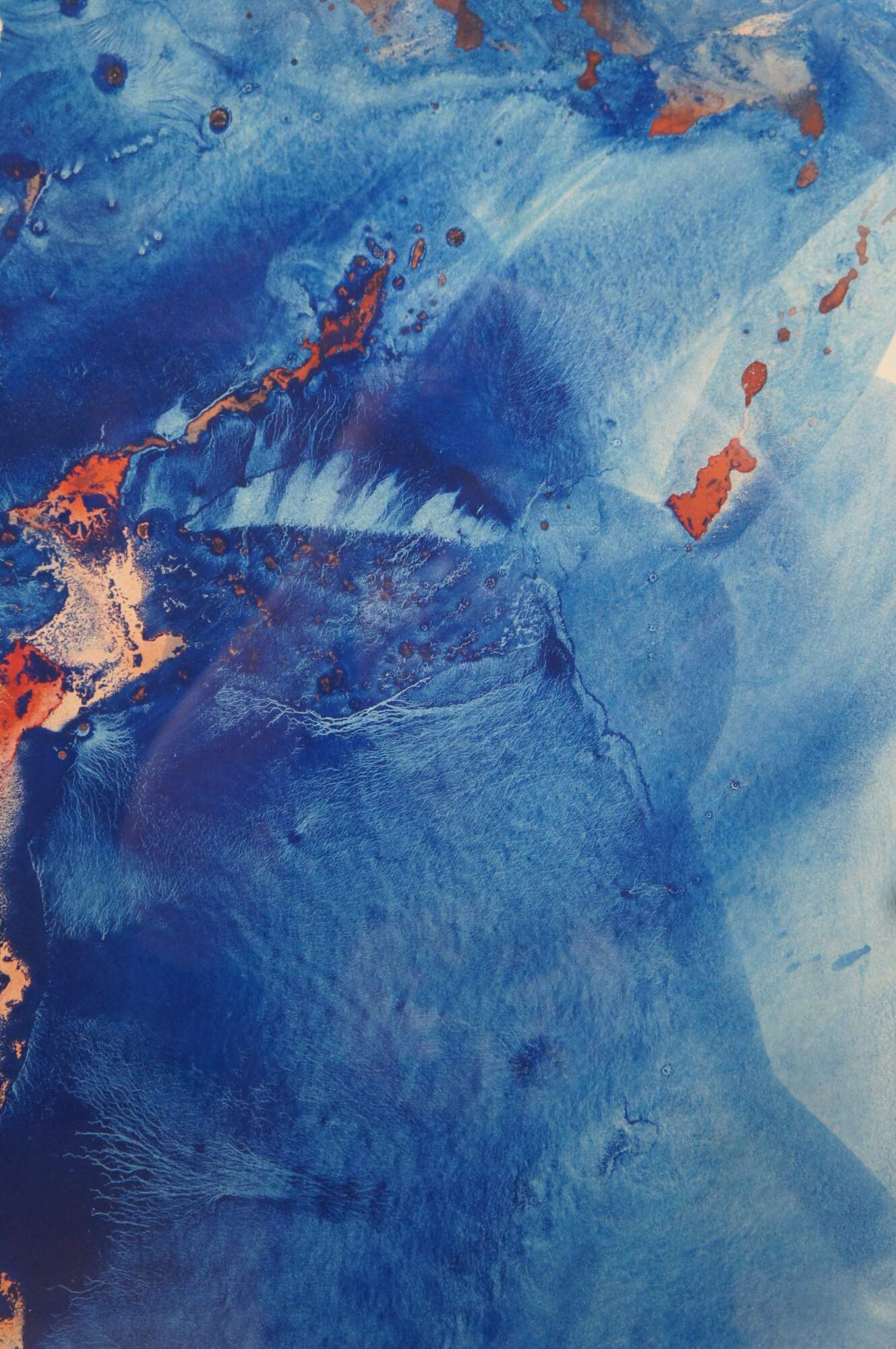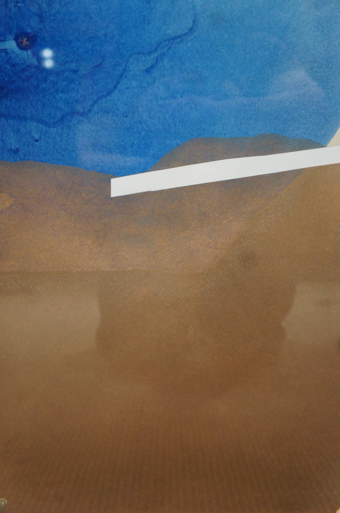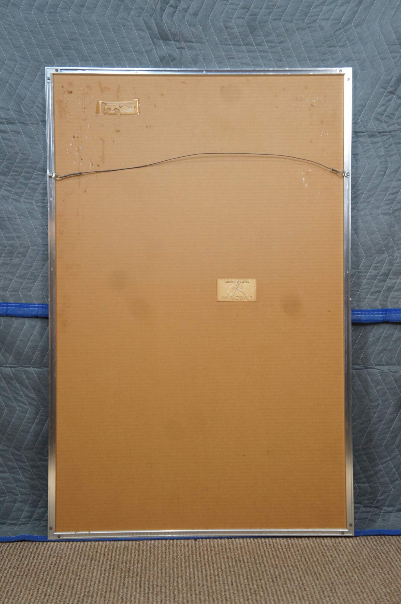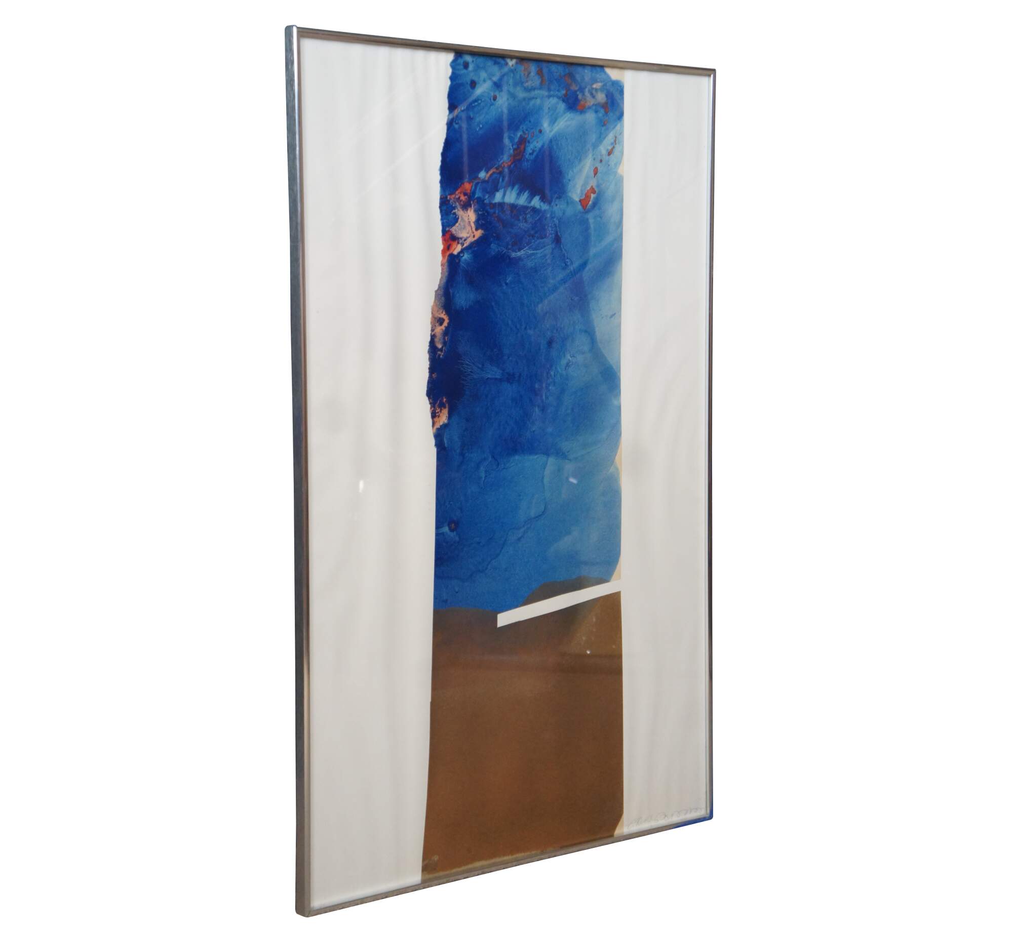 Vintage 1970s-1990s abstract watercolor painting by Gordon R. Richardson featuring flowing blues over brown with splotches of peach/red on a column of torn paper. Pencil signed lower right corner. Part of Richardson’s series inspired by Cape Hatteras, this piece was once included in the Dayton Art Institute’s Circulating Gallery. Titled on label: “Hatteras [something] – Series (Bridges [?])”