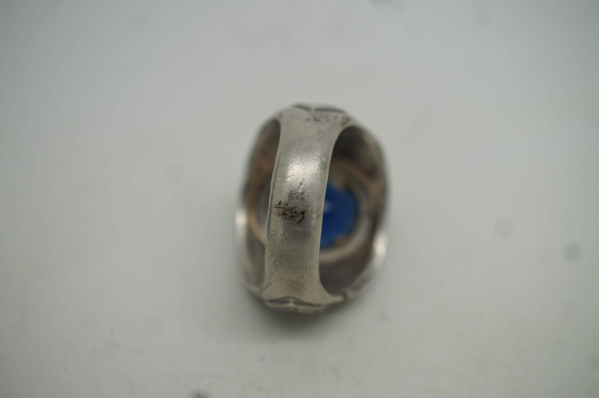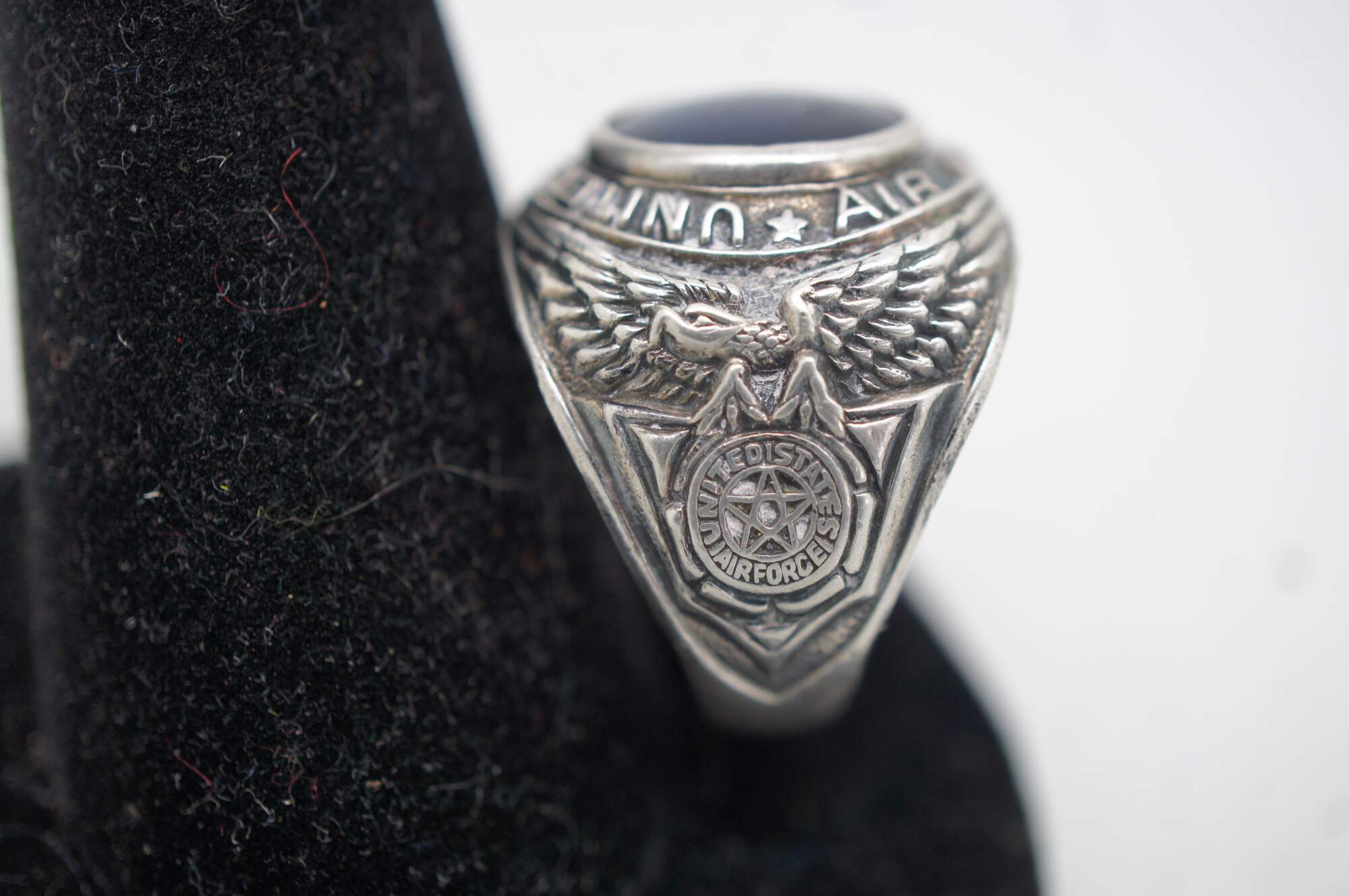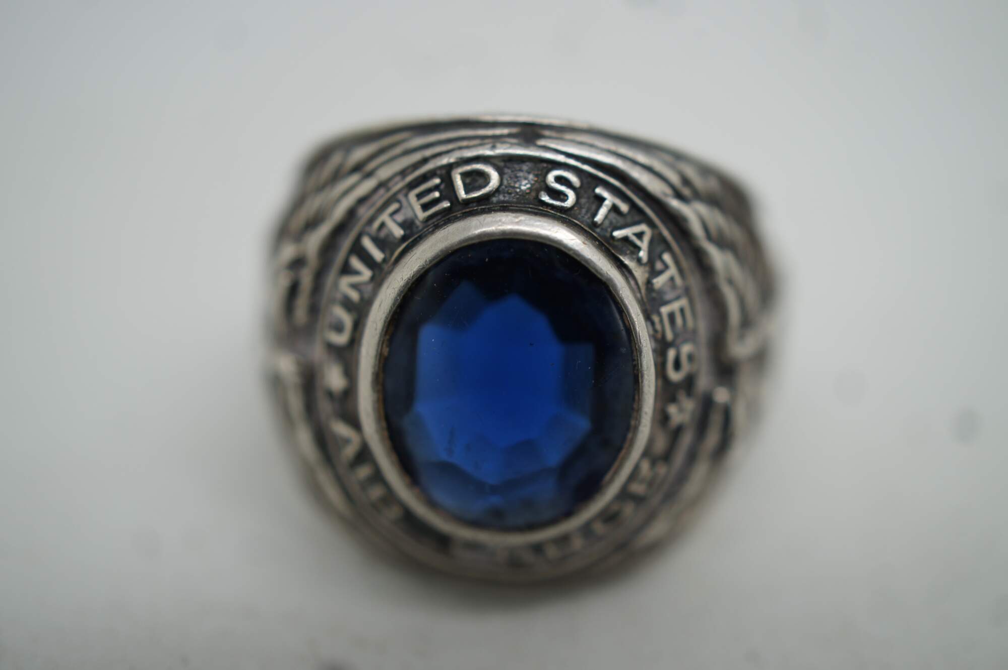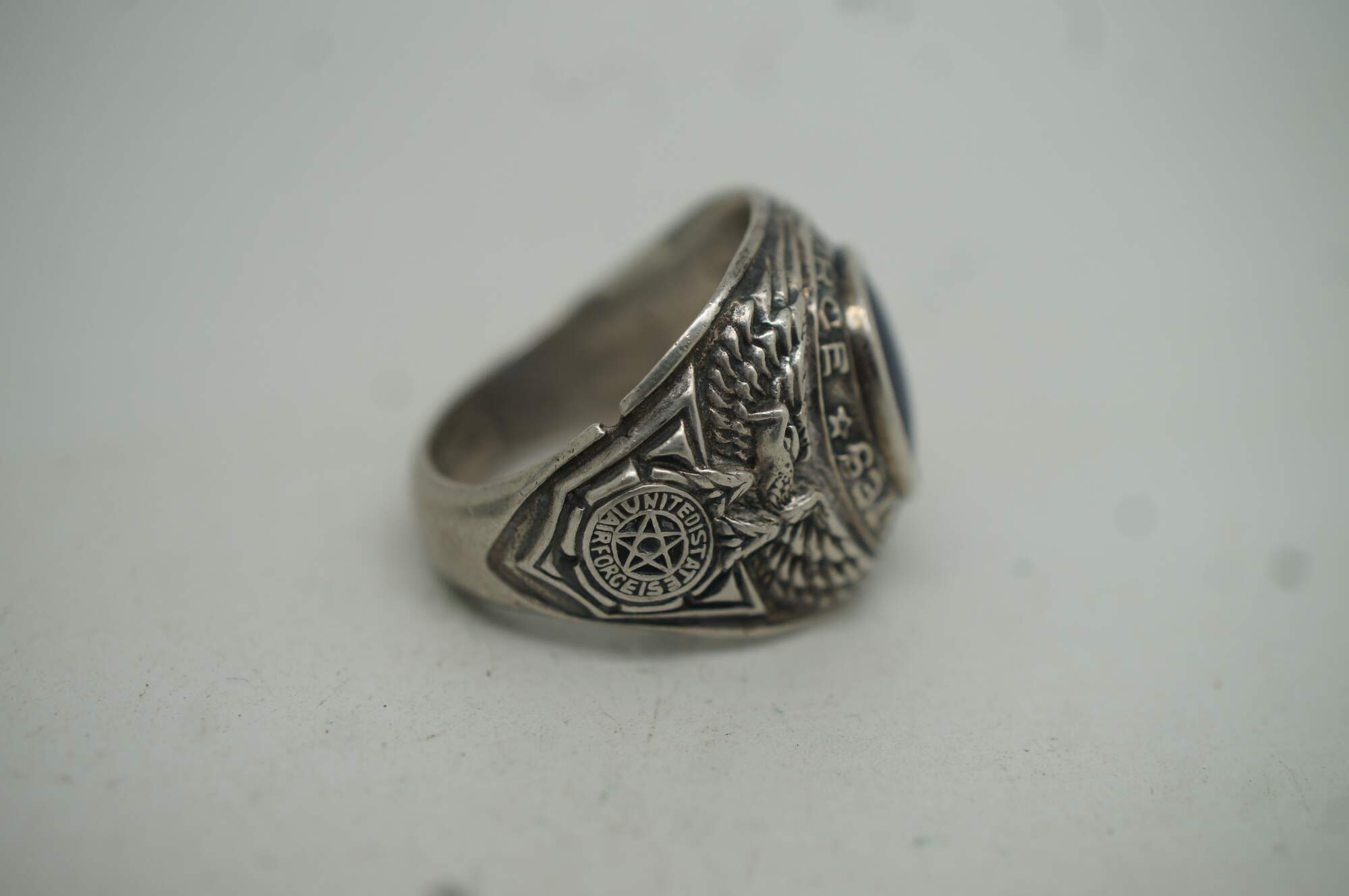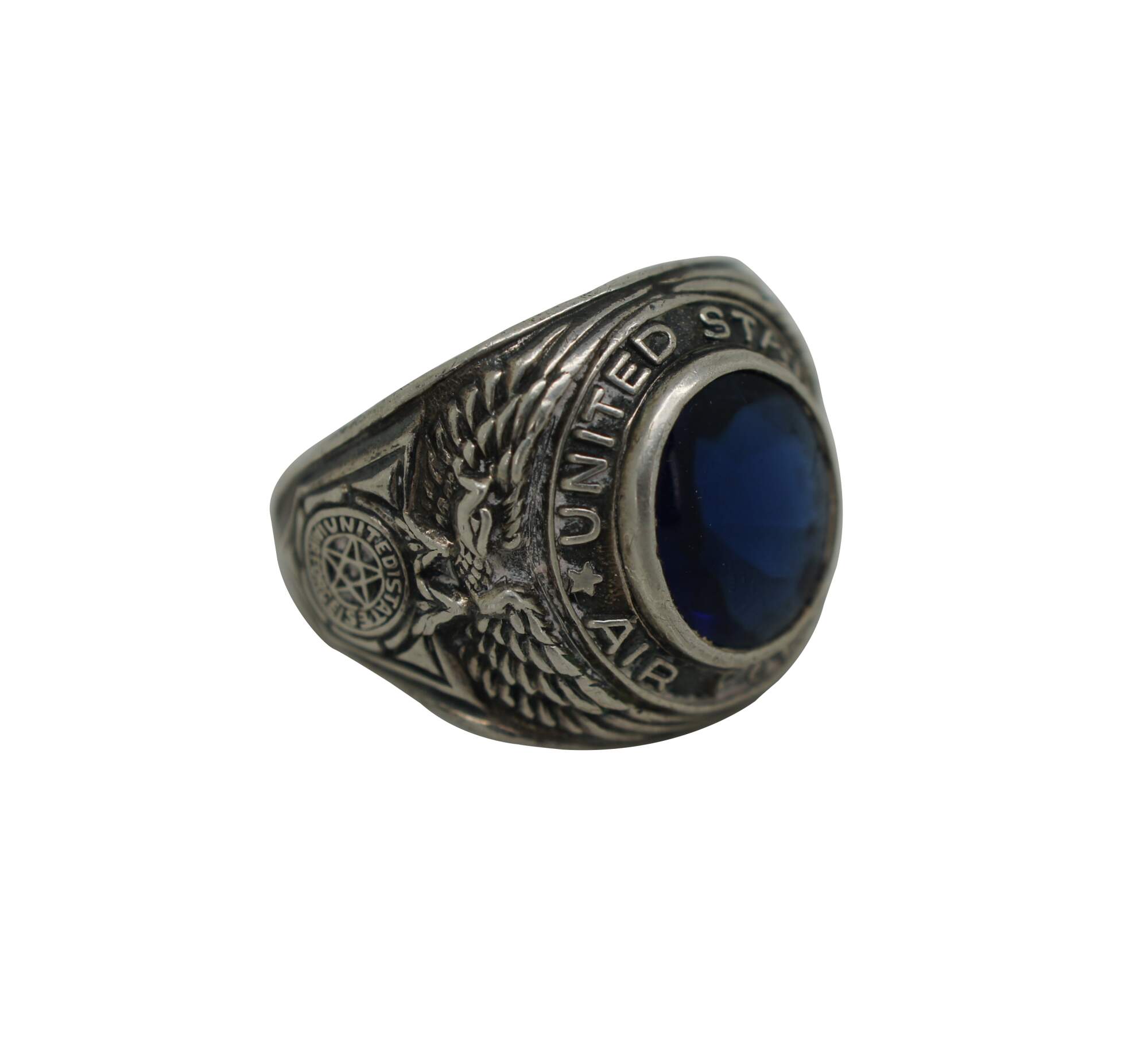 Vintage USAF sterling silver ring with round blue rhinestone, ringed by the words “United States Air Force;” both sides of the band feature an eagle with wings spread over a shield containing, again the words “United States air Force,” surrounding a five pointed star. Crafted by the Uncas Manufacturing Co.