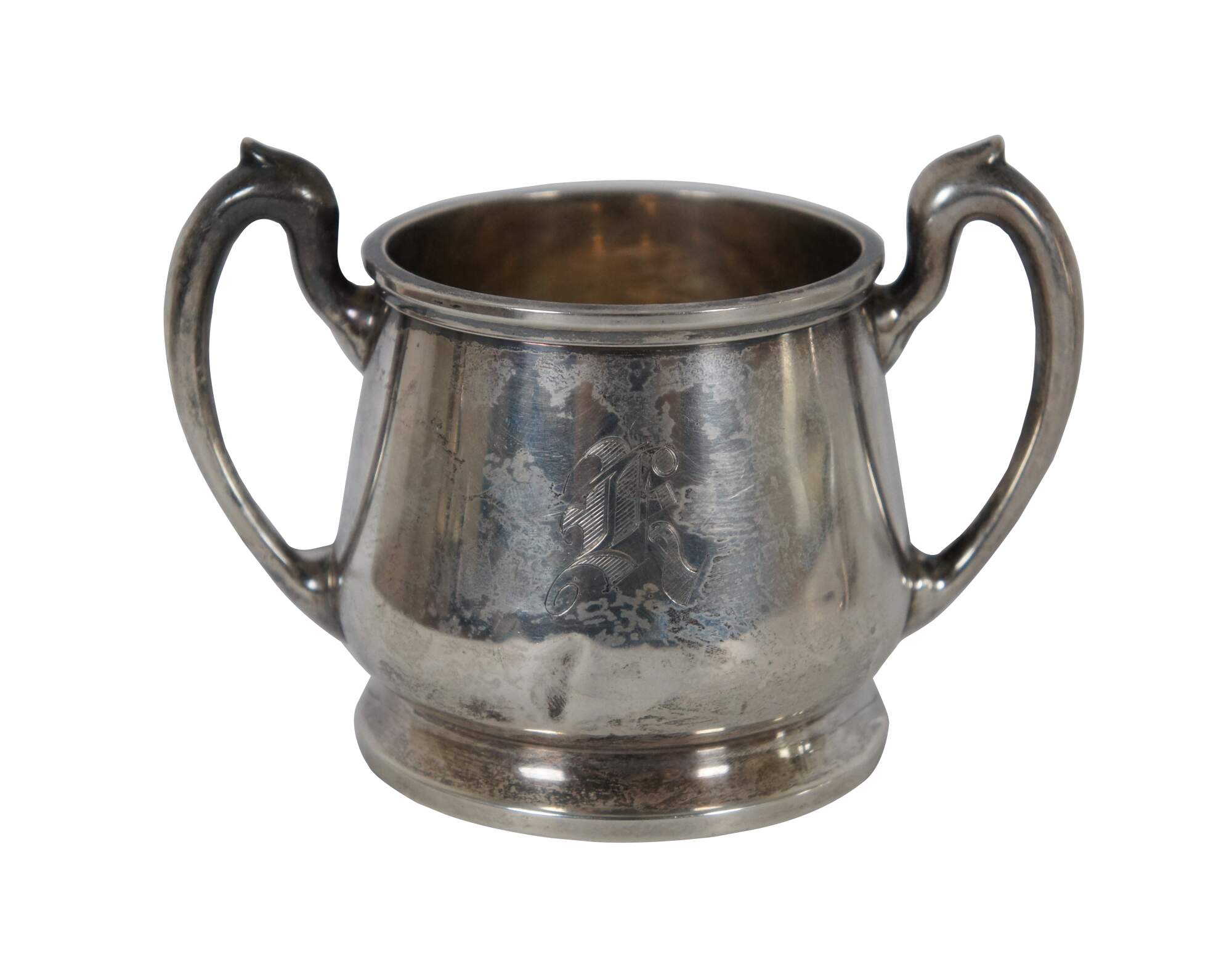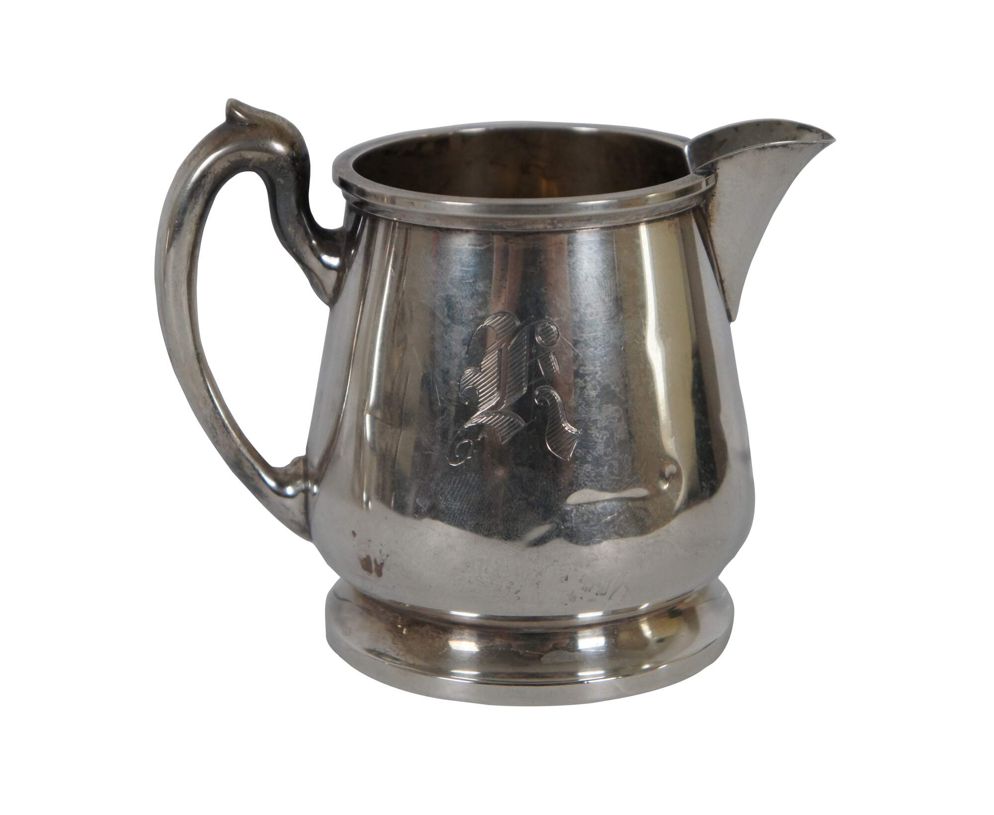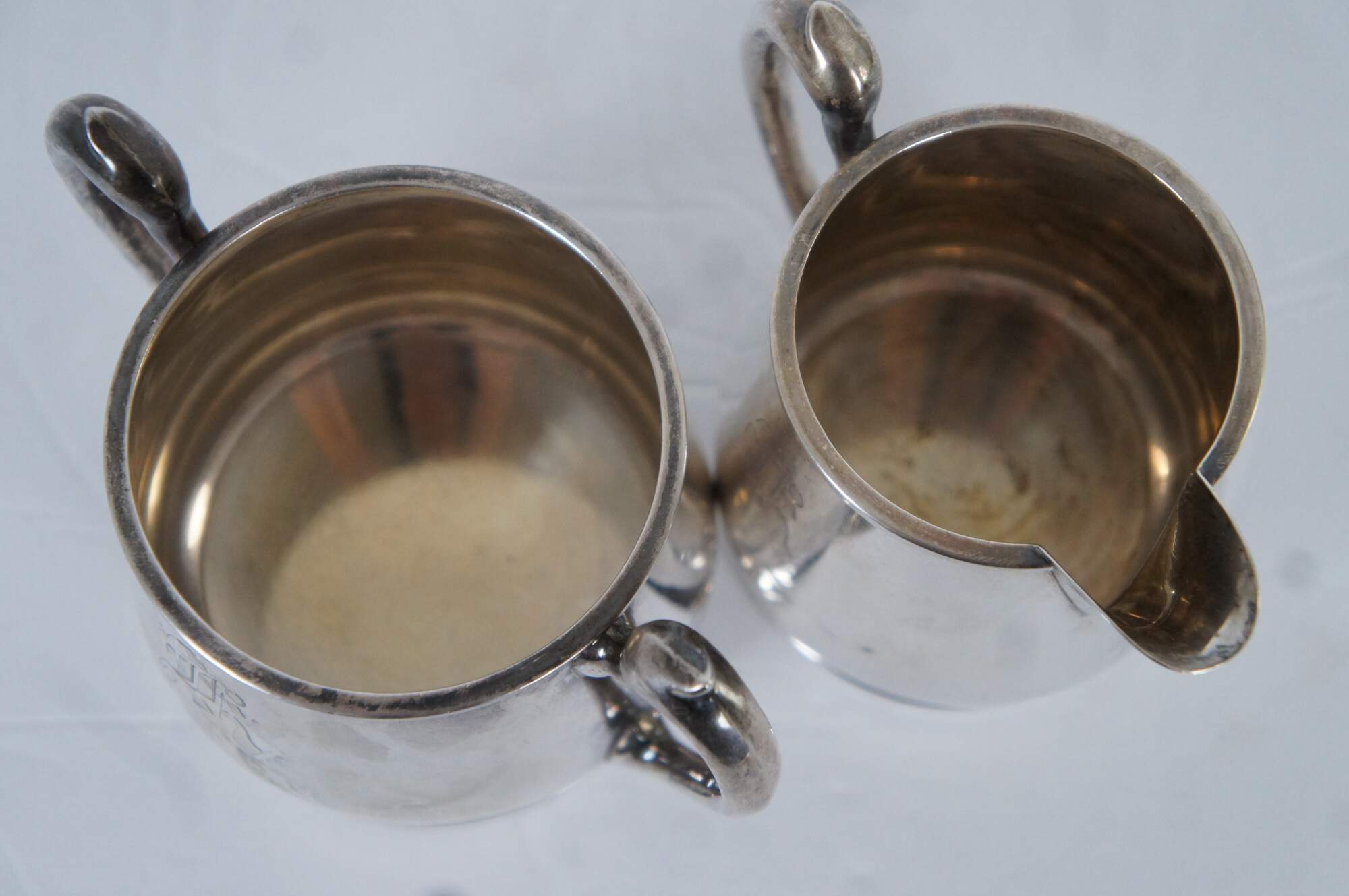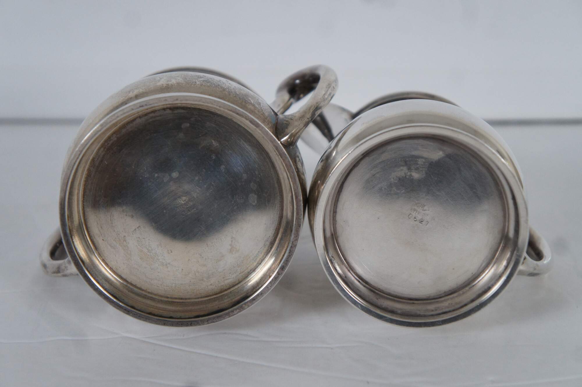 Mid 20th century Mueck-Carey Co number 0521 sterling silver creamer / cream pitcher and sugar bowl. Monogrammed with the letter R.