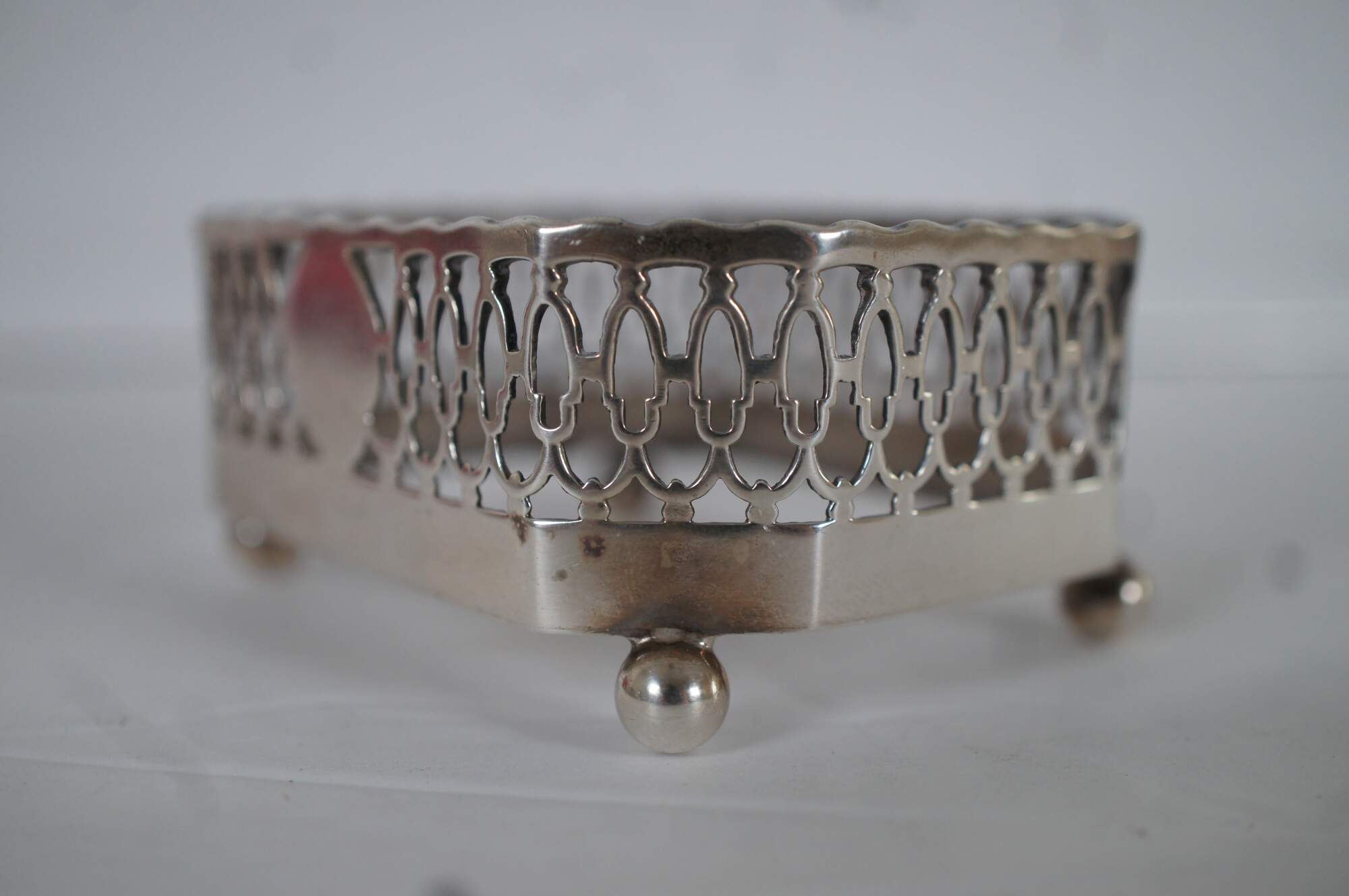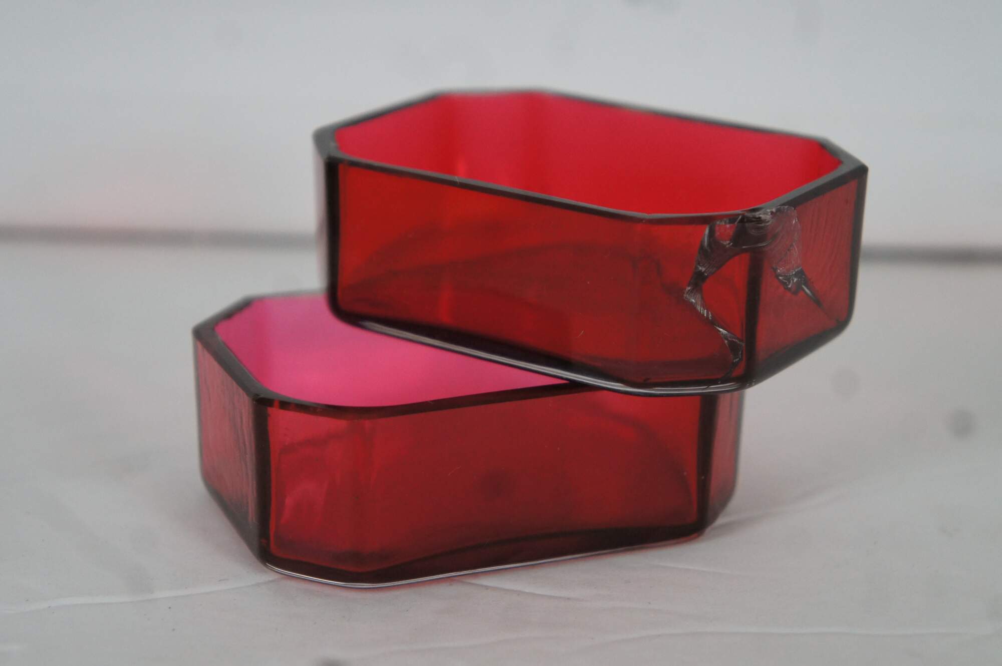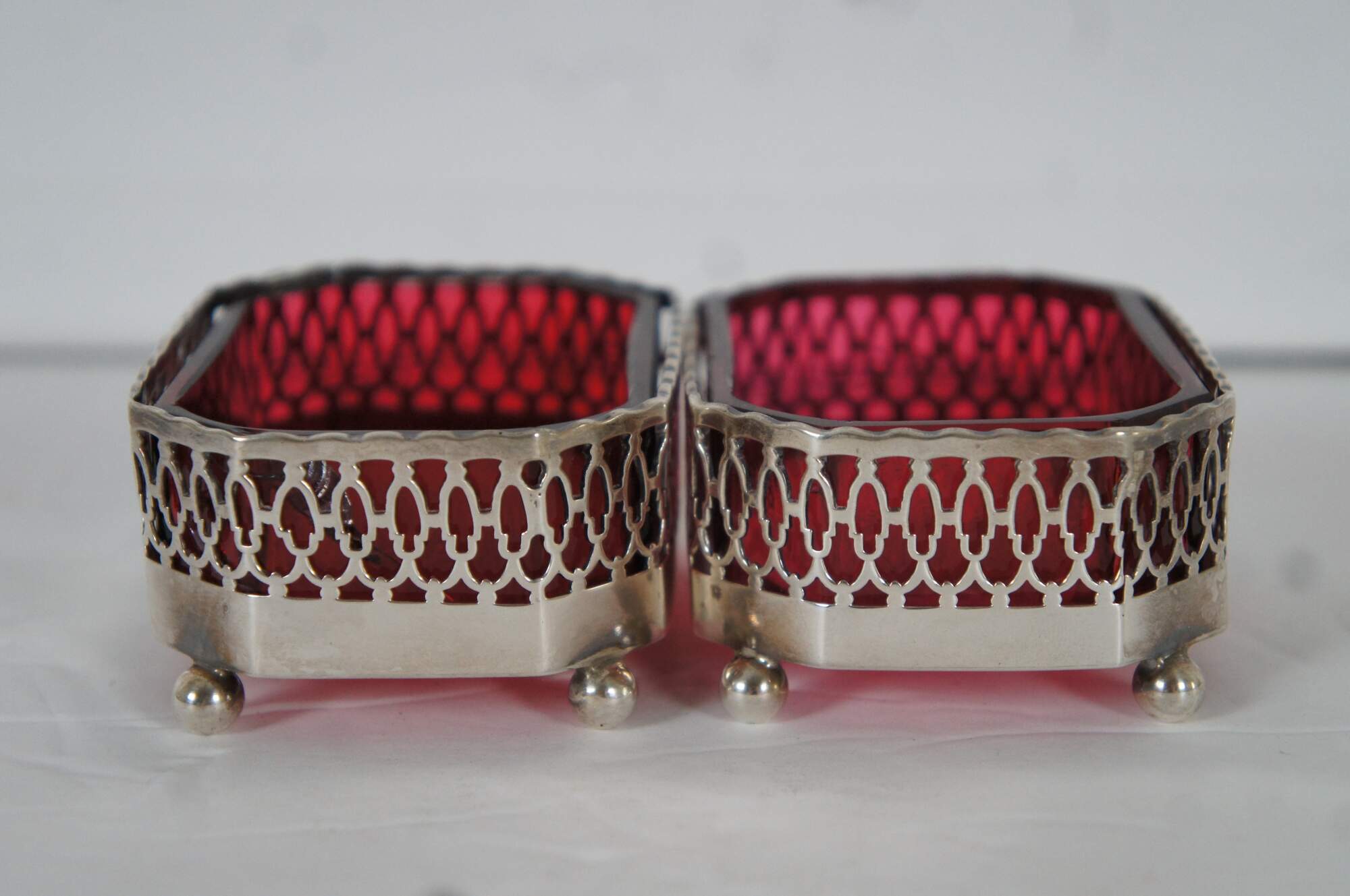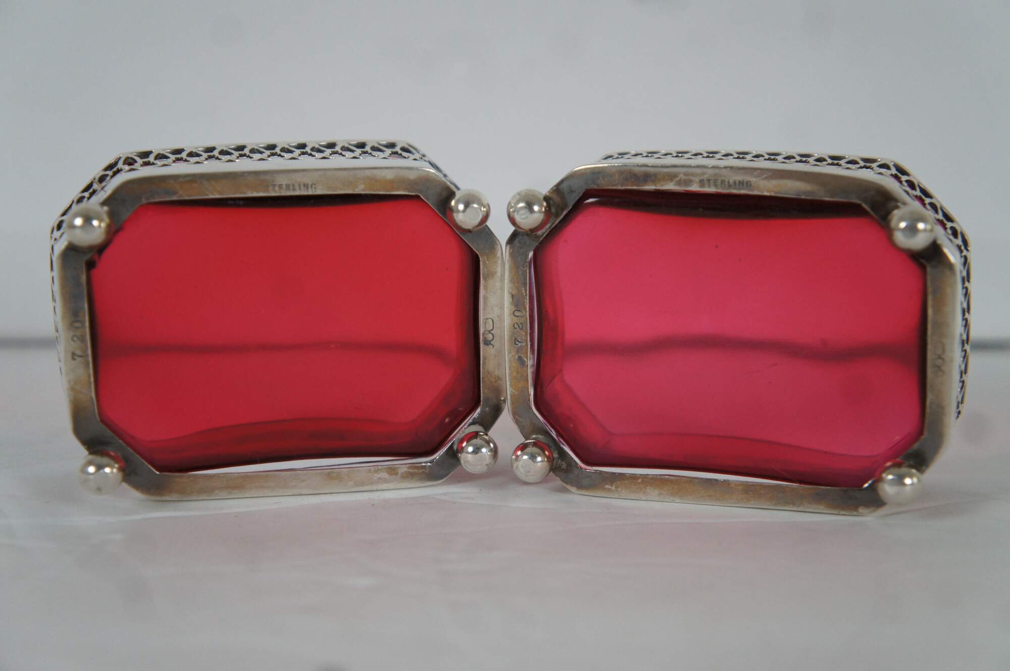 Pair of antique Dominick & Haff number 720 cranberry / ruby glass and sterling silver overlay nut / bonbon dishes, featuring a cut corner rectangular shape with pierces sides and ball feet. No monogram.