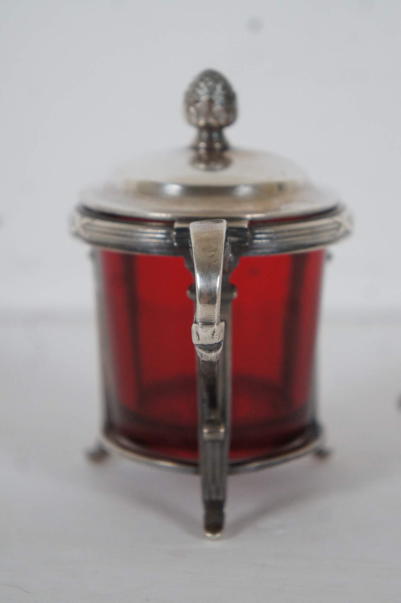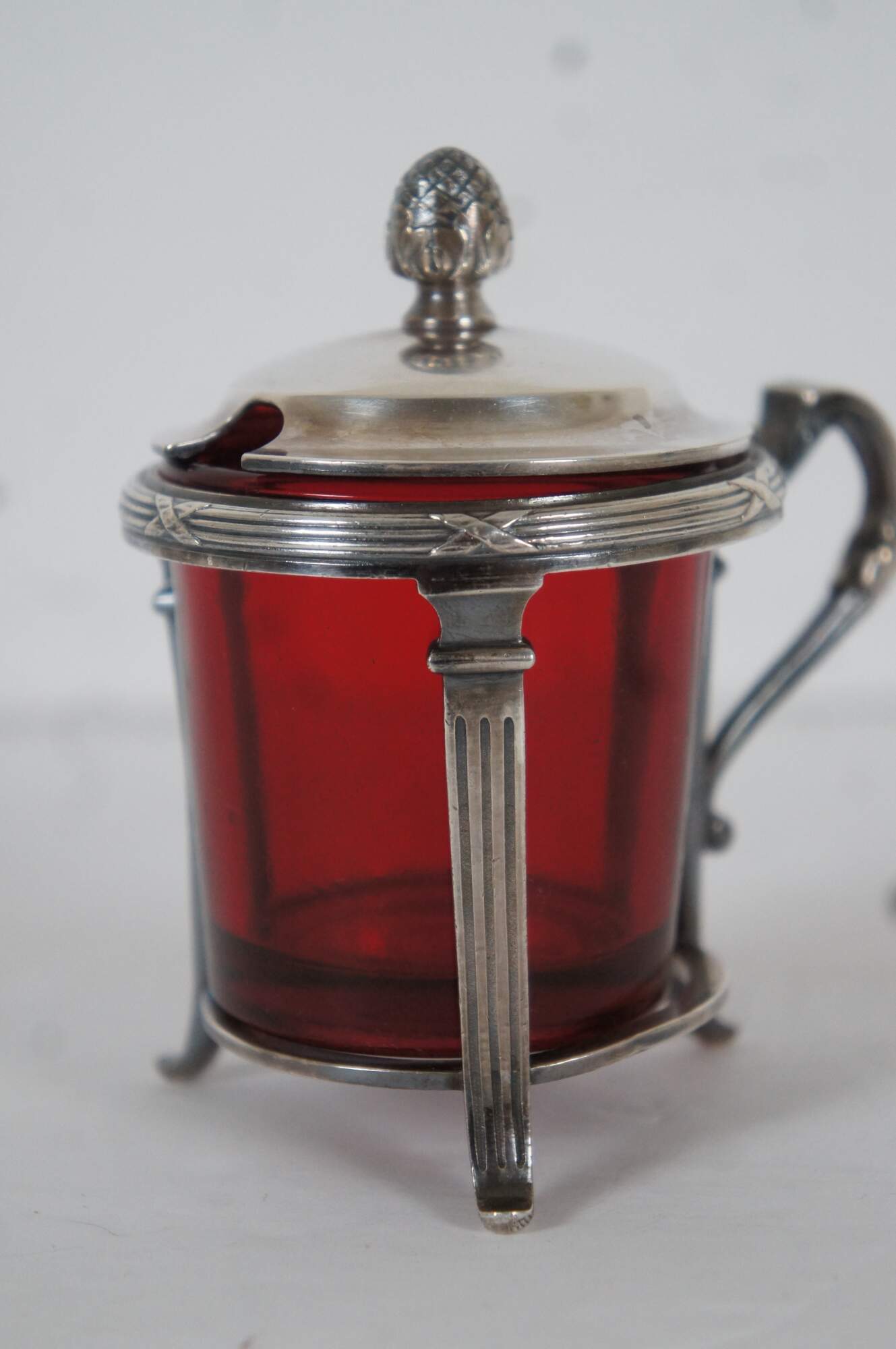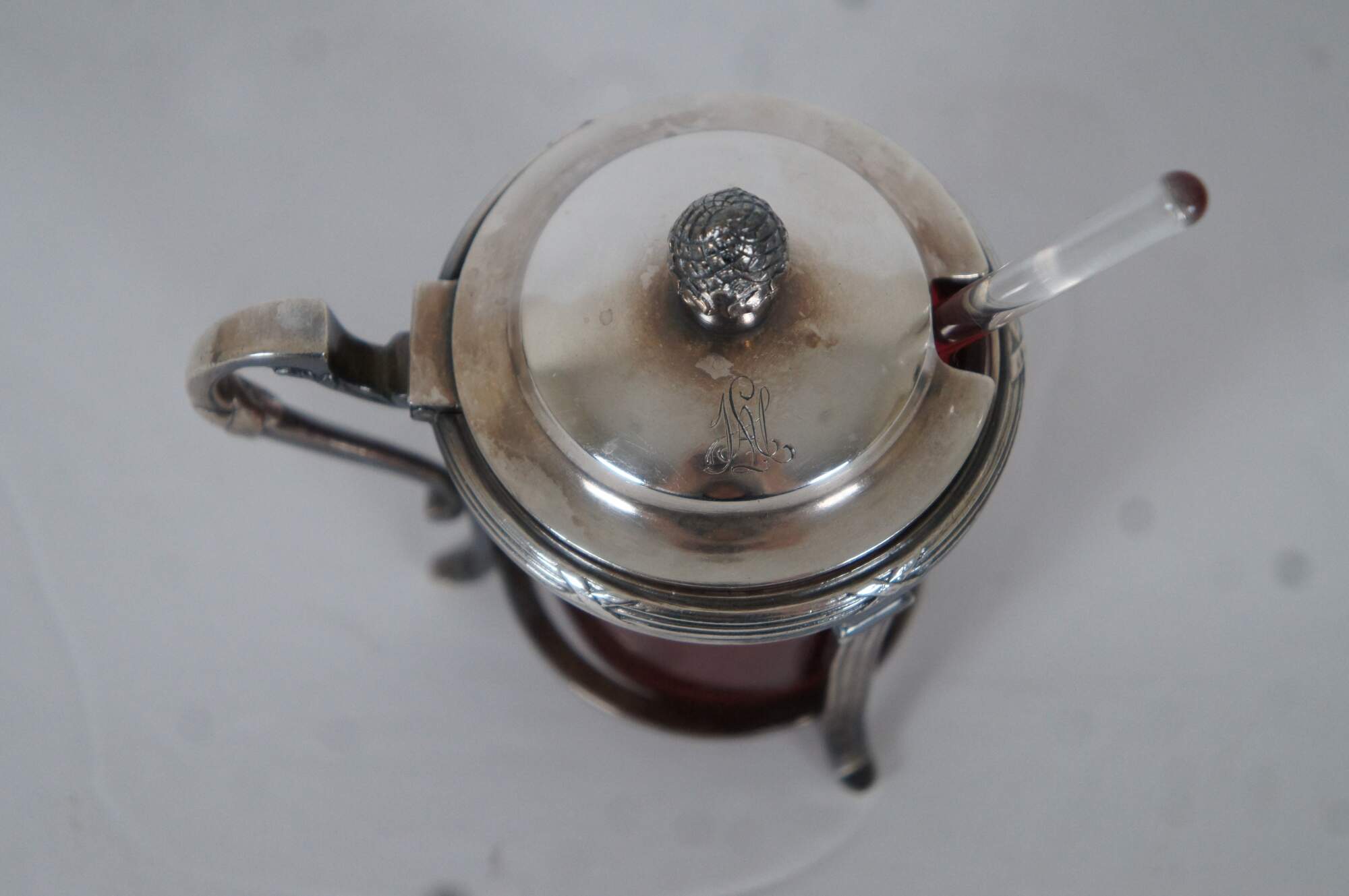 Antique Christofle number 2514567 sterling silver lidded jam / mustard / condiment pot with ruby/ cranberry glass insert and clear glass spoon. Handled overlay features a simple neoclassical column design and pine cone / pineapple (?) finial on the lid. Monogrammed with the initials HAL.
