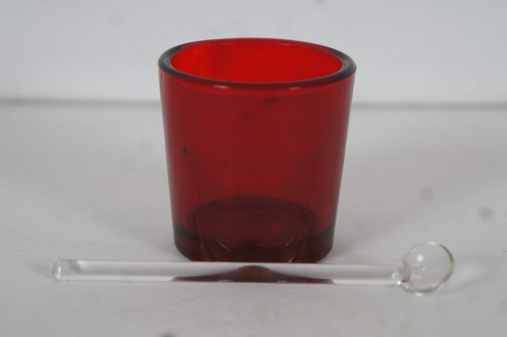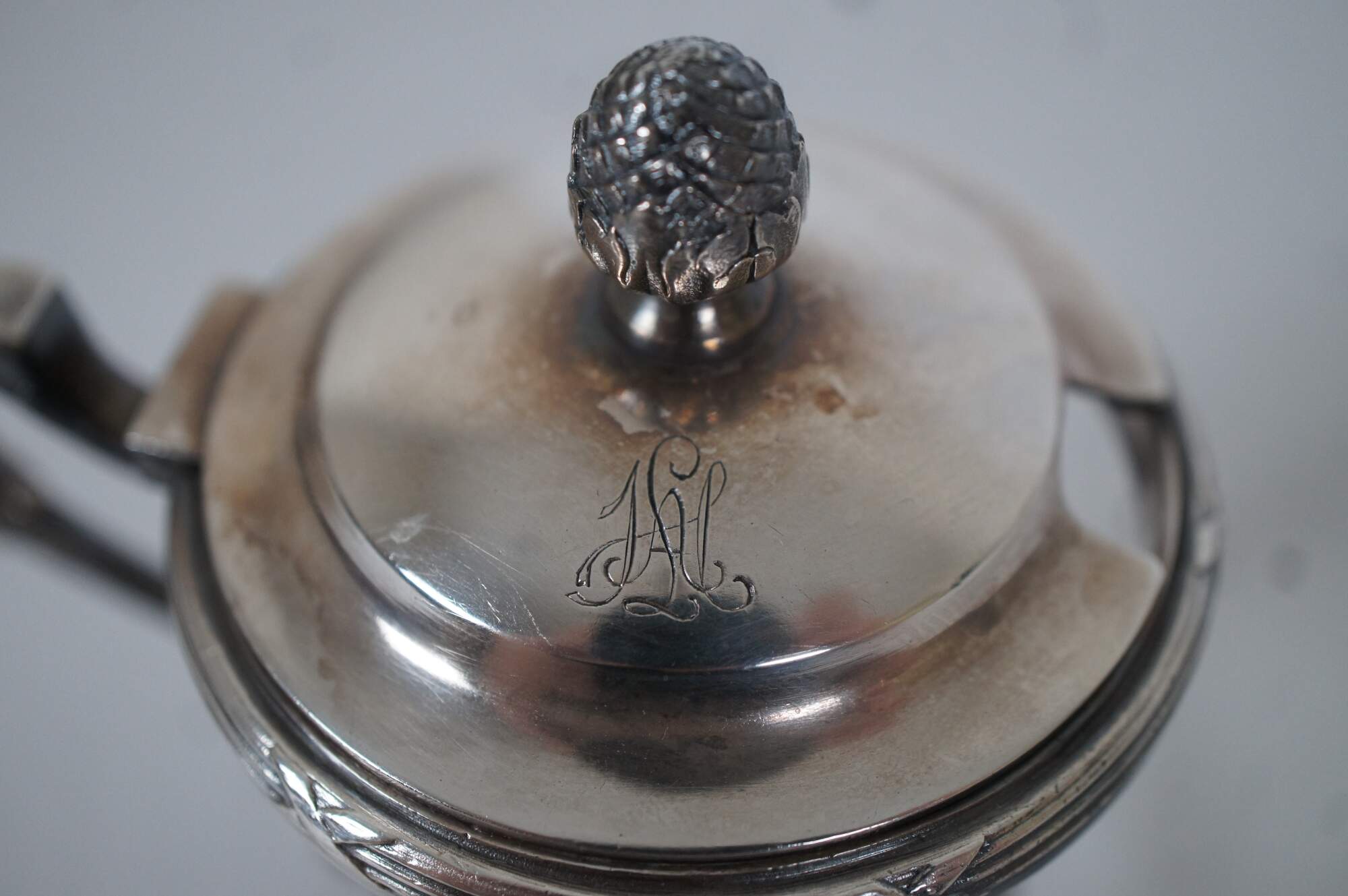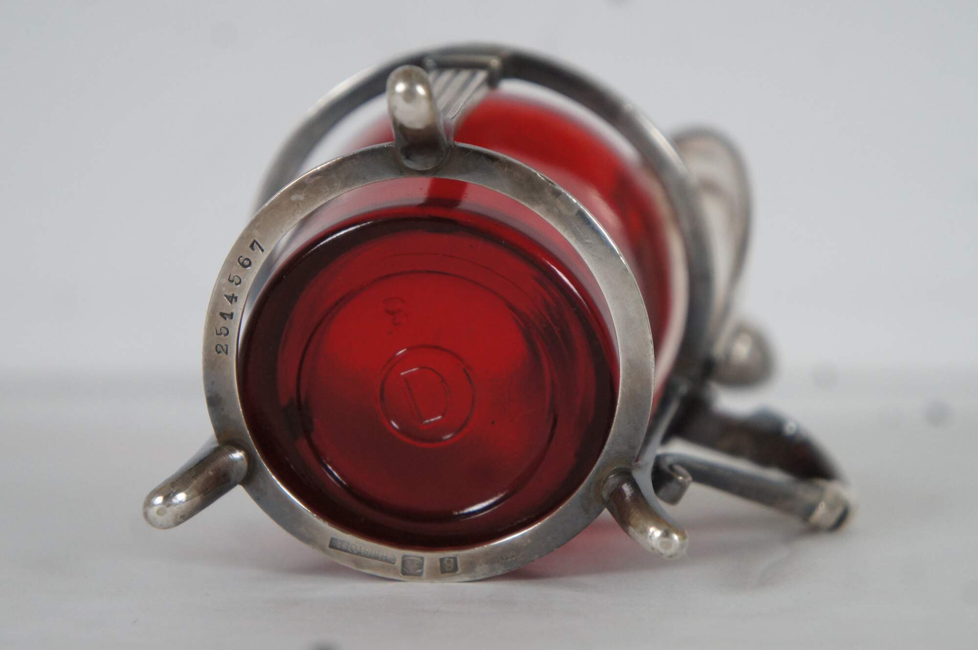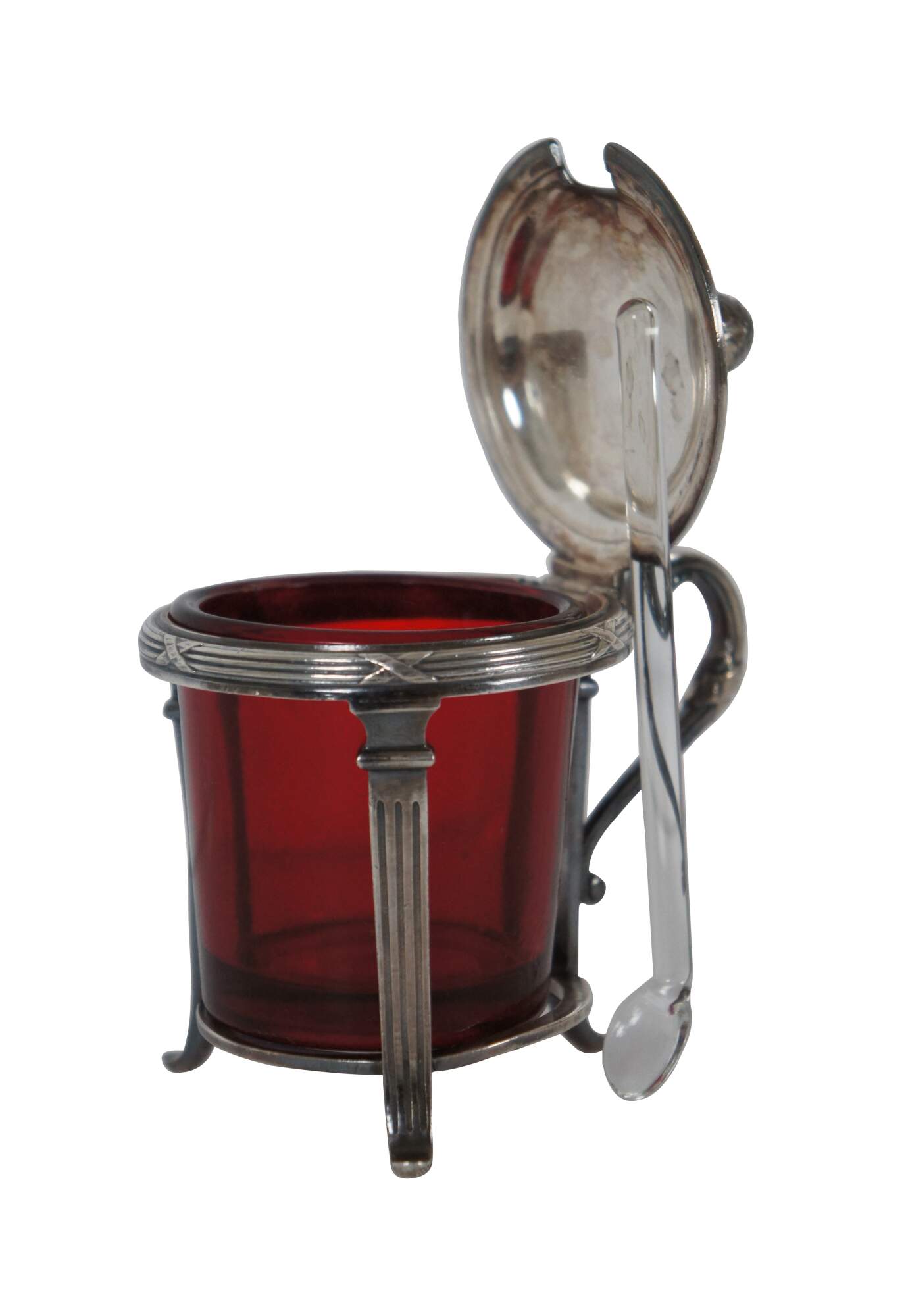 Antique Christofle number 2514567 sterling silver lidded jam / mustard / condiment pot with ruby/ cranberry glass insert and clear glass spoon. Handled overlay features a simple neoclassical column design and pine cone / pineapple (?) finial on the lid. Monogrammed with the initials HAL.