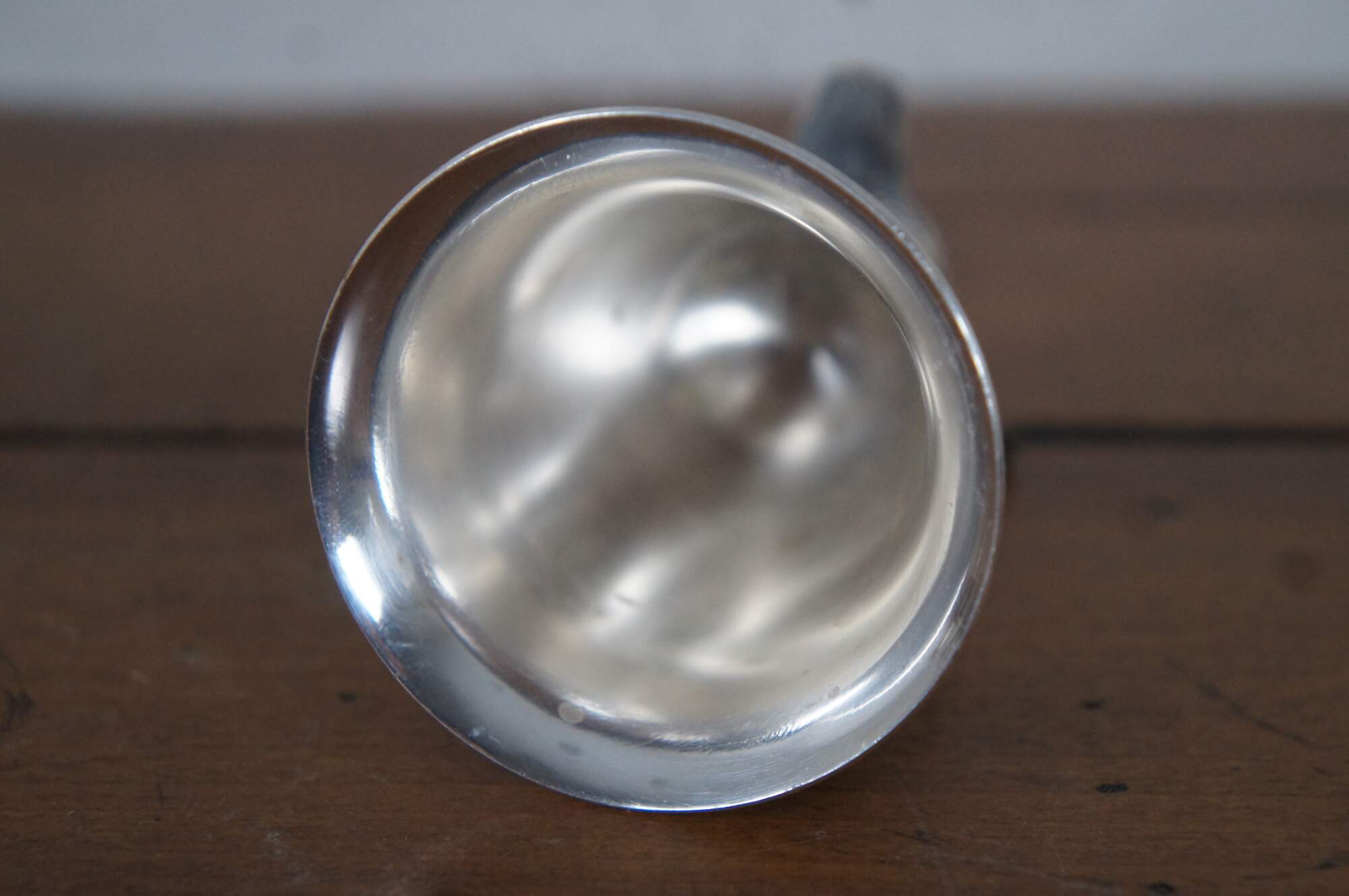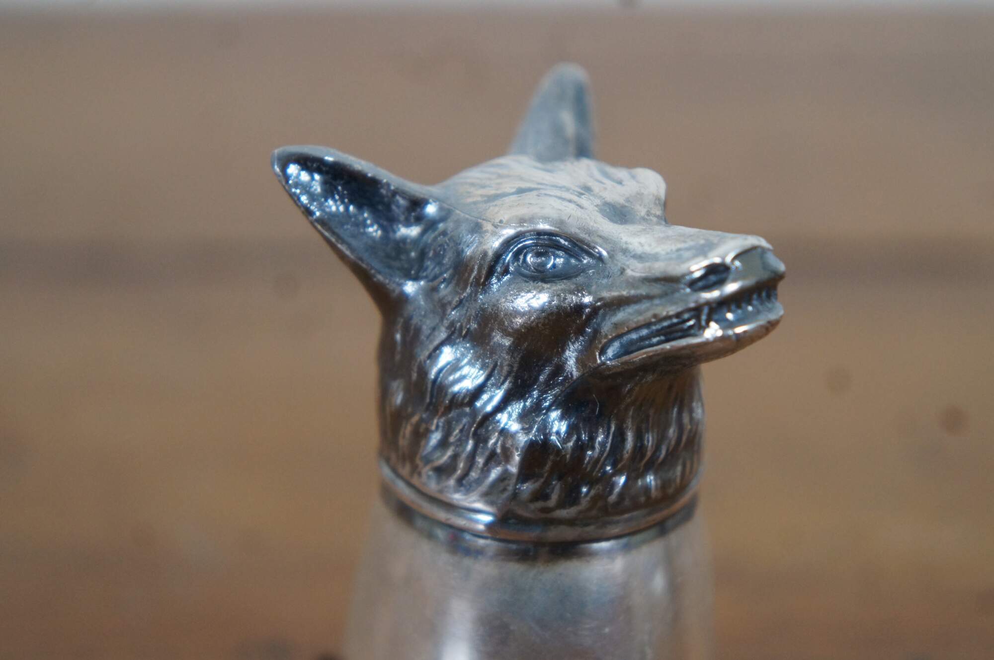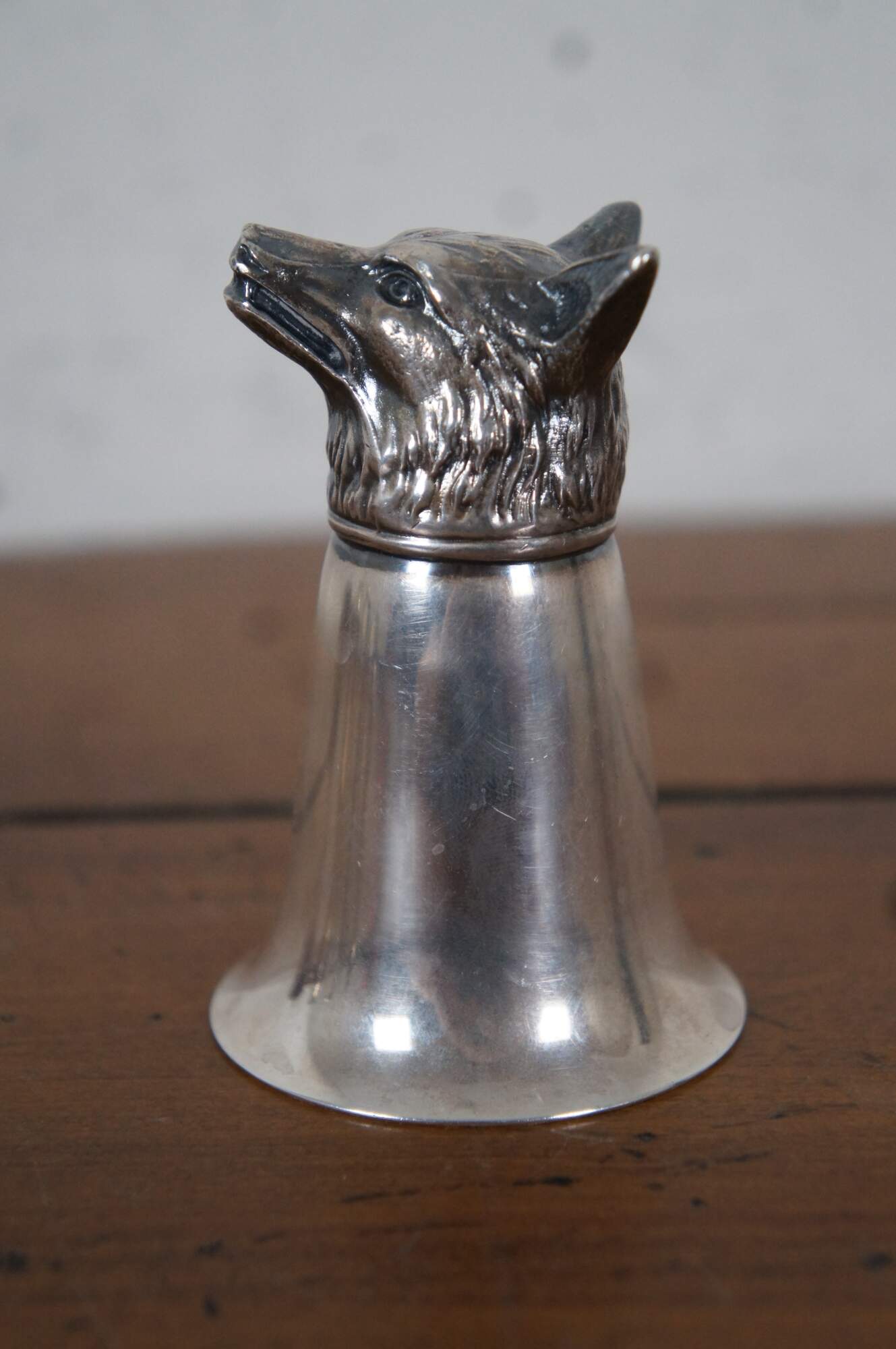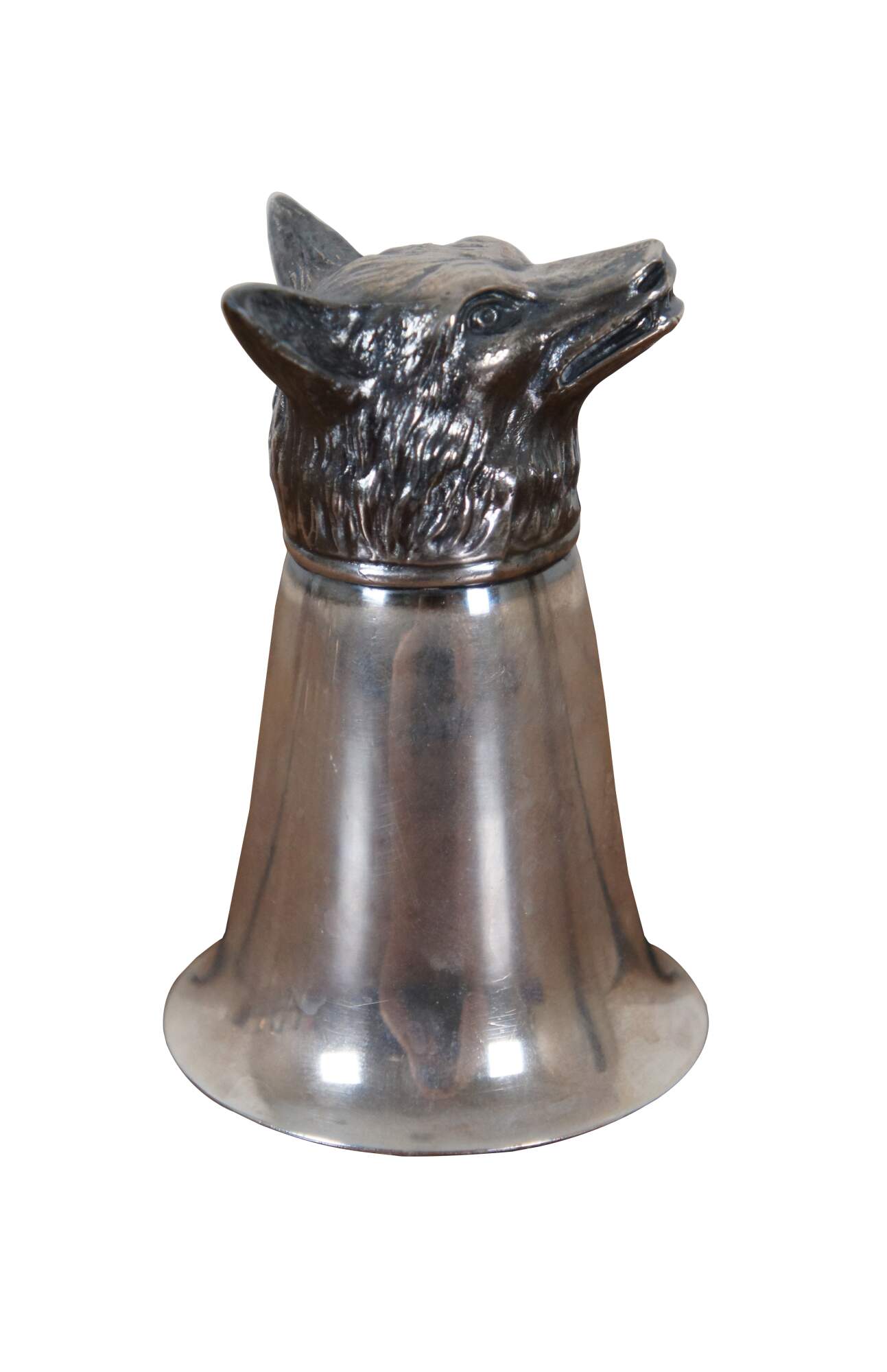 Mid 20th century silver plate jigger topped with a wolf’s head. Monogrammed with the initials CHV.