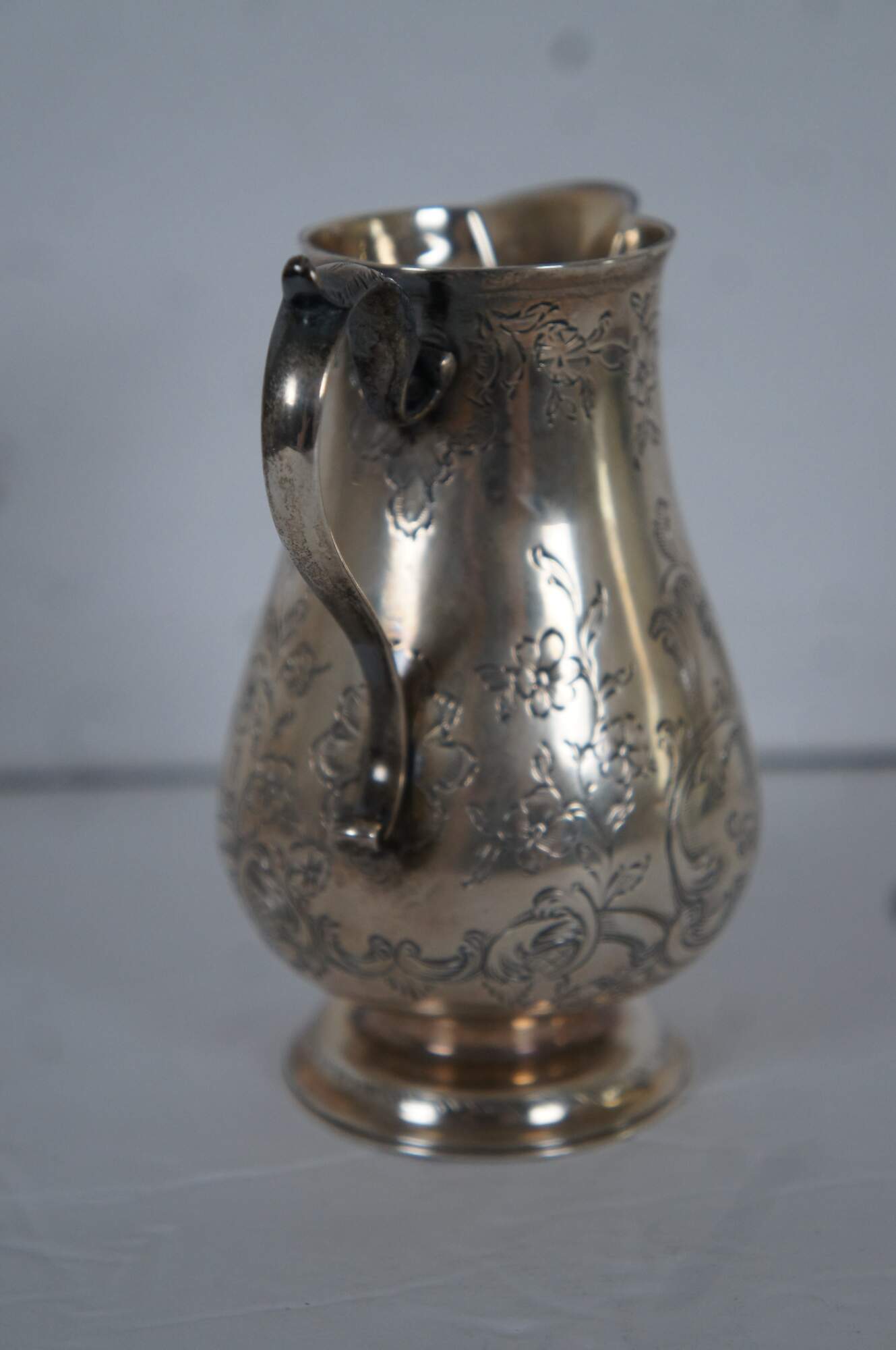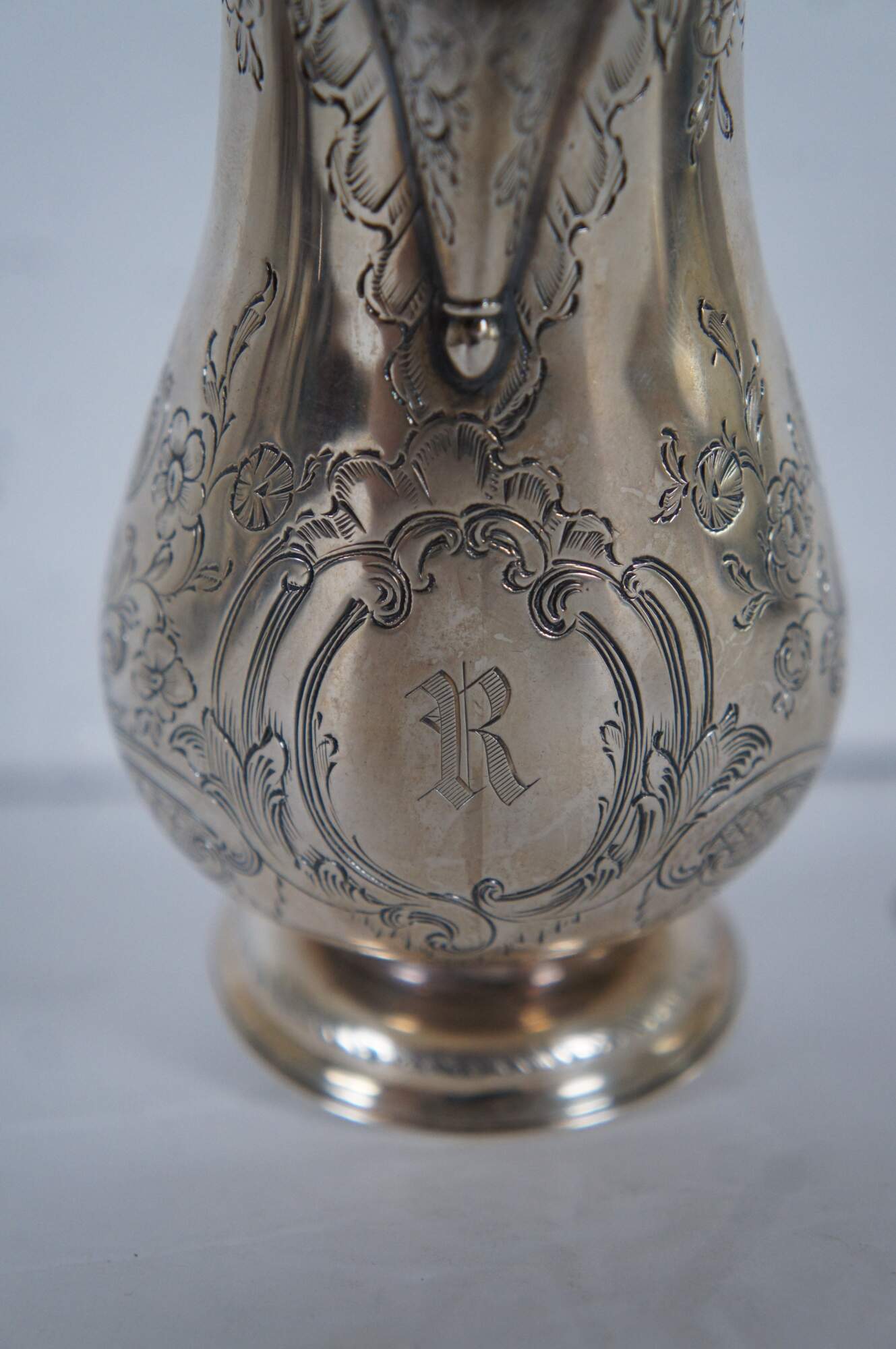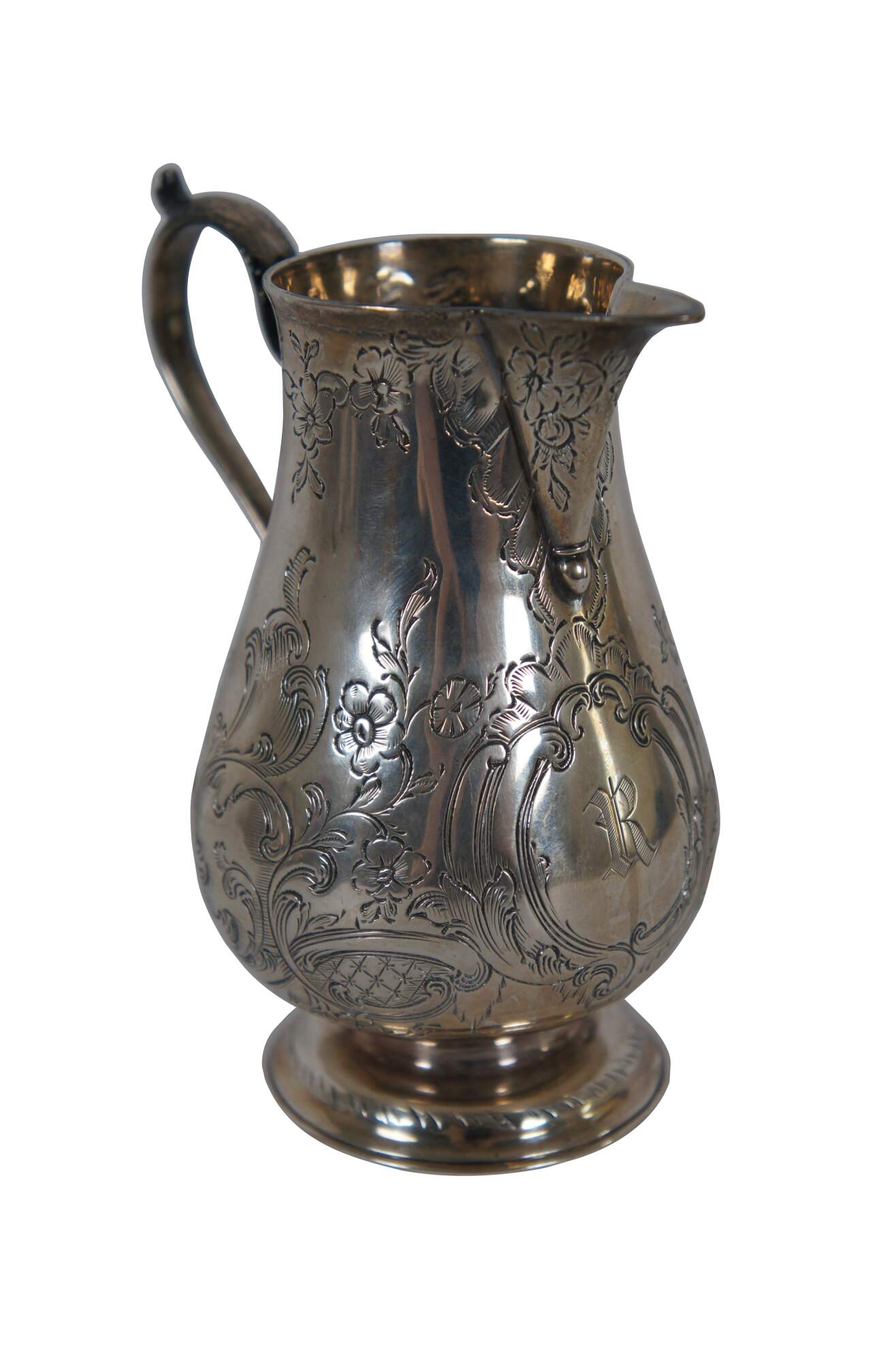 Antique Victorian era sterling silver cream pitcher, etched with swirling leaves and flowers. Monogrammed with the initial R. Made in 1851 by London silversmith George Frederick Pinnell.